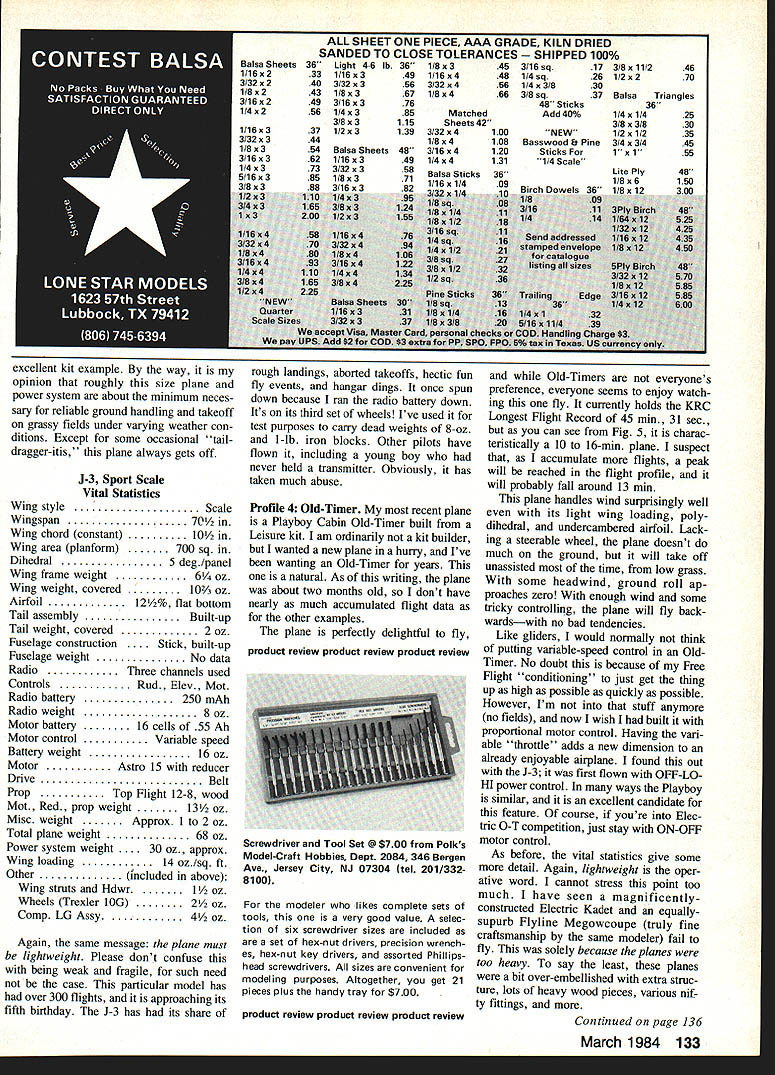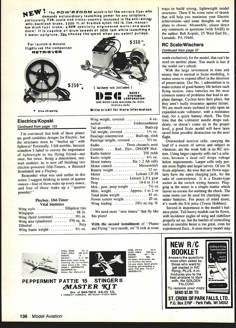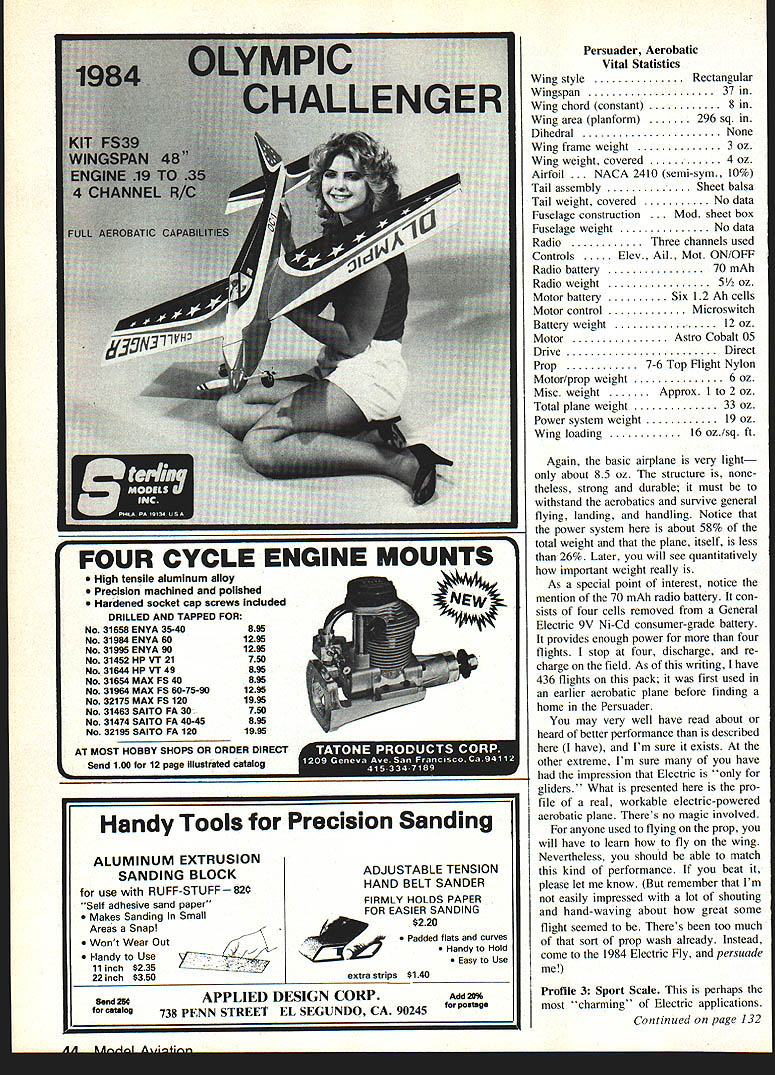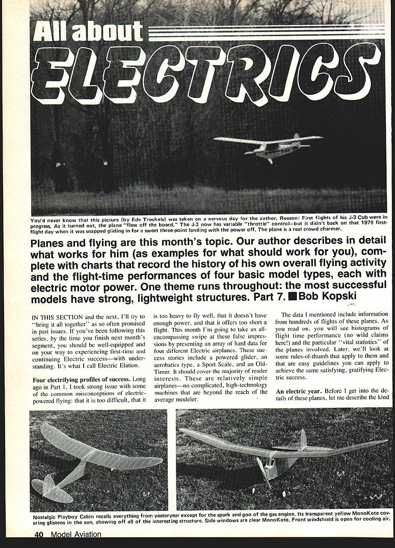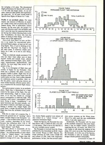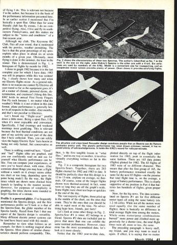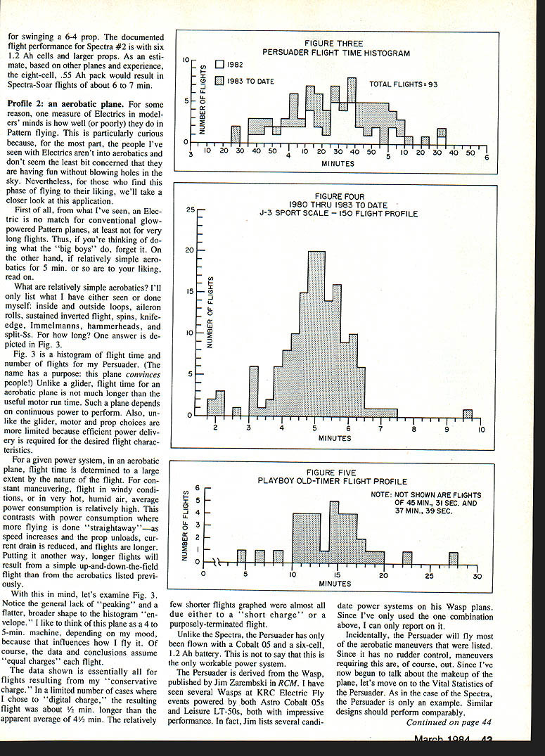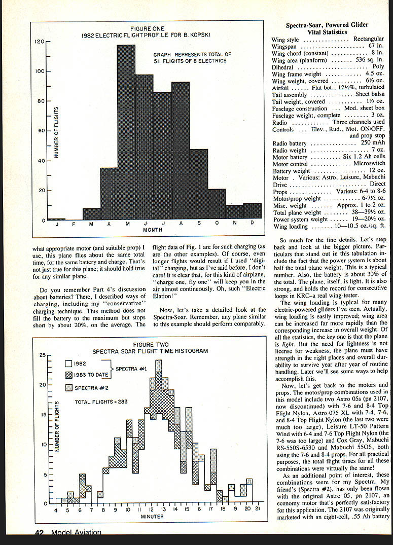 II YOLfd never Know tnai mis picmur iuy e Trockels taken nervous day author Reason First IligIlts 01 flis i- LUD iii progress As turned out plane flew off board J-3 now has variable throttle controlbut didnt back 1979 firstflight day snapped gliding sweet three-point landing power off plane real crowd charmer Planes flying months topic author describes detail what works him examples what should work com plete charts record history own overall flying activity flight-time performances four basic model types electric motor power theme runs throughout successful models have strong lightweight structures Part 7 EBob Kopski IN THIS SECTION next Ill try bring together often promised past issues youve following series time finish next months segment should well-equipped way experiencing first-time continuing Electric successwith under standing Its what call Electric Elation Four electrifying profiles success Long ago Part I took strong issue some common misconceptions electricpowered flying too difficult too heavy fly well doesnt have enough power offers too short flight month Im going take allencompassing swipe false impres sions presenting array hard data four different Electric airplanes suc cess stories include powered glider aerobatics type Sport Scale OldTimer should cover majority reader interests relatively simple airplanesno complicated high-technology machines beyond reach average modeler data mentioned include information hundreds flights planes As read will see histograms flight time performance no wild claims particular vital statistics planes involved Later well look some rules-of-thumb apply easy guidelines can apply achieve same satisfying gratifying Elec tric success An electric year Before get de tails planes let describe kind Nostalgic Playboy Cabin recalls everything trom yesteryear except spark goo gas engine Its transparent yellow MonoKote cov ering glistens sun showing off interesting structure Side windows clear MonoKote Front windshield open cooling air 40 MnI Aviation flying relevant because Im author because basis performance information presented earlier section t mentioned Im basically sport flier Other some friendly club fun fly events no com petitive flying Also live fly south eastern Pennsylvania makes subject terms conditions four-season year Although club Keystone RC Club flies year round moderated proviso weather permitting fact great percentage aero exploits takes place about six seven months given year Obviously flying done summer least winter demonstrated Fig histogram flights month 1982 chose graph 1982 because last complete year have data 1983 still progress written Fig clearly shows Electric flights occur As general rule no reason cannot fly Electrics year round far equipment goes its matter climate personal desire de termination craziness Along line KRC holds its annual First Frosty Fingers Fun Fly January 1 no matter what weather evident data format plane performance generally bet ter respects cooler drier months thats peculiar Electrics Lets break flight-year' profile down little Being sport flier fly its enjoyable convenient Specifically find evenings weekend mornings gratifying relevant because best thermal conditions part activity part data have collected Thus can safely view happy Electric flyin facts herein being factual conservative well nothing contrived Good bad flights alike graphed can confidently read see yourself what Electric performance can like can compare experiences ones youve heard about comment about things may hear flight watch always seems either too short too long depending upon point being made way flight times shown clocked launch landing nearest second However purposes simplicity graphing times shown rounded larger fractions minute Profile 1 powered glider Ive frequently mentioned Spectra design first performance profile well look Spectra-Soar glider member Spectra family Recall Part aspect Spectra design versatility different electric power systems can have used model Remember view what follows example nothing magical about Spectra Most planes similar charac teristics should perform comparably first tangible lesson 'what flies way another involves virtually everything written far series Fig 2 composite histogram two Spectra-Soars Together 283 flights charted 1982 1983 date should perfectly clear design 12 13-mm airplane average no ther mals course some longer flights shown thermal-assisted fact some long off graphs scale Some flights short test hops quickies end day vast majority flights piled up middle chart ones count Theyre ones should able equal time No adver tising hype friends just facts Lets look some other things Fig 2 Spectra-Soar #1 #2 belongs friend Spectra #2 data included just prove can exhibit same nominal performance However since has accumulated data lets look closely Notice 1983 year-to-date data plotted directly top flight infor mation 1982 peak essentially same fashion 165 data points flights plotted 1982 83 flights 1983 no different character means after first group 165 battery performance remained exactly same next 83 flightson premise total flight time average gauge battery performance clearly supportive position Part 4 bat teries last hundreds flights given proper care Now big news data accumu lated Spectra #1 five different motor types using same battery six 12 Ah cells motors used equally same number flights basically no difference total average flight time among motors some motor/prop combinations burned power climbed ag gressively shorter time total flight times less same preceding paragraph heavy stuff friend may want read again effect saying no matter FArh IQSU Al Fig 2 shows cnaracterstics two Spectras authors identified No 1 text the right John Hickeys Spectra other V-tail Six varia tions used members KRC Model convenient size transporting inexpensive motor system provides plenty power Chart shows provides satisfying flights all-white clean-lined Persuader design convinces people Electric can Pat