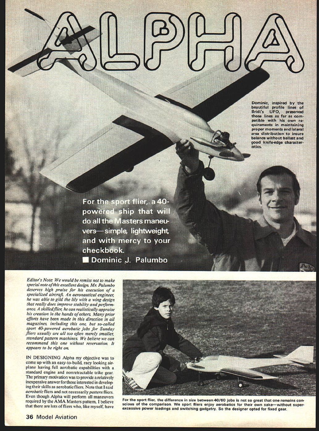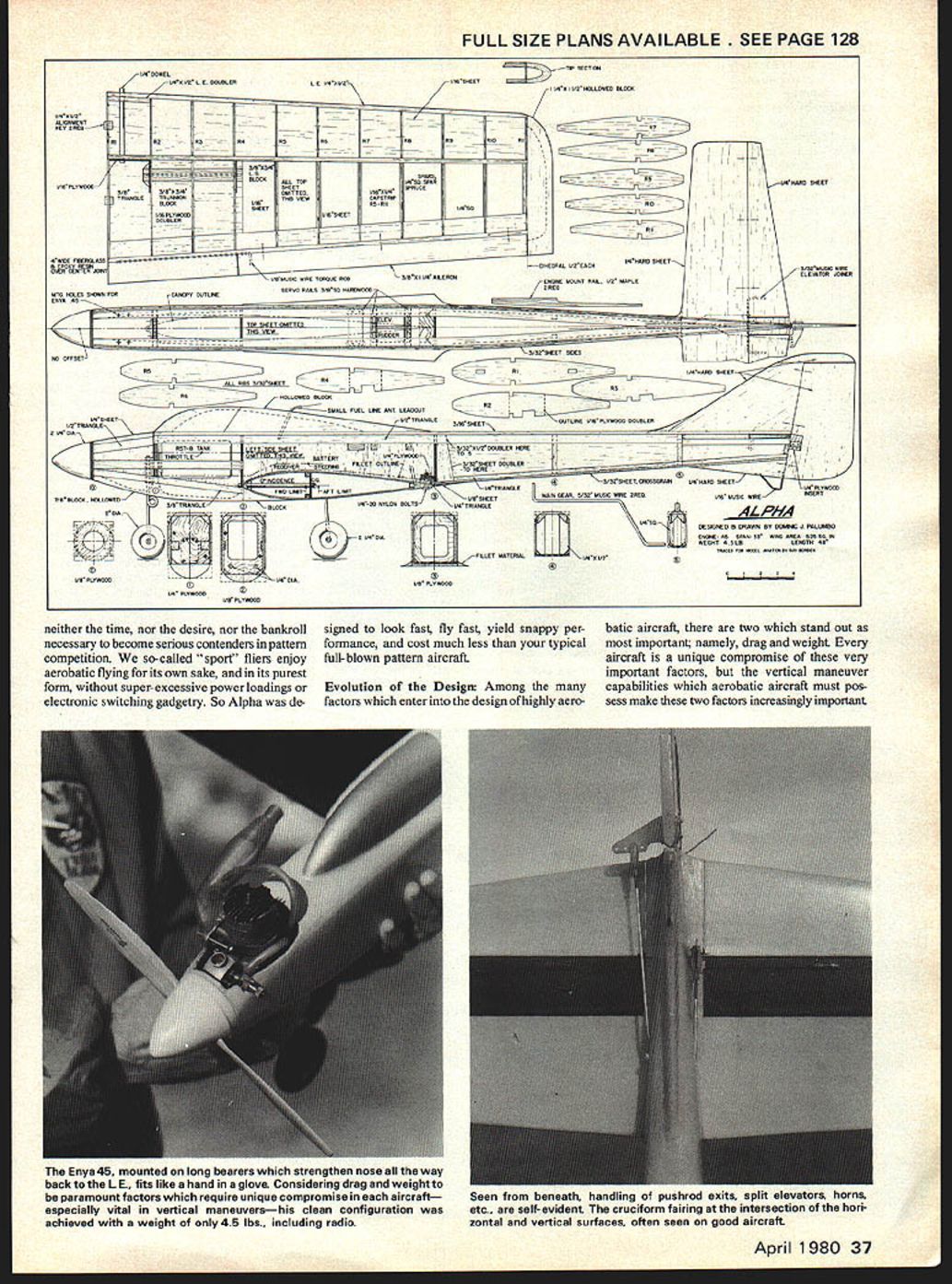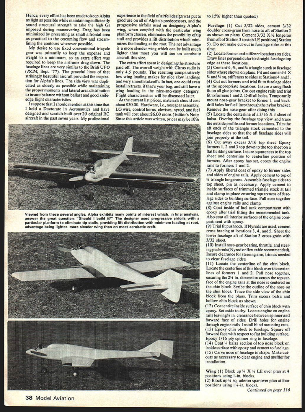 Editors Note would remiss make special note excellent design Mi Palumbo deserves high praise execution specialized aircraft An aeronautical engineer able gild lily wing design really does improve stability perform ance skilledflier can realistically appraise creation hands others priar efforts have made direction magazines including so-called sport 40-powered aerobatic jobs Sunday fliers usually too often merely smaller standard pattern machines believe can recommend reservation appears right IN DESIGNING Alpha objective come up easy-to-build racy looking air plane having full aerobatic capabilities standard engine nonretractable trike gear primary motivation provide relatively inexpensive answer interested develop ing skills aerobatic fliers Note said aerobatic fliers necessarilypattenz fliers though Alpha will perform maneuvers required AMA Masters pattern believe lots fliers like myself have 36 Model Aviation sport flier difference size between 40/60 jobs great remains con scious comparison sport fliers enjoy aerobatics own sakewithout superexcessive power loadings switching gadgetry So designer opted fixed gear FULL SIZE PLANS AVAILABLE SEE PAGE 128 IVOO VA CE OHEeLESCe V4OVELHMSSWVT SECT1VA IVO 00 HOLLOWED WOVE I4O IT HUASMEST IRE CLV WOVO 4WAE EWORALASS RBHANSONVEOLO TWANALETRUMNOSVAPSTWP SRN4SO VEOVO VS V 00 ALEROS VHMOPV OuTLAW -I-z~~ -MJAL kVI E4HARO SleET 1~ IVHHARO SHEET VIVEOHAL OOEAVTSOSOMASIC WIRE [v32][b-1-10-1-10]] I OV 2 MO OPPSOT\\-SHESOEET SIXES RE C SI104OASO SHEET ALL SWS S/HESROEV SA WEO SLOVO- ALL PHOL USE HAT LEAOVVT LOR SHEETHOOLSE LYE PLOWOHO VOTSW, OTRIASHE OnE SHEET H OH HIA ROT-H HASHjfljflVP 3HOH 02 EOVSES SE SE UROTTVVHTLVEVSJIOVTL ESTIOHPLVVSEOOHO S 0~-5iTVEH -STEERAWFILLET HATLAW3OSOSSEET MOORLES ----~- 1-I SE 5 --EWO LMTT LIMIT-EHTSWWOLEHOHHHEE V104 PLYWOHO TVSWLOVH HOLLOAEO-LV2SHEETMAIN HOAR SVSAUVSIV WE AWEEESESH HVWTSIAAOLE 5SLOVEVV-HO SOLOS MOLTSV4TSIMWLE 055 WN WY DOWIC J PALUSMOO LENATO OW 5 --OR PLTWHOE 5 IC PLTWHOO ItS PLYHOVO ENHIHE WOAST SAL ION MAPLE neither time nor desire nor bankroll necessary become serious contenders pattern competition so-called sport fliers enjoy aerobatic flying its own sake its purest form super-excessive power loadings electronic switching gadgetry So Alpha dosigned look fast fly fast yield snappy per formance cost much less typical full-blown pattern aircraft Evolution Design Among factors enter design highly aero batic aircraft two stand out important namely drag weight aircraft unique compromise very important factors vertical maneuver capabilities aerobatic aircraft must pos sess make two factors increasingly important Enya 45 mounted long bearers strengthen nose way back L E. fits like hand ins glove Considering drag weight pararosount factors require unique compromise aircraft especially vital vertical maneuvershis clean configuration achieved weight 45 lbs. including radio April 1980 37 Seen beneath handling pushrod exits split elevators horns etc. self- evident cruciform fairing intersection hori zontal vertical surfaces often seen good aircraft Hence effort has made keep Alpha light possible maintaining sufficiently sound structural strength take high Gs imposed during maneuvering Drag has minimized presenting small frontal area practical oncoming flow stream lining contours wherever possible desire use fixed conventional tricycle gear primarily keep expense weight minimum extra effort required keep airframe drag down fuselage lines very similar Bridi UFO RCM Sept 77 graceful lines strikingly beautiful aircraft provided inspira tion Alphas lines side view dupli cated closely possible maintaining proper moments lateral area distribution insure balance ballast good knifeedge flight characteristics suppose should mention time hold Doctorate Aeronautics have designed scratch-built over 20 original RC aircraft past seven years professional experience field airfoil design put good use Alphas predecessors progressive airfoils used designing Alphas wing coupled particular wing planform chosen eliminates possibility tip stall provides lift distribution mini mizes loading root net advantage slender wing can built much lighter will see aerobatic aircraft size extra effort spent designing structure paid off overall weight Cirrus radio 45 pounds resulting comparatively low wing loading makes nice slow landings very smooth takeoffs fact could install retracts thats bag still have wing loading nice-and-easy category Flight characteristics will discussed later current list prices materials should cost about$3000 Hardware i e nosegear assembly LG wire control horns devises nyrod fuel tank will cost about $600 Editors Note Since article written prices may 10% 15% higher quoted Fuselage Cut 3/32 sides cement 3/32 doubler cross-grain nose aft Station 3 shown plans Cement 3/32 X eron aft ofStation3 stab LE position( Station 5 make cut-out fuselage sides time 2 Locate former stiffener locations sides Draw lines perpendicular straight fuselage top edge locations 3 Cement iangle stock fuselage sides shown plans Fit cement stiffeners sides Stations4 andS 4 Cut out formers trial fit fuselage sides appropriate locations Insure snug flush fit glue joints Cut out engine rails trial fit formers 1 and2 Drill holes Temporarily mount nose-gear bracket former 1 backdrill holes fuel lines through nylon bracket Remove nose-gear after doing 5 Locate centerline ofa3/16 X 3 sheet balsa Overlay fuselage top view trace outside profile former locations Trim aft ends triangle stock cemented fuselage sides aft fuselage sides will join properly taiL 6 Cut away excess 3/16 top sheet Epoxy formers 1 2 3 top down top sheet flat building surface Insure squareness top sheet centerline centerline position formers After epoxy has set epoxy engine rails formers 1 2 7 Apply liberal coat epoxy former sides sides engine rails Apply cement top triangle longerons Assemble fuselage sides top sheet pin necessary Apply cement inside surfaces trimmed triangle stock tai