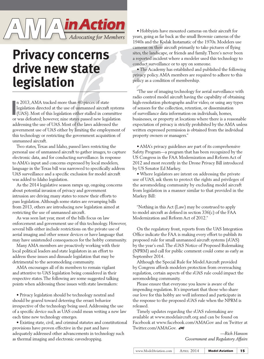 Two states, Texas and Idaho, passed laws restricting the personal use of unmanned aircraft to gather images, to capture electronic data, and for conducting surveillance. In response to AMA’s input and concerns expressed by local modelers, language in the Texas bill was narrowed to specifically address UAS surveillance and a specific exclusion for model aircraft was added to Idaho legislation.