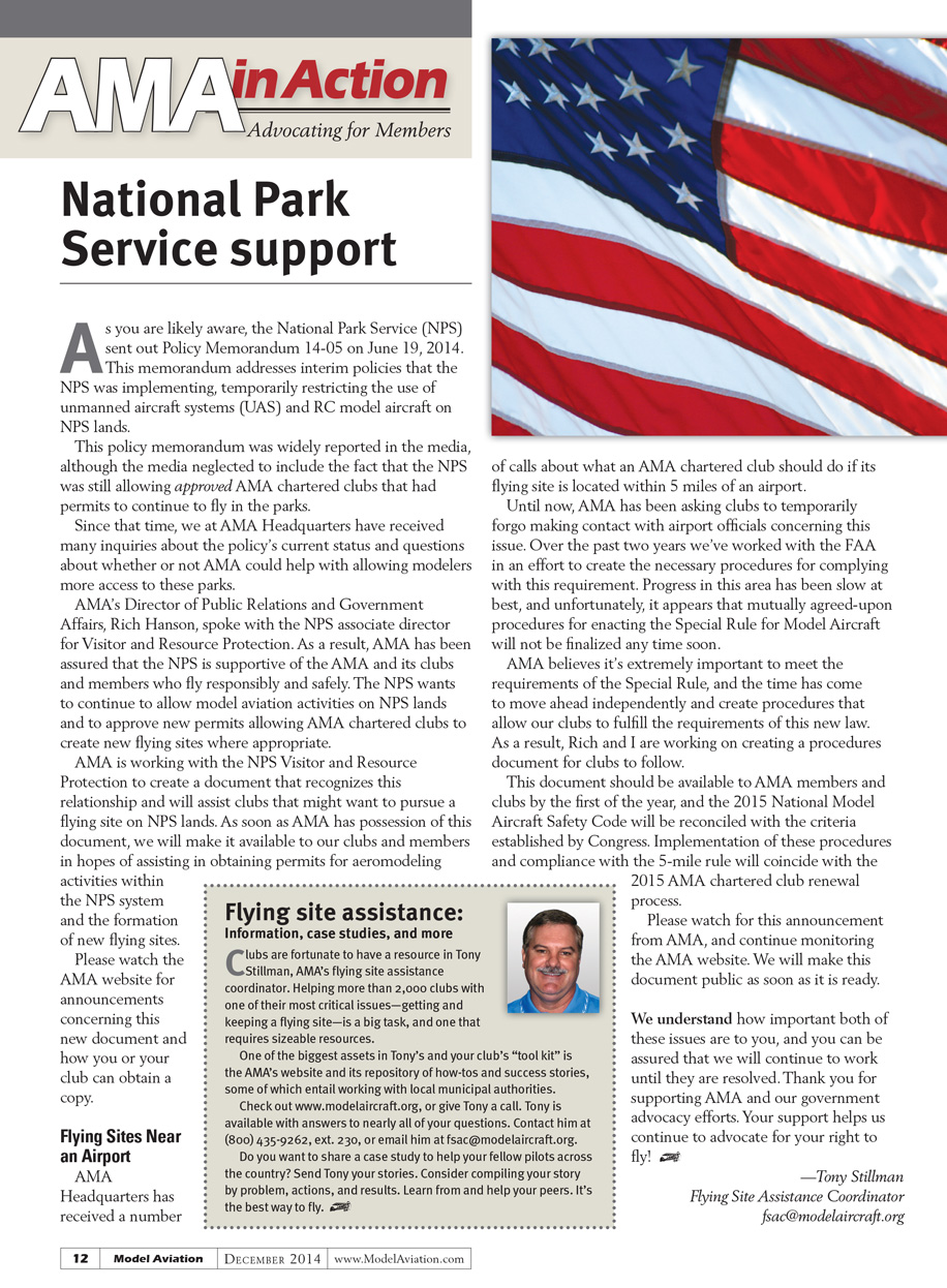AMA’s Director of Public Relations and Government Affairs Rich Hanson spoke with the NPS associate director for Visitor and Resource Protection. As a result, AMA has been assured that the NPS is supportive of the AMA and its clubs and members who fly responsibly and safely. The NPS wants to continue to allow model aviation activities on NPS lands and to approve new permits allowing AMA chartered clubs to create new flying sites where appropriate.