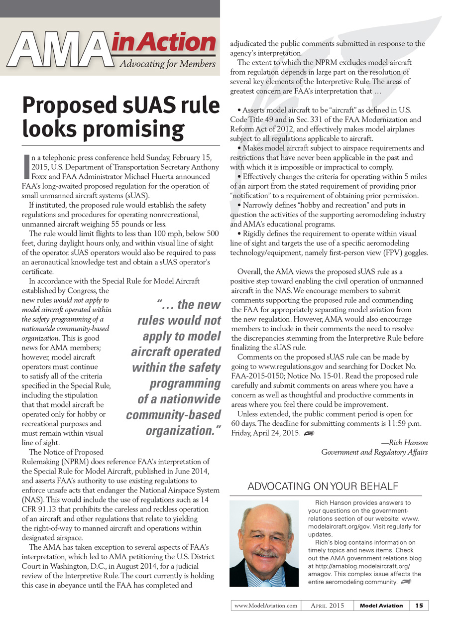 Overall, the AMA views the proposed sUAS rule as a positive step toward enabling the civil operation of unmanned aircraft in the NAS. We encourage members to submit comments supporting the proposed rule and commending the FAA for appropriately separating model aviation from the new regulation. However, AMA would also encourage members to include in their comments the need to resolve the discrepancies stemming from the Interpretive Rule before finalizing the sUAS rule.