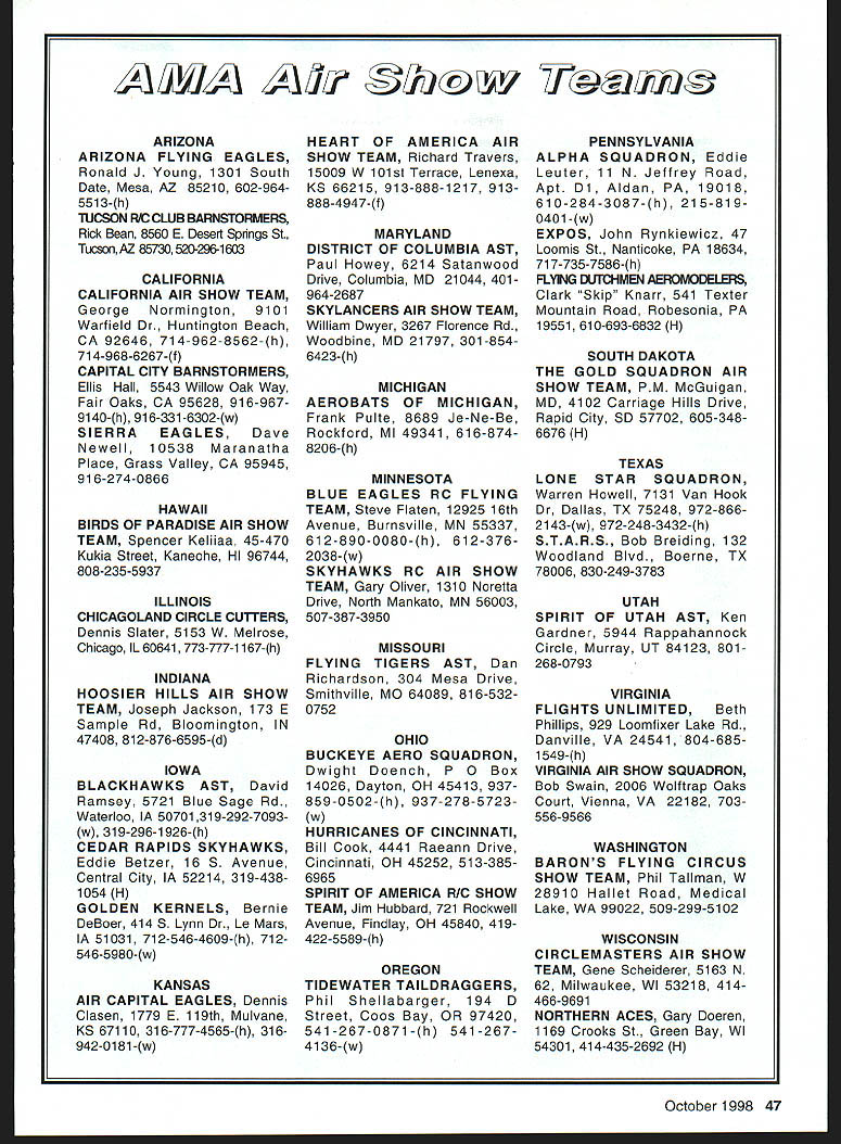 A/AL ARIZONA ARIZONA FLYING EAGLES Ronald J Young 1301 South Date Mesa AZ 85210 602-964551 3-h 11JCSON R CLUB BARNSTORMERS Rick Bean 8560 E Desert Springs St Tucson AZ 85730520-296-1603 CALIFORNIA CALIFORNIA AIR SHOW TEAM George Normington 9101 Warfield Dr Huntington Beach CA 92646 714-962-8562-h 71 4-968-6267-f CAPITAL CITY BARNSTORMERS Ellis HaIl 5543 Willow Oak Way Fair Oaks CA 95628 916-9679140-h 916-331-6302-w SIERRA EAGLES Dave Newell 10538 Maranatha Place Grass Valley CA 95945 916-274-0866 HAWAII BIRDS OF PARADISE AIR SHOW TEAM Spencer Keliiaa 45-470 Kukia Street Kaneohe HI 96744 808-235-5937 ILLINOIS CHICAGOLAND CIRCLE CUTTERS Dennis Slater 5153 W Melrose Chicago IL 60641 773-777-11 67-h INDIANA HOOSIER HILLS AIR SHOW TEAM Joseph Jackson 173 E Sample Rd Bloomington IN 47408 812-876-6595-d IOWA BLACKHAWKS AST David Ramsey 5721 Blue Sage Rd Waterloo IA 50701 31 9-292-7093w 31 9-296-1 926-h CEDAR RAPIDS SKYHAWKS Eddie Betzer 16 5 Avenue Central City IA 52214 319-4381054 H GOLDEN KERNELS Bernie DeBoer 414 5 Lynn Dr Le Mars IA 51031 71 2-546-4609-h 712546-5980-w KANSAS AIR CAPITAL EAGLES Dennis Clasen 1779 E 119th Mulvane KS 67110 316-777-4565-h 316942-0181 -w HEART OF AMERICA AIR SHOW TEAM Richard Travers 15009 W 101st Terrace Lenexa KS 66215 913-888-1217 913888-4947-f MARYLAND DISTRICT OF COLUMBIA AST Paul Howey 6214 Satanwood Drive Columbia MD 21044 401964-2687 SKYLANCERS AIR SHOW TEAM William Dwyer 3267 Florence Rd Woodbine MD 21797 301-8546423-h MICHIGAN AEROBATS OF MICHIGAN Frank Pulte 8689 Je-Ne-Be Rocktord Ml 49341 616-8748206-h MINNESOTA BLUE EAGLES RC FLYING TEAM Steve Flaten 12925 16th Avenue Burnsville MN 55337 612-890-0080-h 612-3762038-w SKYHAWKS RC AIR SHOW TEAM Gary Oliver 1310 Noretta Drive North Mankato MN 56003 507-387-3950 MISSOURI FLYING TIGERS AST Dan Richardson 304 Mesa Drive Smithville MO 64089 816-5320752 OHIO BUCKEYE AERO SQUADRON Dwight Doench P 0 Box 14026 Dayton OH 45413 937859-0502-h 937-278-5723w HURRICANES OF CINCINNATI Bill Cook 4441 Raeann Drive Cincinnati OH 45252 513-3856965 SPIRIT OF AMERICA R/C SHOW TEAM Jim Hubbard 721 Rockwell Avenue Findlay OH 45840 419422-5589-h OREGON TIDEWATER TAILDRAGGERS Phil Shellabarger 194 D Street Coos Bay OR 97420 541-267-0871-h 541-26741 36-w PENNSYLVANIA ALPHA SQUADRON Eddie Leuter 11 N Jeffrey Road Apt Dl Aldan PA 19018 610-284-3087-h 215-8190401 -w EXPOS John Rynkiewicz 47 Loomis St Nanticoke PA 18634 71 7-735-7586-h FL1NG DUTCHMEN AEROMODELERS Clark Skip Knarr 541 Texter Mountain Road Robesonia PA 19551 610-693-6832 H SOUTH DAKOTA THE GOLD SQUADRON AIR SHOW TEAM PM McGuigan MD 4102 Carriage Hills Drive Rapid City SD 57702 605-3486676 H TEXAS LONE STAR SQUADRON Warren Howell 7131 Van Hook Dr Dallas TX 75248 972-86621 43-w 972-248-3432-h STARS Bob Breiding 132 Woodland Blvd Boerne TX 78006 830-249-3783 UTAH SPIRIT OF UTAH AST Ken Gardner 5944 Rappahannock Circle Murray UT 84123 801268-0793 VIRGINIA FLIGHTS UNLIMITED Beth Phillips 929 Loomfixer Lake Rd Danville VA 24541 804-6851 549-h VIRGINIA AIR SHOW SQUADRON Bob Swain 2006 Wolftrap Oaks Court Vienna VA 22182 703556-9566 WASHINGTON BARONS FLYING CIRCUS SHOW TEAM Phil Tallman W 28910 Hallet Road Medical Lake WA 99022 509-299-5102 WISCONSIN CIRCLEMASTERS AIR SHOW TEAM Gene Scheiderer 5163 N 62 Milwaukee WI 53218 414466-9691 NORTHERN ACES Gary Doeren 1169 Crooks St Green Bay WI 54301 414-435-2692 H October1998 47