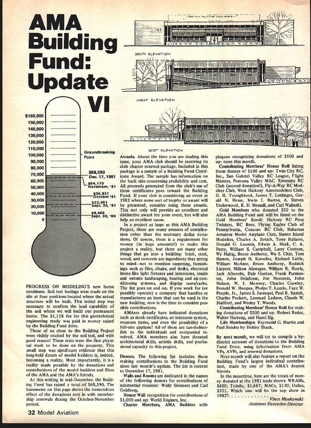 AMA Building Fund Update K- VI Groundbreaking Point $36931 October Ii $22261 Sept 30 81 $8466 Sept 30 80 PROGRESS ON MODELINGS new home continues Soil test borings made site four positions located actual structure will built initial step necessary confirm load capability soil will build permanent home $1158 fee geotechnical engineering study paid money raised Building Fund drive us close Building Project visibly excited soil test good reason tests first physi cal work done property smail step significant evidence long-held dream model builders indeed becoming reality Most importantly reailty made possible donations contributions model builders fliers AMA AMAs friends writing mid-December Build ing Fund has raised total $68590 barometer page shows tremendous effect donations sent member ship renewals during October-November period Award& About time reading issue AMA club should receiving its club charter renewal package Included package sample Building Fund Certif icate Award sample has information back side concerning availability cost Ail proceeds generated clubs use certificates goes toward Building Fund club considering event 1982 some sort trophy award will presented consider using awards will provide excellent distinctive award event will also help exceilent cause project large AMA Building Project avenues contribu tion other necessary doilar dona tions course requirement money large amounts make project reality other things go building brick steel wood concrete ingredients spring mindnot mention carpeting furnish ings such files chairs desks electrical items like light fixtures intercoms inside outside landscaping heating air-con ditioning systems display cases/racks list goes on work possibly operate company handles manufactures item can used new building now time consider pos sible contributions AMAers already have indicated donations such stock certificates intercom system museum items possibility full-size airplane tax-deduct ible individuals companied volved AMA members also have donated architectural skills artistic skills profes sional capacity project Donors following list includes making contributions Building Fund since last months update list current December 17 1981 Walls Rooms dedicated names foliowing donors contributions substantial measure Waily Simmers Carl Goldberg Honor Wall recognition contributions $1000 up World Engines Inc Charter Members AMA Builders plaques recognizing donations $500 up month Contributing Members Honor Roil listing donors $100 up Twin City RC Inc San Gabriel Valley RC League Flight Masters Pomona Vailey MAC Riverside RC Club second donation Fly-A-Way RC Mod elers Club West Hickory Aeromodelers Club D H Youngblood James T Luttinger Ger ald N Hesse Irwin J Bartos Steven Underwood R D Messall Carl Walinski Gold Members donated $50 AMA Building Fund will listed Gold Members Scroil Hickory RC Prop Twisters RC Bees Flying Eagles Club Pennsylvania Curacao RC Club Bahamas Amateur Model Airplane Club Staten Isiand Modelers Charles Sotich Tony Italiano Donald G Loomis Edwin Heck C Perry Wililam S Campbell Larry Couture Wy Habig Bruce Anthony Wu S Chin Tom Hamm Joseph H Konofes Richard Little William McAtee Bruce Anthony Rodrick Lippert Milton Alswager William R Hoyle Jack Albrecht Dale Gorton Frank Parmen ter John Delafosse Joe Norcross John Nelson W J Mowrey Charles Crawley Donald W Hoopes Phelps T Laszlo Faye W People Jr James S Javrequi Paul R Bastek Charles Puckett Leonard Ledson Claude W Stafford Wesley T Woods Contributing Members Honor Roil mak ing donations $500 up Robert Reder Walter Hartung Hazel Sig Life Memberships Raymond G Marvin Paul Bender Hobby Shack next month will try compile bydistrict account donations Building Fund Drive using information AMA VPs AVPs renewal donations Next month will also feature report Building Funds largest individual contribu tion made AMAs dearest friends meantime totals mon ey donated 1981 trade shows WRAMs $400 Toledo $1667 MACs $130 Dallas $321 Which will top show 1982 Vince Mankowski Assistant Executive Director 32 Model Aviation CUTH ELEVATJON WEST ELEVATION $160000 150000 140000 130000 120000 110000 100000 90000 80000 70 6000 / EASr SLEVATION $68590 Dec 171981 $64170 November 81