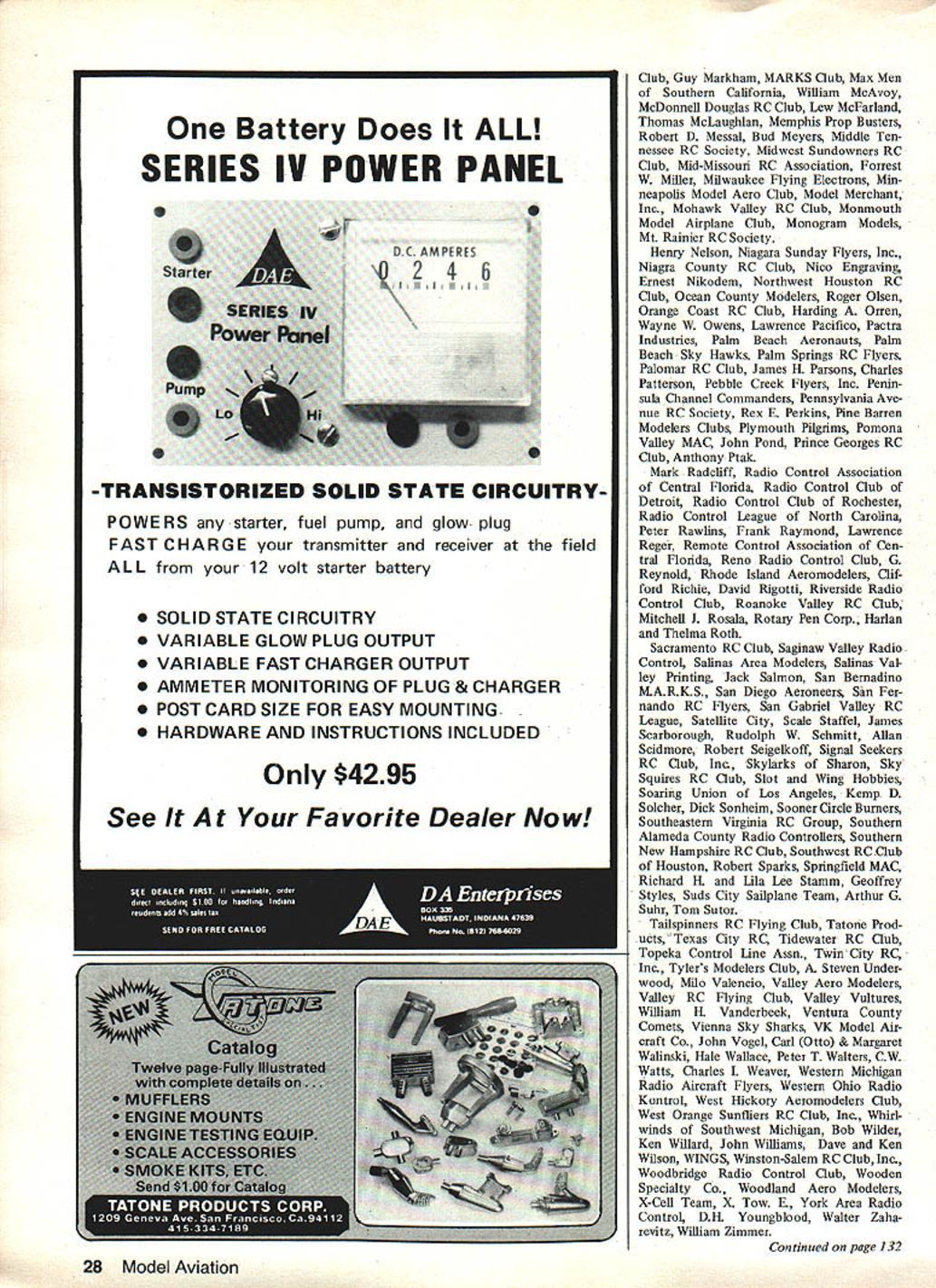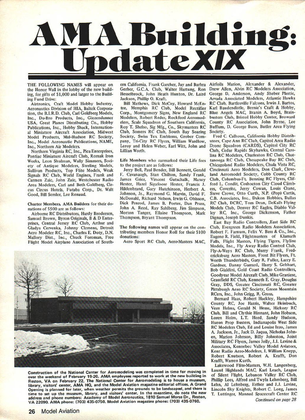 AMA Building j THE FOLLOWING NAMES will appear Honor Wall lobby new build ing gifts $1000 larger Build ing Fund Drive Airtronics Craft Model Hobby Industry Aeronautics Division HIA Baltek Corpora tion BJRD Club Carl Goldberg Models Inc Du-Bro Produets Inc Giezendanner USA Great Planes Distributing Co Hobby Publications Inc Hobby Shack Internation al Miniature Aircraft Association Midwest Model Products Mid-Hudson RC Society Inc Model Aeronautic Publications NAME Inc Northern Air Modelers Northern Virginia RC inc Pica Enterprises Pontiac Miniature Aircraft Club Romak Iron Works Leon Shulman Wally Simmers Soci ety Antique Modelers Sterling Models Sullivan Products Top Flite Models Weak Signals RC Club World Engines Frank Carmen Zaic John Zaic Westchester Radio Area Modelers Carl Beth Goldberg Cir cus Circus Hotels Futaba Corp Dr Walt Good Bill Semler Lee Renaud Charter Members AMA Builders nations $500 follows Airborne RC Distributors Hardy Brodersen Samuel Brown Byron Originals B & D Enter prises Central Jersey RC Club Arthur Gladys Cervenka Johnny Clemens Detroit Aero Modeler RC Inc Charles E Doty DN Mallory Dist Inc Chuck Foreman Free Flight Model Airplane Association Southem California Frank Garcher Jay Barbra Gerber GCA Club Walter Hartung Ron Hesselbrock John Heath Hunton Dr Laird Jackson Phillip 0 Kraft Bill Mathews Dick McCoy Howard MeEn tee Memphis RC Club Model Rectifier Corp Montgomery Signs New England RC Modelers Robert Reder Rockford Aeromod elers Scale Squadron Southern California Roy Shelso Sig Mfg Co Skymasters RC Club Somers RC Club South Bay Soaring Society Swiss Tex Emblems Grober Com pany Tn-City RC Flyers William Wardlow Leroy Helen Weber Earl Witt John Lillian Worth Life Members earmarked Life fees project follows Jerry BeU Paul Bender Bill Bennett Gerald F Cavanaugh Stan Chilton Sandy Frank James Grier Vincent Gutschalk Maxey Hester Hazel Sigafoose Hester Francis J Hlidenbrand Gary Hutchinson Herbert Johnson Jr Raymond G Marvin David F McDonald Richard Nelson Irwin G Ohlsson Dick Penrod James B Porter Dan Pruss John Reed Ray Sahlberg Jim Simpson Morton Tanger Ellaine Thompson Mark Thompson Bryant Thompson foilowmg names will appear con tributing members Honor Roll $100 donations Aero Sport RC Club Aero-Masters MAC Airfoils Marion Alexander & Alexander Drew Allen Alvin RC Modelers Association George D Anderson Andy Sheber Plastic Arvada Associated Modelers Atlantic Hawks RC Club Bartlesville Falcons Irwin J Bartos Karl Baudendistle Bernies Craft & Hobby Blue Angels MAC Branin Boyd Brainbusters Club Bristol Hobby Center Broward County RC Association John Byrne Lee Buffum D George Buso Butler Area Flying Society Fred C Calhoun California Hobby Distrib utors Cape Ann RC Club Capitol Area Radio Drone Squadron CARDS Capitol City RC Club Cedar Rapids Skyhawks Central Caro lina RC Modelers Charleston RC Club Chat tanooga RC Club Chesapeake Bay RC Club Chicagoland Radio Modelers Chula Vista RC Cincinnati Aero Modelers Don Clark Cleve land Aeromodel Society Cobb County RC Club Columbus-Ft Benning RC Flyers Clif ford L Condit Coshocton City Cloud Climb ers Coverite Jerry Cowan Louis Crane Steve Crowe Otto Curth NP Pop Curtis CB Associates Inc Dakon Hobbies Dallas RC Club DCRC Tom Dean DeKalb Flying Models Club Denver RC Eagles Diablo Val ley RC Inc George Dickenson Father Dignan Joseph Dunkis East Bay Radio Controllers East Side RC Club Evergreen Radio Modelers Association Robert F Famum Felix V Bass & Co Inc Eugene R Field Flightmasters Kiamath Falls Flight Masters Flying Tigers Flyline Models Inc Fly Away Radio Control Club Fly-A-Ways RC Club Murry Frank Fred ericksburg Aero Masters Frost Bit Flyers Ft Worth Thunderbirds Gary R Fuller Larry E Gardner Danny Garrard Harry S Gebhart Bob Gialdini Gold Coast Radio Controllers Goodyear Model Aircraft Club Mike Graniere Grassfield RC Club Kenneth E Gray Douglas Gray DDS Greater Cincinnati RC Greater Pittsburgh Aero RC Society Green Mountaln RCers Inc John Grigg R Gross Bernard Haas Robert Hackley Hampshire County RC Joe Harris Walter Heinbuch Vein Helms Gerald N Hesse Hickory RC Club Bill Clythie Hinnant John Hobson Loren HoIrn LT Hord Sandy Hudson Huron Prop Busters Indianapolis West Side RC Modelers Club Ed Louise Izzo James A Jackson Jr Jack D Jaqua Nicholas Johnen Marion Johnson Billy Johnston Joint Military RC Flyers James Jolly JJ Levine & Associates Kennebec Valley Model Aviators Kent Radio Aero-Modelers J William Knepp Robert Knutson Robert Krafft Don Krafft Warren Kurth Lakewood Flite-Masters WH Langenberg Laurel Highlands MAC Karl Leach League Silent Flight Lebanon Valley RC Club Philip Lees Alfred Twyla Lehmberg Bill Lehn Al Lehnberg Esther JJ Levine Lincoln Sky Knights Robert C Long James T Luttinger Manned Spacecraft Center RC Continued page 28 26 Model Aviation eXIX Construction National Center Aeromodeling completed time moving over weekend February 19-20 AMA employees reported work new building Reston VA February 22 National Center Aeromodeling house museum library visitors center AMA HQ Model Aviation magazine editorial offices Grand Opening planned later weather permits grounds landscaped time set up museum library Visitors center meantime note new address phone numbers Academy Model Aeronautics 1810 Samuel Morse Dr Reston VA 22090 AMA phone 703 435-0750 Model Aviation magazine phone 703 435-0760 Battery Does ALL SERIES IV POWER PANEL POWERS starter fuel pump glow plug FAST CHARGE transmitter receiver field ALL 12 volt starter battery SOLID STATE CIRCUITRY VARIABLE GLOW PLUG OUTPUT VARIABLE FAST CHARGER OUTPUT AMMETER MONITORING OF PLUG & CHARGER POST CARD SIZE FOR EASY MOUNTING HARDWARE AND INSTRUCTIONS INCLUDED Only $4295 See t Favorite Dealer No wI Club Guy Markham MARKS Club Max Men Southern California William MeAvoy McDonnell Douglas RC Club Lew McFarland Thomas McLaughlan Memphis Prop Busters Robert D Messal Bud Meyers Middle Ten nessee RC Society Midwest Sundowners RC Club Mid-Missouri RC Association Forres