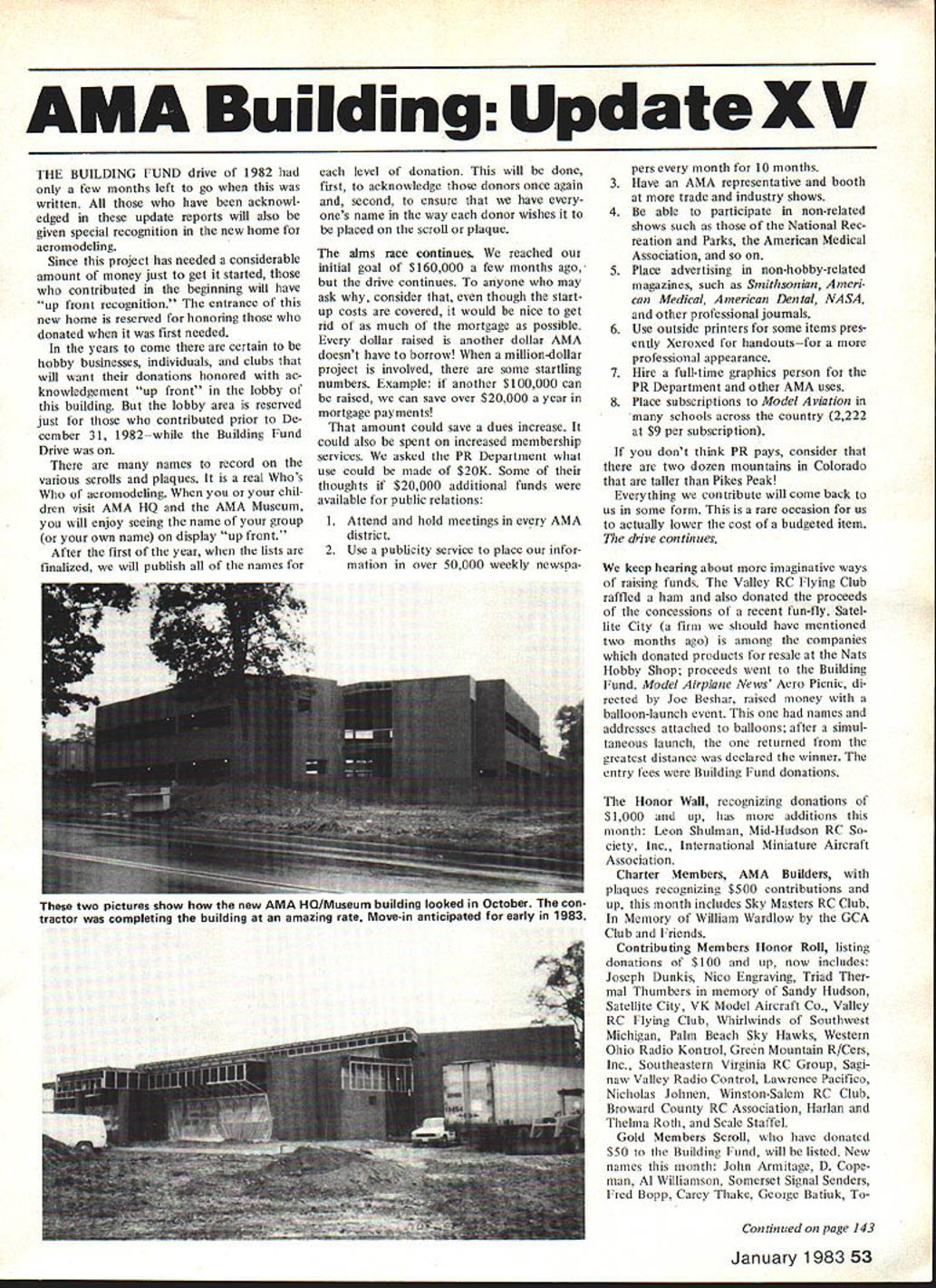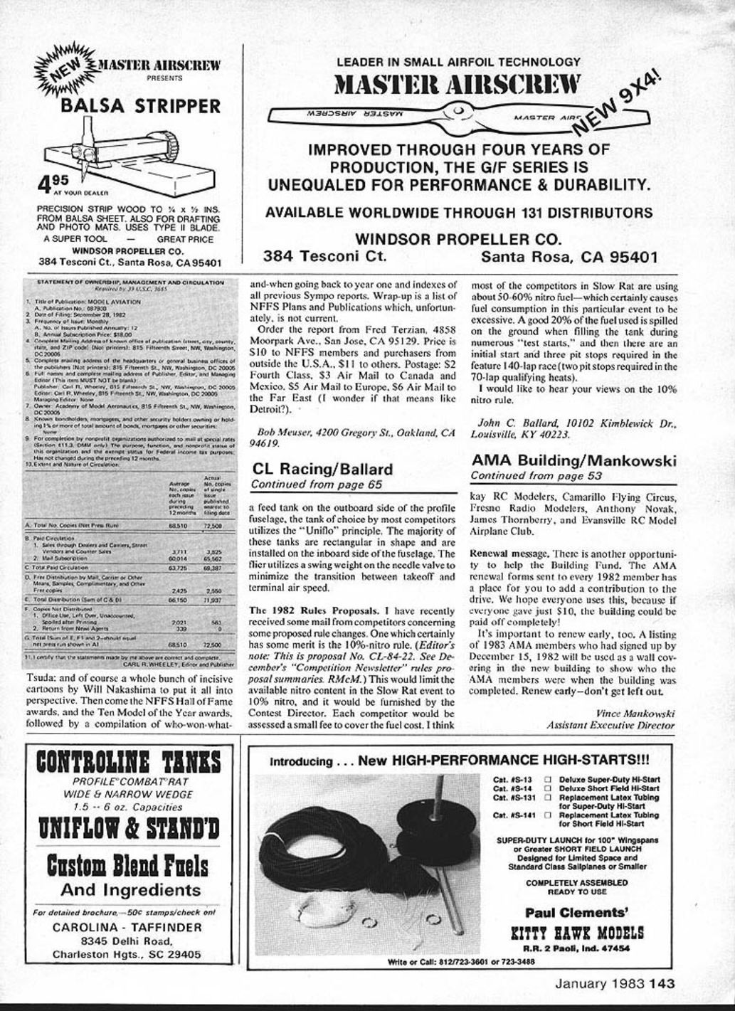 AMA Building Update XV THE BUILDING FUND drive 1982 few months left go written have acknowl edged update reports will also given special recognition new home aeromodeling Since project has needed considerable amount money just get started contributed beginning will have up front recognition entrance new home reserved honoring donated first needed years come certain hobby businesses individuals clubs will want donations honored ac knowledgement up front lobby building lobby area reserved just contributed prior De cember 31 1982while Building Fund Drive names record various scrolls plaques real Whos aeromodeling chil dren visit AMA HQ AMA Museum will enjoy seeing name group own name display up front After first year lists finalized will publish names level donation will done first acknowledge donors once again second ensure have ones name way donor wishes placed scroll plaque alms race continues reached initial goal $160000 few months ago drive continues anyone may ask consider though start up costs covered would nice get rid much mortgage possible dollar raised another dollar AMA doesnt have borrow million-dollar project involved some startling numbers Example another $100000 can raised can save over $20000 year mortgage payments amount could save dues increase could also spent increased membership services asked PR Department what use could made $20K Some thoughts $20000 additional funds available public relations 1 2 Attend hold meetings AMA district Use publicity service place infor mation over 50000 weekly newspa pers month 10 months 3 Have AMA representative booth trade industry shows 4 Be able participate non-related shows such National Rec reation Parks American Medical Association 5 Place advertising non-hobby-related magazines such Smithsonian Ameri can Medical American Dental NASA other professional journals 6 Use outside printers some items pres ently Xeroxed handoutsfor professional appearance 7 Hire full-time graphics person PR Department other AMA uses 8 Place subscriptions Model Aviation schools across country 2222 $9 per subscription dont think PR pays consider arc two dozen mountains Colorado taller Pikes Peak Everything contribute will come back us some form rare occasion us actually lower cost budgeted item drive continues keep hearing about imaginative ways raising funds Valley RC Flying Club raffled ham also donated proceeds concessions recent fun-fly Satel lite City firm should have mentioned two months ago among companies donated products resale Nats Hobby Shop proceeds went Building Fund Model Airplane News Aero Picnic di rected Joe lleshar raised money balloon-launch event names addresses attached balloons after simul taneous launch returned greatest distance declared winner entry fees Building Fund donations Honor Wall recognizing donations $1000 up has additions month Leon Shulman Mid-Hudson RC So ciety Inc International Miniature Aircraft Association Charter Members AMA Builders plaques recognizing $500 contributions up month includes Sky Masters RC Club Memory William Wardlow GCA Club Friends Contributing Members Honor Roll listing donations $100 up now includes Joseph Dunkis Nico Engraving Triad Ther mal Thumbers memory Sandy Hudson Satellite City VK Model Aircraft Co Valley RC Flying Club Whirlwinds Southwest Michigan Palm Beach Sky Hawks Western Ohio Radio Kontrol Green Mountain R/Cers Inc Southeastern Virginia RC Group Sagi naw Valley Radio Control Lawrence Pacifico Nicholas Johnen Winston-Salem RC Club Broward County RC Association Harlan Thelma Roth Scale Staffel Gold Members Scroll have donated $50 Building Fund will listed New names month John Armitage D Copeman Al Williamson Somerset Signal Senders Fred Bopp Carey Thake George Batiuk ToContinued page 143 January 1983 53 two pictures show new AMA HO/Museum building looked October con tractor completing building amazing rate Move-in anticipated early 1983 MASIER AIRSC1IIW PRESENTS BALSA STRIPPER A95 9AT YOUR DEALER PRECISION STRIP WOOD TO x INS FROM BALSA SHEET ALSO FOR DRAFTING AND PHOTO MATS USES TYPE II BLADE SUPER TOOL GREAT PRICE WINDSOR PROPELLER CO 384 Tesconi Ct. Santa Rosa CA 95401 W4AGEMENT AR 39 USC 3655 TION Tsuda and course whole bunch incisive cartoons Will Nakashima put perspective come NFFS Hall Fame awards Ten Model Year awards followed compilation who-won-whatLEADER IN SMALL AIRFOIL TECHNOLOGY MASTER AIRSCREW M3SWV bLSb6V RAASTER AIR IMPROVED THROUGH FOUR YEARS OF PRODUCTION THE G/F SERIES IS UNEQUALED FOR PERFORMANCE & DURABILITY AVAILABLE WORLDWIDE THROUGH 131 DISTRIBUTORS 384 Tesconi Ct and-when going back year indexes previous Sympo reports Wrap-up list NFFS Plans Publications unfortun ately current Order report Fred Terzian 4858 Moorpark Ave San Jose CA 95129 Price $10 NFFS members purchasers outside USA $11 others Postage $2 Fourth Class $3 Air Mail Canada Mexico $5 Air Mail Europe $6 Air Mail Far East wonder means like Detroit Bob Meuser 4200 Gregory St Oakland CA 94619 CL Racing/Ballard Continued page 65 feed tank outboard side profile fuselage tank choice competitors utilizes Uniflo principle majority tanks rectangular shape installed inboard side fuselage flier utilizes swing weight needle valve minimize transition between takeoff terminal air speed 1982 Rules Proposals have recently received some mail competitors concerning some proposed rule changes certainly has some merit 0%-nitro rule Editors note proposal No CL-84-22 See De cembers Competition Newsletter rules pro posal summaries RMcM would limit available nitro content Slow Rat event 10% nitro would furnished Contest Director competitor would assessed small fee cover fuel cost think WINDSOR PROPELLER CO Santa Rosa CA 95401 competitors Slow Rat using about 50-60% nitro fuelwhich certainly causes fuel consumption particular event excessive good 20% fuel used spilled ground filling tank during numerous test starts initial start three pit stops required feature 140-lap race two pit stops required 70-lap qualifying heats wo