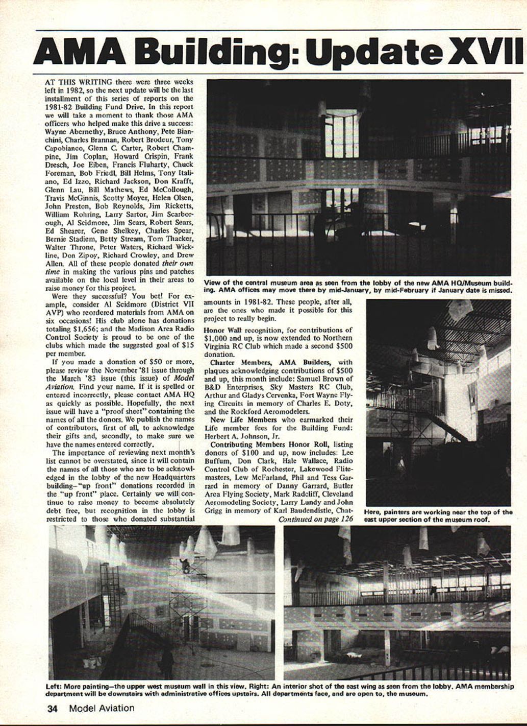 AMA Building Update XVII AT THIS WRITING three weeks left 1982 next update will last installment series reports 1981-82 Building Fund Drive report will take moment thank AMA officers helped make drive success Wayne Abernethy Bruce Anthony Pete Bian chini Charles Brannan Robert Brodeur Tony Capobianco Glenn C Carter Robert Chainpine Jim Coplan Howard Crispin Frank Dresch Joe Eiben Francis Fluharty Chuck Foreman Bob Friedl Bill Helms Tony Itali ano Ed Izzo Richard Jackson Don Krafft Glenn Lau Bill Mathews Ed McCollough Travis McGinnis Scotty Moyer Helen Olsen John Preston Bob Reynolds Jim Ricketts William Rohring Larry Sartor Jim Scarbor ough Al Scidmore Jim Sears Robert Sears Ed Shearer Gene Shelkey Charles Spear Bernie Stadiem Betty Stream Tom Thacker Walter Throne Peter Waters Richard Wickline Don Zipoy Richard Crowley Drew Allen people donated own time making various pins patches available local level areas ralse money project successful bet ex ample consider Al Scidmore District VII AVP reordered materials AMA six occasions club alone has donations totaling $1656 Madison Area Radio Control Society proud clubs made suggested goal $15 per member made donation $50 please review November 81 issue through March 83 issue issue Model Aviation Find name spelled entered incorrectly please contact AMA HQ quickly possible Hopefully next issue will have proof sheet containing names donors publish names contributors first acknowledge gifts secondly make sure have names entered correctly importance reviewing next months list cannot overstated since will contain names acknowl edged lobby new Headquarters building up front donations recorded up front place Certainly will con tinue ralse money become absolutely debt free recognition lobby restricted donated substantial amounts 1981-82 people after ones made possible project really begin Honor Wail- recognition contributions $1000 up now extended Northern Virginia RC Club made second $500 donation Charter Members AMA Builders plaques acknowledging contributions $500 up month include Samuel Brown B&D Enterprises Sky Masters RC Club Arthur Gladys Cervenka Fort Wayne Fly ing Circuits memory Charles E Doty Rockford Aeromodelers New Life Members earmarked Life member fees Building Fund Herbert Johnson Jr Contributing Members Honor Roll listing donors $100 up now includes Lee Buffum Don Clark Hale Wallace Radio Control Club Rochester Lakewood Flite masters Law McFarland Phil Tess Gar rard memory Danny Garrard Butler Area Flying Society Mark Raddilff Cleveland Aeromodeling Society Larry Lundy John Gtigg memory Karl Baudendistle ChatContinued page 126 34 Model Aviation View central museum area seen lobby new AMA HWMuseum build ing AMA offices may move mid-January mid-February January date missed painters working near top east upper section museum roof Left pantingtne upper west museum wail tnis view ilagni n anterior snot tne east wing seen trom tne IODDY AMA memoersnip department will downstairs administrative offices upstairs departments face open museum update loug Spreng\ Battery Manage ment System puhlishtd RCVI has ss jthstood test ol timi orks off 12 volt batters gets oh done less hour eases Yoti can usc SR900 packs hut will take longe built kits fes months ago have used good results Sinee people ask time timh tor good fteld charger now feel can sas ou Il like Its simple operate temperature-compensated reasonably priced charges common four-cell eight-cell combination unIv charges 5011 mA about 85 full charge flight pack 5fl full charge transmitter reverts both safe 35 mA constant charge rate George tIAIier 70 kroehlich Foroi Rd Hiiksx die \ lht0l AMA Building/Mankowski Continued page 34 tanooga RC Club Mt Rainer RC Society Alexander & Alexander Drew Allen Milwau kee Flying Electrons Radio Control League North Carolina Larry Regier Billy Johnston Gold Members donated $50 Building Fund Bill Hinnant John Kirk III Douglas KnothThomas Lacey Philip Judith Coopy Donald Conneil Jesse R Mitchell Boeing Marine Systems Frieda Homer Smith Collins RC Club LARKS Aero Bats Show Team Lee Minim Roy E Hoover Harry C Seth Judson Cushing Bob Burnett Leo Gabriels Nick Nicholson Nick Johnen Charles Alicks Ukiah Prop Busters Leonard Kendy Irvin Aker Tn Valley Radio Control Club William R Bigge Ukiah Prop Busters Leonard Kendy Irvin Aker Tn Valley RC Club William R Bigge Howard L Chapman Herbert Consolvo Allan L Crane DR Cummings AlexanderJ Drum mond Israel Dubin Robert R Erickson Nor man Evans Morton R Ferrell FL Friedli Kenneth L Glemby Elonzo C Gollaher RS Graham Alfred W Griesbach John R Hooker Also included list Gold Members Arthur J Johnson Edgar M Joiley John L Koenreich Dan McDonald Johnny L Mathis Ronald W Merrill John E Miller Robert Miller Joseph M Nunes Lawrence p ott Robert L Payne Russell J Petersen Paul Plecan Kee C Pohar Jay M Replogle Richard Roe Richard C Speidel KF Spiller Edmund W Stone James R Tyndall RA Varcoe Robert W Waterman Robert WinchBig Bangers/Beckman Continued page 39 eases painted red cylinders black After reassembly die-east alumi num manifold aluminum tube exhaust pipe added ready go engine started briefly test run before being shipped final produet reaches customer finest Big Bangers available today some details may differ people converting engines use go through essentially same process exception worth noting Hobby Lobbys Evra 190 19 cu engine has spe eially designed crankcase similar smaller model engines rest parts engine used weed whip crankcase design owned Hobby Lobby engines made manufacturer original engine put ting somewhat same category Quadra Whatever source fine Big Bangers available today what make possible us enjoy Giant Scale modeling convert own engines wouldnt see fly-ins like IMAA Fun Fly Festival hundreds Giant Scale aircraft participating RC Scale/Wischers Continued page 41 available information sources including factory After weeding out misinforma tion producing set correct drawings RCM&E magazine Bob now finds himself l