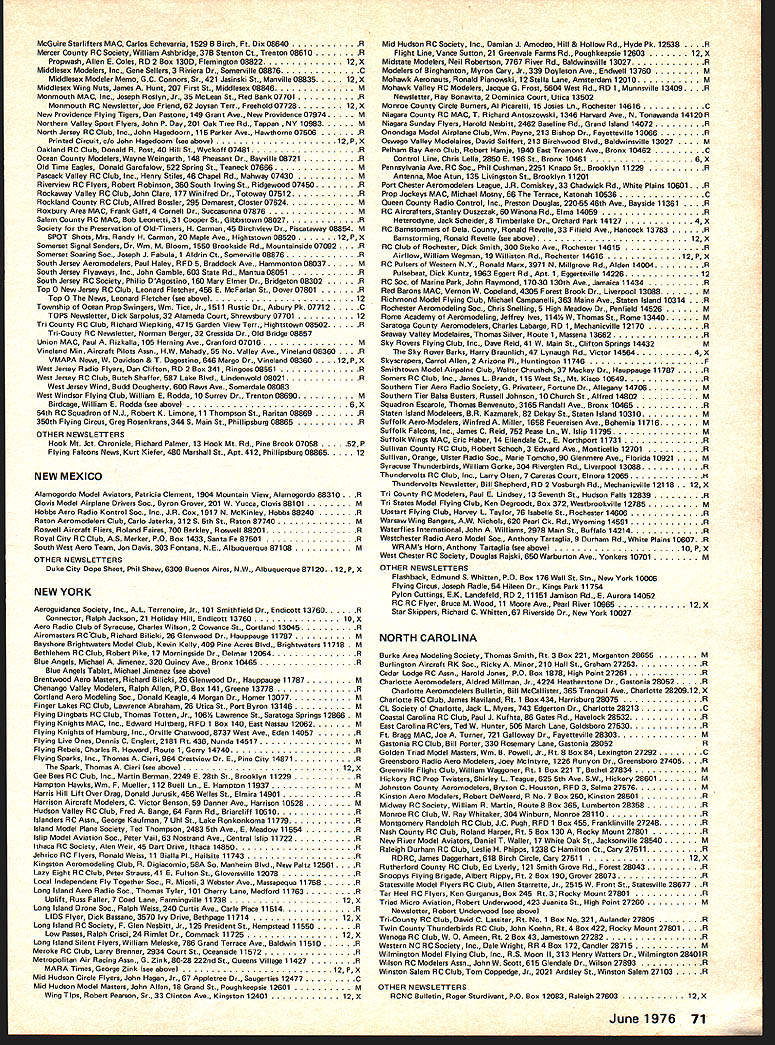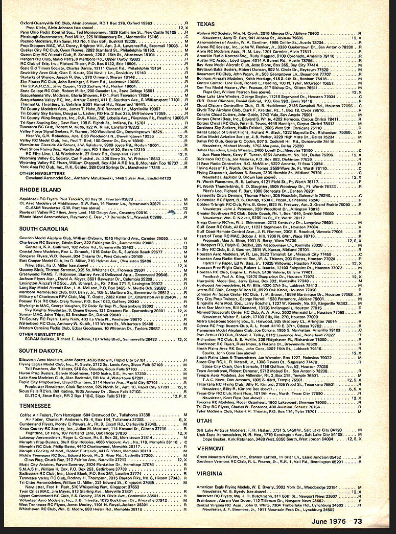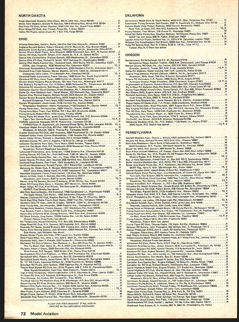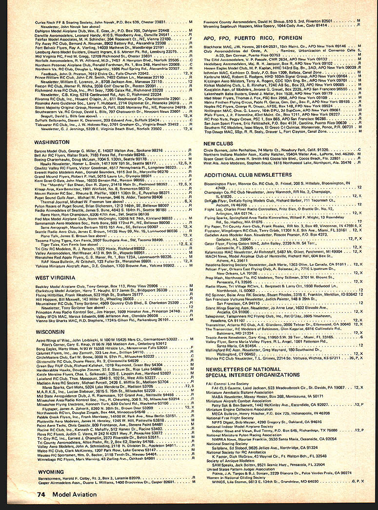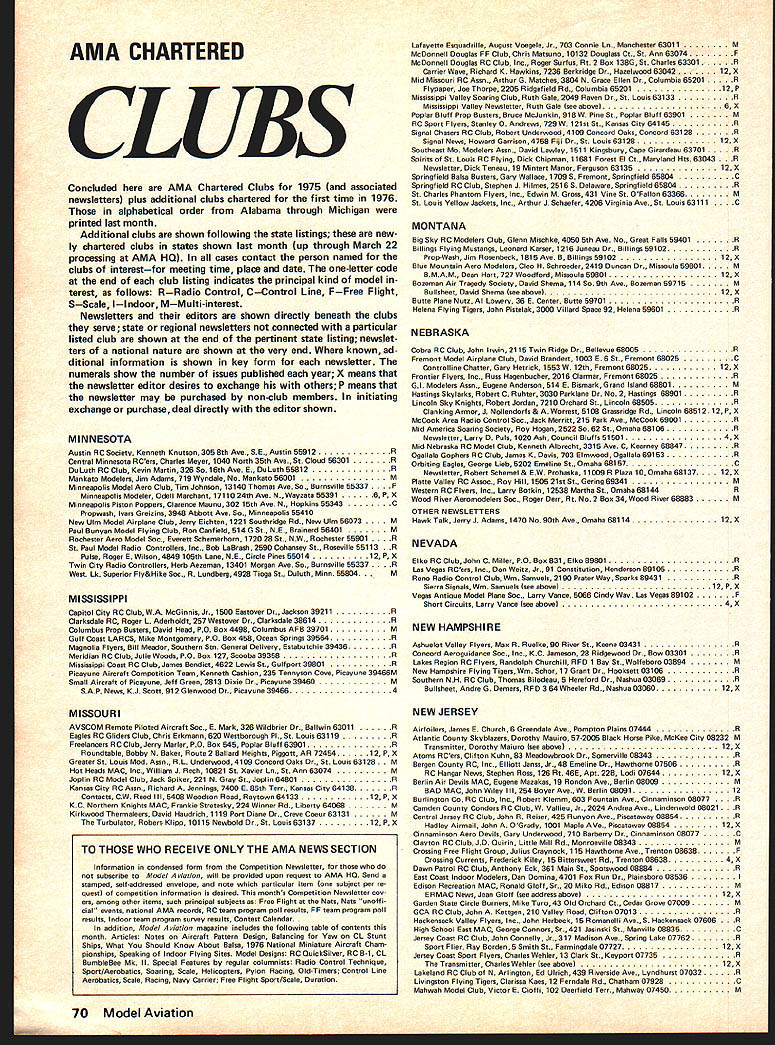 AMA CHARTERED CLUBS Concluded AMA Chartered Clubs 1975 associated newsletters plus additional clubs chartered first time 1976 alphabetical order Alabama through Michigan printed last month Additional clubs shown following state listings new ly chartered clubs states shown last month up through March 22 processing AMA HO cases contact person named clubs interestfor meeting time place date one-letter code end club listing indicates principal kind model terest follows RRadio Control CControl Line FFree Flight SScale IIndoor MMulti-interest Newsletters editors shown directly beneath clubs serve state regional newsletters connected particular listed club shown end pertinent state listing newslet ters national nature shown very end knownad ditional information shown key form newsletter numerals show number issues published year X means newsletter editor desires exchange others P means newsletter may purchased non-club members initiating exchange purchase deal directly editor shown MINNESOTA Austin RC Society Kenneth Knutson 305 8th Ave SE Austin 55912 R Central Mieeesota RCers Charles Meyer 1040 North 35th Ave St Cloud 56301 Fl DuLuth RC Club Kevin Martin 326 So 16th Ave E DuLuth 55812 R Mankato Modelers Jim Adams 719 Wyndale No Mankato 55001 M Minneapolis Model Aero Club Tim Johnson 13140 Thomas Ave So Burnsville 55337 nneapolis Modeler Odell Marchant 1711024th Ave N Wayzata 55391 6P X Minneapolis Piston Poppers Clarence Maunu302 15th Ave N Hopkins 55343 Propreash yam Gmeizins 3948 Abbott Ave So. Minneapolis 55410 New Ulm Model Airplane Club Jerry Eichten 1221 Southridge Rd Nem Ulm 56073 M Paul Bunyan Model Flying Club Ron Canfield 514 G St NE Brainerd 56401 M Rochester Aero Model Soc Everett Schemerhorn 172028 St NW Rochester 55901 Paul Model Radio Controllers Inc Bob LaBrash 2590 Cohansey St Roseville 55113 e Roger E Wilson 4849 105th Lane NE Circle Pines 55014 12 F X Twin City Radio Controllers Herb Aezeman 13401 Morgan Ave So Burnsville 55337 st Lk Superior Fly&Hike Soc R Lundberg 4928 Tioga St. Duluth Mien 55804. M MISSISSIPPI Capitol City RC Club WA McGinnis Jr 1500 Eastover Dr Jackson 39211 R Clarksdale RC Roger L Aderholdt 257 Westover Dr Clarkudale 38614 Fl Columbus Prop Busters David Head PO Box 4498 Columbus AFB 39701 M Gulf Coast LARCS Mike Montgomery PO Box 458 Ocean Springs 39564 R Magnolia Flyers Bill Meador Southern Ste General Delivery Estabutchie 39436 R Meridian RC Club Julie Woods PO Box 127 Scooba 39358 R Mississippi Coast RC Club James Bendict 4622 Lemis St Gulfport 39801 R Picayune Aircraft Competition Team Kenneth Cushion 235 Tennyson Cove Picayune 39466M Small Aircraft Picayune Jeff Green 2813 Dixie Dr Picayune 39460 M SAP Nems KJ Scott 912 Glenmood Dr Picayune 39466 MISSOURI AVSCOM Remote Piloted Aircraft Soc 8 Mark 326 Wildbrier Dr Ballwin 63011 R Eagles RC Gliders Club Chris Erkmann 620 Wesnborough Fl St Louis 63119 R Freelancers RC Club Jerry Marler PO Box 545 Poplar Bluff 63901 R Roundtable Bobby N Baker Route 2 Ballard Heights Figgots AR 72454 12 F X Greater Sn Louis Mod Awn RL Underwood 4106 Concord Oaks Dr St Louis 63128 ot Heads MAC Inc William J Rech 10621 St Xavier Le SI Ann 63074 M Joplin RC Model Club Jack Spiker 221 N Gray St Joplin 64801 R Kansas City RC Asse Richard Jennings 7400 E 85th Terr Kansas City 64138 R Contacts CW Reed 1115408 Woodson Road Raytown 64133 F X KC Northern Knights MAC Frankie Stretesky 224 Winner Rd Liberty 64068 M Kirkwood Thermaleers David Haudrich 1119 Port Diane Dr Creve Conur 63131 urbulator RobertKlipp 10115 Newbold DrSt Louis 63137 12PX Lafayette Esquadrille August Voegele Jr 703 Connie Le Manchester 63011M McDonnell Douglas PP Club Chris Matsuno 10132 Douglass Ct. St Ann 63074F McDonnell Douglas RC Club Inc Roger Surfus Rt 2 Box 138G St Charles 63301R Carrier Wave Richard K Hawkins 7236 Berkridge Dr Hazelmood 6304212 X Mid Missouri RC Asse Arthur 0 Matches 3804 N Grace Ellen Dr Columbia 65201R Flypaper Joe Thorpe 2205 Ridgefield Rd Columbia 6520112 P Mississippi Valley Soaring Club Ruth Gale 2049 Raven Dr St Louis 63133R Mississippi Valley Newsletter Ruth Gale Isee abovel6 X Poplar Bluff Prop Busters Bruce McJunkin 918W Pine St Poplar Bluff 63901M RC Sport Flyers Stanley 0 Andrews 729W 121st St. Kansas City 64145R Signal Chasers RC Club Robert Underwood4109 Concord Oaks Concord 63128R Signal News Howard Garrison 4758 Fiji DrSt Louis 6312812X Southeast Mo Modelers Asun. David Lawley 1511 Kingsbury Cape Girardeas 63701Fl Spirits St Louis RC Flying Dick Chipman 11681 Forest El Ct Maryland Hts 63043 sletter Dick Teneax 19 Mintert Manor Ferguson 6313512 X Springfield Balsa Busters Gary Wallace 1709S Frewont Springfield 65804C Springfield RC Club Stephen J Hilmes 2516 S Delaware Springfield 65804R St Charles Phantom Flyers Inc. Edwin M Gross 431 Vine St OFallon 63366M St Lours Yellow Jackets Inc. Arthur J Schaefer 4206 Virginia Ave St Louis 63111 NTANA Big Sky RC Modelers Club Glenn Mischke 4050 5th Ave No Great Fulls 59401R Billings Flying Mustangs Leonard Karser 1216 Juneau Dr Billings 59102R Prop-Wash Jim Rosenbeck 1815 Ave B Billings 5910212 X Blue Mountain Aero Modelers Cino H Schroeder 2419 Duncan Dr Missoula 59801M BMAM Dean Hart 727 Woodford Missoula 5980112 X Bozeman Air Tragedy Society David Shema1145oBth Ave Bozewan 59715M Bullsheet David Shema see above12 X Butte Plane Nutz Al Lowery 38 E Center Butte 59701R Helena Flying Tigers John Pistelak 3000 Villurd Space 92 Helena 59601R N EBRASKA Cobra RC Club John Irwin 2115 Twin Ridge Dr Bellevue 68005 R Frewont Model Airplane Club David Brandert 1003 E 6 St Fremont 68025 C Controlline Chatter Gary Hetrick 1553W 12th Fremonl 68025 12 X Frontier Flyers Inc Rust Hagenbucher 2016 Clarmar Fremont 68025 R GI Modelers Ante Eugene Anderson 514 E Bismark Grand Island 68501 M Hastings Skylarks Robert C Ruhter 3030 Farklane Dr No2 Hastings 68901 R Lincoln Sky Knights Robert Jordan 7210 Orchard St Lincoln 68505 R Clanking Armor J Nollendorfs& AWorrest5108 Grassridge Rd Lincoln 68512 1