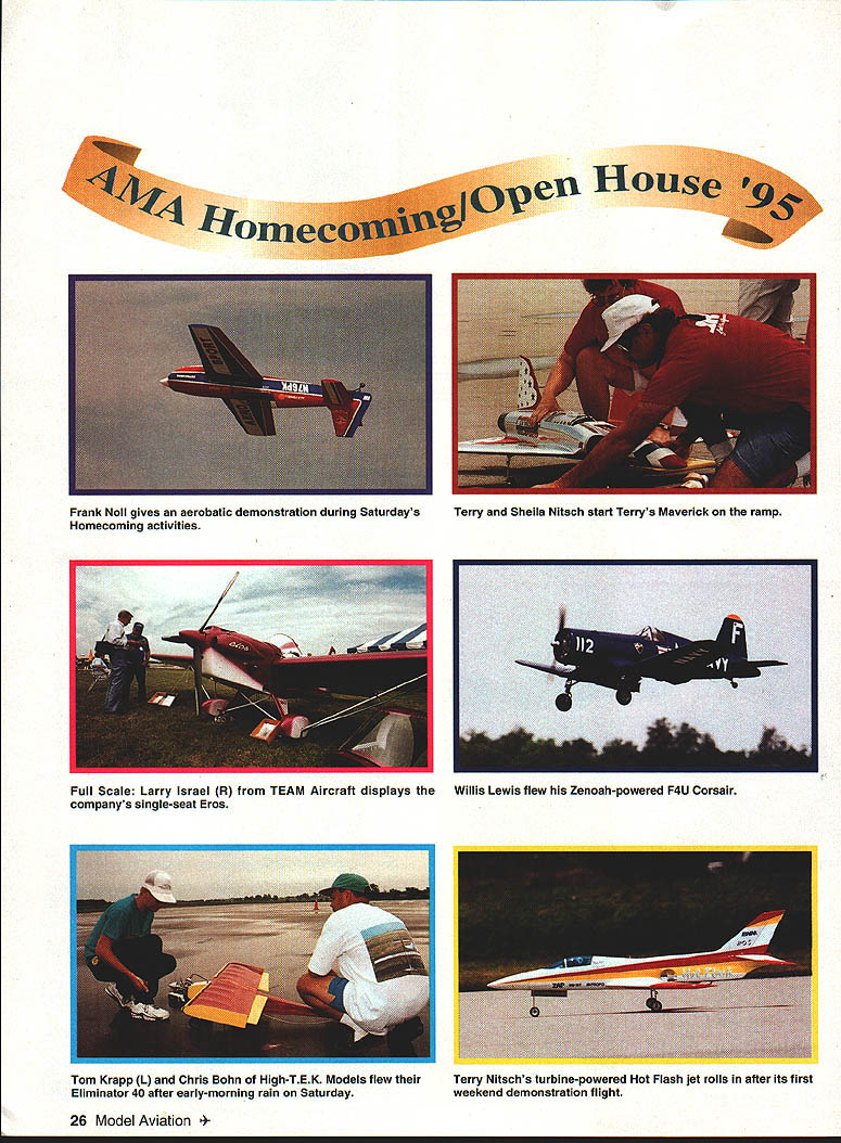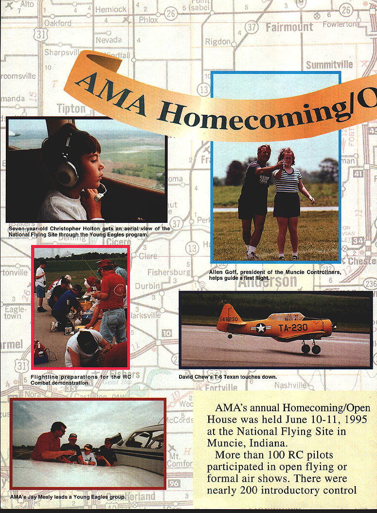 AMAs annual Homecoming/Open House held June 10-11 1995 National Flying Site Muncie Indiana 100 RC pilots participated open flying formal air shows nearly 200 introductory control ton Gaff president Muncie ContraLiners helps guide first flight David Chews T-6 Texan touches down efl Hot Eu Fork~ flights 66 youngsters flew full-scale aircraft part Young Eagles program Other activities included kite flying RC training flights exhibitor displays candy drop RC Combat demonstration Texans wait flightilne Photography Matthew Usher Graphic Design Carla Kunz Paul Kiusman demonstrates Cox Tee Dee 049powered Lite Machines LMH-100 Golden Age Gary Doerens pretty Wedell-Williams air racer Full Scale Larry Israel R TEAM Aircraft displays companys single-seat Eros lion -U26 Model Aviation k Noll gives aerobatic demonstration during Saturdays Homecoming activities / Terry Sheila Nitsch start Terrys Maverick ramp Willis Lewis flew Zenoah-powered F4U Corsair Tom Krapp L Chris Bohn High-TEK Models flew theirTerry Nitschs turbine-powered Hot Flash jet rolls after its first Eliminator 40 after early-morning rain Saturdayweekend demonstration flight