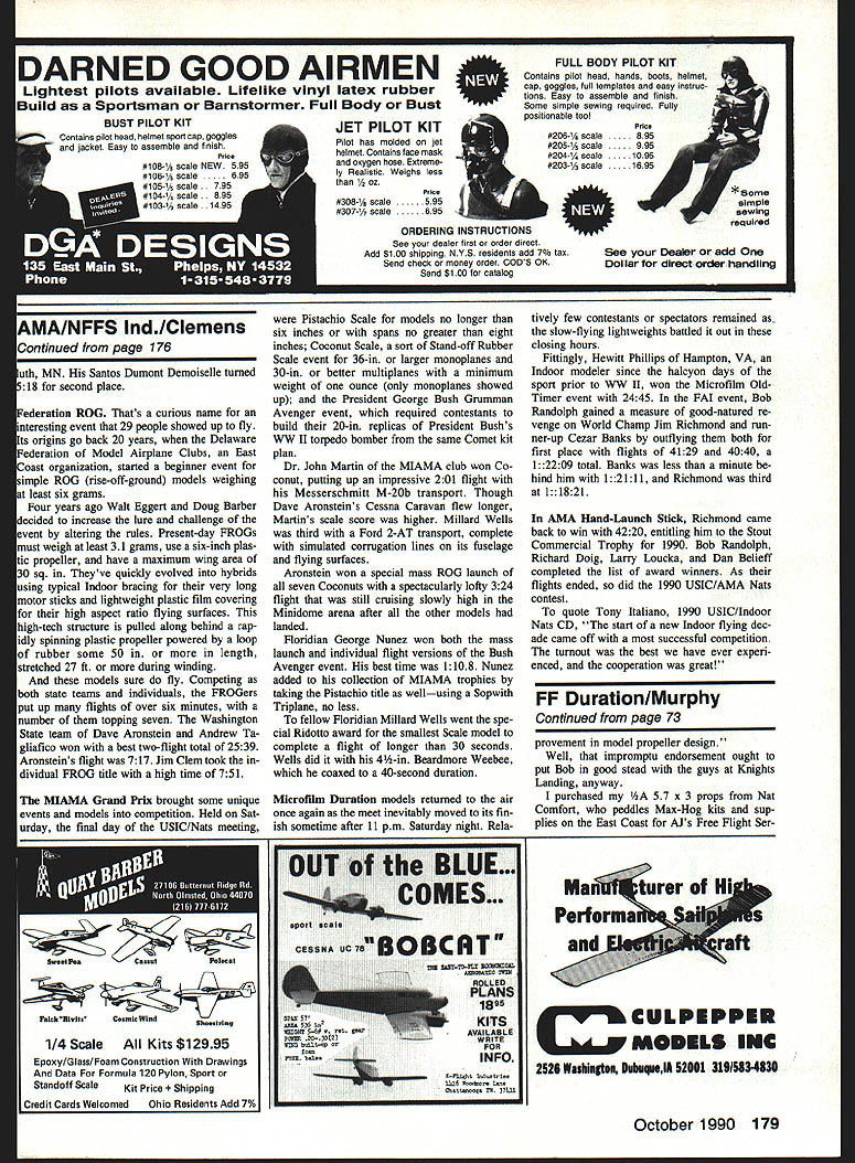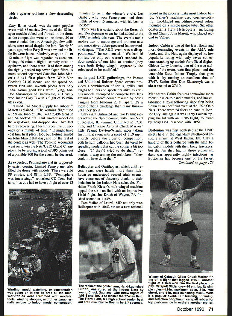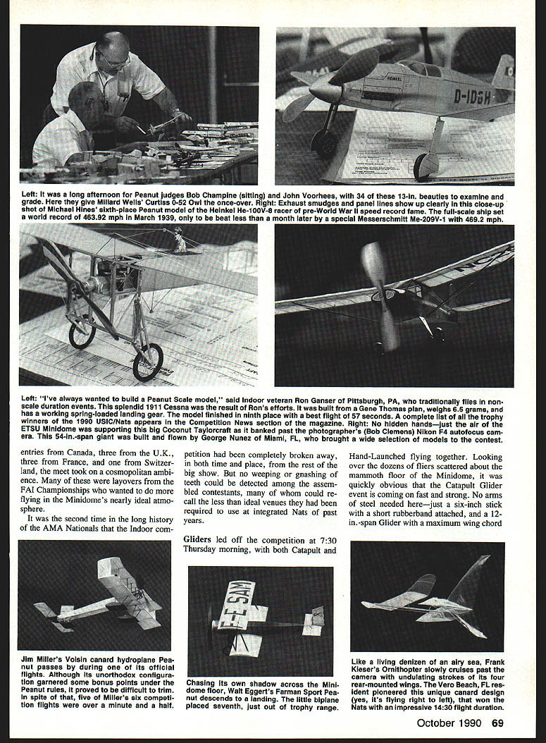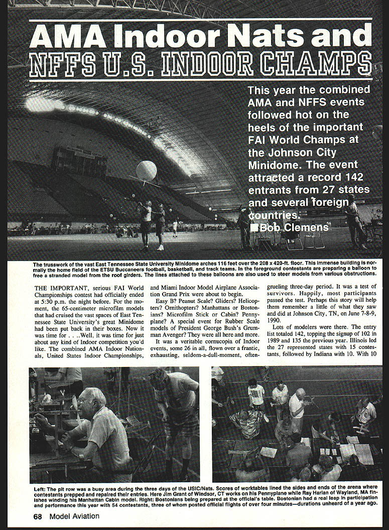 Au I Eu S trusawork OT yarn earn uuee irnu unIvuw uuuuuu eet over 208 x 420-ft floor Immense bi or maNy home field ETSU Buccaneers football bauietbalI track teams foreground contestants preparing free stranded model roof girders lines attached balloons also used steer models various obstructions THE IMPORTANT serious FAI World Championships contest officially ended 530 pm night before mo ment 65-centimeter microfilm models cruised vast spaces East Ten nessee State Universitys great Minidome put back boxes Now time l time just about kind Indoor competition youd like combined AMA Indoor Nation als United States Indoor Championships Miami Indoor Model Airplane Associa tion Grand Prix about begin Easy B Peanut Scale Gliders Helicop ters Ornithopters Manhattans Boston ians Microfilm Stick Cabin Pennyplane special event Rubber Scale models President George Bushs Grum man Avenger veritable cornucopia Indoor events some 26 flown over frantic exhausting seldom-a-dull-moment oftengrueling three-day period test survivors Happily participants passed test Perhaps story will help remember little what saw did Johnson City TN June 7-8-9 1990 Lots modelers entry list totaled 142 topping signup 102 1989 135 previous year Illinois led 27 represented states 15 contes tants followed Indiana 10 10 Left pit row busy area during three days USiC/Nats Scores worktables lined sides ends arena contestants prepped repaired entries Jim Grant Windsor CT works Pennyplane Ray Harlan Wayland MA fin ishes winding Manhattan Cabin model Right Bostonians being prepared offlciais table Bostonian real leap participation perfQrmance year 54 contestants three posted offlciai flights over four minutesdurations unheard year ago 68 Model Aviation Left Ive always wanted build Peanut Scale model said Indoor veteran Ron Ganser Pittsburgh PA traditionally flies nonscale duration events splendid 1911 Cessna result Rons efforts built Gene Thomas plan weighs 65 grams has working spring-loaded landing gear model finished ninth place best flight 57 seconds complete list trophy winners 1990 USIC/Nats appears Competition News section magazine Right No hidden handsjust air ETSU Mlnidome supporting big Coconut Taylorcraft banked past photographers Bob Clemens Nikon F4 autofocus cam era 54-in-span giant built flown George Nunez Miami FL brought wide selection models contest entries Canada three UK three France Switzer land meet took cosmopolitan ambi ence layovers FM Championships wanted flying Minidomes nearly ideal atmo sphere second time long history AMA Nationals Indoor com petition completely broken away both time place rest big show no weeping gnashing teeth could detected among assem bled contestants could re call less ideal venues required use integrated Nats past years Hand-Launched flying together Looking over dozens fliers scattered about mammoth floor Minidome quickly obvious Catapult Glider event coming fast strong No arms steel needed herejust six-inch stick short rubberband attached 12in -span Glider maximum wing chord Like living denizen airy sea Frank Kiesers Ornithopter slowly cruises past camera undulating strokes Its four rear-mounted wings Vero Beach FL res ident pioneered unique canard design yes its flying right left won Nats Impressive 1430 flight duration October 1990 69 Left it long afternoon Peanut judges Bob Champine sitting John Voorhees 34 13-in beauties examine grade give Mliiard Wells Curtiss 0-52 Owl once-ove DIMt Exhaust smudges panel lines show up clearly close-up shot Michael Hines sixth-place Peanut model r pre-Worid War ii speed record fame full-scale shio set wand rnanrd af AA29 mnh Mnrrh 1020 th later special Messerschmitt Me-209V-1 Gliders led off competition 730 Thursday morning both Catapult Jim Millers Volsin canard hydroplane Pea nut passes during its official flights Although its unorthodox configura tion garnered some bonus points under nasIng Its own shadow across MiniPeanut rules proved difficult trim dome floor Walt Eggerts Farman Sport Pea spite five Millers six competi nut descends landing little biplane tion flights over minute half placed seventh just out trophy range three inches catapulters outnumbered throw ers 46 27 tyros among quickly discovered hardto-master subtleties seemingly sim ple event couldnt over minute forget about winning trophy totally unique appearance typical Federation ROG shows clearly exam ple passes directly overhead Despite being limited mere 30 sq wing area FROGs blend simplicity hightechnology can produce flights well over seven minutes using six-inch plastic prop Note thin bracing wires extending down either side models motor stick Left Del Ogren Deerfield IL flew multi-plane design Lim ited Pennypiane triplane wing biplane tail Ogren noted fanciful creations placed 14th best flight 1141 Above out synch year said Don Lindley Naperville IL about Bostonian seen cruising sixth-place score would have won event 1989 USiCI Dons proposal put Bostonian rule book official AMA indoor event Winners people seemed to ride arrowlike launch put enjoying event attracting just under 116-ft ceiling flicked modelers wouldnt touch HandLaunched Glider 10-foot pole included such unlikely Glider fliers Ce zar Banks winning United States World Champs team longtime microfilmer Bob Champine placed sixth Phil Klintworth Pennyplaner Gordon Wisniew ski Rich Doig best flights seemed Disaster Richard Doig catches microfilmcovered Hand-Launch Stick after attempt cloud Easy-B models floats overhead balloon away cluster ceiling during competition 18-in lightweights speakers went awry folding fragile wing day USIC/Nats Always popand sending model slowly spiraling ular event Easy B drew 83 entries year floor Later Richard managed garner wasnt unusual see 20 third place event 3931 flIght smali airplanes airborne same time 70 Model Aviation Left A Zippy Sport home-built flies its way fourth-place finish AMA Rubber Scale Built John Blair Warren NV model weighed 30 grams easily put two flights over 90 se