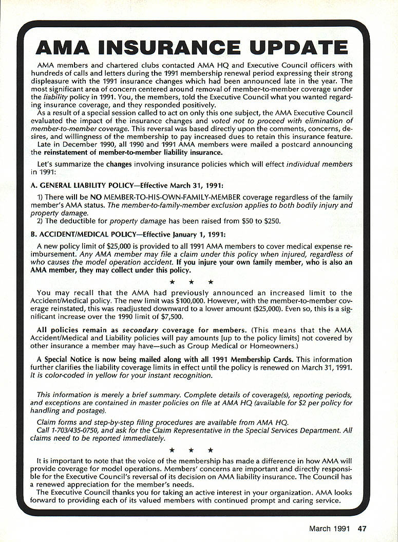 AMA INSURANCE UPDATE AMA members chartered clubs contacted AMA HQ Executive Council officers hundreds calls letters during 1991 membership renewal period expressing strong displeasure 1991 insurance changes announced late year significant area concern centered around removal member-to-member coverage under liability policy 1991 members told Executive Council what wanted regard ing insurance coverage responded positively As result special session called act subject AMA Executive Council evaluated impact insurance changes voted proceed elimination member-to-member cove rage reversal based directly upon comments concerns de sires willingness membership pay increased dues retain insurance feature Late December 1990 1990 1991 AMA members mailed postcard announcing reinstatement member-to-member liability insurance Lets summarize changes involving insurance policies will effect individual members 1991 A GENERAL LIABILITY POLICYEffective March 31 1991 1 will NO MEMBER-TO-HIS-OWN-FAMILY-MEMBER coverage regardless family members AMA status member-to-family-member exclusion applies both bodily injury property damage 2 deductible property damage has raised $50 $250 B ACCIDENT/MEDICAL POLICYEffective January 1 1991 new policy limit $25000 provided 1991 AMA members cover medical expense re imbursement Any AMA member may file claim under policy injured regardless causes model operation accident injure own family member also AMA member may collect under policy *** may recall AMA previously announced increased limit Accident/Medical policy new limit $100000 However member-to-member cov erage reinstated readjusted downward lower amount $25000 sig nificant increase over 1990 limit $7500 policies remain secondary coverage members means AMA Accident/Medical Liability policies will pay amounts [up policy limits] covered other insurance member may havesuch Group Medical Homeowners Special Notice now being mailed along 1991 Membership Cards information further clarifies liability coverage limits effect until policy renewed March 31 1991 color-coded yellow instant recognition information merely brief summary Complete details coverages reporting periods exceptions contained master policies file AMA HQ available $2 per policy handling postage Claim forms step-by-step filing procedures available AMA HQ Call 1-703/435-0750 ask Claim Representative Special Services Department claims need reported immediately *** important note voice membership has made difference AMA will provide coverage model operations Members concerns important directly responsi ble Executive Councils reversal its decision AMA liability insurance Council has renewed appreciation members needs Executive Council thanks taking active interest organization AMA looks forward providing its valued members continued prompt caring service March 1991 47 r