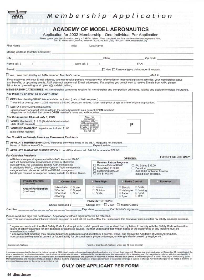 ACADEMY OF MODEL AERONAUTICS Application for 2002 Membership - One Individual Per Application Please type or print the information clearly in CAPITAL letters. When completed, this form can be mailed with payment to AMA, 5161 E. Memorial Dr., Muncie, Indiana 47302-9252, Fax: (765) 741-0057, www.modelaircraft.org First Name Initial Last Name Mailing Address (number and street) City___________________ State _ Zip Code Home tel.: (. E-mail: __ Work tel.: (. FAX: (. New Renewal (give old number if known) _______________________ AMA #: Yes, I was recruited by an AMA member. Member's name If you supply us with your E-mail address, you may receive periodic messages with information on important legislative activities, your membership status and benefits, or upcoming events. AMA does not trade or sell E-mail addresses. If at anytime you do not want to receive E-mails from AMA, please let us know by e-mailing us at cpierce@modelaircraft.org MEMBERSHIP CATEGORIES: All membership categories receive full membership and competition privileges, liability and accident/medical insurance. For those 19 or over as of July 1, 2002 OPEN Membership $48.00 Model Aviation included. (date of birth required) ______________ Those 65 or over by July 1, 2002 may take a $10.00 deduction in dues. (Must have proof of age at time of original application.) EXTRA Family Membership $30.00 (applies to any one adult who resides in the same household as a current OPEN member) Magazine not included. List current OPEN member's name and AMA number. ___________________________ For those under 19 as of July 1, 2002 YOUTH Membership $13.00 (Model Aviation included) (date of birth required) _______________ YOUTH/NO MAGAZINE magazine not included $1.00 (date of birth required) ______________ For Non-US and North American Permanent Residents C AFFILIATE MEMBERSHIP $28.00 insurance only while flying in the USA. Magazine not included. Name of National Aero Club _________________________ Expiration date ______ AFFILIATE MAGAZINE SUBSCRIPTION to non-US address - add $44.00 for a total of $72.00. For Canadian Residents AMA has a reciprocal agreement with MAAC. A current MAAC card will be honored at all sanctioned events or chartered club activities. For Canadians desiring AMA membership in addition to MAAC, choose either Open or Youth membership categories listed above. An additional $20.00 postage and handling is required for magazine delivery outside the United States. OPTIONS: FOR OFFICE USE ONLY Museum Patron Programs Museum Patron $25.00 Supporting $100.00 Sustaining $500.00 Life $1,000.00 FAI Stamp $35.00 Donation ______ H Add $6.00 for Model Aviation mailed in an envelope. Primary Interests: (check one) Area of Participation: (check one) J Control Line L- Aerobatic L Scale 1 1 Carrier D Speed Q Combat n Sport n Racing ss^ ale N U Ira =pH D Oi Free Flight U Indoor Q Outdoor Scale D Electric i Scale n Helicopter n Soaring Q Pattern Q Sport D py|on aJets U Rocketry PAYMENT OPTIONS: __ Charge my G VISA G MasterCard $ _ Card No. _ _ _ __-_ _ _ _-_ _ _ _ -_ _ _ _ Exp. date _ __/__ _ Cardholder's signature Check enclosed $ Please read and sign this declaration. Applications without signatures will be returned. Note: This waiver means that if I am involved in any claim or suit I will not sue the AMA, Inc. I understand that this waiver does not affect my liability insurance coverage. "I agree to comply with the AMA Safety Code for all applicable model operations. I understand that my failure to comply with the Safety Code will result in failure of liability coverage for any damages or claims so caused. I further understand that written notice of the occurrence of any incident must be immediately provided. "I am aware that modeling may present hazards to participants and spectators. I exempt, waive, and relieve the Academy of Model Aeronautics, Incorporated (AMA) from all current or future liability for personal injury, property damage, or wrongful death caused by negligence." Signature of Applicant _ Parent or Guardian of Applicant under age 18 must also sign _ Insurance coverage is effective on the date of receipt at AMA Headquarters of a properly completed application and correct dues payment. Membership ends each year on December 31, regardless of the date a membership application is received. Applications received after October 1 will be valid for the remainder of that year and all of the following year. If a magazine is included with the membership, it begins with the first issue available for the year after a correct current application and payment are received; it expires with the issue printed in December (which is dated February of the following year). Membership rates and insurance limits are those in effect at the time of printing. Actual cost of dues and amount of insurance coverage is subject to change. Any such changes will be noted at the time of membership processing so they may be accepted or not. ONLY ONE APPLICANT PER FORM