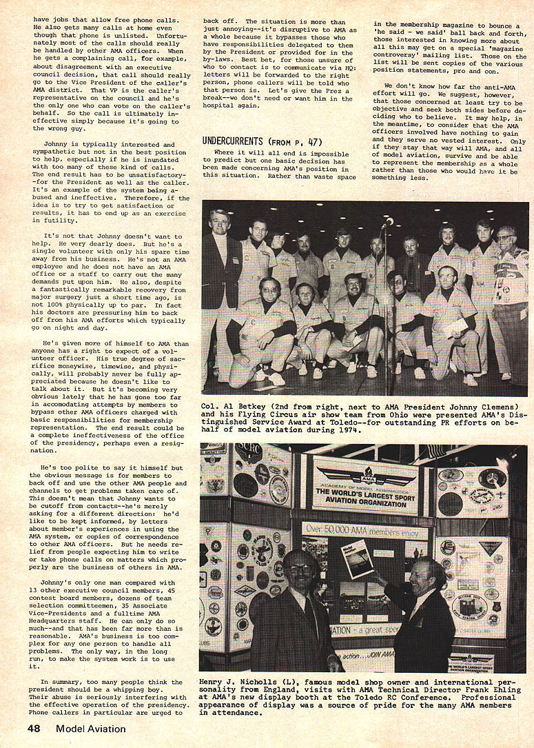 A M* AMA ACADEMY OF MODEL AERONAUTICS U WUU 806 FIFTEENTH ST NW. WASHINGTON DC 20005 monthly mailing AMA HQ Executive Director NO 100 MORE UNDERCURRENTS March issue AMAs Monthly Mailing column headed Undercur rents noted some model press publishers reacted angrily AMAs entry magazine field re action included lengthy letters circu lated extensively two publish ers intended prove AMAs mag azine decision would financial dis aster among other allegations though letters re futed AMA circulation counter re sponses letters has published June 1975 issue Model Airplane News Presumably other letter may expected seen soon already RC Modeler magazine letter MAN added con siderably additional editorial comment Yet AMAs rebuttal included hardly example fair play Meanwhile movement being promoted combination model press industry people establish another organization substitute AMA attempt create competitor lf no real concern thinking behind Presumably new organization would expected same people have face same consequences logical conclusion situation say AMA decision made majority vote elected volunteer ficers respected Does matter organization involv ed end result give such pressures Continued page 48 EASY ON THE PREZI No AMA President has ever visible accessible Johnny Clem ens also has job longer previous president nd has traveled talked AMA members anyone before him Its nature way mostly enjoys personal contacts mem bers has built himself image monster may devour him unless turned around different dir ection problem too members have ignoring normal basic channels getting problems sol ved complaints looked As re sult being bombarded phone calls mail about aspect AMA operation being contacted about contest board team selection Nationals member ship processing insurance flying site other problems Most should handled district Vice-Pres idents Associate VPs Contest Board members various special committeemen and/or AMA HQ too people going straight top ef fect taking severe toll Presidents ability function interfering presidential duties largely re quire long range thinking leadership AMAS Executive Council basic pol icy matters AMA ruining business home life Johnny hobby shop owner AMA calls place business hurting bus iness badly-particularly since tend long drawn out callers July1975 47 have jobs allow free phone cells also gets calls home though phone unlisted Unfortu nately cells should really handled other AMA officers gets complaining cell example about disagreement executive council decision call should really go Vice President callers AMA district VP callers representative council hes can vote callers behalf So call ultimately effective simply because its going wrong guy Johnny typically interested sympathetic best position help especially inundated too kind calls end result has unsatisfactoryfor President well caller Its example system being abused ineffective Therefore idea try get satisfaction results has end up exercise futility Its Johnny doesnt want help very dearly does hes single volunteer spare time away business Hes AMA employee does have AMA off ice staff carry out demands put upon him also despite fantastically remarkable recovery major surgery just short time ago 100% physically up par fact doctors pressuring him back off AMA efforts typically go night day Hes given himself AMA anyone has right expect vol unteer officer true degree sac rifice moneywise timewise physi cally will probably never fully ap preciated because doesnt like talk about its becoming very obvious lately has gone too far accomodating attempts members bypass other AMA officers charged basic responsibilities membership representation end result could complete ineffectiveness office presidency perhaps resig nation Hes too polite say himself obvious message members back off use other AMA people channels get problems taken care Aoesnt mean Johnny wants cutoff contactshes merely asking different direction hed like kept informed letters about member s experiences using AMA system copies correspondence other AMA officers needs re lief people expecting him write take phone calls matters pro perly business others AMA Johnnys man compared 13 other executive council members 45 contest board members dozens team selection committeemen 35 Associate VicePresidents fulltime AMA Headquarters staff can muchand has far reasonable AMAs business too com plex person handle problems way long run make system work use suxmsary ton people think president should whipping boy abuse seriously interfering effective operation presidency Phone callers particular urged back off situation just annoyingits disruptive AMA whole because bypasses have responsibilities delegated President provided bylaws Best bet unsure contact communicate via HQ letters will forwarded right person phone callers will told person lets give Prez breakwe dont need want him hospital again UNDERCURRENTS FROM ill end impossible predict basic decision has made concerning AMAs position situation Rather waste space membership magazine bounce said said ball back forth interested knowing about may get special magazine controversy mailing list list will sent copies various position statements pro con dont know far anti-AMA ef fort will go suggest however concerned least try objective seek both sides before de ciding believe may help meantime consider AMA off icers involved have nothing gain serve no vested interest Only stay way will AMA model aviation survive able represent membership whole rather would have something less Col Al Betkey 2nd right next AMA President Johnny Clemens Flying Circus air show team Ohio presented AMAs Dis tinguished Service Award Toledo--for outstanding PR efforts half ncdel aviation during 1974 Henry J Nicholls CL fasous nodel shop owner international per sonality England visits AMA Technical Director Frank Ehling AMAs new display booth Toledo RC Conference Professional appearance display source pride AMA nembers attendance 48 Model Aviation