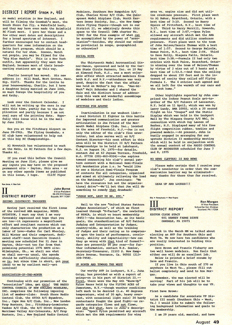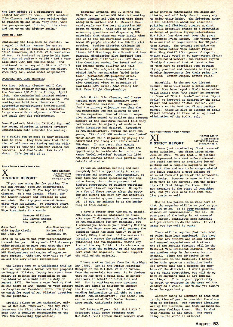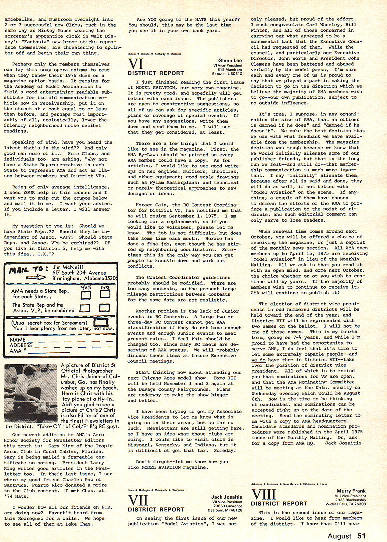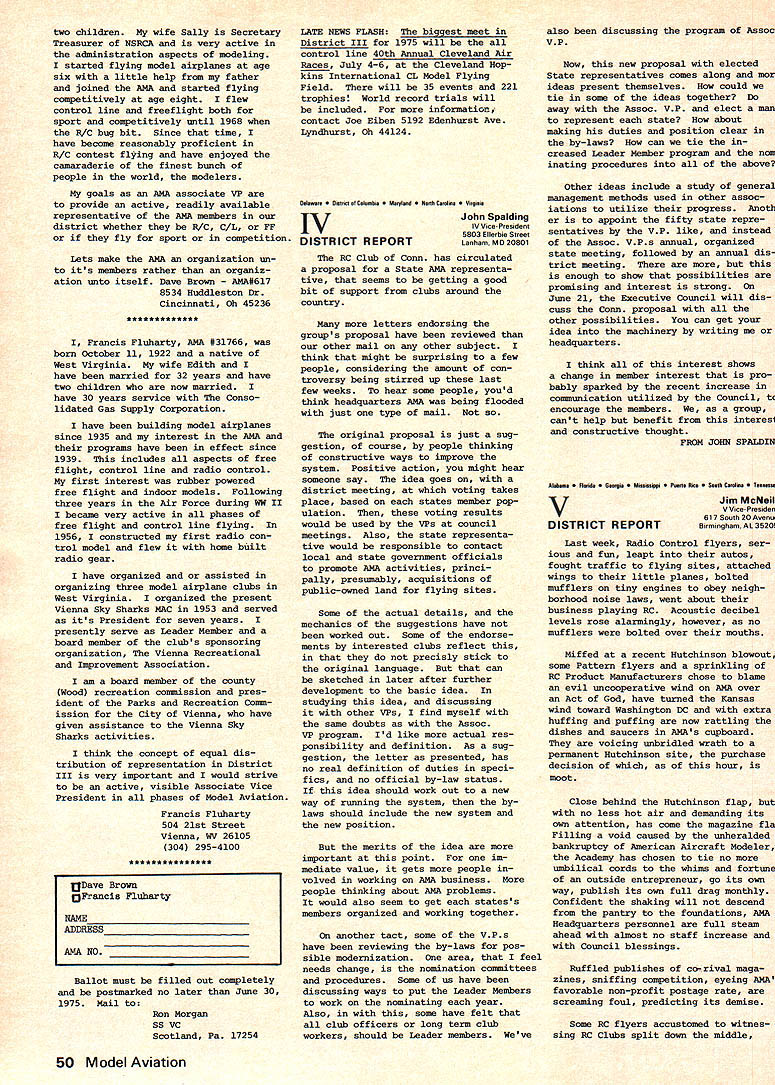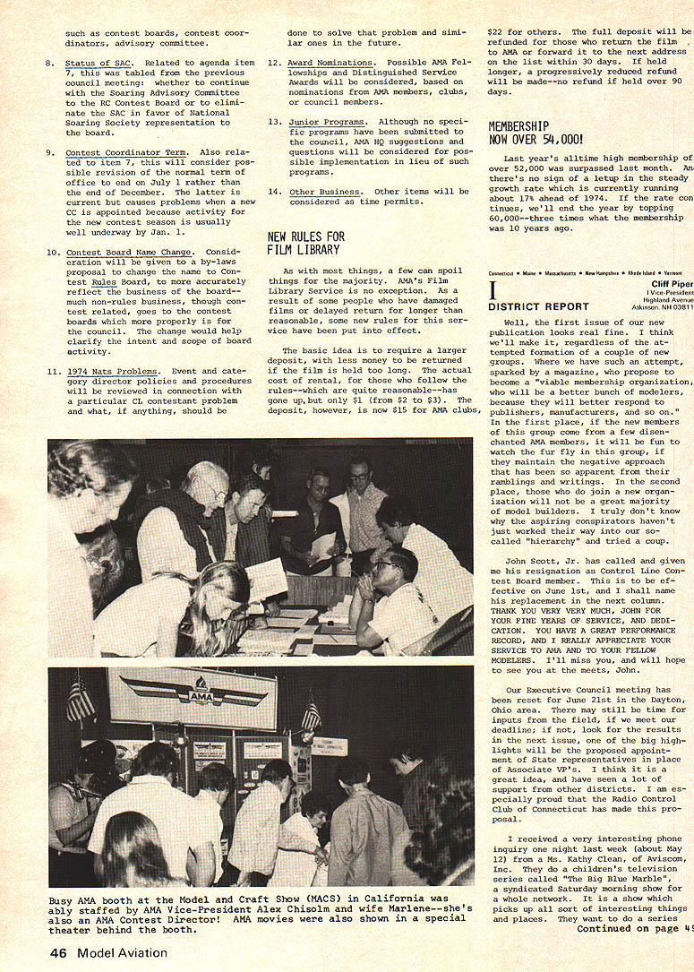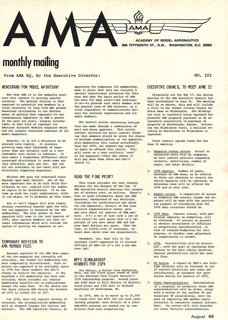 A M* AMA ACADEMY OF MODEL AERONAUTICS U 7UU 806 FIFTEENTH ST NW WASHINGTON DC 20005 monthly mailing AMA HQ Executive Director No 101 NEWSSTAND FOR MODEL AVIATION Now AMA magazine busi ness subject getting careful scrutiny general feeling exposure potential new members vital necessity long term AMA growth Newsstand circulation obvious means getting exposure--it tremendously important AMAs growth past ten years largely attribu table kind exposure via American Aircraft Modeler magazine largest newsstand exposure model magazines Nowever direction entered lightly involves printing thousands maga zines actually sold con siderable cost factor inherent also makes tremendous difference newsstand distributor usedsome very effective not available usemost will distribute competing magazines Whether AMA goes newsstand route depends upon factors moat important has dis tributor use coupled number copies distributed can come up right combination means well probably go route wont happen year simply because everything depends upon well new magazine accepted AMA membership real answer question will come last quarter 1975 current members sent re newal information will include option getting magazine TEMPORARY REVISION TO AMA MEMBER FEES Because reprints AMA News pages new magazine currently available former $12 membership has temporarily discontinued Such re prints expected available again 1976 members dont choose receive magazine meantime $10 membership has sub stituted includes regular membership benefits no publications except rule book So choice now joining AMA during balance 1975 either $10 $17 1976 reprint service restored nopublication membership will dropped except Juniors Seniors AMA Executive Councils approving temporary $10 membership made plain strictly special transitional situation year basic policy AMA has yearsand continues be-to provide adult member general news AMA business vital ingredient communications bet ween national organization its adult members council action concerning revised fees made through combination mail phone approval action further verified basic council think ing members should given choice minimum communications magazine membership fees scaled accordingly Thus 1976 members may expect again offered choice will serve very realistic vote magazinethose choose will pay dont choose READ THE FINE PRINT issue includes very lengthy minutes minutes Feb 15 AMA Executive Council meeting-the longest set minutes ever believe Theres lots good information about AMA operates background key decisions including controversial about new magazine details district representative voted pros cons about aspects AMA mat ters Its lot text lot fine printto save spacebut its im portant care about AMA dues dollars spent Take time little bits necessary learn about own organization Remember too straight stuff-approved 13 elected officers AMAso its man snow job NFFS SCHOLARSHIP WINNERS FOR 1974 Joe Mekina Senior Barberton Ohio won first place award $600 National Free Flight Societys 1974 Scholarship program Second place $400 went Bill Shailer Detroit third place $300 went Richard Maccleary Birmingham NI 1975 AMA match up $1000 funds NFFS next scho larship program details joint AMANFFS program worked out com mittees organization EXECUTIVE COUNCIL TO MEET JUNE 21 Originally set May 17 Spring meeting AMA Executive Council has rescheduled June 21 meeting will Dayton Ohio will include visit former Clinton County Air Force Base Wilmington Wilming ton site currently being explored possible AMA property purchase al ternative possibility purchase property Nutchinson Kansas Follow ing Wilmington visit decision re lating Nutchinson vs Wilmington expected Other council agenda items June 21 meeting 1 Magazine status review Actual vs projected costs will compared will current policies regarding contents advertising number pages other details 2 1976 Reprint Number pages contents AMA News offered choosing receive entire magazine will explored determine what will offered 1976 what cost 3 Budget review comparison actual vs budgeted AMA overall income ex penses will made particu lar purpose estimating what 1976 dues structure should 4 1975 Bats Current status par ticular emphasis budgeting will reviewed concern present whether recruitment officials progressing satisfactorily view reduced budgeting purpose whether some adjustment compensation needed 5 1976 Possibilities will discus sed narrowing down choices likely location General possibilities exist firm 6 PR Review report AMAs new fulltime director will reviewed see current priorities costs satisfactory guidance oper ations during balance 1975 7 State Representatives Consideration proposal establish state AMA representatives will given along review current VP Associate VP relationship goal improving AMA member repre sentation executive council actions Note review will also consider other district representation August 45 such contest boards contest coor dinators advisory committee 8 Status SAC Related agenda item 7 tabled previous council meetingt whether continue Soaring Advisory Committee RC Contest Board elimi nate SAC favor National Soaring Society representation board 9 Contest Coordinator Term Also rela ted item 7 will consider pos sible revision normal term office end July 1 rather end December latter current causes problems new CC appointed because activity new contest season usually well underway Jan 1 10 Contest Board Name Change Consid eration will given by-laws proposal change name Con test Rules Board accurately reflect business beard much nonrules business though con test related goes contest boards properly council change would help clarify intent scope board activity 11 1974 Nats Problems Event cate gory director policies procedures will reviewed connection particular CL contestant problem what anything should done solve problem simi lar ones future 12 Award Nominations Possible AMA Fel lowships Distinguished Service Awards will considered based nominat