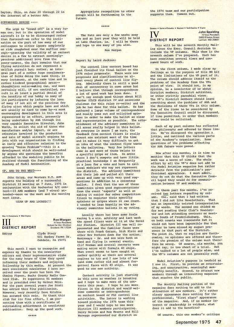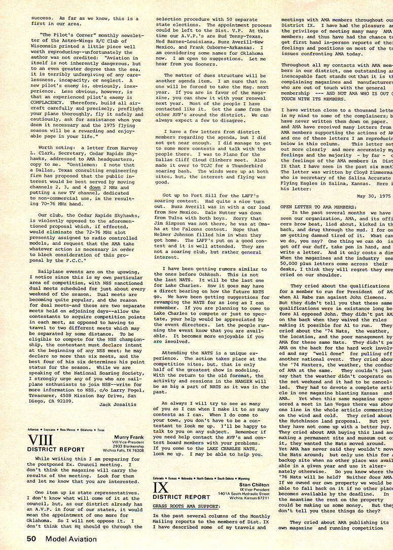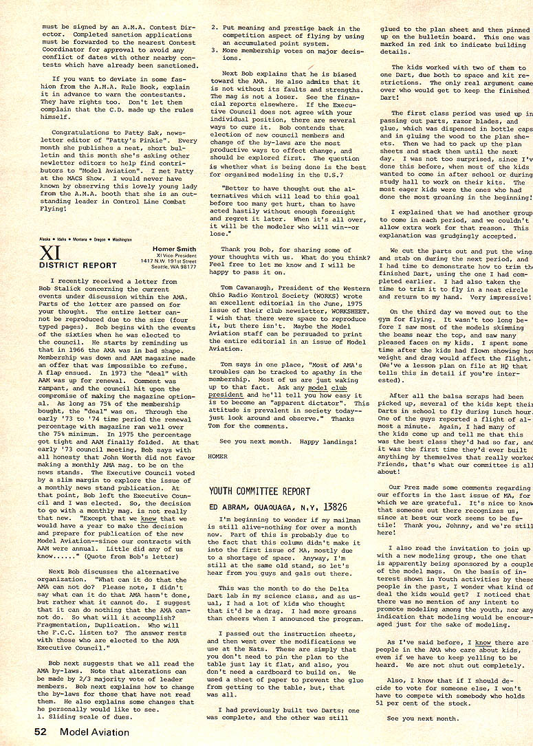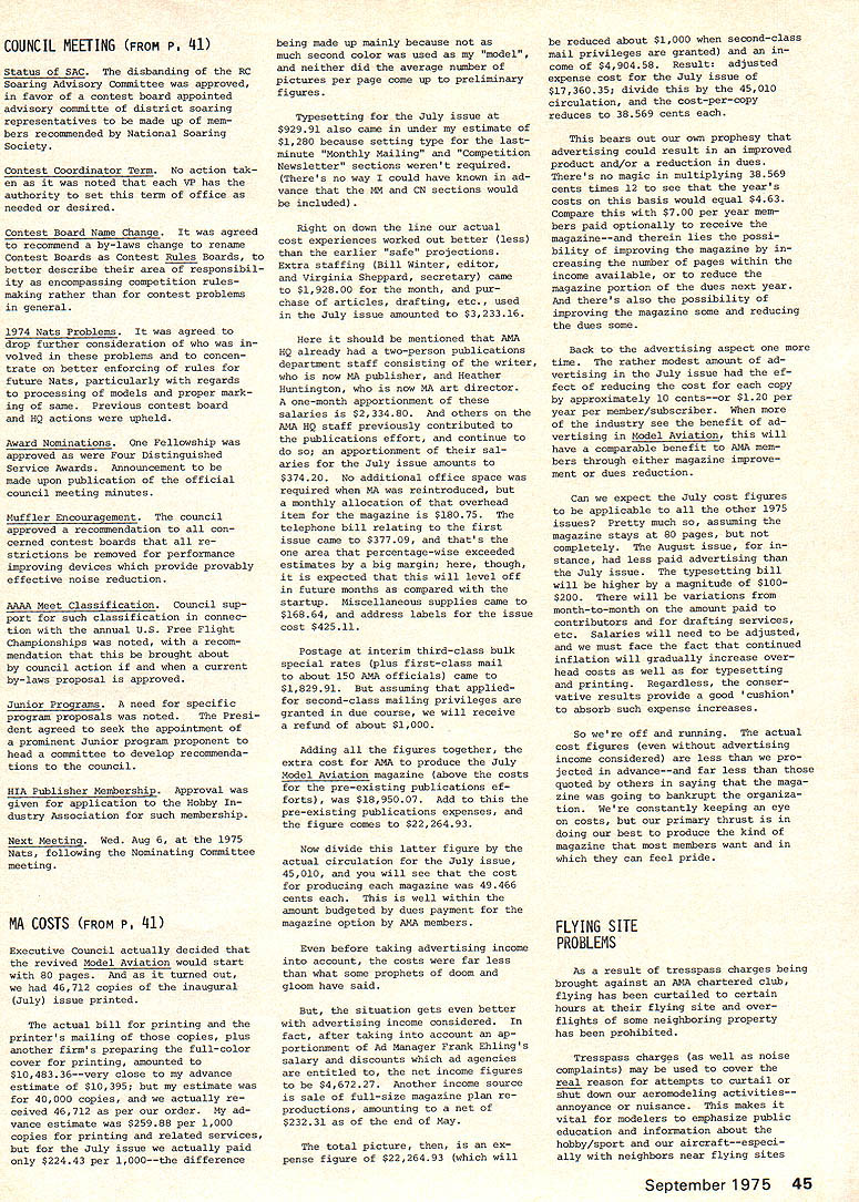 A.ACADEMY OF MODEL AERONAUTICS SUU SU 806 FIFTEENTH ST NW WASHINGTON DC 20005 monthly mailing NO 102 AMA HQ Executive Director RESULTS OF JUNE 21 COUNCIL MEETING brief account meeting-more details will follow later upon publication official minutes Property purchase Further considera tion Wilmington Ohio dropped fol lowing visit site during became obvious would difficulties uncertainties con cerning use property model flying final decision concerning possible purchase property Hutch inson Kansas deferred pending further inspection site determine degree renovation re quired also likelihood ad ditional financial support Magazine status HQ staff com mended excellent effort initiation Model Aviation especially because well under budget basic decision made hold line sIze number pages unless until specific advertising percentage reached Copies magazine sent officers other complimentary persons charged AMAs officer ser vice account rather magazine previous policy regarding nature acceptable advertising reaffirmed general control contents left magazine staff although sup port addition Letters Editor section given council also noted very favorable financial status maga zine operation indicated should used help avoid prevent dues increase 1976 Approval also given HQ developed statement magazine staff responsibilities lines authority 1976 Reprint Based present cost formation agreed reprint Monthly Mailing section magazine would provided Open members choose re ceive full magazine 1976 mem bership cost $200 cluded part basic dues 12 16 pages possible within cost Budget review noted current operations could expected result barely breakeven year provided costs kept check Mo dues increase appears necessary 1976 although some current unknowns could change picture such possible crease cost insurance PR efforts Mats operation Further review made August council meeting 1975 Mats council noted need try live within budget pre viously produced Mats Executive Committee although acknowledged would difficult some degree subsidization might necessary 1976 Mats Wright Field near Dayton Ohio added list possible sites noted Air Force Chamber Commerce re ceptive include Mats part bicentennial projects Further ex ploration made including status other possibilities Elling ton Texas Los Alamitos Calif Smyrna Tenn Wendover Utah Hutchinson Kan sas Lake Charles La Considerable discussion also held possibility basic change nature Mats form separate championships conjunction various special interest organizations Mo action taken further study made PR Review AMAs new PR director describ ed current projects future needs Top priority present concerns working Dept Interior develop flying sites national park recr tion areas also concept national air show team program pro motion model aviation public Mew image items works bi centennial bumper sticker new color brochure tell general public about ssdel aviation AMA State Representatives Much discussion indicated need indepth study membership representation policies procedures AMA SecretaryTreasurer appointed head special committee explore total problem make recommendations council meantime help increase representation approval up two Associate VPs per district basic total six approved effective immediately continued page 45 CORRECTION TO ELECTION NOTICE Page 6 July Model Aviation presidents office up election year incorrect correct information April Monthly Mailing national office SecretaryTreasurer up election year President election next year other information both issues correct published MODEL AVIATION ACThAL COSTS IN Carl Wheeley Model Aviation Publisher July Model Aviation costs actually less AMA advance projec tions--far less costs pro jected others Actual figures article Does seem strange less two weeks after word American Aircraft Modeler publishers bankruptcy able present reliable projections costs Executive Council consider As matter fact would have questionable feat knowledge fact past several years periodically have looking finances AMA producing its own magazine already started fresh review before AAMs bankruptcy Dont attach sinister motives periodic review purpose keep finger costeffectiveness kind good business applied areas AMA operation What making costs pro jections producing magazine Ill tell what did although must ad mit others model magazine field must have different method questionably accurate projec tions substantially varied First step determine what kind magazine pages kind paper much color size type percentage type vs pictures il lustrations Mere speculated paper would comparable other maga zines field cover would printed full color pages would average half type half pic tures illustrations printer would supplied so-called cameraready art flats premise 4B text pages would black ink additional pages would black plus color figured pictures other il lustrations would average three per page specifications guide lines able have printers other suppliers make actual quotes producing such magazine 64 80 96 112 pages--and quotes included quantities 40000 80000 100000 Essentially estimates cover possibilities could conceive starter As well known now Continued page 45 September 1975 41 COUNCIL MEETING FROM P 41 Status SAC disbanding RC Soaring Advisory Committee approved favor contest board appointed advisory committe district soaring representatives made up mem bers recommended National Soaring Society Contest Coordinator Term No action tak en noted VP has authority set term office needed desired Contest Board Name Change agreed recommend bylaws change rename Contest Boards Contest Rules Boards better describe area responsibil ity encompassing competition rules making rather contest problems general 1974 Nats Problems agreed drop further consideration volved problems concen trate better enforcing rules future Nats particularly regards processing models proper mark ing same Previous contest board NQ actions upheld Award Nominations Fellowship approved Four Distinguis