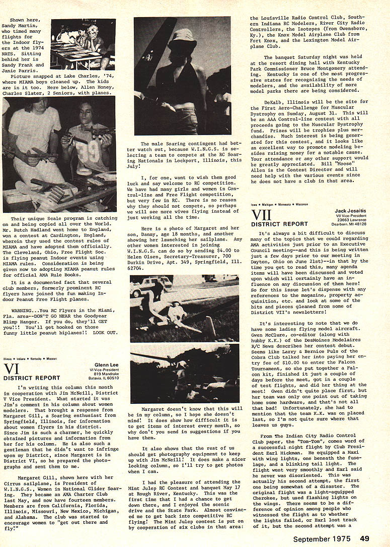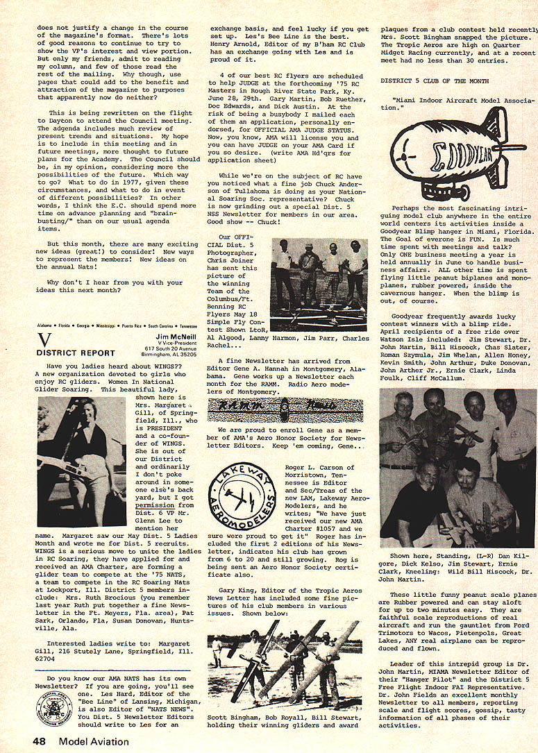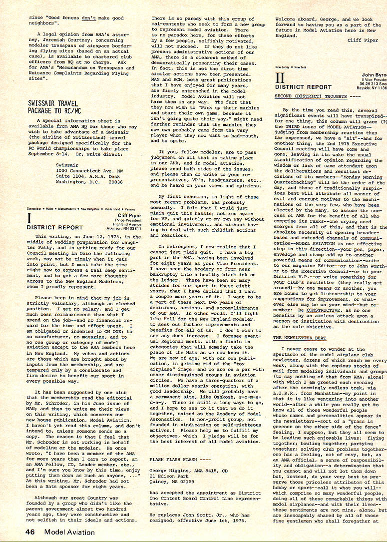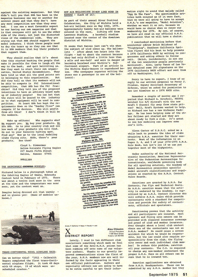 A.ACADEMY OF MODEL AERONAUTICS SUU SU 806 FIFTEENTH ST NW WASHINGTON DC 20005 monthly mailing NO 102 AMA HQ Executive Director RESULTS OF JUNE 21 COUNCIL MEETING brief account meeting-more details will follow later upon publication official minutes Property purchase Further considera tion Wilmington Ohio dropped fol lowing visit site during became obvious would difficulties uncertainties con cerning use property model flying final decision concerning possible purchase property Hutch inson Kansas deferred pending further inspection site determine degree renovation re quired also likelihood ad ditional financial support Magazine status HQ staff com mended excellent effort initiation Model Aviation especially because well under budget basic decision made hold line sIze number pages unless until specific advertising percentage reached Copies magazine sent officers other complimentary persons charged AMAs officer ser vice account rather magazine previous policy regarding nature acceptable advertising reaffirmed general control contents left magazine staff although sup port addition Letters Editor section given council also noted very favorable financial status maga zine operation indicated should used help avoid prevent dues increase 1976 Approval also given HQ developed statement magazine staff responsibilities lines authority 1976 Reprint Based present cost formation agreed reprint Monthly Mailing section magazine would provided Open members choose re ceive full magazine 1976 mem bership cost $200 cluded part basic dues 12 16 pages possible within cost Budget review noted current operations could expected result barely breakeven year provided costs kept check Mo dues increase appears necessary 1976 although some current unknowns could change picture such possible crease cost insurance PR efforts Mats operation Further review made August council meeting 1975 Mats council noted need try live within budget pre viously produced Mats Executive Committee although acknowledged would difficult some degree subsidization might necessary 1976 Mats Wright Field near Dayton Ohio added list possible sites noted Air Force Chamber Commerce re ceptive include Mats part bicentennial projects Further ex ploration made including status other possibilities Elling ton Texas Los Alamitos Calif Smyrna Tenn Wendover Utah Hutchinson Kan sas Lake Charles La Considerable discussion also held possibility basic change nature Mats form separate championships conjunction various special interest organizations Mo action taken further study made PR Review AMAs new PR director describ ed current projects future needs Top priority present concerns working Dept Interior develop flying sites national park recr tion areas also concept national air show team program pro motion model aviation public Mew image items works bi centennial bumper sticker new color brochure tell general public about ssdel aviation AMA State Representatives Much discussion indicated need indepth study membership representation policies procedures AMA SecretaryTreasurer appointed head special committee explore total problem make recommendations council meantime help increase representation approval up two Associate VPs per district basic total six approved effective immediately continued page 45 CORRECTION TO ELECTION NOTICE Page 6 July Model Aviation presidents office up election year incorrect correct information April Monthly Mailing national office SecretaryTreasurer up election year President election next year other information both issues correct published MODEL AVIATION ACThAL COSTS IN Carl Wheeley Model Aviation Publisher July Model Aviation costs actually less AMA advance projec tions--far less costs pro jected others Actual figures article Does seem strange less two weeks after word American Aircraft Modeler publishers bankruptcy able present reliable projections costs Executive Council consider As matter fact would have questionable feat knowledge fact past several years periodically have looking finances AMA producing its own magazine already started fresh review before AAMs bankruptcy Dont attach sinister motives periodic review purpose keep finger costeffectiveness kind good business applied areas AMA operation What making costs pro jections producing magazine Ill tell what did although must ad mit others model magazine field must have different method questionably accurate projec tions substantially varied First step determine what kind magazine pages kind paper much color size type percentage type vs pictures il lustrations Mere speculated paper would comparable other maga zines field cover would printed full color pages would average half type half pic tures illustrations printer would supplied so-called cameraready art flats premise 4B text pages would black ink additional pages would black plus color figured pictures other il lustrations would average three per page specifications guide lines able have printers other suppliers make actual quotes producing such magazine 64 80 96 112 pages--and quotes included quantities 40000 80000 100000 Essentially estimates cover possibilities could conceive starter As well known now Continued page 45 September 1975 41 COUNCIL MEETING FROM P 41 Status SAC disbanding RC Soaring Advisory Committee approved favor contest board appointed advisory committe district soaring representatives made up mem bers recommended National Soaring Society Contest Coordinator Term No action tak en noted VP has authority set term office needed desired Contest Board Name Change agreed recommend bylaws change rename Contest Boards Contest Rules Boards better describe area responsibil ity encompassing competition rules making rather contest problems general 1974 Nats Problems agreed drop further consideration volved problems concen trate better enforcing rules future Nats particularly regards processing models proper mark ing same Previous contest board NQ actions upheld Award Nominations Fellowship approved Four Distinguis