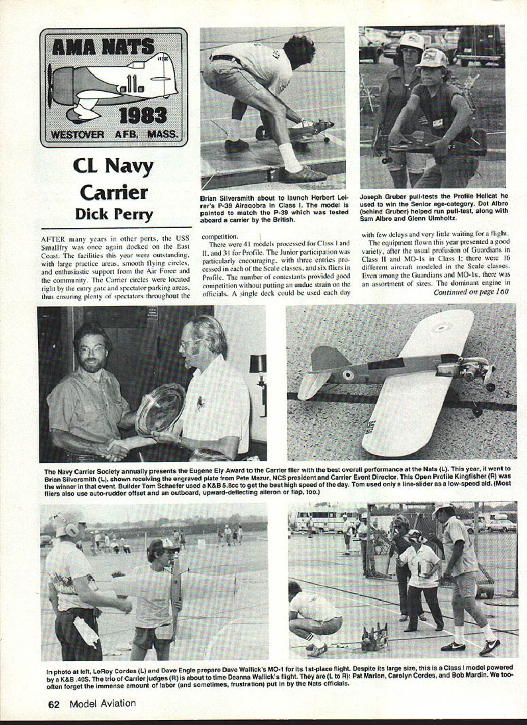 AFTER years other ports USS Smalifry once again docked East Coast facilities year outstanding large practice areas smooth flying circles enthusiastic support Air Force community Carrier circles located right hy entry gate spectator parking areas thus ensuring plenty spectators throughout competition 41 models processed Class II 31 Profile Junior participation particularly encouraging three entries pro cessed Scale classes six fliers Profile number contestants provided good competition putting undue strain officials single deck could used day few delays very little waiting flight equipment flown year presented good variety after usual profusion Guardians Class II MO Class 1 16 different aireralt modeled Scale classes among Guardians MO-Is assortment ol sizes dominant engine Continued page 160 Navy Carrier Society annually presents Eugene Ely Award Carrier flier best overall performance Nats L year went Brian Silversmith L shown receiving engraved plate Pete Mazur NCS president Carrier Event Director Open Profile Kingfisher R winner event Builder Tom Schaefer used K&B 58cc get best high speed day Tom used line-slider low-speed aid Most fliers also use auto-rudder offset outboard upward-deflecting aileron flap too photo left LeRoy Cordes L Dave Engle prepare Dave Wallicks MO-i its 1st-place flight Despite its large size isa Class model powered K&B 405 trio Carrier ludges R about time Deanna Wallicks flight L R Pat Marion Carolyn Cordes Bob Mardin too often forget immense amount labor sometimes frustration put Nats officials 62 Model Aviation Carrier Brian Silversmith about launch Herbert Lel- Joseph Gruber pull-tests Profile Hellcat rers P-39 Airacobra Class model used win Senior age-category Dot Aibro Dick Perrypainted match P-39 testedbehind Gruber helped run pull-test along aboard carrier BritishSam Albro Glenn Ulmholtz * KIORITZ 24 Work Horse 32 HP bs Tr4I 2 IZiO1UJAI uur ngine ur ngineered Meet Demands Most Discriminating Modeler Backed Service Match Send $100 Catalog New Standard* Giant Models 49 DirectI 28HP5/sLbs* 7fl 95 Sales Only* Dealer Direct ALL ENGINES READY TO RUN INCLUDING 6 BOLT PROP HUB MOUNT MUFFLERS AVAILABLE AT EXTRA CHARGE Rear 3405 Cleveland Ave. SW Canton OH 44707 RO US H M FG THE ENGINE PEOPLEphone2lSl-egloorW4A374 Nats CL Carrier/Perry Continued paoe 62 Class II Rossi Class K&B engines powered over half entries about equally divided between 405 65 variants Profile different models engines usually case K&B 58 was used other power plant 25% entries including three top five finishers respect break tradition Class II Five entriestwo Juniors three Open including first place both age categorieswere powered 60 65 en gines engines lower end displacement limit would seem disadvantage high speed performance cer tainly didnt hurt Tom Carl T Schaefer winning Kingfisher ws eight hundredths second off fastest time day Weather play significant role both days Carrier competition combinatin temperature humidity early moming Class II flying seemed contribute unusually high number incomplete flights As moming progressed wind grew steadily stronger topping 20 mph mid aftemoon major factor low speed performance Only three competitors class managed low speeds under 25 mph over half completed low speed laps speeds over 30 mph spite wind Junior Mathew Wallick managed get records both Class Class II using Fairey Spearfish model 37-in span Mathew used same airplane both classes switching K&B 40S Class Ito K&B 75 Class II Senior winner Class Joseph Gro ber flying K&B 40S-powered 28/2-in Guard ian Open Class II competition top three places separated less 16 points variety strategies used achieve top scores Brian Silversmith second place used traditional standard-sized Guardian high est speed day 1146 mph coupled 26 mph low Dave Wallick third place largest Guardian 40-in etition low speed 165 mph Tom Schaefer brought together first place 1141 mph high 188 mph low original-design 32-in-span Kingfisher lightest model class due primarily its small engine OS 45 its simplicity no flaps rudderonly line-slider Class competition saw same diversity strategy Dave Wallick winning first Still Usingbld Fashioned Vtling Hinges-sGO will gain control efficiency eliminating gap between moveable .and stationary control surfacesEASY TO INSTALL will amared performance gained using simple inexpen sive improvement FREE MOVEMENT 450 STRONG AND LIGHTWEIGHT -—RISrALL I4NGEUSE COMPLETELY FUELPROOF -STRAIGqT H/IF 10 MAKE SM4LI HOLE EVRRY IA/CU OR COMPATABLE WITH ALL IRON-ONSO o CYAAOALWYLATE GLLW I/Il SOLES CAPELARY MATERIALSpACt/ON 1*51 CARRY GLUE COMES IN 3 FT LENGTHSES/TiFF ILIWT SMALL 118 ORPRICE 3 ft $250FOR AOOIT/OII/AL SEOIRITi LARGE 1/41*/SERT SMALL RN EVERY FEW RICHES CLIT OFF FLLISS FILL A/IS SAAb AS NEEDED FOR F/MS/IRIS Send Free Info fine products FOURMOST PRODUCTS 4040 24th Avenue Forest Grove OR 97116 CUT 1/4 DEER SLIT ALOnG TVE FULL LENGTH OF THE MATING SURFACES low speed 146 mphmore 5 mph better next best low speedand Joe Dzialo taking second best high speed day 1128 mph Daves 42-in MO-l almost twice wing area Joes 30-in TBF Avenger race third place particularly close decided until late day three points separating flight scores Dick Perry Brian Silversmith Bob Whitfield Profile competition plagued ginning high gusty winds caused flights end water 68 attempts 17 completed through landing Tom Schaefers winning flight Open achieved early day 43-in-span 389-sq -in Kingfisher powered K&B 58 top speed 1005 mph II mph faster anyone else two contestants better 120 seconds low speed Joseph Gruber Deanna Wallick rounded out winners list Senior Junior 100-point landings posted Although strong winds kept Tom Schaefers Open Profile score relatively safe attack Navy Carrier Societys Eugene Ely Award very much contention Tom Schaefer took early lead Dave Wallicks Brian Sil versmiths challenges both ended incomplete flights After lunch Brian bettered Toms threeflight total Class s II ile less nine points assume lead l