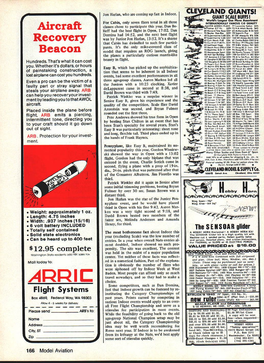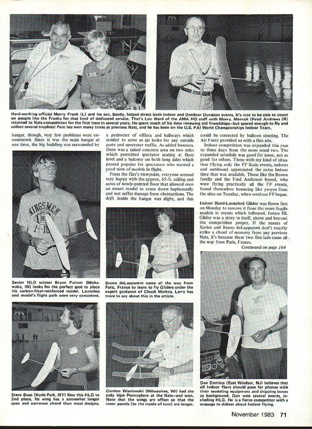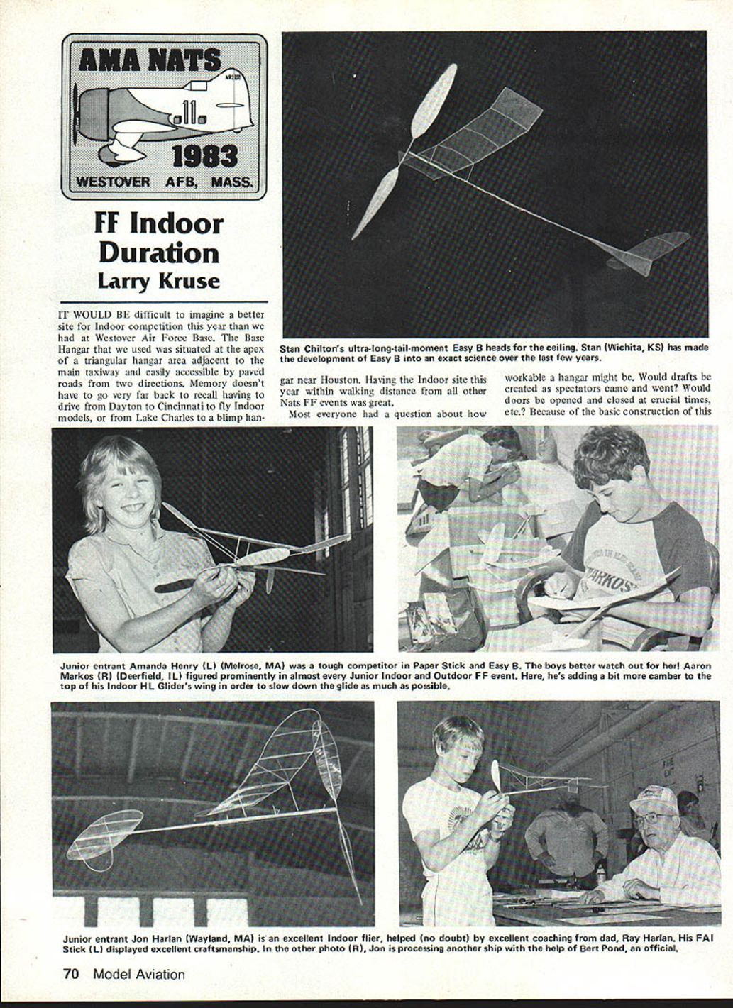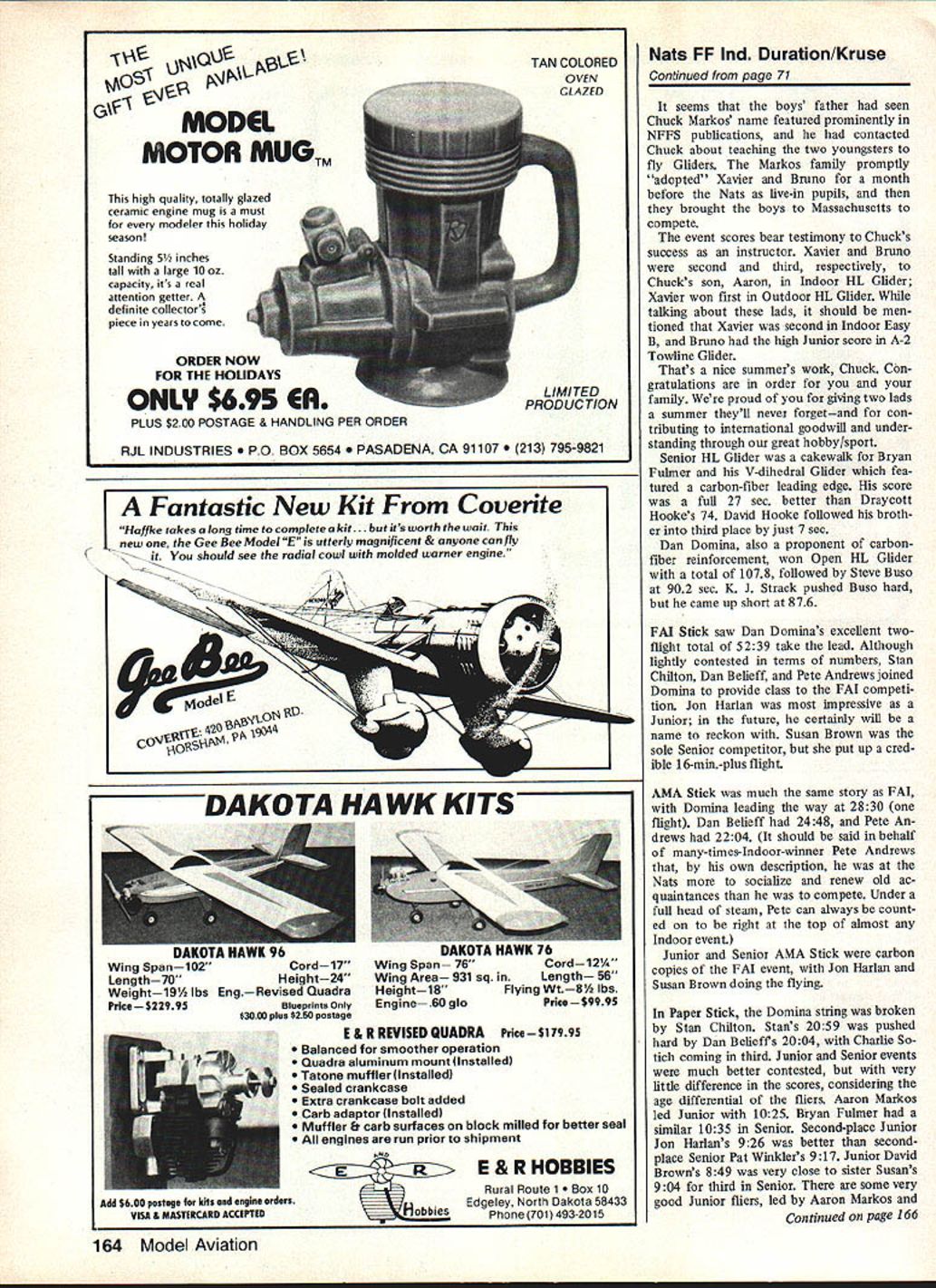 gar near Houston Having Indoor site year within walking distance other Nats FF events great Most everyone question about workable hangar might Would drafts created spectators came went Would doors opened closed crucial times etc Because basic construction Junior entrant Amends Henry CL Melrose MA tough competitor Paper Stick Easy B boys better watch out Aaron Markos R Deerfield IL figured prominently almost Junior Indoor Outdoor FF event hes adding bit camber top Indoor ML Gliders wing order slow down glide much possible Junior entrant Jon Harlan Wayland MA excellent Indoor flier helped no doubt excellent coaching dad Ray Harlan FAI Stick CL displayed excellent craftsmanship other photo CR Jon processing another ship help Bert Pond official 70 Model Aviation IT WOULD BE difficult imagine better site Indoor competition year Westover Air Force Base Base Hangar used situated apex Stan Chiltons ultralong-tail-moment Easy B heads ceiling Stan Wichita KS has made triangular hangar area adjacent the development Easy B exact science over last few years main taxiway easily accessible paved roads two directions Memory doesnt have go very far back recall having drive Dayton Cincinnati fly Indoor models Tike Chr1e hlimn han hangar though very few problems en countered Since main hangar time big building surrounded perimeter offices hallways tended serve air locks outside gusts spectator traffic As added bonuses raised concrete area two sides permitted spectator seating floor level balcony both long sides proved popular spectators wanted good view models flight fliers viewpoint everyone seemed very happy approx 65-ft ceiling acres newly-painted floor allowed errant model come down haphazardly suffer damage obstructions drift inside hangax slight Senior HLG winner Bryan Fulmer Misha- Bruno deLapparent came way waka IN looks perfect spot place Paris France learn fly Gliders under carbon-fiber-reinforced model Launches expert guidance Chuck Markos Larry has models flight path very consistent say about article could corrected balloon steering Air Force provided us fine site Indoor competition expanded year three days usual two expanded schedule good some good others kind situa tion flying FF Scale events indoors outdoors appreciated extra Indoor time available like Brown family Fred Anderson brood flying practically FF events found themselves bouncing like yo-yos sites Tuesday outdoor FF began Indoor Hand-Launched Glider flown first Monday remove fragile models events followed Junior HL Glider story itself above beyond competition proper names Xavier Bruno deLapparent dont exactly strike chord memory previous Nats its because two fine lads came way Paris France Continued page 164 November 1983 71 Hard-working official Murry Frank L son Sandy helped direct both Indoor Outdoor Duration events Its nice able count people like Franks kind dedicated service Thats Lou Ward AMA HO staff Murry Merrack Pete Andrews R returned Nats competition first time several years spent much time renewing old friendshipsbut spared enough fly collect several trophies Pete has won times previous Nats has US FAI World Championships Indoor Team Gordon Wisniewski Milwaukee WI Steve Buso Hyde Park NY flew HLG bipe Pennyplane Natsand won 2nd place Its wing has somewhat longer Note wings offset span narrower chord designs inner panels inside turn longer Dan Domina East Windsor NJ believes Indoor fliers should pose photos modeling equipment shipping boxes background Dan won several events cluding HLG fierce competitor message deliver about Indoor flying E & R REVISED QUADRA Price$1 7995 Balanced smoother operation Quadra aluminum mount linstalledl Tatone muffler linstalledl Sealed crankcase Extra crankcase bolt added Carb adaptor llnstalled Muffler surfaces block milled better seal engines run prior shipment Nb R czZZZL E&RHOBBIES Rural Route 1 10 Edgeley North Dakota 58433 Phone 701 493-2015 Nats FF md Duration/Kruse Continued page 71 seems boys father seen Chuck Markos name featured prominently NFFS publications contacted Chuck about teaching two youngsters fly Gliders Markos family promptly adopted Xavier Bruno month before Nats live-in pupils brought boys Massachusetts compete event scores bear testimony Chucks success instructor Xavier Bruno second third respectively Chucks son Aaron Indoor HL Glider Xavier won first Outdoor HL Glider talking about lads should men tioned Xavier second Indoor Easy B Bruno high Junior score A-2 Towline Glider Thats nice summers work Chuck Con gratulations order family proud giving two lads summer theyll never forgetand con tributing international goodwill under standing through great hobby/sport Senior HL Glider cakewalk Bryan Fulmer V-dihedral Glider fea tured carbon-fiber leading edge score full 27 sec better Draycott Hookes 74 David Hooke followed broth er third place just 7 sec Dan Domina also proponent carbonfiber reinforcement won Open HL Glider total 1078 followed Steve Buso 902 sec K J Strack pushed Buso hard came up short 876 FAT Stick saw Dan Dominas excellent twoflight total 5 239 take lead Although lightly contested terms numbers Stan Chilton Dan Belieff Pete Andrews joined Domina provide class FAI competi tion Jon Harlan impressive Junior future certainly will name reckon Susan Brown sole Senior competitor put up cred ible 16-min-plus flight AMA Stick much same story FAI Domina leading way 2830 flight Dan Belieff 2448 Pete An drews 2204 should said behalf many-times-Indoor-winner Pete Andrews own description Nats socialize renew old ac quaintances compete Under full head steam Pete can always count ed right top almost Indoor event Junior Senior AMA Stick carbon copies FAI event Jon Harlan Susan Brown doing flying Paper Stick Domina string broken Stan Chilton Stans 2059 pushed hard Dan Belieffs 2004 Charlie So tich coming third Junior Senior events much better contested very littie difference scores considering age differential fliers Aaron Markos led Junior 1025 Bryan Fulmer similar 1035