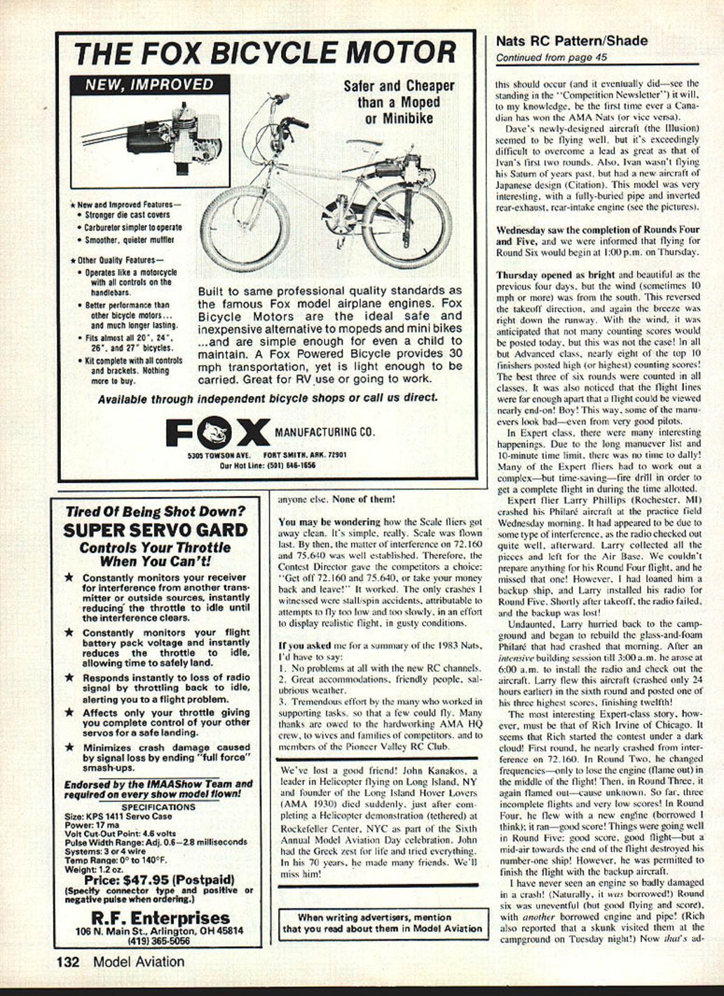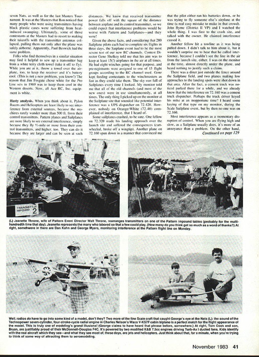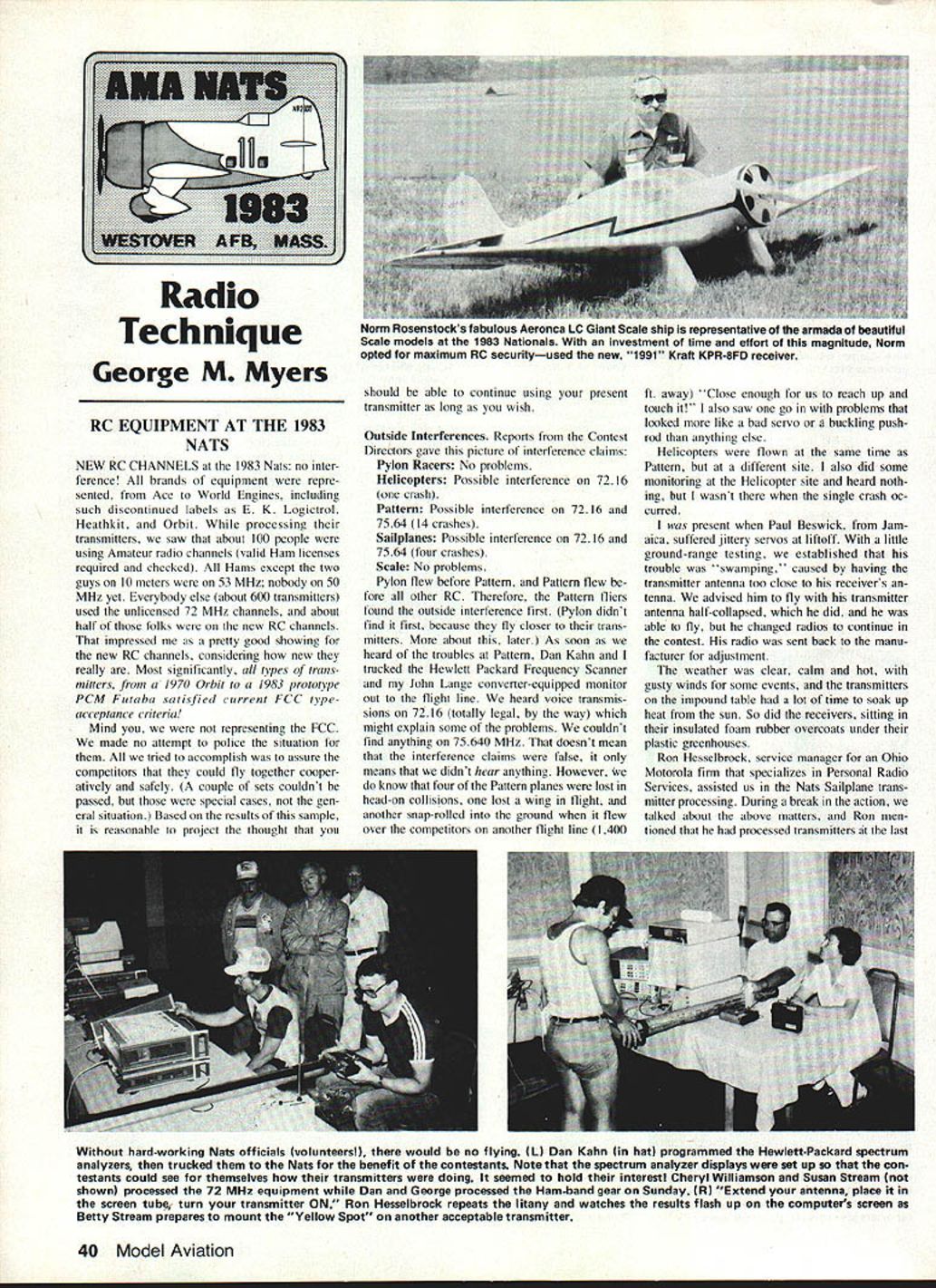 George M Myers RC EQUIPMENT AT THE 1983 NATS NEW RC CHANNELS 1983 Nats no inter ference brands equipment repre sented Ace World Engines including such discontinued labels F K Logictrol Heathkit Orbit processing transmitters saw about 100 people using Amateur radio channels valid Ham licenses required checked Hams except two guys 10 meters 53 MHz nobody 50 MHz yet Everybody else about 600 transmitters used unlicensed 72 MHz channels about half folks new RC channels impressed pretty good showing new RC channels considering new really Most significantly oil types trons nitters jron 1970 Orbit 1983 prototype PCM Futobo satisfied current FCC type occeptOflce criteria Mind representing FCC made no attempt police situation tried accomplish assure competitors could fly together cooper atively safely couple sets couldnt passed special cases gen eral situation Based results sample reasonable project thought should able continue using present transmitter long wish Outside Interferences Reports Contest Directors gave picture interference claims Pylon Racers No problems Helicopters Posible interference 7216 crash Pattern Possible interference 7216 7564 14 crashes Sailplanes Possible interference 7216 7564 four crashes Scale No problems Pylon flew before Pattern Pattern flew fore other RC Therefore Pattern fliers found outside interference first Pylon didnt find first because fly closer trans mitters about later As soon heard troubles Pattern Dan Kahn trucked Hewlett Packard Frequency Scanner John Lange converter-equipped monitor out flight line heard voice transmis stuns 7216 totally legal way might explain some problems couldnt find anything 75640 MHz doesnt mean interference claims false means didnt hear anything However know four Pattern planes lost head-on collisions lost wing flight another snap-rolled ground flew over competitors another flight line 1400 ft away Close enough us reach up touch also saw go problems looked like bad servo ling pushrod anything else Helicopters flown same time Pattern different site also did some monitoring Helicopter site heard noth ing wasnt single crash oc cuffed present Paul Beswick Jam aica suffered jittery servos liftoff little ground-range testing established trouble swamping caused having transmitter antenna too close receivers tenna advised him fly transmitter antenna half-collapsed did able fly changed radios continue contest radio sent back manu facturer adjustment weather clear calm hot gusty winds some events transmitters impound table lot time soak up heat sun So did receivers sitting insulated foam rubber overcoats under plastic greenhouses Ron Hesselbroek service manager Ohio Motorola firm specializes Personal Radio Services assisted us Nats Sailplane trans mitter processing During break action talked about above matters Ron men tioned processed transmitters t last Without hard-working Nats officials volunteers would no flying L Dan Kahn hat programmed Hewlett-Packard spectrum analyzers trucked Nats benefit contestants Note spectrum analyzer displays set up con testants could see themselves transmitters doing seemed hold interest Cheryl Williamson Susan Stream shown processed 72 MHz equipment Dan George processed Ham-band gear Sunday R Extend antenna place screen tub turn transmitter ON Ron Hesselbrock repeats litany watches results flash up computers screen Betty Stream prepares mount Yellow Spot another acceptable transmitter 40 Model Aviation Radio Technique Norm Rosenstocks fabulous Aeronca LC Giant Scale Ship iS representative armada beautiful Scale models 1983 Nationals investment time effort magnitude Norm opted maximum RC securityused new 1991 Kraff KPR-8FD receiver seven Nats well last Masters Tour nament Masters Ron noticed people using transmitters having black plastic cases suffering heatinduced swamping Ultimately some contestants Masters resort making takeoffs transmitter antennas col lapsed pulling out after plane safely airbome Apparently Paul Beswick same problem Folks find themselves similar situation may find helpiul sew up transmitter bag white terry cloth towel take off fly throw towel over air plane too keep receiver its battery cool new problem know reason Jim Fosgate chose white Pro Line sets 1969 keep cool Western deserts Now Ace RC Inc equip ment white Hasty analysis think about Pylon Racers Helicopters least likely see inter ference external sources because ma chines rarely wander 50 ft control transmitters Pattem planes Sailplanes likely see external interference simply because fly /2-mile con trol transmitters higher too can because larger can seen such distances know received transmitter power falls off square distance between airplane its control transmitter could expect interference problems would worse Pattern Sailplanesand Given above facts considering 280 Sailplane pilots complete six flights three days Saiplane event hod severe test new RC channels Contest Di rector Gene Shelkey told aim keep least 15 airplanes air times eight winches going purpose pre-registrants assigned 15 flight groups according RC channel used Gene kept feeding contestants winebmasters fast could take sky wos full Sailplanes time looked monitor told old channels new ones use simultaneously times thing picked up monitor Sailplane site sounded like potential inter ference UPS dispatcher 72420 ever nobody Orange/White 7240 com plained interference heard Some sailplanes crashed sure fellow 72320 made landing approach over launch site suffered consequences cart wheeled broke off wingtip Another plane 72160 spun down manner convinced pilot either ran batteries down trying fly someone elses airplane time real easy mistake make crowd John Byme District II VP watched whole thing first crash site talked owner claimed interference caused Another fellow hit towline being pulled down didnt talk him about it wouldnt surprise hear called inter ference because couldnt see line air launch site either monitor time almost directly under plane heard nothing justi