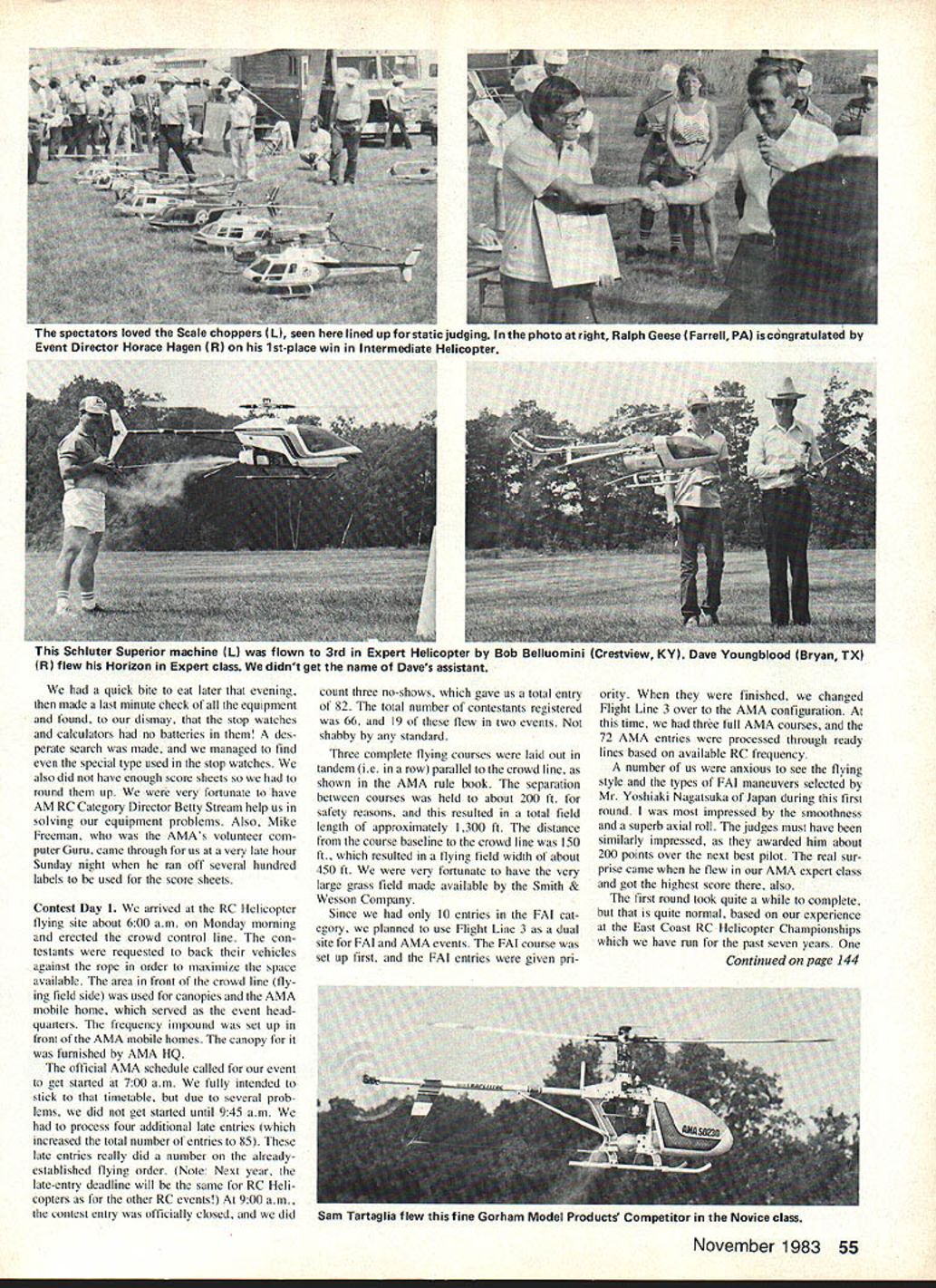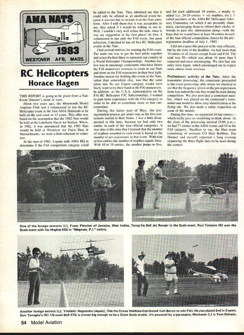 Horace Hagen THIS REPORT going given Nats Event Directors point view About two years ago Monmouth Model Airplane Club volunteered run RC Helicopter event first AMA Nationals held east coast 13 years offer based assumption 1982 Nats would held Lakehurst Naval Air Station 1982 announced 1983 Nats would held Westover Air Force Base Massachusetts little reluctant volun teer start 1983 1 spoke AMA HQ determine FAI competition category could added Nats informed could offered unofficial event cause too late include Nats entry form After told acceptable asked would willing run Well couldnt very well refuse task since suggestion first place first volunteered run FAI event upon reflection decided run five RC Helicopter events Nats several motives running FAI event main get best pilots together select best three represent country World Helicopter Championships Another mo tive encourage contestants have flown FAI maneuvers overseas come Nats show us FAI maneuvers best light Another reason holding event Nats rather somewhere else same pilots fly Expert category would likely want try hand FAI maneuvers addition USA representative FAI RC Helicopter F3C Subcommittee wanted gain experience FAI category order able contribute sub committee During latter part May pre registration process got under way first con testants mailed forms little disap pointed time because two entries four official categories also time learned number trophies awarded event based number pre-registronrs event nine less entriesthe number trophies equals three 10 19 entries number jumps five additional 10 entries trophy added ie 20-29 entries trophies etc called members AMA RC Helicopter Advi sory Committee am presently chair man encouraging inform circles friends pass information alongwith hope would have least 10 entries four official competition classes pre registration deadline July 1983 did expect process very efficient time deadline 10 entries classes except Scale FAI total 50which about 10 expected encouraging also entry Japan encouraged expect entries overseas Preliminary activity Nats After transmitter processing contestants proceeded event processing table checked see frequency given pre-registration form indeed would used during competition also provided contestant num ber placed contestants trans mitter model allow easy identification flying site also made safety inspection some models During time registered 14 late entries really gave us something think about close processing interval 500 pm 71 entries AMA events 10 FAI category Needless say Nats team consisting assistant CD Dick Robbins jim Harmer myself expected long evening organizing three flight lines used during contest 54 Model Aviation RC Helicopters foreign entrants L Franz Fletcher Jamaica West Indies flying Bell Jet Ranger Scale event Paul Terceiro R won Scale event Hughes 500 Magnum P1 colors Another foreign entrant L Voshiaki Nagatauka Japan flies Circus Hobbies-distributed Kalt Baron win FAI also placed 2nd Expert Sam Tartaglias R 1/5-scale Bell 47G almost big enough Giant Scale model Its powered gas engine Mechanic L Tom Delusio quick bite eat later evening made last minute check equipment found dismay stop watches calculators no batteries des perate search made managed find special type used stop watches also did have enough score sheets round up very fortunate have AM RC Category Director Betty Stream help us solving equipment problems Also Mike Freeman AMAs volunteer com puter Guru came through us very late hour Sunday night ran off several hundred labels used score sheets Contest Day 1 arrived RC Helicopter flying site about 600 am Monday morning erected crowd control line con testants requested back vehicles against rope order maximize space available area front crowd line tly ing field side used canopies AMA mobile home served event head quarters frequency impound set up front AMA mobile homes canopy furnished AMA HQ official AMA schedule called event get started 700 am fully intended stick timetable due several prob lems did get started until 945 am process four additional late entries increased total number entries 85 late entries really did number alreadyestablished flying order Note Next year late-entry deadline will same RC Heli copters other RC events 900 am contest entry officially closed did count three no-shows gave us total entry 82 total number contestants registered 66 19 flew two events shabby standard Three complete flying courses laid Out tandem ie row parallel crowd line shown AMA rule book separation between courses held about 200 ft safety reasons resulted total field length approximately 1300 ft distance course baseline crowd line 150 ft resulted flying field width about 450 ft very fortunate have very large grass field made available Smith & Wesson Company Since 10 entries FAI cat egory planned use Flight Line 3 dual site FAI AMA events FAI course set up first FAI entries given pri ority finished changed Flight Line 3 over AMA configuration time three full AMA courses 72 AMA entries processed through ready lines based available RC frequency number us anxious see flying style types FAI maneuvers selected Mr Yoshiaki Nagatsuka Japan during first round impressed smoothness superb axial roll judges must have similarly impressed awarded him about 200 points over next best pilot real sur prise came flew AMA expert class got highest score also first round took quite complete quite normal based experience East Coast RC Helicopter Championships have run past seven years Continued page 144 November 1983 55 ne spectators loved Scale choppers IL seen urssatlcjuagmng Inthe photo right Ralph Geese Farrell PA iscdngratulated Event Director Horace Hagen IR 1st-place win Intermediate Helicopter flis cniuter Superior machine IL flown 3rd Expert Helicopter oy uoo Ielluomjnj Crestview KY Dave Youngblood Bryan TX R flew Horizon Expert class didnt get name Daves assistant Sam Tartaglia flew tine Gorham Model Products Competitor Novice class No AVI4IUS A