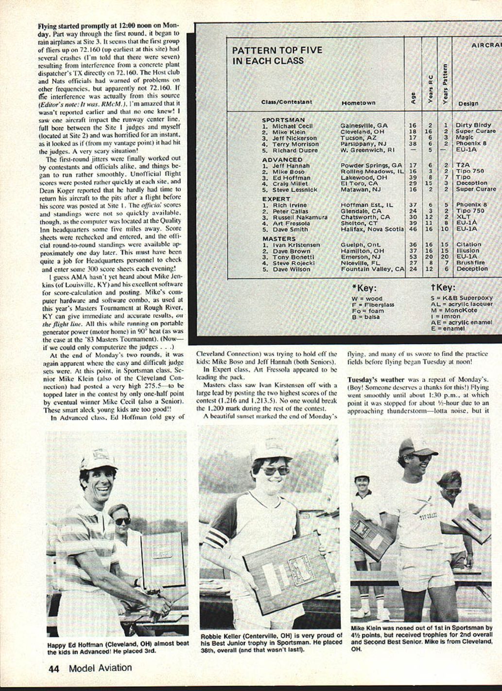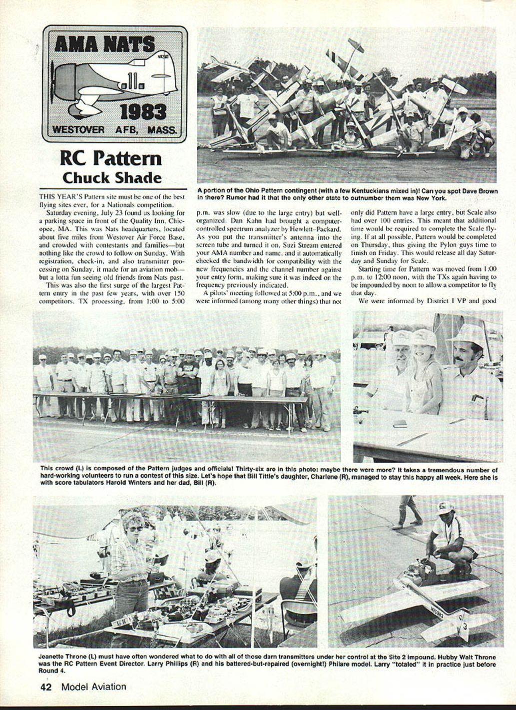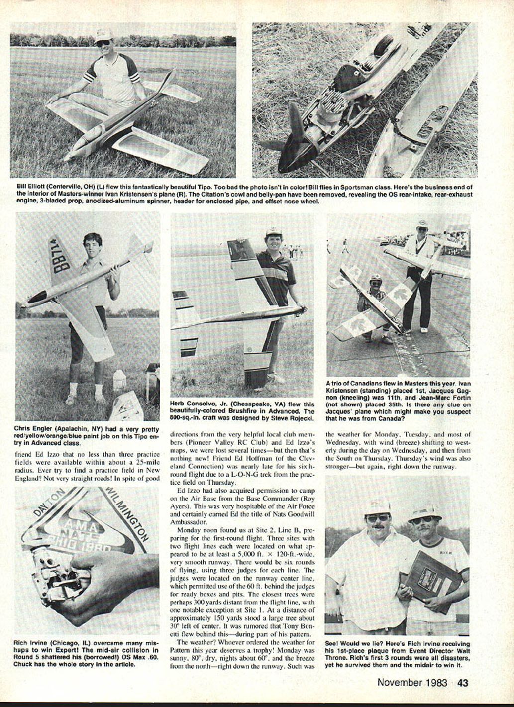 THIS YEARS Pattern site must best flying sites ever Nationals competition Saturday evening July 23 found us looking parking pace front Quality Inn Chic opee MA Nats headquarters located about five miles Westover Air Force Base crowded contestants familiesbut nothing like crowd follow Sunday registration check-in also transmitter pro cessing Sunday made aviation mob lotta fun seeing old friends Nats past also first surge largest Pat tem entry past few years over 150 competitors TX processing 100 500 pm slow Idue large entry wellorganized Dan Kahn brought computercontrolled spectrum analyLer HewlettPackard As put transmitters antenna screen tube turned Suzi Stream entered AMA number name automatically checked bandwidth compatibility new frequencies channel number against entry form making sure indeed frequency previously indicated pilots meeting followed 500 pm informed among other things did Pattern have large entry Scale also over 100 entries meant additional time would required complete Scale fly ing possible Pattern would completed Thursday thus giving Pylon guys time finish Friday would release day Satur day Sunday Scale Starting time Pattern moved 100 pm 1200 noon TXs again having impounded noon allow competitor fly day informed District VP good Jeanette Throne L must have often wondered what darn transmitters under control Site 2 impound Hubby Walt Throne RC Pattern Event Director Larry Phillips R battered-but-repaired overnight Philare model Larry totaled practice just before Round 4 42 Model Aviation RC Pattern portion Ohio Pattern contingent few Kentuckians mixed Can spot Dave Brown Rumor other state outnumber New York crowd L composed 0 tfle Pattern judges officials Thirty-six photo maybe takes tremendous number hard-working volunteers run contest size Lets hope Bill Tittles daughter Charlene R managed stay happy week score tabulators Harold Winters dad Bill R friend Ed Izzo no less three practice fields available within about 25-mile radius Ever try find practice field New England very straight roads spite good $ directions very helpful local club mem bers Pioneer Valley RC Club Ed Izzos maps lost several timesbut thats nothing new Friend Ed Hoffman Clev eland Connection nearly late sixthround flight due L-O-N-G trek prac tice field Thursday Ed Izzo also acquired permission camp Air Base Base Commander Roy Ayers very hospitable Air Force certainly earned Ed title Nats Goodwill Ambassador Monday noon found us Site 2 Line B pre paring first-round flight Three sites two flight lines located what ap peared least 5000 ft x 120-ft-wide very smooth runway would six rounds flying using three judges line judges located runway center line permitted use 60 ft behind judges ready boxes pits closest trees perhaps 300 yards distant flight line notable exception Site distance approximately 150 yards stood large tree about 300 left center rumored Tony Bon etti flew behind thisduring part pattern weather Whoever ordered weather Pattern year deserves trophy Monday sunny 800 dry nights about 600 breeze northright down runway Such weather Monday Tuesday Wednesday wind breeze shifting west erly during day Wednesday South Thursday Thursdays wind also strongerbut again right down runway November 1983 43 Bill Elliott Centerville OH L flew fantastically beautiful Tipo Too bad photo isnt color Bill flies Sportsman class Heres business end interior Masters-winner Ivan Kristensens plane R Citations cowl belly-pan have removed revealing OS rear-intake rear-exhaust engine 3-bladed prop anodized-aluminum spinner header enclosed pipe offset nose wheel Chris Engler Apalachin NY very pretty red/yellow/orange/blue paint job Tipo en try Advanced class Herb Consolvo Jr Chesapeake VA flew tnis beautifully-colored Brushfire Advanced 800-sq-in craft designed Steve Rojecki trio Canadians flew Masters tnis year ivan Kristensen standing placed 1st Jacques Gagnon kneeling 11th Jean-Marc Fortin shown placed 35th clue Jacques plane might make suspect Canada Rich Irvine Chicago IL overcame mis haps win Expert mid-air collision Round 5 shattered borrowed OS Max 60 Chuck has whole story article See Would lie Heres Rich Irvine receiving 1st-place plaque Event Director Walt Throne Richs first 3 rounds disasters yet survived midair win Flying started promptly 1200 noon Mon day Part way through first round began rain airplanes Site 3 seems first group fliers up 72160 up earliest site several crashes Im told seven resulting interference concrete plant dispatchers TX directly 72160 Host club Nats officials warned problems other frequencies apparently 72160 te interference actually source Editors note RMcM Im amazed wasnt reported earlier no knew saw aircraft impact runway center line full bore between Site judges myself located Site 2 horrified instant looked vantage point hit judges very scary situation first-round jitters finally worked out contestants officials alike things gan run rather smoothly Unofficial flight scores posted rather quickly site Dean Koger reported hardly time retum aircraft pits after flight before score posted Site official scores standings quickly available though computer located Quality Inn headquarters some five miles away Score sheets rechecked entered offi cial round-to-round standings available ap proximately day later must have quite job Headquarters personnel check enter some 300 score sheets evening guess AMA hasnt yet heard about Mike Jen kins Louisville KY excellent software score-calculation posting Mikes com puter hardware software combo used years Masters Toumament Rough River KY can give immediate accurate results flight line running portable generator power motor home 9fl0 heat case 83 Masters Toumament Now could computerize judges Mondays two rounds again apparent easy difficult judge sets point Sportsman class Se nior Mike Klein also Cleveland Con nection posted very high 2755to topped later contest one-half point eventual winner Mike Cecil also Senior smart aleck young kids too good! Adv
