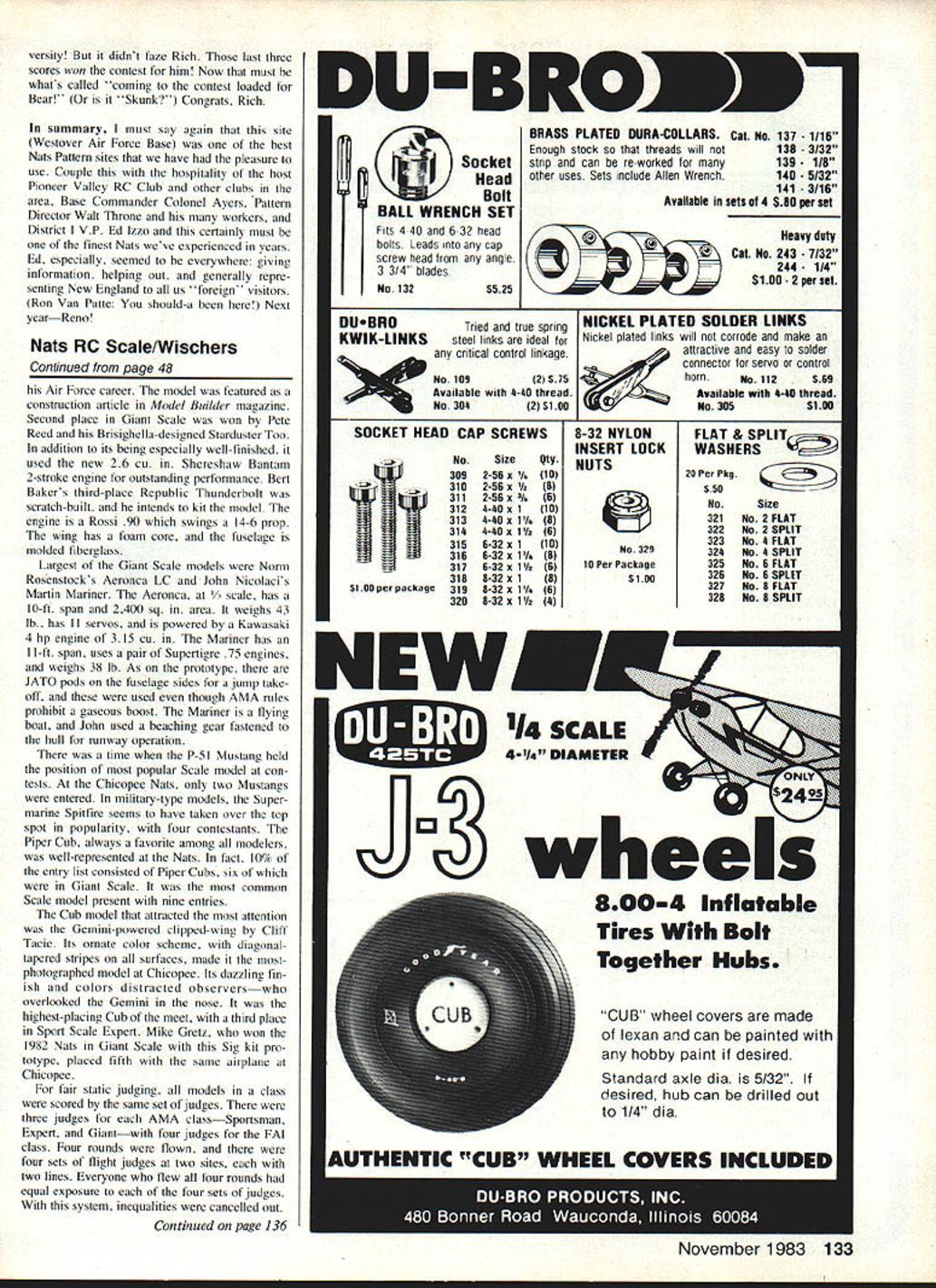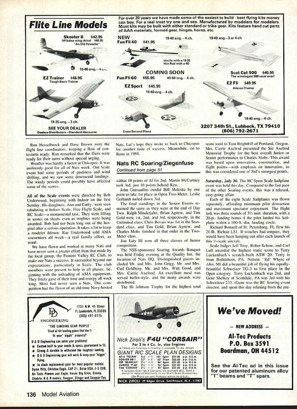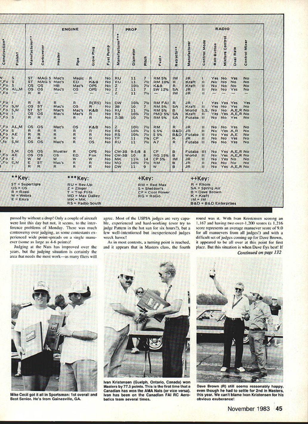 THIS YEARS Pattern site must best flying sites ever Nationals competition Saturday evening July 23 found us looking parking pace front Quality Inn Chic opee MA Nats headquarters located about five miles Westover Air Force Base crowded contestants familiesbut nothing like crowd follow Sunday registration check-in also transmitter pro cessing Sunday made aviation mob lotta fun seeing old friends Nats past also first surge largest Pat tem entry past few years over 150 competitors TX processing 100 500 pm slow Idue large entry wellorganized Dan Kahn brought computercontrolled spectrum analyLer HewlettPackard As put transmitters antenna screen tube turned Suzi Stream entered AMA number name automatically checked bandwidth compatibility new frequencies channel number against entry form making sure indeed frequency previously indicated pilots meeting followed 500 pm informed among other things did Pattern have large entry Scale also over 100 entries meant additional time would required complete Scale fly ing possible Pattern would completed Thursday thus giving Pylon guys time finish Friday would release day Satur day Sunday Scale Starting time Pattern moved 100 pm 1200 noon TXs again having impounded noon allow competitor fly day informed District VP good Jeanette Throne L must have often wondered what darn transmitters under control Site 2 impound Hubby Walt Throne RC Pattern Event Director Larry Phillips R battered-but-repaired overnight Philare model Larry totaled practice just before Round 4 42 Model Aviation RC Pattern portion Ohio Pattern contingent few Kentuckians mixed Can spot Dave Brown Rumor other state outnumber New York crowd L composed 0 tfle Pattern judges officials Thirty-six photo maybe takes tremendous number hard-working volunteers run contest size Lets hope Bill Tittles daughter Charlene R managed stay happy week score tabulators Harold Winters dad Bill R friend Ed Izzo no less three practice fields available within about 25-mile radius Ever try find practice field New England very straight roads spite good $ directions very helpful local club mem bers Pioneer Valley RC Club Ed Izzos maps lost several timesbut thats nothing new Friend Ed Hoffman Clev eland Connection nearly late sixthround flight due L-O-N-G trek prac tice field Thursday Ed Izzo also acquired permission camp Air Base Base Commander Roy Ayers very hospitable Air Force certainly earned Ed title Nats Goodwill Ambassador Monday noon found us Site 2 Line B pre paring first-round flight Three sites two flight lines located what ap peared least 5000 ft x 120-ft-wide very smooth runway would six rounds flying using three judges line judges located runway center line permitted use 60 ft behind judges ready boxes pits closest trees perhaps 300 yards distant flight line notable exception Site distance approximately 150 yards stood large tree about 300 left center rumored Tony Bon etti flew behind thisduring part pattern weather Whoever ordered weather Pattern year deserves trophy Monday sunny 800 dry nights about 600 breeze northright down runway Such weather Monday Tuesday Wednesday wind breeze shifting west erly during day Wednesday South Thursday Thursdays wind also strongerbut again right down runway November 1983 43 Bill Elliott Centerville OH L flew fantastically beautiful Tipo Too bad photo isnt color Bill flies Sportsman class Heres business end interior Masters-winner Ivan Kristensens plane R Citations cowl belly-pan have removed revealing OS rear-intake rear-exhaust engine 3-bladed prop anodized-aluminum spinner header enclosed pipe offset nose wheel Chris Engler Apalachin NY very pretty red/yellow/orange/blue paint job Tipo en try Advanced class Herb Consolvo Jr Chesapeake VA flew tnis beautifully-colored Brushfire Advanced 800-sq-in craft designed Steve Rojecki trio Canadians flew Masters tnis year ivan Kristensen standing placed 1st Jacques Gagnon kneeling 11th Jean-Marc Fortin shown placed 35th clue Jacques plane might make suspect Canada Rich Irvine Chicago IL overcame mis haps win Expert mid-air collision Round 5 shattered borrowed OS Max 60 Chuck has whole story article See Would lie Heres Rich Irvine receiving 1st-place plaque Event Director Walt Throne Richs first 3 rounds disasters yet survived midair win Flying started promptly 1200 noon Mon day Part way through first round began rain airplanes Site 3 seems first group fliers up 72160 up earliest site several crashes Im told seven resulting interference concrete plant dispatchers TX directly 72160 Host club Nats officials warned problems other frequencies apparently 72160 te interference actually source Editors note RMcM Im amazed wasnt reported earlier no knew saw aircraft impact runway center line full bore between Site judges myself located Site 2 horrified instant looked vantage point hit judges very scary situation first-round jitters finally worked out contestants officials alike things gan run rather smoothly Unofficial flight scores posted rather quickly site Dean Koger reported hardly time retum aircraft pits after flight before score posted Site official scores standings quickly available though computer located Quality Inn headquarters some five miles away Score sheets rechecked entered offi cial round-to-round standings available ap proximately day later must have quite job Headquarters personnel check enter some 300 score sheets evening guess AMA hasnt yet heard about Mike Jen kins Louisville KY excellent software score-calculation posting Mikes com puter hardware software combo used years Masters Toumament Rough River KY can give immediate accurate results flight line running portable generator power motor home 9fl0 heat case 83 Masters Toumament Now could computerize judges Mondays two rounds again apparent easy difficult judge sets point Sportsman class Se nior Mike Klein also Cleveland Con nection posted very high 2755to topped later contest one-half point eventual winner Mike Cecil also Senior smart aleck young kids too good! Adv