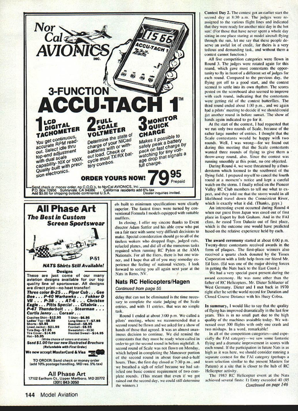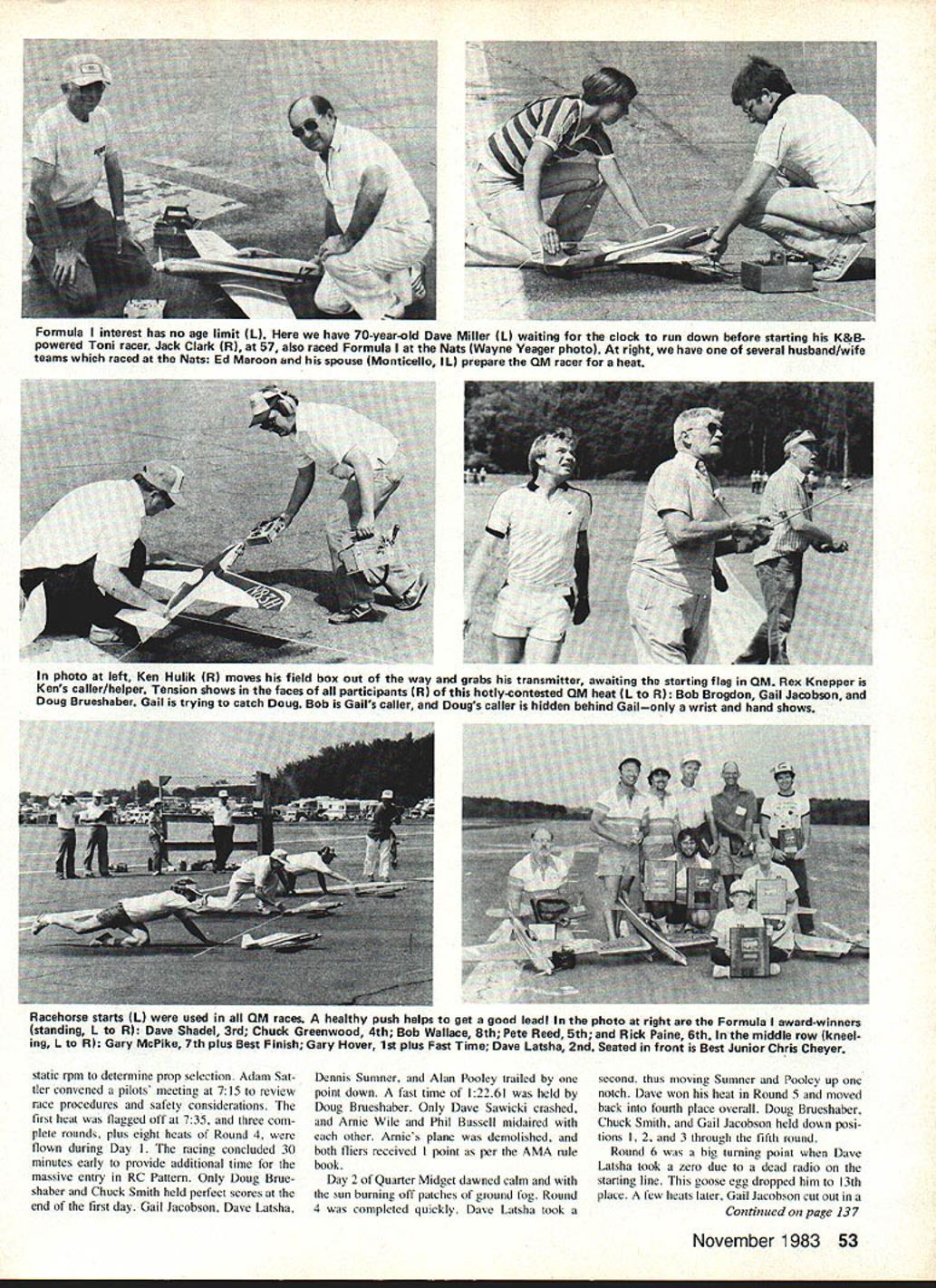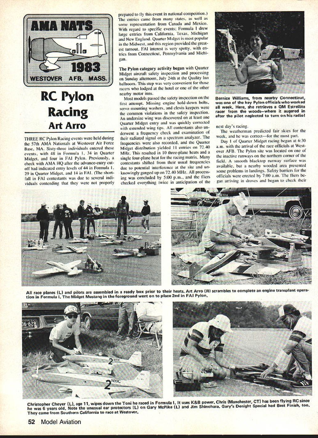 Racing Art Arro THREE RC Pylon Racing events held during 57th AMA Nationals Westover Air Force Base MA Sixty-three individuals entered events 48 Formula 34 Quarter Midget four FAI Pylon Previously check AMA HQ after advance-entry cut off indicated entry levels 44 Formula 29 Quarter Midget 14 FAI short fall FAI contestants due several indi viduals contending properly prepared fly event national competition entries came states well some representation Canada Mexico regard specific events Formula drew large entries Califomia Texas Michigan New England Quarter Midget popular Midwest region provided great est turnout FAI interest very spotty en tries Connecticut Pennsylvania Michi gan Pylon category activity began Quarter Midget aircraft safety inspection processing Sunday aftemoon July 24th Quality Inn ballroom step very convenient racers lodged hotel other nearby motor inns Most models passed safety inspection first attempt Missing engine hold-down bolts servo mounting washers clevis keepers common violations safety inspection An undersize wing discovered least Quarter Midget entry quickly corrected extended wing tips contestants also un derwent frequency check examination radiated signal spectrum analyzer frequencies also recorded Quarter Midget distribution yielded II entries 7240 MHz resulted 10 three-plane heats single four-plane heat racing matrix contestants shifted usual frequencies due potential interference site un knowingly ganged up 7240 MHz process ing concluded 500 pm fliers checked everything twice anticipation next days racing weatherman predicted fair skies week correctfor part Day Quarter Midget racing began 630 am arrival race officials Westover AFB Pylon site located inactive runways northern corner field smooth blacktop runway surface available nearby wooded area presented some problems landings Safety barriers officials erected 700 am fliers gan arriving droves began check race planes 1 pilots assembled ready box prior heats Art Arro R scrambles complete engine transplant opera tion Formula Midget Mustang foreground went place 2nd FAI Pylon Christopher Cheyer L age 11 wipes down Toni raced Formula uses K&B power Chris Manchester CT has flying RC since 6 years old Note unusual ear protectors U Gary McPike 1 Jim Shinohara Garys Denight Special Best Finish too came Southern California race Westover 52 Model Aviation RC Pylon Bernice Williams nearby Connecticut key Pylon officialswho worked week retrieves QM Estrellita racer woodswhere augered after pilot neglected turn radiol static rpm determine prop selection Adam Sat tIer convened pilots meeting 715 review race procedures safety considerations first heat flagged off 735 three com plete rounds plus eight heats Round 4 flown during Day racing concluded 30 minutes early provide additional time massive entry RC Pattem Only Doug Brue shaber Chuck Smith held perfect scores end first day Gail Jacobson Dave Latsha Dennis Sumner Alan Pooley trailed point down fast time 12261 held Doug Brueshaber Only Dave Sawicki crashed Arnie Wile Phil Bussell midaired other Arnies plane demolished both fliers received point per AMA rule book Day 2 Quarter Midget dawned calm sun burning off patches ground fog Round 4 completed quickly Dave Latsha took second thus moving Sumner Pooley up notch Dave won heat Round 5 moved back fourth place overall Doug Brueshaber Chuck Smith Gail Jacobson held down posi tions 2 3 through fifth round Round 6 big turning point Dave Latsha took zero due dead radio starting line goose egg dropped him 13th place few heats later Gail Jacobson cut out Continued page 137 November 1983 53 Formula interest has no age limit L have 70-year-old Dave Miller 1 waiting clock run down before starting K&B powered Toni racer Jack Clark R 57 also raced Formula Nats Wayne Veager photo right have several husband/wife teams raced Nats Ed Maroon spouse Monticello IL prepare OM racer heat photo left Ken Hulik R moves field box out way grabs transmitter awaiting starting flag OM Rex Knepper Kens caller/helper Tension shows faces participants R hotlycontested QM heat 1 R Bob Brogdon Gail Jacobson Doug Brueshaber Gail trying catch Doug Bob Gails caller Dougs caller hidden behind Gailonly wrist hand shows Racehorse starts 1 used QM races healthy push helps get good leadl photo right Formula awardwinners standing L R Dave Shadel 3rd Chuck Greenwood 4th Bob Wallace 8th Pete Reed 5th Rick Paine 6th middle row kneel ing L R Gary McPike 7th plus Best Finish Gary Hover 1st plus Fast Time Dave Latsha 2nd Seated front Best Junior Chris Cheyer vious fast-paced schedule Chris Bovais flew scratch-built Schweizer 126B capture 1st place Senior category perfect 20-20 hindsight can now look back see could have imiproved competition Overdl think NSS Soaring community gained greater respect AMA Nats officials handling competition admittedly too large ever opinion concept Nationals least far RC Soaring events concerned should changed possible accommo date everyone may want enter Limiting number persons per individual frequency must Limiting total number entrants must also considered allowed everyone wanted use 72400 MHz enter would have spent six hours just get individuals flight33 people requested use frequency Another consideration competition size requires too experienced workers wore out ones during com petition also assisted persons stepped out ranks speak operate winches retrieve lines work transmitter impound Without people couldnt have made Thanks helped list names helped make com petition success would take several pages would probably miss someone Additional thanks mc Bill Meleske somehow found time take pictures ac company article Nats RC Pylon/Arro Continued page 53 blistering race Doug Brueshaber moving Gail eighth place overall Racing concluded 1130 am single heat remaining flown Round 6 Wednesday July 26 Day 3 Quarter Midget racing calm cool sunny weather holding out Chuck Smith won last heat Round 6 Nelson-powered Folkerts racer still tied Dou