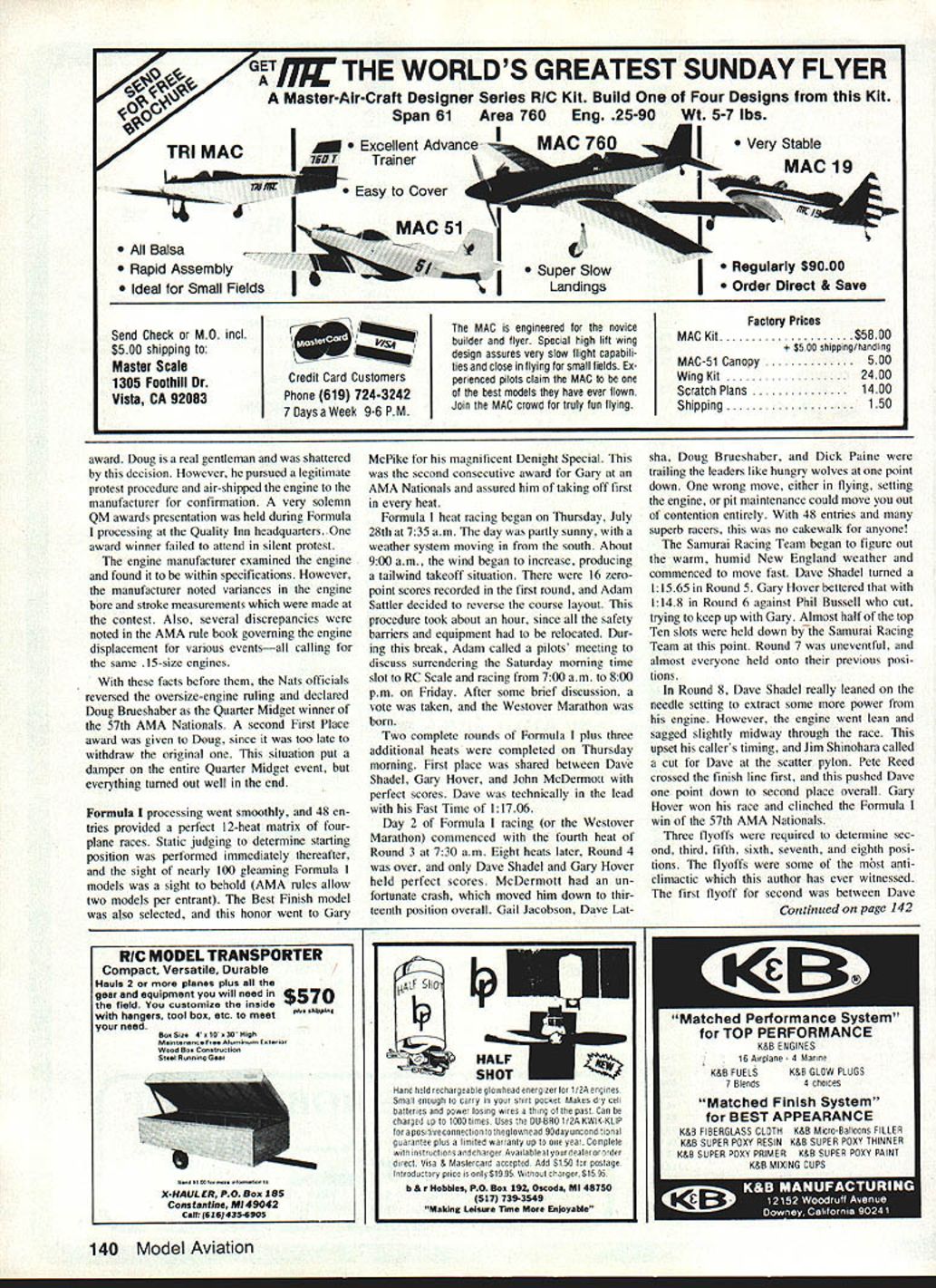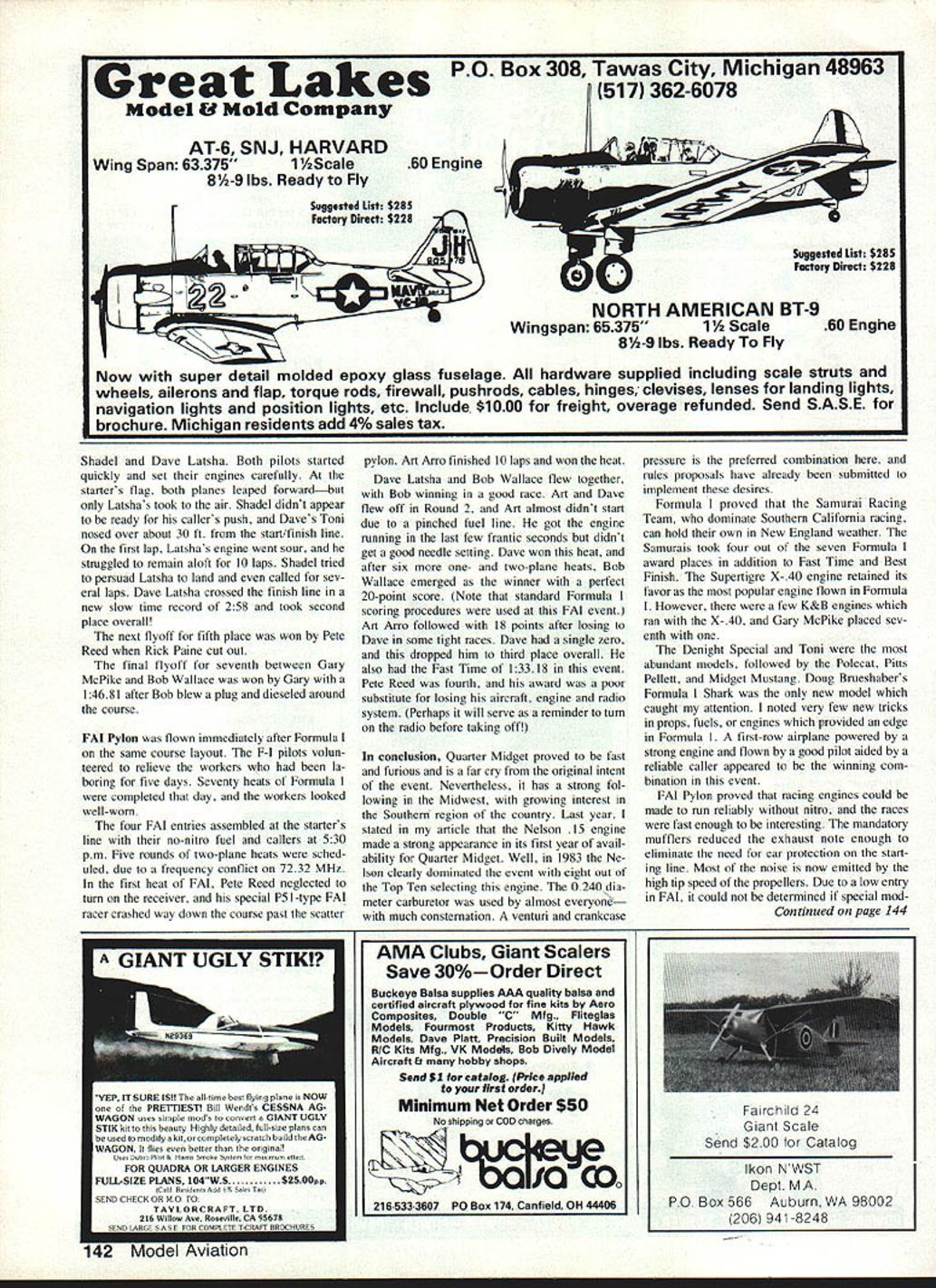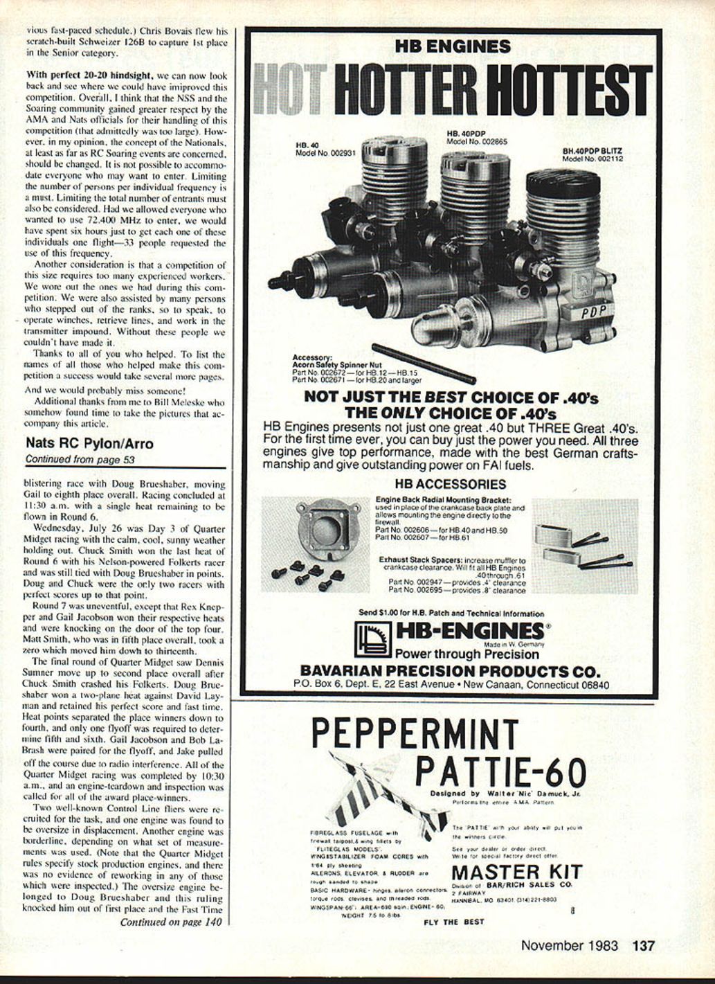 Racing Art Arro THREE RC Pylon Racing events held during 57th AMA Nationals Westover Air Force Base MA Sixty-three individuals entered events 48 Formula 34 Quarter Midget four FAI Pylon Previously check AMA HQ after advance-entry cut off indicated entry levels 44 Formula 29 Quarter Midget 14 FAI short fall FAI contestants due several indi viduals contending properly prepared fly event national competition entries came states well some representation Canada Mexico regard specific events Formula drew large entries Califomia Texas Michigan New England Quarter Midget popular Midwest region provided great est turnout FAI interest very spotty en tries Connecticut Pennsylvania Michi gan Pylon category activity began Quarter Midget aircraft safety inspection processing Sunday aftemoon July 24th Quality Inn ballroom step very convenient racers lodged hotel other nearby motor inns Most models passed safety inspection first attempt Missing engine hold-down bolts servo mounting washers clevis keepers common violations safety inspection An undersize wing discovered least Quarter Midget entry quickly corrected extended wing tips contestants also un derwent frequency check examination radiated signal spectrum analyzer frequencies also recorded Quarter Midget distribution yielded II entries 7240 MHz resulted 10 three-plane heats single four-plane heat racing matrix contestants shifted usual frequencies due potential interference site un knowingly ganged up 7240 MHz process ing concluded 500 pm fliers checked everything twice anticipation next days racing weatherman predicted fair skies week correctfor part Day Quarter Midget racing began 630 am arrival race officials Westover AFB Pylon site located inactive runways northern corner field smooth blacktop runway surface available nearby wooded area presented some problems landings Safety barriers officials erected 700 am fliers gan arriving droves began check race planes 1 pilots assembled ready box prior heats Art Arro R scrambles complete engine transplant opera tion Formula Midget Mustang foreground went place 2nd FAI Pylon Christopher Cheyer L age 11 wipes down Toni raced Formula uses K&B power Chris Manchester CT has flying RC since 6 years old Note unusual ear protectors U Gary McPike 1 Jim Shinohara Garys Denight Special Best Finish too came Southern California race Westover 52 Model Aviation RC Pylon Bernice Williams nearby Connecticut key Pylon officialswho worked week retrieves QM Estrellita racer woodswhere augered after pilot neglected turn radiol static rpm determine prop selection Adam Sat tIer convened pilots meeting 715 review race procedures safety considerations first heat flagged off 735 three com plete rounds plus eight heats Round 4 flown during Day racing concluded 30 minutes early provide additional time massive entry RC Pattem Only Doug Brue shaber Chuck Smith held perfect scores end first day Gail Jacobson Dave Latsha Dennis Sumner Alan Pooley trailed point down fast time 12261 held Doug Brueshaber Only Dave Sawicki crashed Arnie Wile Phil Bussell midaired other Arnies plane demolished both fliers received point per AMA rule book Day 2 Quarter Midget dawned calm sun burning off patches ground fog Round 4 completed quickly Dave Latsha took second thus moving Sumner Pooley up notch Dave won heat Round 5 moved back fourth place overall Doug Brueshaber Chuck Smith Gail Jacobson held down posi tions 2 3 through fifth round Round 6 big turning point Dave Latsha took zero due dead radio starting line goose egg dropped him 13th place few heats later Gail Jacobson cut out Continued page 137 November 1983 53 Formula interest has no age limit L have 70-year-old Dave Miller 1 waiting clock run down before starting K&B powered Toni racer Jack Clark R 57 also raced Formula Nats Wayne Veager photo right have several husband/wife teams raced Nats Ed Maroon spouse Monticello IL prepare OM racer heat photo left Ken Hulik R moves field box out way grabs transmitter awaiting starting flag OM Rex Knepper Kens caller/helper Tension shows faces participants R hotlycontested QM heat 1 R Bob Brogdon Gail Jacobson Doug Brueshaber Gail trying catch Doug Bob Gails caller Dougs caller hidden behind Gailonly wrist hand shows Racehorse starts 1 used QM races healthy push helps get good leadl photo right Formula awardwinners standing L R Dave Shadel 3rd Chuck Greenwood 4th Bob Wallace 8th Pete Reed 5th Rick Paine 6th middle row kneel ing L R Gary McPike 7th plus Best Finish Gary Hover 1st plus Fast Time Dave Latsha 2nd Seated front Best Junior Chris Cheyer vious fast-paced schedule Chris Bovais flew scratch-built Schweizer 126B capture 1st place Senior category perfect 20-20 hindsight can now look back see could have imiproved competition Overdl think NSS Soaring community gained greater respect AMA Nats officials handling competition admittedly too large ever opinion concept Nationals least far RC Soaring events concerned should changed possible accommo date everyone may want enter Limiting number persons per individual frequency must Limiting total number entrants must also considered allowed everyone wanted use 72400 MHz enter would have spent six hours just get individuals flight33 people requested use frequency Another consideration competition size requires too experienced workers wore out ones during com petition also assisted persons stepped out ranks speak operate winches retrieve lines work transmitter impound Without people couldnt have made Thanks helped list names helped make com petition success would take several pages would probably miss someone Additional thanks mc Bill Meleske somehow found time take pictures ac company article Nats RC Pylon/Arro Continued page 53 blistering race Doug Brueshaber moving Gail eighth place overall Racing concluded 1130 am single heat remaining flown Round 6 Wednesday July 26 Day 3 Quarter Midget racing calm cool sunny weather holding out Chuck Smith won last heat Round 6 Nelson-powered Folkerts racer still tied Dou