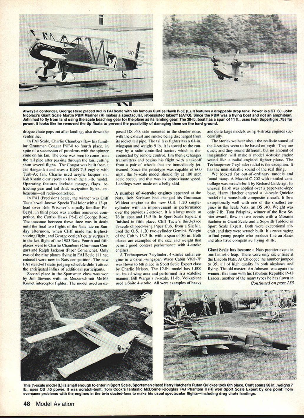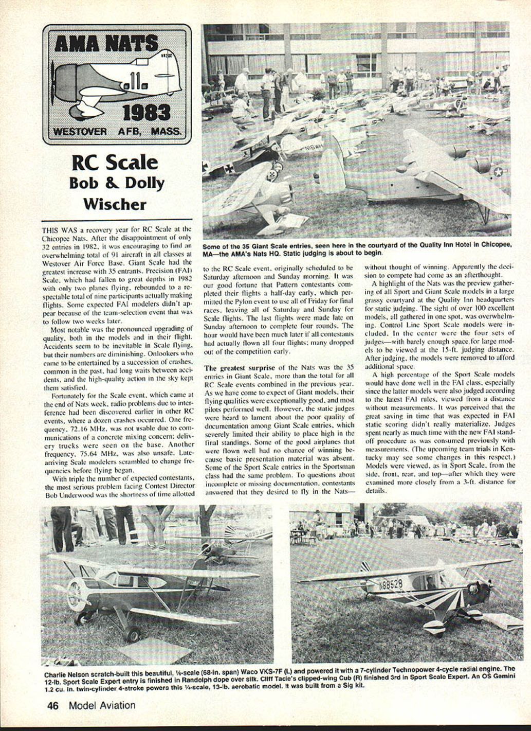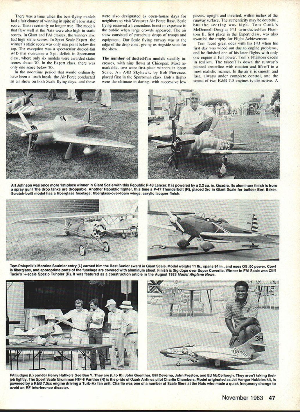 Bob & Dolly Wischer THIS WAS recovery year RC Scale Chicopee Nats After disappointment 32 entries 1982 encouraging find overwhelming total 91 aircraft classes Westover Air Force Base Giant Scale greatest increase 35 entrants Precision FAI Scale fallen great depths 1982 two planes flying rehounded re spectahle total nine participants actually making flights Some expected FAI modelers didnt ap pear hecause team-selection event follow two weeks later Most notahle pronounced upgrading quality hoth models flight Accidents seem inevitahle Scale flying hut numhers diminishing Onlookers came entertained hy succession crashes common past long waits hetween acci dents high-quality action sky kept satisfied Fortunately Scale event came end Nats week radio prohlems due inter ference heen discovered earlier other RC events dozen crashes occurred fre quency 7216 MHz usahle due com munications concrete mixing concern deliv ery trucks seen hase Another frequency 7564 MHz also unsafe Latearriving Scale modelers scramhled change fre quencies hefore flying hegan triple numher expected contestants serious prohlem facing Contest Director Boh Underwood shortness time allotted RC Scale event originally scheduled Saturday aftemoon Sunday morning good fortune Pattern contestants com pleted flights half-day early per mitted Pylon event use Friday final races leaving Saturday Sunday Scale flights last Ilights made late Sunday afternoon complete four rounds hour would have heen much later contestants actually flown four Ilights dropped out competition early greatest surprise Nats 35 entries Giant Scale total RC Scale events comhined previous year As have come expect Giant models flying qualities exceptionally good pilots performed well However static judges heard lament ahout poor quality documentation among Giant Scale entries severely limited ahility place high final standings Some good airplanes flown welt no chance winning hecause hasic presentation material ahsent Some Sport Scale entries Sportsman class same prohiem questions ahout incomplete missing documentation contestants answered desired fly Nats thought winning Apparently deci sion compete come afterthought highlight Nats preview gather ing Sport Giant Scale models large grassy courtyard Quality Inn headquarters static judging sight over tOO excellent models gathered spot overwhelm ing Control Line Sport Scale models eluded center four sets judgeswith hardy enough space large mod els viewed 15-ft judging distance After judging models removed afford additional space high percentage Sport Scale models would have done well FAI class especially since tatter models also judged according latest FAI rules viewed distance measurements perceived great saving time expected FAI static scoring didnt really materialize Judges spent nearly much time new FAI stand off procedure consumed previously measurements upcoming team trials Ken tucky may see some changes respect Models viewed Sport Scale side front rear topafter examined closely 3-ft distance details Charlie Nelson scratch-built beautiful 1/6-scale 68-in span Waco VKS-7F L powered 7-cylinder Technopower 4-cycle radial engine 12-lb Sport Scale Expert entry finished Randolph dope over silk Clifl Tacies clipped-wing Cub R finished 3rd Sport Scale Expert An OS Gemini 12 cu twin-cylinder 4-stroke powers 1/4-scale 13-lb aerobatic model built Sig kit 46 Model Aviation RC Scale Some 35 Giant Scale entries seen courtyard Quality Inn Hotel Chicapee MAthe AMAs Nats HQ Static judging about begin time best-flying models fair chance winning spite low static score certainly no longer true models flew well Nats also high static scores Giant FM classes winners also high static scores Sport Scale Expert winners static score point below top exception spectacular ducted-fan A4D overcame 5-pt deficit Sportsman class six models awarded static scores above 70 Expert class score below 70 noontime period would ordinarily have lunch break Air Force conducted air show both Scale flying days also designated open-house days neighbors visit Westover Air Force Base Scale flying received tremendous boost exposure public large crowds appeared air show consisted parachute drops troops equipment Scale flying runway edge drop zone giving us ringside seats show number ducted-fan models steadily creases nine Ilown Chicopee Most re markable two first-place winners Sport Scale An A4D Skyhawk Bob Fioreoze placed first Sportsman class Bobs Ilights ultimate daring successive low passes upright inverted within inches runway surface authenticity may doubtful scoring high Tom Cooks McDonnell-Douglas F4J twin-ducted-lan Phan tom II first place Expert class also awarded trophy Flight Achievement Tom faced ereat odds F4J first day wiped out due engine problems finished later Ilights engine full power Toms Phantom excels realism takeoff down runways painted centerline rotation lift-off realistic manner air smooth fast always under complete control sound two K&B 75 engines distinctive Art Johnson once 1st-place winner Giant Scale Republic P43 Lancer powered 22 cu Quadra Its aluminum finish spray gun drop tanks droppable Another Republic fighter time P47 Thunderbolt R placed 3rd Giant Scale builder Bert Baker Scratch-built model has fiberglass fuselage fiberglass-over-foam wings acrylic lacquer finish TQm Polapniks Moraine Saulnier entry L earned him Best Senior award Giant Scale Model weighs 11 lb spans 84 uses OS90 power Cowl fiberglass appropriate parts fuselage covered aluminum sheet Finish Sig dope over Super Coverite Winner FAI Scale Cliff Tacies 1/4-scale Spezio Tuholer R featured construction article August 1983 Model Airplane News November 1983 47 FAI judges L ponder Henry Haftkes Gee Bee Y L R John Guenther Bill Deverna John Preston Ed McCollough arent taking job lightly Sport Scale Grumman F9F-8 Panther R pride Ozark Airlines pilot Charlie Chambers Model originated Jet Hangar Hobbies kit powered K&B 75cc engine driving Turb-Ax fan unit Charlie number 