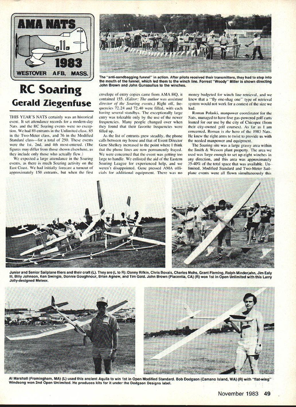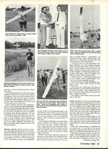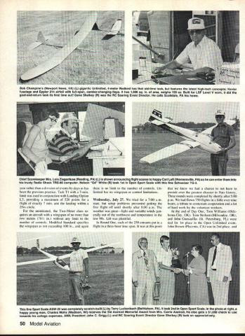 Gerald Ziegenfuse THIS YEARS NATS certainly historical event set attendance records modern-day Nats RC Soaring events no excep tion 89 entrants Unlimited class 85 Two-Meter class 76 Modified Standard classfor total 250 events 1st 2nd 4th most-entered figures may differ shown elsewhere include actually flew expected large attendance Soaring events much Soaring activity East Coast initially forecast turnout approximately ISO entrants hut first envelope entry copies came AMA HQ contained 155 Editor author assistant director Soaring events Right off fre quencies 7224 7240 filled having several standbys exceptionally large entry tolerable use newer frequencies people changed over found favorite frequencies filled up As list entrants grew steadily phone calls between house Event Director Gene Shelkey increased point think phone lines now permanently frayed concerned event getting too large handle enlisted aid Eastern Soaring League experienced help werent disappointed Gene pressed AMA ofli cials additional equipment no 1 money budgeted winch line retrieval knew fly one-shag type retrieval system would work contest size Roman Polaski manpower coordinator Nats managed have five gas-powered golf carts loaned use city Chicopee city-owned golf courses As far am concerned Roman hero 1983 Nats knew right arms twist provide us needed manpower equipment Soaring site large grassy area within Smith & Wesson plant property area used large enough set up eight winches direction area approximately 35-40% total space available Un limited Modified Standard Two-Meter Sail plane events flown simultaneously Al Marshall Framingham MA L used ancient Aquila win 1st Open Modified Standard Bob Dodgson Camano Island WA R flat-wing Windsong won 2nd Open Unlimited produces kits under Dodgson Designs label November 1983 49 RC Soaring anti-sandbagging funnel action After pilots received transmitters step mouth funnel led winch line Forrest Woody Miller shown directing John Brown John Gunsaullus winches Junior Senior Sailplane fliers craft L L R Danny Rifkin Chris Bovais Charles Mohs Grant Fleming Ralph Minderjahn Jim Ealy Ill Billy Johnson Ken Swingle Donnie Goughnour Brian Agnew Tim Gold John Brown Placentia CA R won 1st Open Unlimited Larry Jolly-designed Meteor year rather division events days has previous practice Task TI 7-mm limit used conjunction Landing Option L3 providing maximum 520 points flight exactly 7 mm landing within 25m circle uninitiated Two-Meter class re quires aircraft wingspan no two meters 78V limit number controls Modified Standard specifies wingspan nor exceeding 100 again no limit number controls Un limited has no wingspan control limitations Wednesday July 27 tried 700 am start setup problems prevented getting first flight off until shortly after 800 am weather greatlight variable winds gen erally out northwest temperature low 90s Lift plentiful Round 250 entrants put flight three-hour time span point knew chance have preside over greatest disaster Nats history Three rounds completed shortly after 500 pm flown 750 flights little over nine hours tribute contestant cooperation lot hard work volunteer workers end Day Tom Williams Okla homa City OK Tom Neilson Milwaukie OR John Gunsaulliis St Petersburg FL tied 1st place Open Unlimited event John Brown Placenta CA 2nd place 50 Model Aviation Bob Champines Newport News VA L gigantic Unlimited 4-meter Redbird has old-time look features latest high-tech concepts Keviar fuselage Eppler 214 airfoil full-span camber-changing flaps has 1900 sq area weighs 159 oz Built LSF Level V work did goal-and-return task its first time out Gene Shelkey R RC Soaring Event Director calls Scottdale PA home Chief Scorekeeper Mrs Lois Ziegenfuse Reading PA L shown announcing flight scores happy Carl Luft Wernersville PA can enter trusty Radio Shack TRS-80 computer Nelson Ed White R took 1St Open Sport Scale fine Schweizer TG-3 fine Sport Scale ASW-20 completely scratch-built L Terry Luckenbach Bethlehem PA took 2nd Open Sport Scale photo right happy young man Charles Mohs Madison WI receives Sid Axeirod Memorial Award Mrs Carrie Axeirod also gets $1000 check use towards college expenses AMA President John C Grigg L RC Soaring Event Director Gene Shelkey R look appreciatively Bill Meleske Baldwin NY won 2nd Open TwoMeter Prophet IV model selfportrait maybe 3rd place held Michael Hoeffler North born MA Open Standard event Martin McCartney Braintree MA 1st place Alan Marshall Framingham MA 2nd Anthony Matyi Hamilton Sq NJ 3rd Open Two-Meter saw old-timer William Meleske Baldwin NY 1st place Peter Carr Ridgeway PA 2nd Jim Weicrich Vestal NY 3rd Senior Unlimited Tim Gold Bethlehem PA 1st place Ralph Minderjahn Philadelphia PA 2nd Ken Swingle Shavertown PA 3rd Senior Standard Chris Bovais Ft Bragg NC 1st place Tim Gold also 1st Senior Two-Meter Grant Fleming Sirnsbury CT 2nd Brian Agnew Ft Meyers FL 3rd Jim Ealy Ill Pottstown PA held down 1st place Junior Unlimited Junior Standard Junior Two-Meter Billy Johnson Vestal NY 2nd Junior Unlimited Junior TwoMeter Danny Rifkin Nanuet NY 2nd Junior Standard Thursday July 28 Weather forecasts Tues day indicated day next would repeat Wednesday However greeted southwest breezes arrived field relocate winches suit underway 830 am constant chatter walkie-talkies between winebmaster workers tumaround pulleys indi cated winds got up 8-lO mph shifting southerly direction causing problems Time completing Rounds 4 5 stretched approximately 3 hours beginning Round 6 walkie-talkies started fail due low batteries winch operation slowed down Without communica tions winch operators turnaround pulley workers didnt know what going other end Jammed pulleys crossed broken lines threatened cause disaster feared earlier week Through strict winch sequencing al lowing launch until positive preceding launch winch line fully wound down crossing other line able complete Round 6 Unfortunately round time average suffered Round 6 didnt end until 825 pm fliers fly f