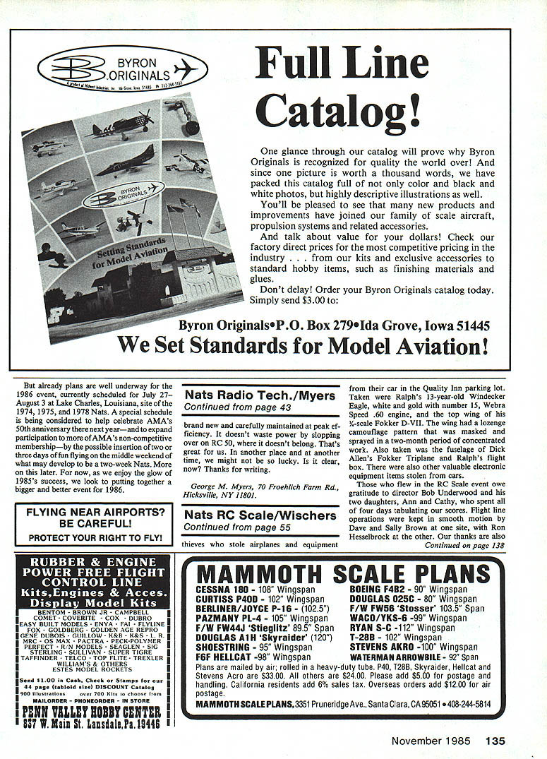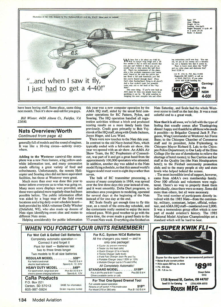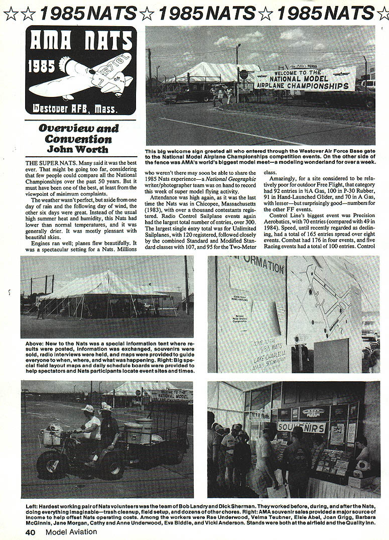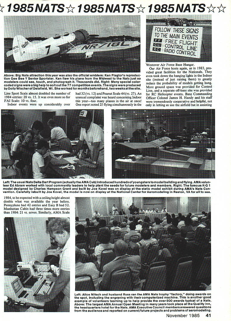 1985NATS 1985NATSY 1985NATS THE SUPER NATS said best ever might going too far considering few people could compare National Championships over past 50 years must have best least viewpoint minimum complaints weather wasnt perfect aside day rain following day wind other six days great Instead usual high summer heat humidity Nats lower normal temperatures generally drier mostly pleasant beautiful skies Engines ran well planes flew beautifully spectacular setting Nats Millions werent may soon able share 1985 Nats experiencea National Geographic writer/photographer team hand record week super model flying activity Attendance high again last time Nats Chicopee Massachusetts 1983 over thousand contestants regis tered Radio Control Sailplane events again largest total number entries over 300 largest single entry total Unlimited Sailplanes 120 registered followed closely combined Standard Modified Stan dard classes 107 95 Two-Meter class Amazingly site considered rela tively poor outdoor Free Flight category 92 entries Gas 100 P-30 Rubber 91 Hand-Launched Glider 70 Gas lesserbut surprisingly goodnumbers other FF events Control Lines biggest event Precision Aerobatics 70 entries compared 49 1984 Speed until recently regarded declin ing total 165 entries spread over eight events Combat 176 four events five Racing events total 100 entries Control Above New Nats special information tent re suits posted information waa exchanged souvenirs sold radio interviews held maps provided guide everyone whatwas happening Right Big spe cial field layout maps daily schedule boards provided help spectators Nats participants locate event sites times Left Hardest working pairof Natavolunteerawastheteam Bob Landryand DickSherman Theyworked before during afterthe Nats doing everything Imaginabletrash cleanup field setup dozens otherchores Right AMA souvenir sales provided majorsource income help offset Nats operating costs Among workers Rae Underwood Velma Teubner Elsie Abel Joan Grigg Barbara McGinnis Jane Morgan Cathy Anne Underwood Eva Biddie Vicki Anderson Stands both airfield Quality inn 40 Model Aviation big welcome sign greeted entered through Westover Air Force Base gate National Modei Airplane Championships competition events other side fence AMAs worlds biggest model meeta modeling wonderland over week 1985NATS 985 NATS V 1985 NATSM Line Sport Scale almost doubled number 1984 entries 28 vs 15 FAI Scale 10 vs four Indoor events up considerably over 32 vs 12 Peanut Scale 44 vs 27 An unusual complaint heard concerning Indoor yeartoo planes air once report noted 25 flying simultaneously Left usual Nets Delta Dart Program actuallythe AMA Cub introduced hundredsof youngsters model building flying AMAvolun teer Ed Abram worked local community leaders help plant seeds future modelers members Right famous K-G 1 model designed Charles Hampson Grant built Joe Kovel display static model exhibit during AMAs Nats Con vention Carefully rebuilt Joe Kovel model now display National Center Aeromodeling Reston VA see November 1985 41 Westover Air Force Base Hangar Air Force hosts again 1983 pro vided great facilities Nationals ADOVS ig PISTS attraction mis year aiso oTyicial emDlem en i-iagiors reproauc- took down hanging lights Indoor tion Gee Bee Y Senior Sportster Ken flew plane Midwest Nats just site instead just raising greatly modelers could see touch photograph Thousands did Right special color- reduce probability models getting hung coded signs big help sort out 77 competition events signs produced Doily Wischer Delafleid WI worked months beforehand two weeks siteMore ground space provided Control Line separate off-base site provided RC Helicopter events Bas Commanding Officer Colonel James H Handy staff tremendously cooperative helpful letting us use airfield assisting 1984 expected ceiling height almost double what available year before Pennyplane 42 entries Easy B 52 Manhattan Cabin three times entries 1984 21 vs seven Similarly AMA Scale Left Alice Nitsch husband Russ ran AMA Nats trophy factory doing awards spot including engraving computerized machine another good example volunteers teaming up help provide over-900 awards typical Nats Above largest AMA Annual Open Meeting years took place Quality inn headquarters hotel Nats AMA Executive Council members answered questions audience reported current/future projects problems aeromodeling dozens details support greatest areas assistance allow 1985 Nats theme airplane Ken Flag brs Gee Bee Model Y Senior Sportster fly parked Nats area week long plane tremendous drawing card thousands pictures taken display particularly appropriate since nearby City Springfield home Gee Bee racers during Thirties contrast 1983 RC Sailplanes flew almost trouble-free over four days compe tition 1985 Nats Soaring scene few problems local paging system inter ference shut down frequency Another day rain followed day wind Ragardless tremendous amount flying done Davey retrieval winches 985NATSY 985 NA TS Y I985NATS down Free Flight continuedespecially FF Scale also much disbelief Wakefield models seen achieve maxi mum duration flights rain Although some complained about continuing downpour took stride FF Scale contestants fact asked whether wanted quit go agreed keep flying Aside two days unhappy weather midweek flying conditions mostly great Nats started right time first Sunday morning RC international class Pylon Racing finished early week later RC Scale Sunday afternoon Because Westover site permits Free Flight Control Line Radio Control events flown within area less mile square skies Continued Da2e 134 blamed some launching prob lems 1984 performed beautifully negated need usual line-retrieval vehicles manpower past Providing separate sites RC Sailplanes Helicopters helped both events get flying would otherwise have possible Helicopter event also tremendously helped year under direction Horace Hagen recruited good crew run events too some rain wind problems got flying necessary finish sch