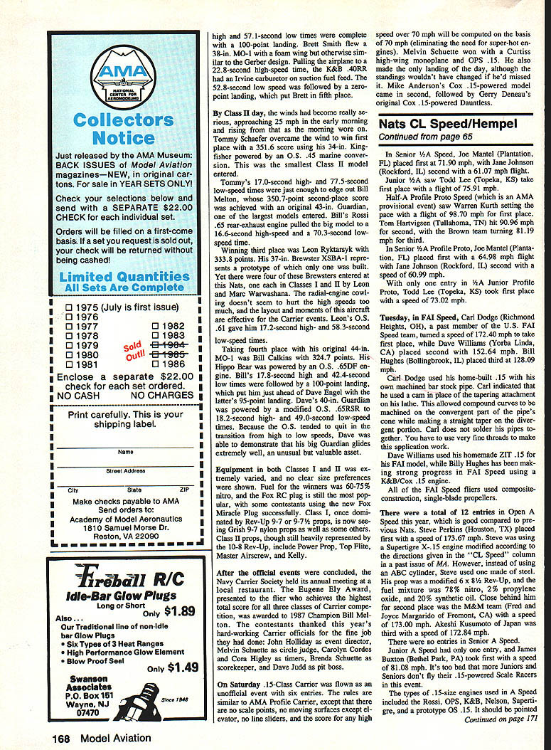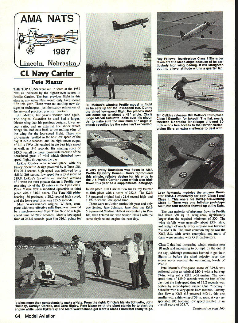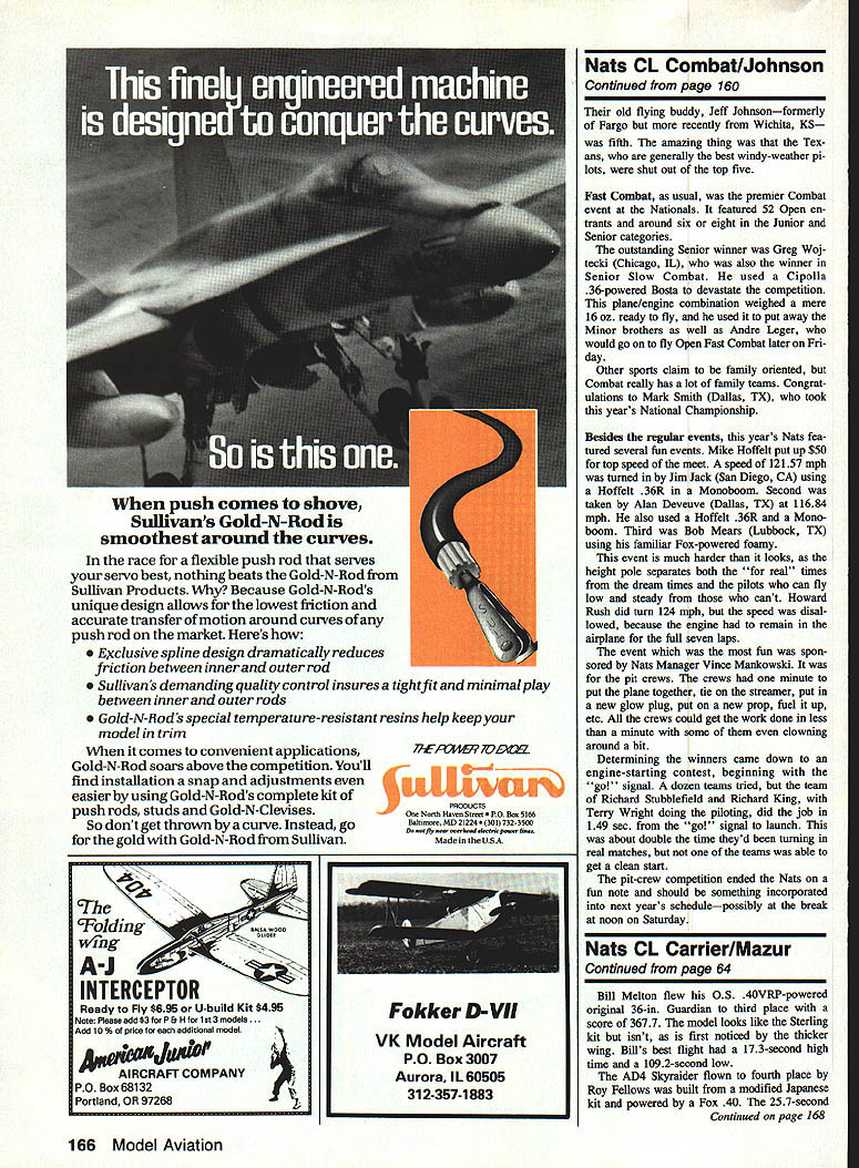 CL Navy Carner Pete Mazur THE TOP GUNS out force 1987 Nats indicated highest-ever scores Profile Carrier best previous flight class other Nats would have scored fifth year no startling new de signs techniques just steady refinement artand practice practice practice Bill Melton last years winner won again original Guardian used larger thicker wing previous designs lower pect ratio external line slider brings lead-outs back trailing edge wing low-speed flight im provements resulted best low speed day 2752 seconds high power output Bills TWA 36 resulted best high speed well 196 seconds winning score 3430 remarkable because occasional gusts wind disturbed lowspeed flights throughout day LeRoy Cordes won second place Fairey Spearfish design powered Tune 36 214-second high speed followed skillful 268-second low speed total score 3198 LeRoys Spearfish modified versions popular design Profile rep resenting six 15 entries Open class Peter Mazur flew modified Spearfish third place 3161 score Tune-Hill plainbearing 36 produced 202-second high speed low-speed time 2355 seconds Marc Warwashanas original Wildcat com plete very effective split flaps powered much-reworked SuperTigre S-36 highspeed time 209 seconds Marcs low-speed time 2435 seconds gave him 3161 points fourth place Bill Calkins flew Fairey Fulmar fifth place score 2826 K&B 58-powered original 216-second high- 1922-second low-speed time no Junior entries year Senor Jane Johnson Jane flew K&B 58-powered Sterling Hellcat successfully Pro file entered won Senior Class same airplane engine next day vast majority alrplanes flown Profile about 350 sq wing area significantly larger required minimum 300 wing airfoils generally about 15% thick weight nearly airplane between 2 3 lb common engine K&B 58 seven examples running OS carburetors Class day increasing winds starting near 10 mph increasing 30 mph end day Although contestants hurried get flights before wind velocity rose scores never reached outstanding levels Profile Pete Mazurs first-place score 3798 achieved using original MO-i built-up 37-in wing K&B 40S engine lowspeed time 1299 seconds best day high-speed time 172 seconds beaten second-place winner Carl Tommy Schaefer very quick 159 seconds Tommy also flew K&B 65-powered MO-i smaller thin wing 33-in span very re spectable 1051-second low speed resulted overall score 3787 Continued page 166 64 Model Aviation AMA NATS oln Nebraska Roy Fellows fourth-place Class Skyraider takes off steep angle because its par ticularly high wing loading will straighten out level attitude within quarter lap Bill Meltons winning Profile model flight sets up low-speed run During timed low-speed flight planes nose will come up about 450 angle Circle judge Melvin Schuette looks over shoul der make sure maximum 60 angle attack specified rules isnt exceeded Bill Calkins releases Bill Meltons third-place Class Guardian takeoff flat nearly treeless Nebraska landscape allowed 30 mph winds free access Carrier circles giving fliers extra challenge deal very pretty Dauntless flown AMA Profile Gerry Deneau Gerry reproduced simple reliable design entry 15 Profile Carrier event trialflown year supplemental category Leon Ryktarsky modeled unusual Brew ster XSBA-1 effectively both Class Class II ones third-place-winning Class II full-size prototype built four models showed up Nats takes contestants make Nats right Officials Melvin Schuette John Holliday Carolyn Cordes Cora Higley Pete Mazur pipe stands start engine Leon Ryktarsky Marc Warwashana get Marcs Class Brewster ready go race flexible push rod serves servo best nothing beats Gold-N-Rod Sullivan Products Because Gold-N-Rods unique design allows lowest friction accurate transfer motion around curves push rod market Heres Exclusive spline design dramatically reduces friction between inner outer rod Sullivans demanding qualily control insures tightfit minimal play between inner outer rods Gold-N-Rods special temperature-resistant resins help keep model trim comes convenient applications Gold-N-Rod soars above competition Youll find installation snap adjustments easier using Gold-N-Rods complete kit push rods studs Gold-N-Clevises So dont get thrown curve Instead go gold Gold-N-Rod Sullivan Tolding INTERCEPTOR Ready Fly $696 U build Kit $495 Note Please add $3forPftHforlst3models. Add 10 % price additional model PO Box 68132 Portland OR 97268 fl4ER7OBttEL Noni Have, Stree ox 5166 Baloaore MD21224301 732-3500 Made U BA Nats CL Combat/Johnson Continued page 160 old flying buddy Jeff Johnsonformerly Fargo recently Wichita KS fifth amazing thing Tex ans generally best windy-weather pi lots shut out top five Fast Combat usual premier Combat event Nationals featured 52 Open en trants around six eight Junior Senior categories outstanding Senior winner Greg Woj tecki Chicago IL also winner Senior Stow Combat used Cipolla 36-powered Bosta devastate competition plane/engine combination weighed mere 16 oz ready fly used put away Minor brothers well Andre Leger would go fly Open Fast Combat later Fri day Other sports claim family oriented Combat really has lot family teams Congrat ulations Mark Smith Dallas TX took years National Championship Besides regular events years Nats fea tured several fun events Mike Hoffelt put up $50 top speed meet speed 12157 mph turned Jim Jack San Diego CA using Hoffelt 36R Monoboom Second taken Alan Deveuve Dallas TX 11684 mph also used Hoffelt 36R Monoboom Third Bob Mears Lubbock TX using familiar Fox-powered foamy event much harder looks height pole separates both real times dream times pilots can fly low steady cant Howard Rush did turn 124 mph speed disal lowed because engine remain airplane full seven laps event fun spon sored Nats Manager Vince Mankowski pit crews crews minute put plane together tie streamer put new glow plug put new prop fuel up etc crews could get work done less minute some clowning around bit Determining winners came down engine-starting contest beginning go signal dozen tea