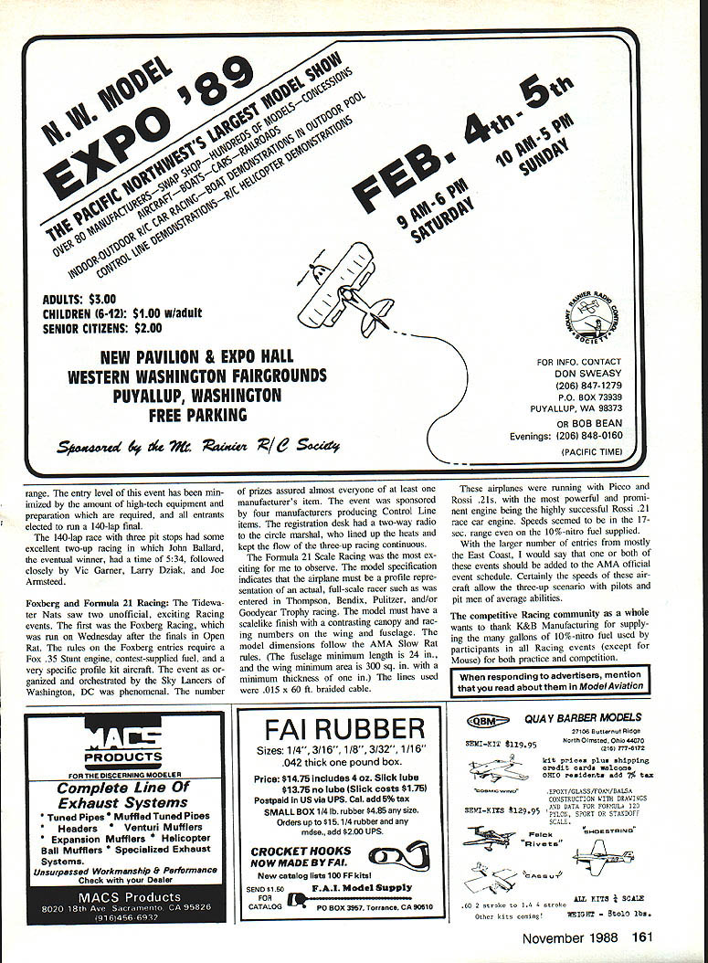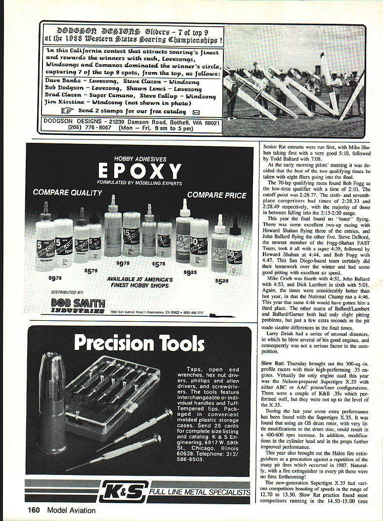 Perennial Walker Cup contender Bob Whitely boggled everyones mind wiifl inc perrormance OT magnificent twin-engined Stunter calls LA Heat placed sixth just missing Walker Cup flyoff Detail shot shows neat installation two Tom Lay-prepared OS 35s Its story good idea Advanced class proving its value event bringing out 30 entries wouldnt have bothered incentive measuring success against yardstick consistent commit ment sport Its story about nearly 80 pilots individual talents goals pirations met Chesapeake VA mea sure progress refine expectations future Sure cant talk about Nats talk ing about winners abun dance Yet another big year 1983 85 champ Jim Casale once again took Open championship Walker Cup Once again Jimmy hard pressed both Paul Walker 1984 87 champ finished second Ted Fancher 1982 86 champ third place Perennial top-five finisher Windy Urtnowski fourth fraction fifth place story its own Stay tuned content Walker Cup Jimmys beautiful ship Columbia resplendent its red white blue US World Champs team regalia stole coveted Concours dElegance well narrowly edging out Windy Urtnowskis equally magnificent Cardinal Both beau tiful ships awarded perfect scores 20 points event director Doug Figgs Tuesday afternoons traditional pilots meeting appear ance judging As near could tell both ships equally deserving 20 points and/or Concours Equally attention-worthy near-scale Grumman Wildcat fielded John Burn Rich mond VA An unfortunate anomaly occurred Johns ship featured very realistic weathered finish reminiscent exquisite ships of worlds finest Scale builders Although John received several votes Concours award including own ship placed last row appearance re ceived five points apparently because lacked classic glossy finish traditional Stunters area PAMPA going have develop guidelines Event Direc tors Appropriate recognition exemplary work such Johns must awarded Another big winner Senior-age contestant Nat Gifford addition winning Senior championship Nat also entered won now AMA-recognized supplemental Advanced event Nat closely followed John Davis flying Pro-Magnum third became property Sig Magnum designer Mike Pratt least seven Sig Magnums entered years Nats making far away sin gle popular design option compete Advanced class newly available Junior Senior fliers Al though may contend regular Open-age awards may enter supple mental Advanced event terrific exposure really serious young competitors urge such youngsters take advantage oppor tunity should attend Nats doing fly age-class competition Fri Continued page 157 THE FINEST flying surface Ive ever seen Control Line models Thats opinion site 1988 Tidewater Nats texture flatness area used CL Rac ing well Stunt antiquity stead tabletop-smooth active runway extreme drought Midwest area summer visions skies finally opening up raining entire Nats week fears unjustified serious rain occurred interstate approached Chesapeake VA area During week Racing competition few threatening thunderstorms did interrupt Rac ing schedule Early morning temperatures low eighties noon low nineties norm Very little wind en countered events weather-related problem high humidity lack breeze flying site keeping heat index uncomfortable range CL Racing events schedule restruc tured 1987 some complaints ensued over having two major Racing events flown day 1988 schedule shifted slightly Scale Racing flown Monday followed Mouse Racing FM Team Racing Tues day Rat Race Wednesday Slow Rat Thursday allowed competitors two full travel days return home Scale Racing good portion Sunday spent competitors tuning practic ing official Scale Racing Monday extremely high humidity caused several problems burned glow plugs competitors using new Nelson one-piece plug found increased 60%-70% humidity too much plugs element Several competitors found switching Nel son funny plug either IL 4L heat range configurations slight majority en trants using Rossi 15 remain der using Nelson 15 Rossi used having new crankcase config uration Although few fliers used K&B/Cox 15 engines past seen years Nats Racing events day started out hot sunny Racing Events Director Chris Melancon pilots meeting 900 am officials tent go November 1988 53 two ladies foreground heart Stunt contest Shareen Fancher L Barbara Shearer tabulated literally thousands Stunt scores over week Peggy Parker background sneaked officials tent get some shade AMA NATS iqee TIDEWATER VIRGINIA CL Racing John Ballard Steve DeBord releases FAST Rat teams winning entry won exciting 439 Yes Fast Rats pull hard John Ballard R time Bob Fogg helps him advice Note flies against FAST team pilot Howard plane airborne about foot Shahan Open Rat final over preliminary heat match-ups re spect choosing get finals competitor vote sided using best time two 70-lap qualifying heats qualifying heats year better 1987 fastest qualifying time 248 cutoff final 300 min utes flat Larry Dziak extremely strong-running Nelson giving him considerable amount glow plug problems consequently switched away one-piece Nelson plug two-piece plug iL configuration six competitors taken final Larry coming out number position excellent performance 541 followed Dick Lambert 551 John Ballard 552 Bob Fogg 609 Bill Biachoff fifth place must remembered Open times 87 Nats over 600-minute mark winners time 618 preliminary cutoff 308 last year winner turning 618 years time can certainly considered vast improvement some exciting two-up racing both Junior Senior Scale Racing Junior won up-and-coming competitor Daniel Schwar zenruber Senior Scale Racing won Mike Shahan respectable 618 followed Todd Ballard running distant second Team Racing Tuesday brought out rather meager entry level FM Team Racing Obvi ously entrants preparing leave CL World Championships conspicuously absent Kelley/Parant team Canada entered world-class equip ment turned respectable 835 final race included prop change Mike Grieb placing second 922 followed Glen Vansant third Mouse Racing event traditionally filled 