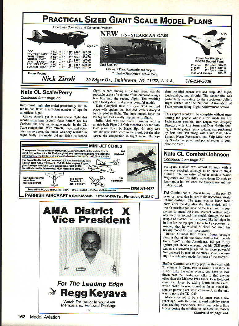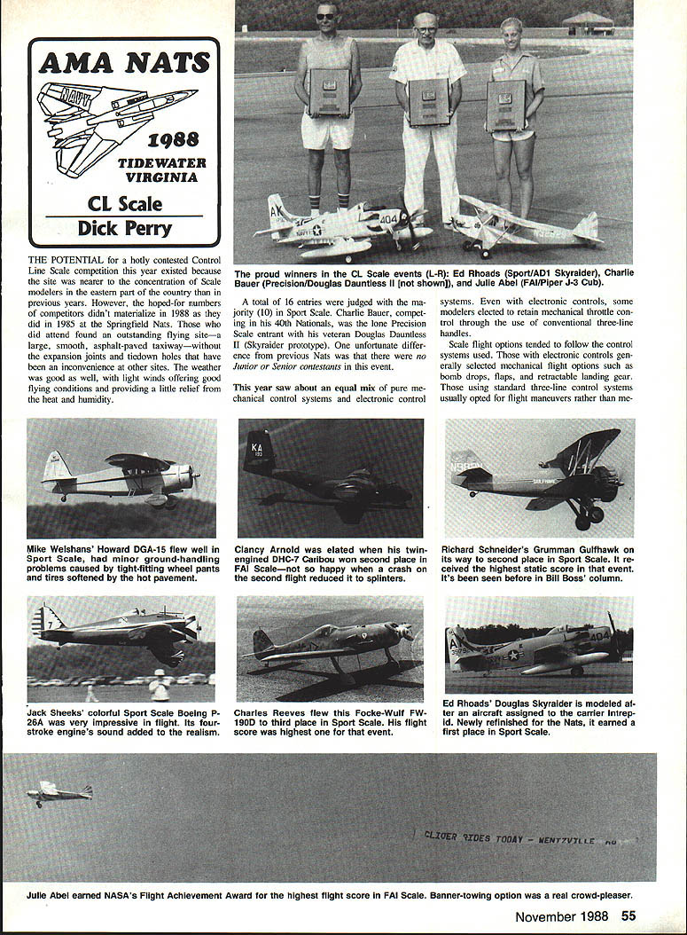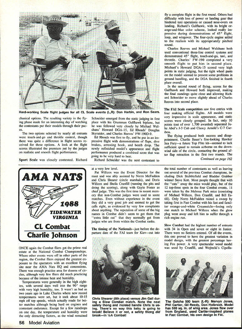 THE POTENTIAL hotly contested Control Line Scale competition year existed because site nearer concentration Scale modelers eastern part country previous years However hoped-for numbers competitors didnt materialize 1988 did 1985 Springfield Nats did attend found outstanding flying sitea large smooth asphalt-paved taxiwaywithout expansion joints tiedown holes have inconvenience other sites weather good well light winds offering good flying conditions providing little relief heat humidity total 16 entries judged ma jority 10 Sport Scale Charlie Bauer compet ing 40th Nationals lone Precision Scale entrant veteran Douglas Dauntless II Skyraider prototype unfortunate differ ence previous Nats no Junior Senior contestants event year saw about equal mix pure chanical control systems electronic control systems electronic controls some modelers elected retain mechanical throttle con trol through use conventional three-line handles Scale flight options tended follow control systems used electronic controls gen erally selected mechanical flight options such bomb drops flaps retractable landing gear using standard three-line control systems usually opted flight maneuvers rather meMike Weishans Howard DGA-15 flew well Clancy Arnold elated twinSport Scale minor ground-handling engined DHC-7 Caribou won second place problems caused tight-filling wheel pants FAI Scalenot happy crash tires softened hot pavement second flight reduced splinters Richard Schneiders Grumman Gulfhawk its way second place Sport Scale re ceived highest static score event Its seen before Bill Boss column Ed Rhoads Douglas Skyraider modeled Charles Reeves flew Focke-Wuif FW- ter aircraft assigned carrier Intrep 190D third place Sport Scale flight id Newly refinished Nats earned score highest event first place Sport Scale Julie Abel earned NASAs Flight Achievement Award highest flight score FAI Scale Banner-towing option real crowd-pleaser November 1988 55 AMA NATS 41 1988 TIDEWATER VIRGINIA CL Scale Dick Perry proud winners CL Scale events L-R Ed Rhoads Sport/ADi Skyralder Charlie Bauer Precision/Douglas Dauntless II [not showni Julie Abel FAI/Piper J-3 Cub Jack Sheeks colorful Sport Scale Boeing P 26A very impressive flight Its fourstroke engines sound added realism chanical options resulting variety fly ing phase made interesting day watching contestants put models through pac es two options selected nearly entrants touch-and-go throttle control though quite difference flight scores re ceived options look flight scores illustrated premium put judges realistic smooth flight performance Sport Scale closely contested Richard Schneider emerged static judging first place Grumman Gultbawk biplane followed very closely Michael Wel shans Howard DGA-15 Ed Rhoads Douglas Skyralder Charles Reeves FW-190D-9 Ed Rhoads first fly put im pressive flight demonstrations flaps dive brakes arresting hook bomb drop newly refinished models appearance flight performance produced combined score going very hard beat Richard Schneider next contestant fly complete flight first round Others difficulty loss power landing gear hindered taxi operations caused nose-overs landing Richards Gulthawk its bright ange-and-blue color scheme looked really im pressive during demonstrations 45 0 flight loop wingover four-cycle engine added realism its appropriately pitched sound Charles Reeves Michael Welshans both used conventional three-line control systems demonstrated 450 flight touch-and-go taxi throttle Charles FW-190 completed very smooth flight put him second place Michaels Howard DGA-15 scored very high points static judging tight wheel pants model seemed present some problems ground handling DGA finished fourth place overall second round flying scores Gulthawk Howard both improved making final standings quite close allowing Rich ard Schneider move slightly ahead Charles Reeves second place FAI Scale competition saw five entries four making official flights models very impressive scale appearance static scores closely grouped fact 10 points out over 1700 awarded separated Ju lie Abels J-3 Cub Clancy Arnolds C-7 Car ibou flying produced both success disap pointment Charlie Bauers fine-looking Hawker Sea Furya future Top Rite kitseemed lack sufficient speed remain alrborne down wind side circle contacting ground af ter flap retraction first two rounds Continued page 162 ONCE again Combat fliers got prime real estate National Combat Championships other events off other parts region Combat fliers enjoyed greatest ex posure spectators excellent flying site near AMA Nats HQ concessions enough practice area dozens cir cles although very few fliers did much practicing because intense heat humidity Temperatures generally high eight ies several days well 9fl0 range very high humidity too wasnt bad two years ago m Lake Charles new record temperatures set took about 10-15 mph off top speeds actually made bet ter matches although being hard engines contestant endurance Except few ralndrops day temperature humidity detracting factors wind remained very low level Pat Willeox Event Director meet ably assisted Norm McFadden Chris Shearer circle marshals Doris Willeox Sheila Cranfill running pits doing scoring along Gayle Foster chief judge first time recent mem ory non-Combat judges used score matches experience event did very good job seemed get calls right evidenced very few complalnts about anything reputation some big names Combat didnt seem get extra little cut normally get judges within Combat ranks timing Nationalsjust before de parture date FM team Kievcut total number contestants well leaving out several previous Combat champions cluding Dick Stubblefield Bladder Grabber winner Steve Kott Most people thought cats away mice would play 12 top-three spots four Combat events 11 taken Melrose Park mice consisting Michael Willeox Don Cranfill Bill Estill Only Norm McFadden ruined sweep taking first Fast Combat fast famil iar orange white Creamsiclelosing match Michael Willco