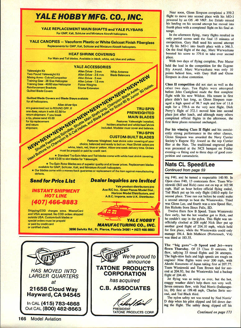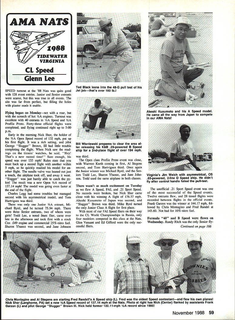 SPEED turnout 88 Nats quite good 128 event entries Junior Senior entrants scarce true events site far perfect filling holes plaster made usable Flying began Mondaynot roar screech hot 1/IA engines Turnout excellent 40 entrants Speed Profile Proto Forty-three official flights completed flying continued right up 500 pm Early morning Nick Sher holder Open Speed record 132 mph put up first flight rich setting pilot George Slugger Brown III little trouble completing flight Nick saw read ings timers watches said Hey Thats new record time Sure enough speed over 133 mph Rules state must back up record flight another within 5 mph quickly readied model another flight needle valve leaned Out just touch airplane took off away went Slugger just barely able catch py lon result new Open AA record 13714 mph model going faster end flight Charles Legg some troubles managed second asymmetrical model Tom Hartvigsen third oniy Junior entrant Mi chael Byrd turned 7594 mph three Senior entrants two girls Todd Lee noted Stunt flier caine over late afternoon took first stock Cox 049 engine commercial 25%-nitro fuel Sharon Ybanez second Jane Johnson Ted Black leans 48-G pull test Jet jobthats over 100 lb Bill Wisniewski prepares ciear area af ter releasing K&B 29-powered B Speed ship 2nd-piace fflght over 194 mph third Open class Profile Proto event close Warrren Kurth coming first Al Stegens second Tom Hartvigsen third Once again Junior winner Michael Byrd Sen iors Todd Lee Sharon Ybanez Jane John son Todd used same airplane both classes wasnt much excitement Tuesday flew Speed FM 21 Sport Speed No records broken Nick Sher came close winning flight 17657 mph Akeshi Kusumoto Japan second Slugger Brown third Mike Byrd turned oniy Junior Class flight first place FM Speed fliers way CL World Championships Russia four modelers competed class Nats Glen Vansant Ed Gifford suc cessful fliers Akeshi Kusumoto Speed model came way Japan compete AMA Nats Virginias Jim Welch asymmetrical OS 65-powered 2-line D Speed ship didnt fly after control handle failed pull-test unofficial 21 Sport Speed event successful Speed events Twelve entrants flew 28 timed flights recorded between flights official events Frank Garzon winner 14417 mph fol lowed Chris Montagino Fred Randel 14360 bad 10%-nitro fuel Formula 40 B Speed flown Wednesday Randy Ritch Senior flyContinued page 166 Chris Montagino Al Stegens starting Fred Randells Speed ship L Fred oidest Speed contestantand flew own planes Nick Sher Langhorne PA set new V2A Speed record 13714 mph Nats Photo right has Nick Center flanked assistants Frank Garzon L pilot George Slugger Brown Ill Nick held former 13211-mph VzA record since 1980 November 1988 59 AMA NATS 1988 TIDE WATER VIRGINIA CL Speed Glenn Lee YALE HOBO Y MPG CG INC YALE REPLACEMENT MAIN SHAFTS YALE FLYDARS GMP Kilt Schiutar Miniature Aircraft helicopsars YALE CANOPIES form Plastic White Gelcoat Finish Fiberglas Replacements GMP Kilt Schiuter end Miniature Aircraft helcapters HEAT SHRINK COVERING Main Ta ii blades Available black white red blue end yellow Yaleweight Kit Two Pound Yaleweight Kit Mbdng Anna- Cobra/Competitor TraIning Gear- 28 Site Helicopter TraInIng Geer-40/60 size Helicopter Reinforcement Brackets Quitted Blade Covers YALE ACCESSORIES Allen Driver 25mm Allen DrIver -2mm Allen Lirlver -15mm Flyber Weights Starter Extension Outed Blade Covers Blade Stays available ill helicopters guaranteed notto ROUND OFF does return $250 forPREWEIGHTED return shipment break4MAIN BLADES atlp please send $500 Add * TRU-SPIN CUSTOM-BUILT BLADES Features Weighted heat sd*ik color covering t tg~choiclsncedre~nkcoara $300 slot blades Yalewaight * Tru-Spin Rotor Blades supenar quality lower prIces Replacement blades available GMP Schluter Kit Minlature Aircraft helicopters * Our blades come money-beck guerentes replacement item against manufacturing defec Send PrIce List INSTANT SHIPMENT HOT LINE 407 466-8883 Shipping/COO charges extra MasterCard end VISA accepted No COD orders shipped outside USA Custom-built blades spaclel orders must prepald paid credit card certIfied check Dealer InquirIes Invited Yale product dletributors Ace R/C Inc Greet Planes Model Diet Horizon Model Distributor ABC Impute sole UK Dietributor j HOBBY MANUFACTURING CO INC 3 3896 Selvltz Rd Ft Pisros FlorIda N e 407 3 Near noon Glenn Simpson completed 3592 flight move second place MO-i powered OS 40 VRP Joe Dzialo missed landing second attempt moved fourth place completed flight final tempt afternoon flying flights resulted partial scores until final 15 minutes competition Gary Hull used second attempt fly MO-l fourth place 3465 final flight day Marc Warwashana boosted score 3796 take over second place two days flying complete Pete Mazur held lead competition Eugene Ely Award Marc Warwashana 10 points behind him Gary Hull Glenn Simpson close contention Class II competition did start well other two days Ten flights attempted before John Castiglioni made first complete flight new Wildcat tenure first place didnt last long Glenn Simpson man aged high speed 987 mph low 116 mph 3796 very next flight Dick Perrys flight 3721 moved him second place just after lunch although others completed official flights afternoon first three places remained unchanged winning Class II flight consist ently strong performance other classes Glenn Simpson awarded Navy Carrier Societys Eugene Ely Award top Carrier flier Nats traditional engraved plate presented NCS banquet Friday eveninga fitting end three days good com petition camaraderie Nats CL Speed/Lee Continued page 59 ing F40 turned respectable 14090 Open class F40 13 contestants flew Team Wis niewski Bill Rick came out top 16298 mph Half hour before official flying ended Ted Black put up flight 1600 mph second place Time ran Out before could make second attempt beat Wisniewskis Third Glenn Lee fourth new Speed flier Jim Ricketts Sioux Falls SD Twelve fliers flew B Speed Team Wisniewski flew early hot weather got Rick couldnt