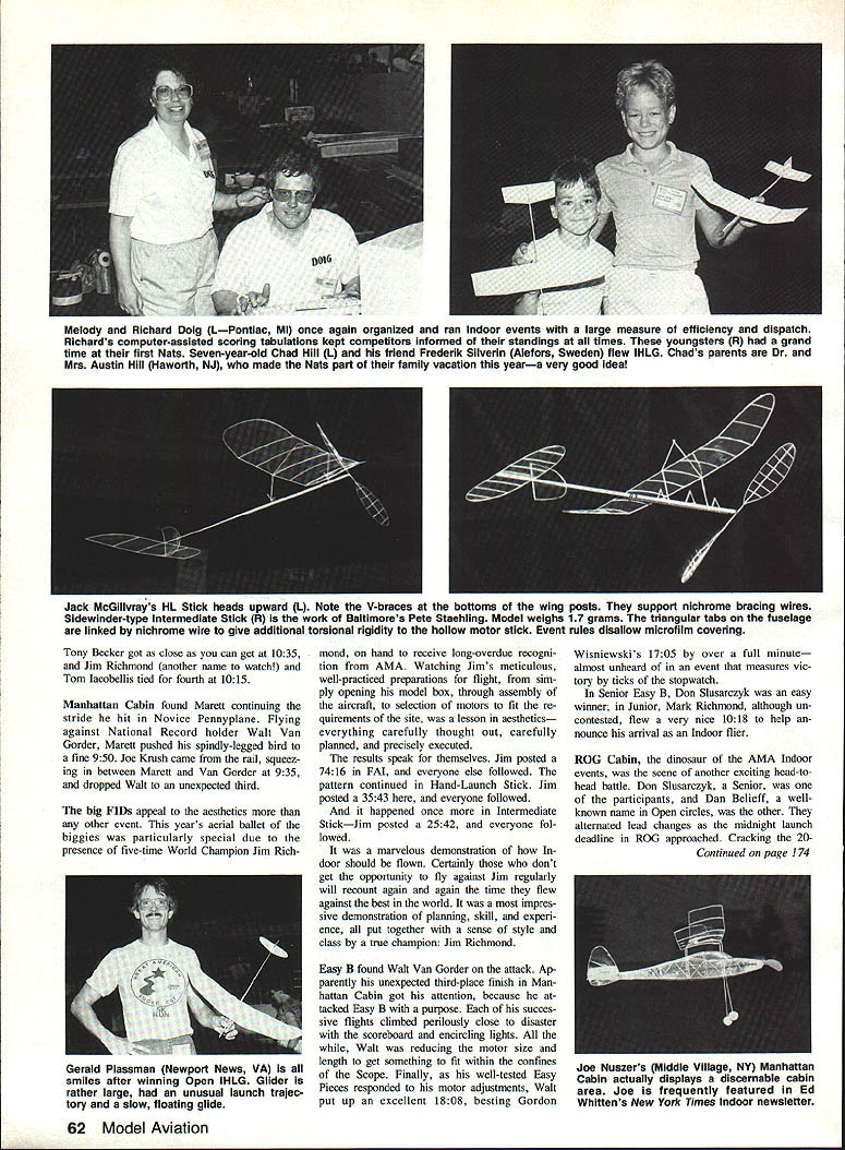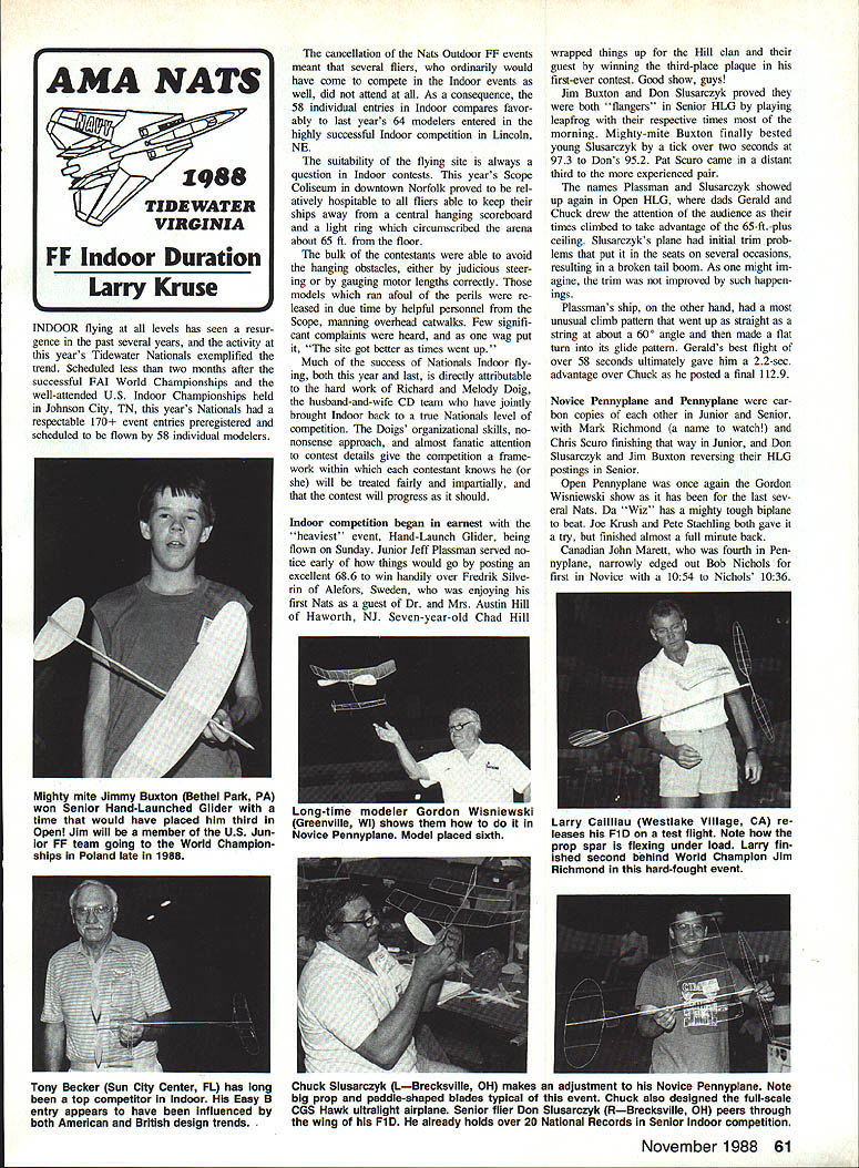 INDOOR flying levels has seen resur gence past several years activity years Tidewater Nationals exemplified trend Scheduled less two months after successful FAI World Championships well-attended US Indoor Championships held Johnson City TN years Nationals respectable 170 event entries preregistered scheduled flown 58 individual modelers cancellation Nats Outdoor FF events meant several fliers ordinarily would have come compete Indoor events well did attend As consequence 58 individual entries Indoor compares favor ably last years 64 modelers entered highly successful Indoor competition Lincoln NE suitability flying site always question Indoor contests years Scope Coliseum downtown Norfolk proved rel atively hospitable fliers able keep ships away central hanging scoreboard light ring circumscribed arena about 65 ft floor bulk contestants able avoid hanging obstacles either judicious steer ing gauging motor lengths correctly models ran afoul perils re leased due time helpful personnel Scope manning overhead catwalks Few signifi cant complaints heard wag put site got better times went up Much success Nationals Indoor fly ing both year last directly attributable hard work Richard Melody Doig husband-and-wife CD team have jointly brought Indoor back true Nationals level competition Doigs organizational skills nononsense approach almost fanatic attention contest details give competition frame work within contestant knows will treated fairly impartially contest will progress should Indoor competition began earnest heaviest event Hand-Launch Glider being flown Sunday Junior Jeff Plassman served no tice early things would go posting excellent 686 win handily over Fredrlk Silve rin Alefors Sweden enjoying first Nats guest Dr Mrs Austin Hill Haworth NJ Seven-year-old Chad Hill wrapped things up Hill clan guest winning third-place plaque first-ever contest Good show guys Jim Buxton Don Slusarezyk proved both flangers Senior HLG playing leapfrog respective times morning Mighty-mite Buxton finally bested young Slusarezyk tick over two seconds 973 Dons 952 Pat Scuro came distant third experienced palr names Plassman Slusarezyk showed up again Open HLG dads Gerald Chuck drew attention audience times climbed take advantage 65-ft-plus ceiling Slusarezyks plane initial trim prob lems put seats several occasions resulting broken tail boom As might im agine trim improved such happen ings Plassmans ship other hand unusual climb pattern went up straight string about 640 angle made flat turn its glide pattern Geralds best flight over 58 seconds ultimately gave him 22-sec advantage over Chuck posted final 1129 Novice Pennyplane Pennyplane car bon copies other Junior Senior Mark Richmond name watch Chris Scum finishing way Junior Don Slusarezyk Jim Buxton reversing HLG postings Senior Open Pennyplane once again Gordon Wisniewski show has last sev eral Nats Da Wiz has mighty tough biplane beat Joe Krush Pete Staehling both gave try finished almost full minute back Canadian John Marett fourth Pen nyplane narrowly edged out Bob Nichols first Novice 1054 Nichols 1036 Chuck Slusarczyk LBrecksville OH makes adjustment Novice Pennyplane Note big prop paddle-shaped blades typical event Chuck also designed full-scale CGS Hawk ultralight airplane Senior flier Don Slusarczyk RBrecksville OH peers through wing FID already holds over 20 National Records Senior Indoor competition November1988 61 AMA NATS 1988 TIDEWATER VIRGINIA FF Indoor Duration Larry Kruse Mighty mite Jimmy Buxton Bethel Park PA won Senior Hand-Launched Glider time would have placed him third Open Jim will member US Jun ior FF team going World Champion ships Poland late 1988 Long-lime moacier uoraon Wisniewski Greenville WI shows Novice Pennyplane Model placed sixth Larry Cailliau Westlake Village CA re leases Fl 0 test flight Note prop spar flexing under load Larry fin ished second behind World Champion Jim Richmond hard-fought event Tony Becker Sun City Center FL has long top competitor Indoor Easy B entry appears have Influenced both American British design trends Melody Richard Doig LPontlac Ml once again organized ran Indoor events large measure efficiency dispatch Richards computer-assisted scoring tabulations kept competitors informed standings times youngsters R grand time first Nats Seven-year-old Chad Hill L friend Frederik Silverin Alefors Sweden flew IHIG Chads parents Dr Mrs Austin Hill Haworth NJ made Nats part family vacation yeara very good ideal Jack McGillvrays HL Stick heads upward L Note V-braces bottoms wing posts support nlchrome bracing wires Sidewinder-type Intermediate Stick R work Baltimores Pete Staehling Model weighs 17 grams triangular tabs fuselage linked nichrome wire give additional torsional rigidity hollow motor stick Event rules disallow microfilm covering Tony Becker got close can get 1035 Jim Richmond another name watch Tom lacobellis tied fourth 1015 Manhattan Cabin found Marett continuing stride hit Novice Pennyplane Flying against National Record holder Walt Van Gorder Marett pushed spindly-legged bird fine 950 Joe Krush came rail squeez ing between Marett Van Gorder 935 dropped Walt unexpected third big FiDs appeal aesthetics other event years aerial ballet biggies particularly special due presence five-time World Champion Jim RichGerald Pisasman Newport News VA smiles after winning Open IHIG Glider rather large unusual launch trajec tory slow floating glide mond hand receive long-overdue recogni tion AMA Watching Jims meticulous well-practiced preparations flight sim ply opening model box through assembly aircraft selection motors fit re quirements site lesson aesthetics everything carefully thought out carefully planned precisely executed results speak themselves Jim posted 7416 FM everyone else followed pattern continued Hand-Launch Stick Jim posted 3543 everyone followed happened once Intermediate StickJim posted 2542 everyone fol lowed marvelous demonstration door should flown Certainiy dont get opportunity fly a