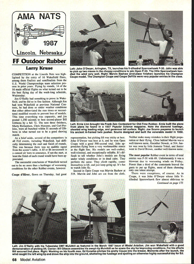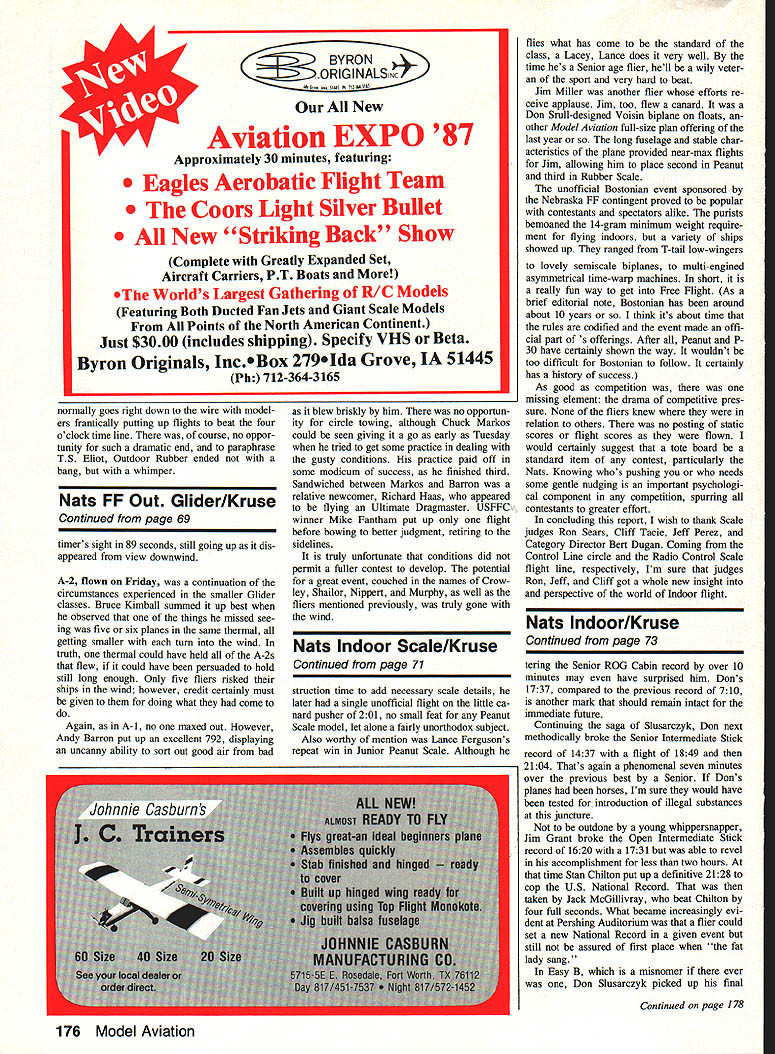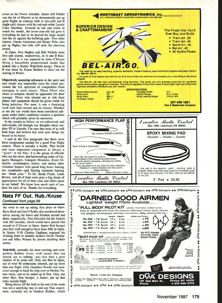 FF Outdoor Rubber Larry Kruse COMPETITION Lincoln Nats high lighted entry 16 Wakefield fliers among finalists semifinalists US World Championships team selection pro cess prior years Flying rounds 14 16 made official flights what turned out best flying day week-long schedule Wednesday Jim OReilly something prove Wake field did fine fashion Although Jim won Wakefield previous National Con tests done under weather conditions either abbreviated max times necessi tated modified rounds prevent loss models time everything copacetic jim posted 1250 seconds best second-placer Bill Gibbons full 72 next three finishers Marty Richardson Chris Matsuno Carl Per kins bunched within 51 seconds Gib bons what turned Out good shoving match As brief aside several competitors FM events including Wakefield diffi culty determining start finish rounds because no audible signal scorers table $5 $6 investment canned air horn announce start least finish round would have ap preciated successful conclusion Wakefield turned out no harbinger worsening conditions other Rubber events however Coupe dHiver flown Thursday good representation picking lift tricky best John ODwyer best won Open Coupe good 590-second total John ap proaches flying very workmanlike stance flight line models well-crafted well-trimmed exceptionally reliable Its dif ficult tell whether Johns models flying under windy conditions dead calm perform same climb rapidly center themselves lift just keep going up Its fun watch John fly Second Open Coupe Marvin Bashaw 519 Marvin John cut cloth Neither make mistakes flight prepa ration flying Close behind Marvin well-known name Guenther Nowak 514 Jun ior won little Jennette Yokel Senior went David Brown another well-known name popular Rubber event terms total entries P-30 69 Unfortunately blowout due worsening winds Friday Fewer third contestants braved gusts put up flights choosing token attempt exceptions course As Coupe John ODwyer little V dihedral Sparrowhawk flew almost oblivious Continued page 175 68 Model Aviation AMA NATS oln Nebraska Left John ODwyer Arlington TX launches V-dihedral Sparrowhawk P-30 John able pick up two maxes choppy conditions win Open P30 little Sparrowhawk han dled wind very well Right Marvin Bashaw 2nd-place finisher launches Champion Coupe model Champion Coupe Coupe DeVilie very popular entries class Left Ernie Linn brought Prank Zaic Contestant Old-Time Rubber Ernie built plane plans found 1937 Popular Science magazine Note diamond fuselage sheeted wing leading edge generous tall surface Right Joe Scurro prepares launch ancient A-framed twin pusher Scurro designed built venerable model 1938 Left Jim OReilly Tubestake OMT Mulvihill featured March 1987 issue Model Aviation Jim won Waketield good demonstration picking lift Center Bill Gibson assembles swept-tip Muivihill scans sky improving conditions efforts Bill secured 2nd place Right Working fourth max Ed Konefes pitches pretty Coupe breeze Momenta after launch wind caught left wingtip drove ship ground shattering fuselage spoiling otherwise highly successful day Ed event Power schedule Junior Jeff Pfeifer hit Electric determinedly put up good flights winning both six-cell B eight-cell classes red-and-white Lectric Coke Machine Dressed red white match model seven-year-old lad gave everything he heaved large model air against buffeting gale Two other Juniors Danny Ackerman Kenny Wile also put up flights little Jeff stole charisma award Open Don Hughes Bob Nichols first second respectively B Elec tric Third captured John ODwyer flying beautifully proportioned model looked like Sixties Wakefield design Third B taken Duane Renken close out scoring Power Objectively assessing advances sport new trends impossible since winds pre vented full spectrum competition emerging classes FFers chose compete should applauded courage elected risk planes equipment should given credit being judicious frustrating week little reward no closure Whether site would have considered ade quate under better conditions remains question will probably never answered months follow collectively individually sift through thoughts about out door FF Lincoln Im sure us will both hope believe next year things bound better said first paragraph three components needed good Free Flight contest actually fourth fourth important component always given Nats group officials run show hardworking cadre Cat egory Managers Category Directors Event Di rectors scorekeepers timers sundry other volunteer helpers spend long hours hearing complaintsand fleeting moments hearing thank yous Dr Sandy Frank Linda Brown crew goes big chunk appreciation time effort spent behalf know much does us Thanks everything Nats FF Out Rub/Kruse Continued page 68 wind end up taking first place Open Steve Bard Jim OReilly also numbered selves among brave finished second third respectively Don DeLoach led Juniors 263 seconds would have placed him second ODwyer Open Junior Rod loerger also flew well enough have fifth Open Senior P-30 Charles Gagliano regained winning form soundly trounce David Thomp son Mike Watson almost doubling scores Mulvihill normally exciting com petitive Rubber event maxes can stretch out infinity less poor shadow its usual self Only flier Open Out over 40 contestants entered put up flight Only Guenther Nowak tena cious enough hand ship over Mother Na ture twice ended up first Only other flier Ron loerger Junior put up risky second flight Being blown off field end week satis1ring way end Nats experi ence certainly Outdoor Rubber SUPERIOR DESIGN & CRAFTSMANSHIP BEL-A Finest Kits Youll Ever Buy Build Train-Air 20 Train-Air 40 Sport-Air 40 Bel-Air 40 40 Hydro-Floats need easy handling superior aerobatic modern looking sport exhibition biplane has filled Sd-AIr 60 kit parts biplane fine line kits machine cut easist building real show stopper Bel-Air 60 has fully aummetrical wing sections gives greatest potential aerobatic performance either uprIght inverted ship capable very slow 