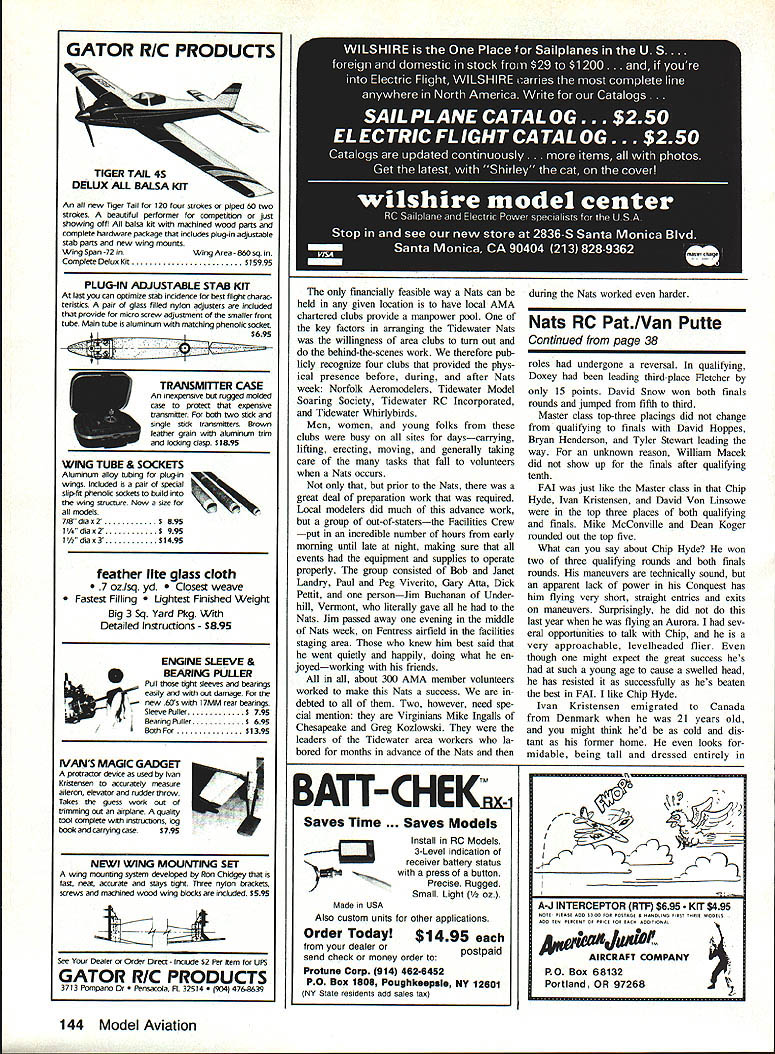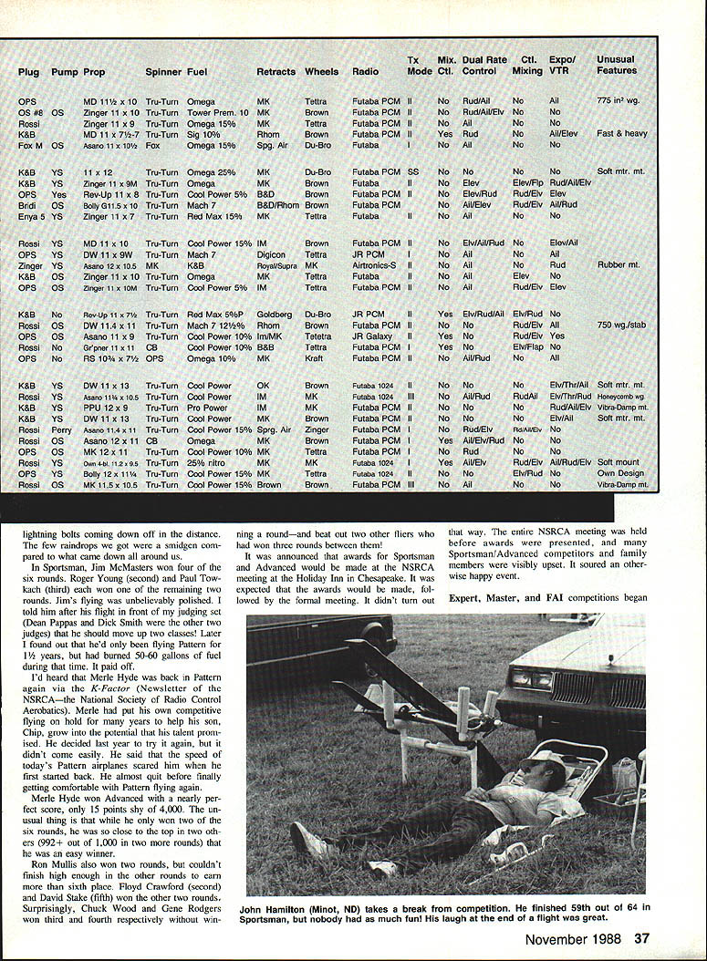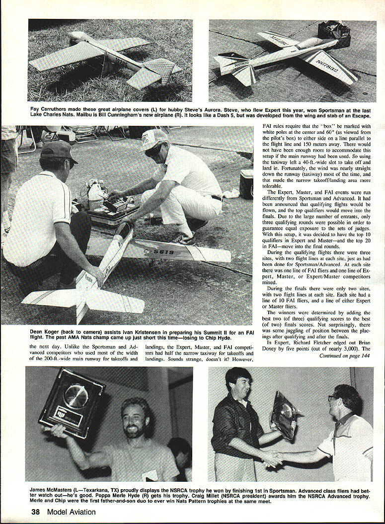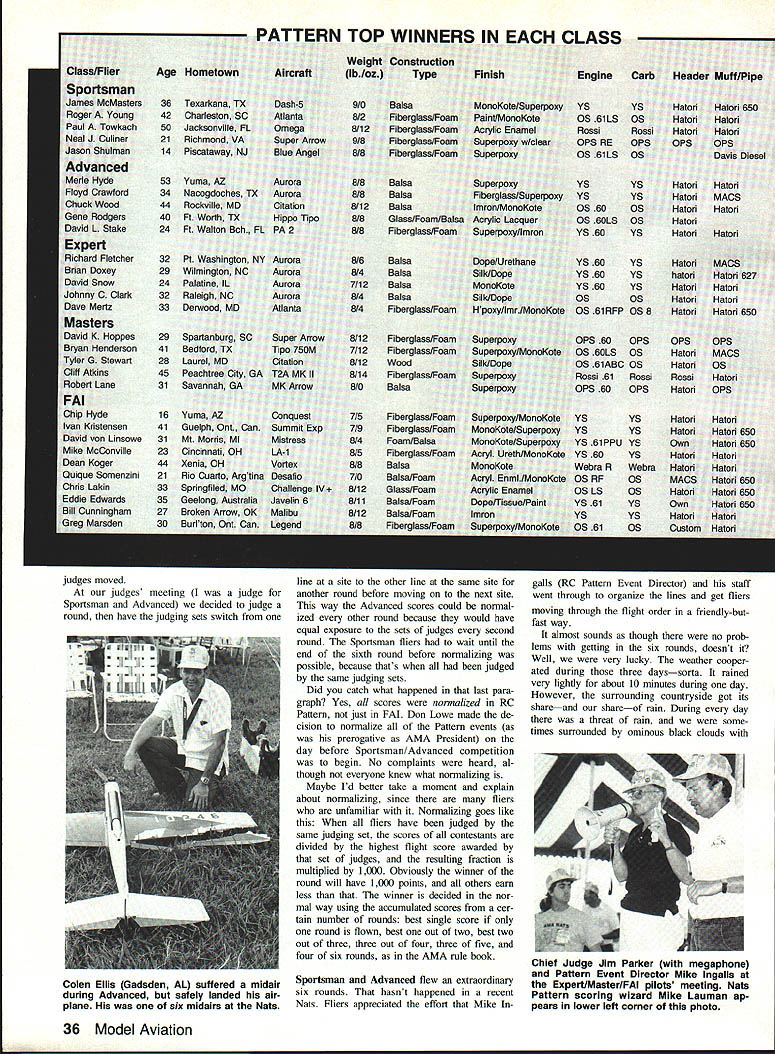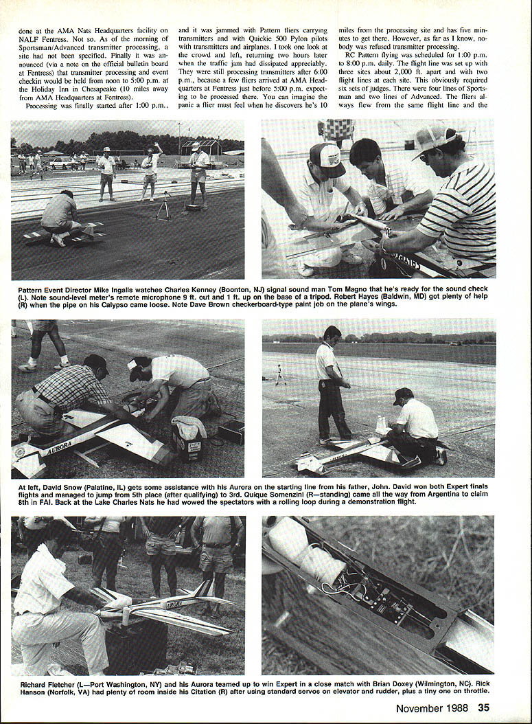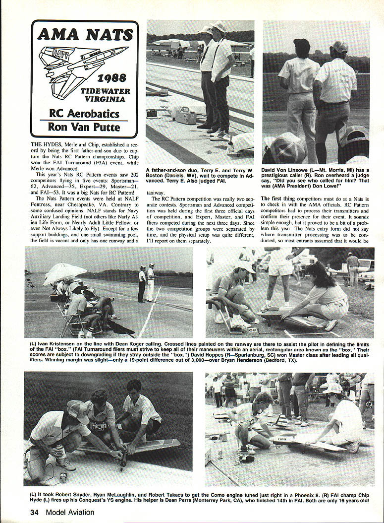 THE HYDES Merle Chip established rec ord being first father-and-son duo cap ture Mats RC Pattern championships Chip won FAI Turnaround F3A event Merle won Advanced years Mats RC Pattern events saw 202 competitors flying five events Sportsman 62 Advanced35 Expert29 Master21 FAI53 big Mats RC Pattern Mats Pattern events held NALF Fentress near Chesapeake VA Contrary some confused opinions NALF stands Navy Auxiliary Landing Field others like Al ien Life Form Nearly Adult Little Fellow Always Likely Fly Except few support buildings small swimming pool field vacant has runway taxiway RC Pattern competition really two sep arate contests Sportsman Advanced competi tion held during first three official days competition Expert Master FAI fliers competed during next three days Since two competition groups separated time physical setup quite different Ill report separately first thing competitors must Mats check AMA officials RC Pattern competitors process transmitters confirm presence event sounds simple enough proved bit prob lem year Mats entry form did say transmitter processing con ducted entrants assumed would L Ivan Kristensen line Dean Koger calling Crossed lines painted runway assist pilot defining limits PAl box FAI Turnaround fliers must strive keep maneuvers within aerial rectangular area known box scores subject downgrading stray outside box David Hoppes RSpartanburg SC won Master class after leading qual ifiers Winning margin slightonly 19-point difference out 3000over Bryan Henderson Bedford TX L It took Robert Snyder Ryan McLaughlin Robert Takacs get Como engine tuned just right Phoenix 8 R FAI champ Chip Hyde L fires up Conquests YS engine helper Dean Perra Monterrey Park CA finished 14th FAI Both 16 years old 34 Model Aviation AMA NATS TIDEWATER RC Aerobatics Ron Van Putte father-and-son duo Terry E Terry WDavid Von Linsowe 1Mt Morris MI has Boston Daniels WV wait compete Adprestigious caller R Ron overheard judge vanced Terry E Also judged FAIsay Did see called him AMA President Don Lowe done AMA Nats Headquarters facility NALF Fentress As morning Sportsman/Advanced transmitter processing site specified Finally nounced via note official bulletin board Fentress transmitter processing event checkin would held noon 500 pm Holiday Inn Chesapeake 10 miles away AMA Headquarters Fentress Processing finally started after 100 pm jammed Pattern tliers carrying transmitters Quickie 500 Pylon pilots transmitters airplanes took look crowd left returning two hours later traffic jam dissipated appreciably still processing transmitters after 600 pm because few fliers arrived AMA Head quarters Fentress just before 500 pm expect ing processed can imagine panic flier must feel discovers hes 10 miles processing site has five min utes get However far know no body refused transmitter processing RC Pattern flying scheduled 100 pm 800 pm daily flight line set up three sites about 2000 ft apart two flight lines site obviously required six sets judges four lines Sports man two lines Advanced fliers al ways flew same flight line Pattern Event Director Mike Ingalls watches Charles Kenney Boonton NJ signal sound man Tom Magno hes ready sound check 1 Note sound-level meters remote microphone 9 ft out 1 ft up base tripod Robert Hayes Baldwin MD got plenty help R when pipe Calypso came loose Note Dave Brown checkerboard-type paint job planes wings left David Snow Palatine IL gets some assistance Aurora starting line father John David won both Expert finals flights managed jump 5th place after qualifying 3rd Ouique Somenzini Rstanding came way Argentina claim 8th FAI Back Lake Charles Nats wowed spectators rolling loop during demonstration flight Richard Fletcher LPort Washington NY Aurora teamed up win Expert close match Brian Doxey Wilmington NC Rick Hanson Norfolk VA plenty room inside Citation R after using standard servos elevator rudder plus tiny throttle November 1988 35 judges moved judges meeting judge Sportsman Advanced decided judge round have judging sets switch line site other line same site another round before moving next site way Advanced scores could normal ized other round because would have equal exposure sets judges second round Sportsman fliers wait until end sixth round before normalizing possible because thats judged same judging sets Did catch what happened last para graph Yes scores normalized RC Pattern just FAI Don Lowe made de cision normalize Pattern events prerogative AMA President day before Sportsman/Advanced competition begin No complaints heard al though everyone knew what normalizing Maybe Id better take moment explain about normalizing since fliers unfamiliar Normalizing goes like fliers have judged same judging set scores contestants divided highest flight score awarded set judges resulting fraction multiplied 1000 Obviously winner round will have 1000 points others earn less winner decided nor mal way using accumulated scores cer tain number rounds best single score round flown best Out two best two out three three out four three five four six rounds AMA rule book Sportsman Advanced flew extraordinary six rounds hasnt happened recent Nats Fliers appreciated effort Mike Ingalls RC Pattern Evens Director staff went through organize lines get fliers moving through flight order friendly-busfast way almost sounds though no prob lems getting six rounds doesnt Well very lucky weather cooper ated during three dayssorta rained very lightly about 10 minutes during day However surrounding countryside got its shareand shareof rain During day threat rain some times surrounded ominous black clouds 36 Model Aviation Colen Ellis Gadsden AL suffered s midair during Advanced safely landed air plane six midairs Nats Chief Judge Jim Parker megaphone Pattern Event Director Mike Ingalls Expert/Master/FAI pilots meeting Nats Pattern scoring wizard Mike Lauman ap pears lower left corner photo lightning bolts coming down off distance few raindrops got smidgen com pared what came down around us Sport
