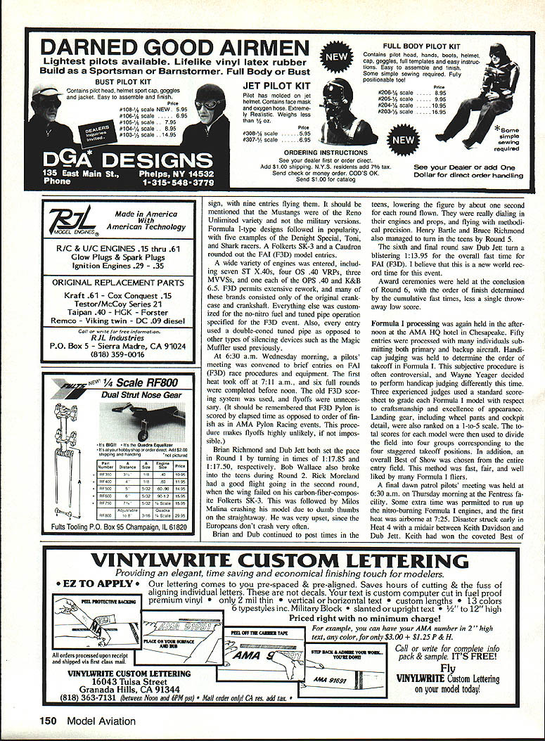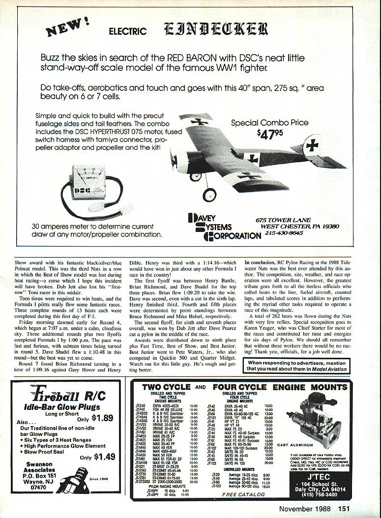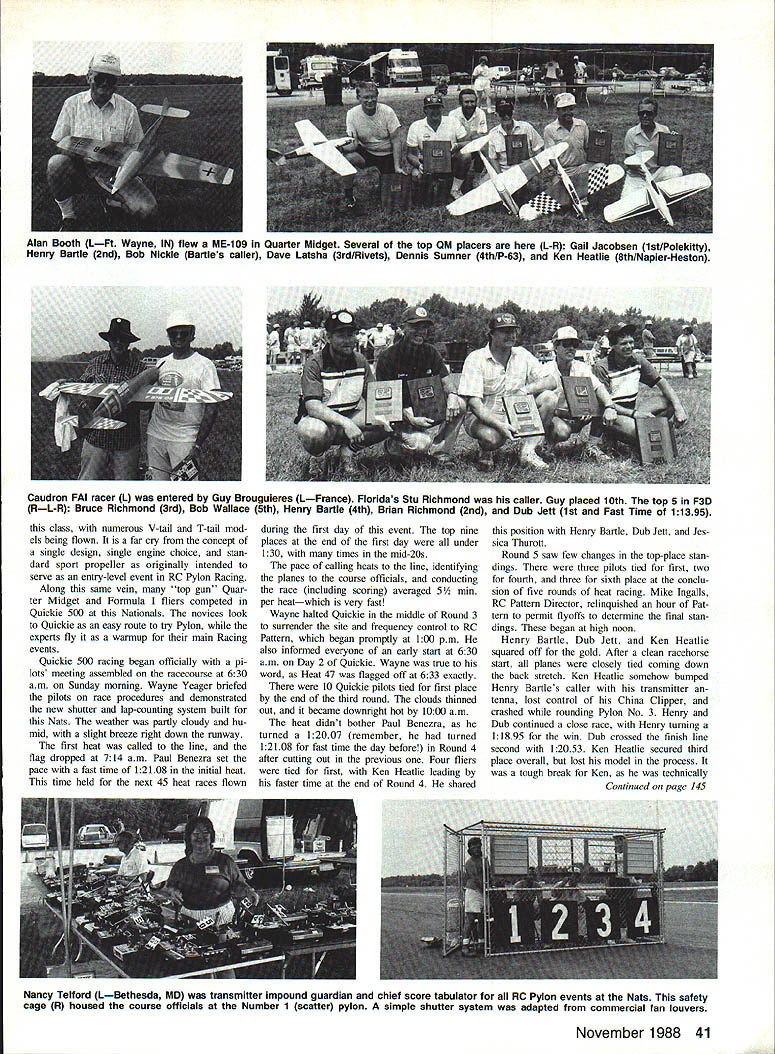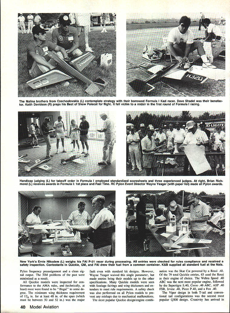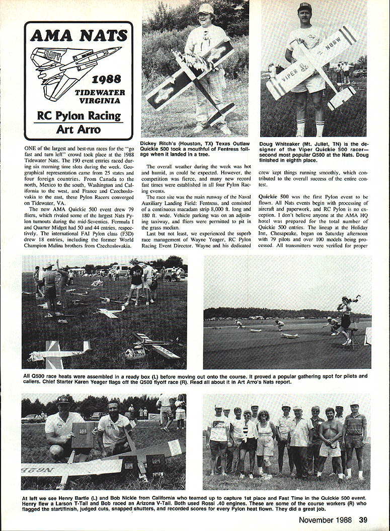 r ONE largest best-run races go fast turn left crowd took place 1988 Tidewater Nats 190 event entries raced dur ing six morning time slots during week Geo graphical representation came 25 states four foreign countries Canada north Mexico south Washington Cal ifornia west France Czechoslo vakia east Pylon Racers converged Tidewater VA new AMA Quickie 500 event drew 79 fliers rivaled some largest Nats Py lon turnouts during mid-Seventies Formula Quarter Midget 50 44 entries respec tively international FAI Pylon class F3D drew 18 entries including former World Champion Malina brothers Czechoslovakia overall weather during week hot humid could expected However competition fierce new record fast times established four Pylon Rac ing events race site main runway Naval Auxiliary Landing Field Fentress consisted continuous macadam strip 8000 ft long 180 ft wide Vehicle parking adjoin ing taxiway fliers permitted pit grass median Last least experienced superb race management Wayne Yeager RC Pylon Racing Event Director Wayne dedicated crew kept things running smoothly con tributed overall success entire con test Quickie 500 first Pylon event flown Nats events begin processing aircraft paperwork RC Pylon no ex ception dont believe anyone AMA HQ hotel prepared total number Quickie 500 entries lineup Holiday Inn Chesapeake began Saturday afternoon 79 pilots over 100 models being pro cessed transmitters verified proper November 1988 39 AMA NATS TIDEWATER RC Pylon Racing Art Arro Dickey Ritchs Houston TX Texas OutlawDoug Whiteaker Mt Juliet TN de Quickie 500 took mouthful Fentress foil-signer Viper Quickie 500 racer age landed treesecond popular Q500 Nats Doug finished eighth place 0500 race heats assembled ready box L before moving out onto course proved popular gathering spot pilots callers Chief Starter Karen Yeager flags off 0500 flyoff race R Read about Art Arros Nats report left see Henry Bartie L Bob Nickie California teamed up capture 1st place Fast Time Quickie 500 event Henry flew Larson T-Taii Bob raced Arizona V-Tail Both used Rossi 40 engines some course workers R flagged startlfinish judged cuts snapped shutters recorded scores Pylon heat flown did great job Malina brothers Czechoslovakia L contemplate strategy borrowed Formula Kazi racer Dave Shadel benefac tor Keith Davidson R preps Best Show Polecat flight fell victim midair first round Formula racing Handicap judging 1 takeoff order Formula employed standardized scoresheets three experienced judges right Brian Rich mond L receives awards Formula 11st place Fast Time RC Pylon Event Director Wayne Yeager paper list made Pylon awards New Yorks Ernie Nikodem L weighs FAI P-51 racer during processing entries checked rules compliance received safety inspection Contestants Ouickie GM FAI drew fuel common container K&B supplied standard fuel Nats Pylon frequency preassigoment clean sig nal output 31M problems past minimized result Quickie models inspected con formance AMA rules technically least found illegal some de gree minimum wing thickness requirement V/16 least 48 span must lie between 50 52 major fault standard kit designs However Wayne Yeager waived single parameter made entries bring models up other specifications Quickie models seen fuselage fairings wing thickeners ex tenders meet rule requirements safety check also performed Pylon models pre vent mishaps due mechanical malfunctions popular Quickie designlengine combi nation Skat Cat powered Rossi 40 79 total Quickie entries 63 used Rossi engine choice Webra Speed 40 ABC next popular engine followed Supertigre S40 Como 40 ABC ASP 40 FSR Irvine 40 Picco P40 Fox 40 Viper design both T-tail conven tional tail configurations second popular Q500 design Creativity has arrived 40 Model Aviation class numerous V-tail T-tail mod els being flown far cry concept single design single engine choice stan dard sport propeller originally intended serve entry-level event RC Pylon Racing Along same vein top gun Quar ter Midget Formula fliers competed Quickie 500 Nationals novices look Quickie easy route try Pylon experts fly warmup main Racing events Quickie 500 racing began officially pi lots meeting assembled racecourse 630 am Sunday morning Wayne Yeager briefed pilots race procedures demonstrated new shutter lap-counting system built Nats weather partly cloudy hu mid slight breeze right down runway first heat called line flag dropped 714 am Paul Benezra set pace fast time 12108 initial heat time held next 45 heat races flown during first day event top nine places end first day under 130 times mid-20s pace calling heats line identifying planes course officials conducting race including scoring averaged 5 mm per heatwhich very fast Wayne halted Quickie middle Round 3 surrender site frequency control RC Pattern began promptly 100 pm also informed everyone early start 630 am Day 2 Quickie Wayne true word Heat 47 flagged off 633 exactly 10 Quickie pilots tied first place end third round clouds thinned out became downright hot 1000 am heat didnt bother Paul Benezra turned 12007 remember turned 12 108 fast time day before Round 4 after cutting Out previous Four fliers tied first Ken Heatlie leading faster time end Round 4 shared position Henry Bartle Dub Jett Jes sica Thurott Round 5 saw few changes top-place stan dings three pilots tied first two fourth three sixth place conclu sion five rounds heat racing Mike Ingalls RC Pattern Director relinquished hour Pat tern permit flyoffs determine final stan dings began high noon Henry Bartle Dub Jett Ken Heatlie squared off gold After clean racehorse start planes closely tied coming down back stretch Ken Heatlie somehow bumped Henry Bartles caller transmitter tenna lost control China Clipper crashed rounding Pylon No 3 Henry Dub continued close race Henry turning 11895 win Dub crossed finish line second 12053 Ken Heatlie secured third place overall lost model process tough break Ken technically Continued page 145 November 1988 41 Alan Booth LFt Wayne IN flew M