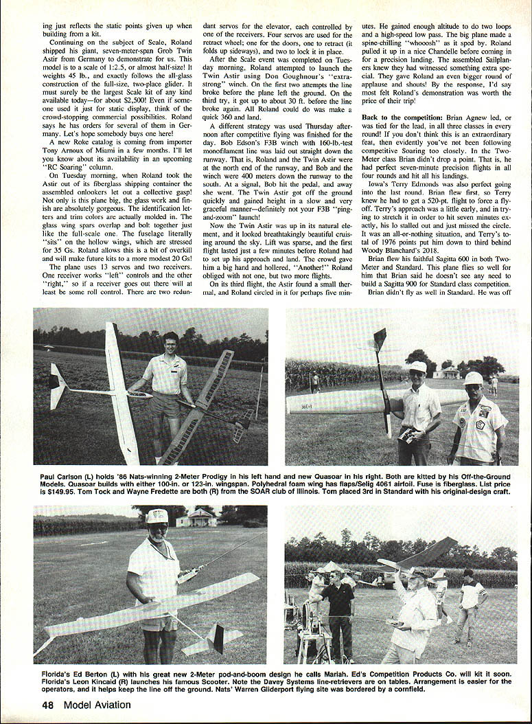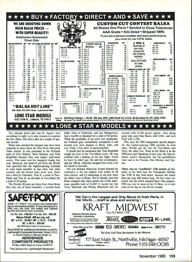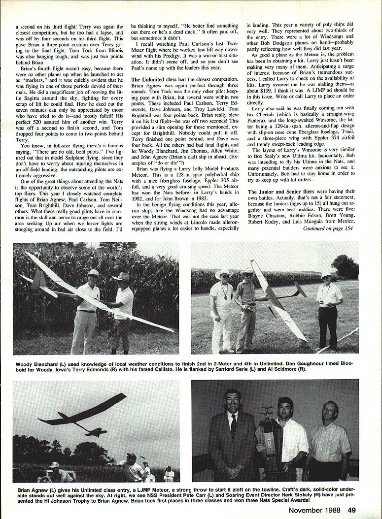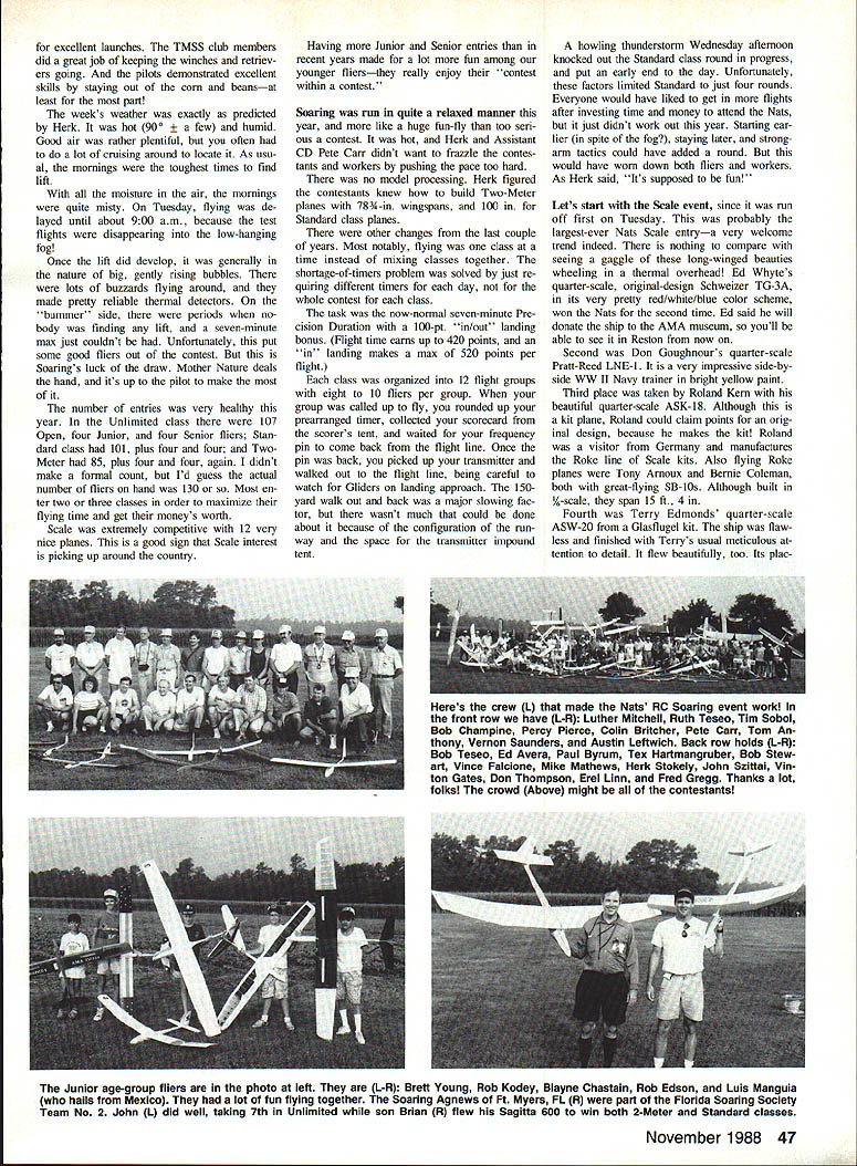 NATS SOARING 1988 gives us lots talk about big story has Brian Agnew Brian won three classes plus three special awards clean sweep unprecedented Nats Soaring history looking back over past 13 years first Mats Soaring event Lake Charles 1975 no pilot bat ever won two classes let alone three taking class Brian automatically won Hi Johnson award highest score class Lee Renaud award high est combined score three classes Dan Pruss Team award nip tuck Team Oregon guys Brian seamed father John Lee Montgomery win too Six out six case havent heard Brian before recent Florida State grad Fort Myers won Mats Two-Meter class Lincoln last year placed second Lake Charles year before 1978 Mats Lake Charles Brian won Junior Standard class completed LSF Level V December So can see Brian no newcomer competitive Soaring possesses skills will make him great flier years come Well get back Brians tremendous achieve ment little laterbut first lets have general rundown what transpired Virginia No Soaring event possibili ties 1988 Mats site selected AMA Soaring Free Flight last fall large farm about 10 miles south Fentress Na val Station main Mats flying site price commodities going up because drought farmer decided plant soybeans field scratched Plan AMA unable obtain other sites Free Flight events except Scale door cancelled altogether unprec edented Mats history About two weeks before scheduled start 88 Mats Soaring Event Director Herk Stokely recounting di lemma clubmates Tidewater full size Soaring Society magnanimously fered close Garner gliderpors week model Sailplaners could use field Herk hosting Tidewater Model Soaring Society TMSS club knew single 150-ftwide grass strip wasnt ideal Soaring field Matsbut certainly better nothing gliderport well out country near Suf folk 34 road miles west AMA Mats HQ Chesapeake Holiday Inn TMSS went ahead planning gliderport printed new maps arranged food service port-a-potties other de tails Less week before Mats begin field industrial park near Chesapeake Holiday Inn identified possible Soaring site Although closer other Mats action several problems surface hard rough 17 miles RC Helicop ter site too small full-length winch lines finally important right next busy six-lane 1-64 Sure shooting flown Gliders would have crashed Interstate can make up own head lines next days newspapers So de cided stay Gamer fliers expressed doubts about gliderport because narrow width runway right west side entire length runway field tall corn left beanfield four winches put fairly tightly together four landing circles cut 46 ft diameter fit diagonally across runway behind winches things worked Out quite well much better expected light winds pretty much straight south right down runway four days runway plenty long enough stretch winch lines out full 300 meters first time several years made Two fine Scale Sailpianes L Pennsylvanias Don Goughnour Pratt-Reed LNE-1 unusual subject prototype owned Vintage Sailplane Association Model placed second right Michigans Cal Postuma 4-meter Discus Graupner kit Scale L Bernie Coleman 1 Roland Kern Rolands quarter-scale ASK-la placed 3rd right Roland Kern manufac turer Germanys famed Roke Sailplane kits dwarfed 7-meter Grob Twin Astir Giants demonstration flights highlighted week 46 Model Aviation AMA NATS TIDEWATER RC Soaring Byron Blakeslee excellent launches TMSS club members did great job keeping winches retriev ers going pilots demonstrated excellent skills staying out corn beansat least part weeks weather exactly predicted Herk hot %O humid Good air rather plentiful often lot cruising around locate As usu al mornings toughest times find lift moisture air mornings quite misty Tuesday flying de layed until about 900 am because test flights disappearing low-hanging fog Once lift did develop generally nature big gently rising bubbles lots buzzards flying around made pretty reliable thermal detectors bummer side periods no body finding lift seven-minute max just couldnt Unfortunately put some good fliers Out contest Soarings luck draw Mother Nature deals hand its up pilot make number entries very healthy year Unlimited class 107 Open four Junior four Senior fliers Stan dard class 101 plus four four TwoMeter 85 plus four four again didnt make formal count Id guess actual number fliers hand 130 Most en ter two three classes order maximize flying time get moneys worth Scale extremely competitive 12 very nice planes good sign Scale interest picking up around country Having Junior Senior entries recent years made lot fun among younger fliersthey really enjoy contest within contest Soaring run quite relaxed manner year like huge fun-fly too sen ous contest hot Herk Assistant CD Pete Carr didnt want frazzle contes tants workers pushing pace too hard no model processing Herk figured contestants knew build Two-Meter planes 78Y4-in wingspans 100 Standard class planes other changes last couple years Most notably flying class time instead mixing classes together shortage-of-timers problem solved just re quiring different timers day whole contest class task now-normal seven-minute Pre cision Duration 100-pt in/out landing bonus Flight time earns up 420 points landing makes max 520 points per flight class organized 12 flight groups eight 10 fliers per group group called up fly rounded up prearranged timer collected scorecard scorers tent waited frequency pin come back flight line Once pin back picked up transmitter walked out flight line being careful watch Gliders landing approach 150yard walk out back major slowing fac tor wasnt much could done about because configuration run way space transmitter impound tent howling thunderstorm Wednesday afternoon knocked out Standard class round progress put early end day Unfortunately factors limited Standard just four rounds Everyone would have liked get flights after investing time money attend Nats just didnt work out year Starting ear lier spite fog staying later strongarm tactics could have added round would have worn dow