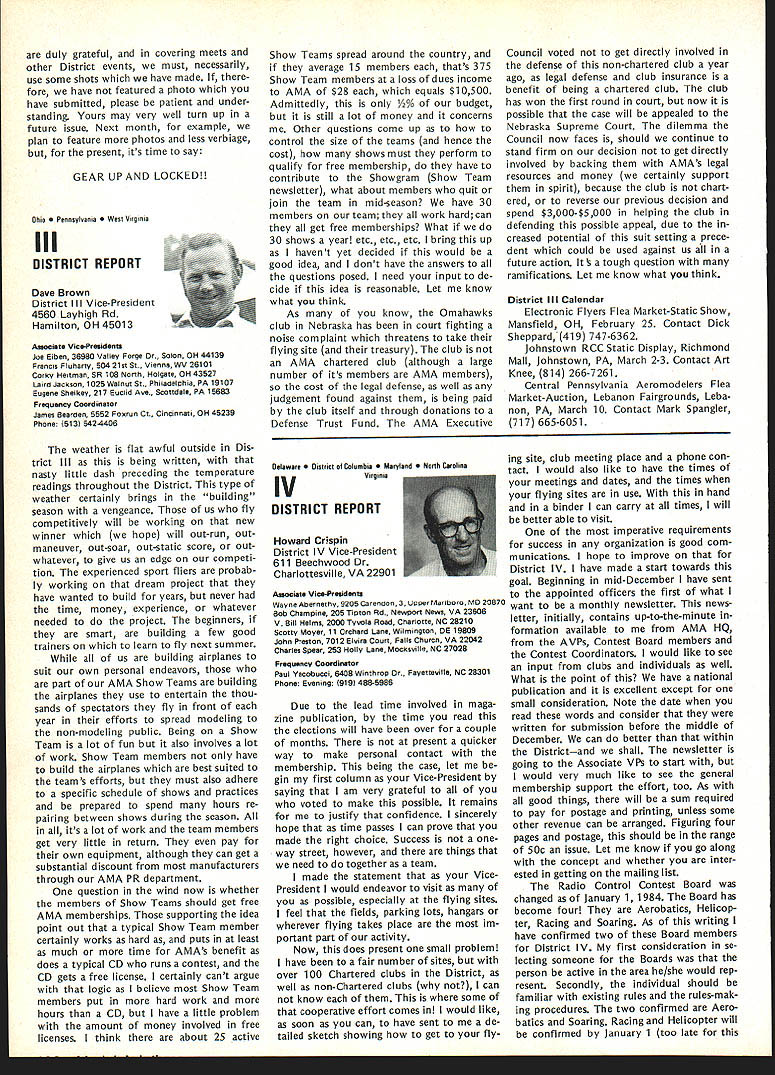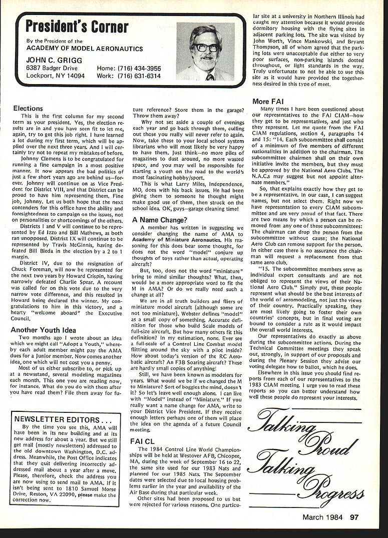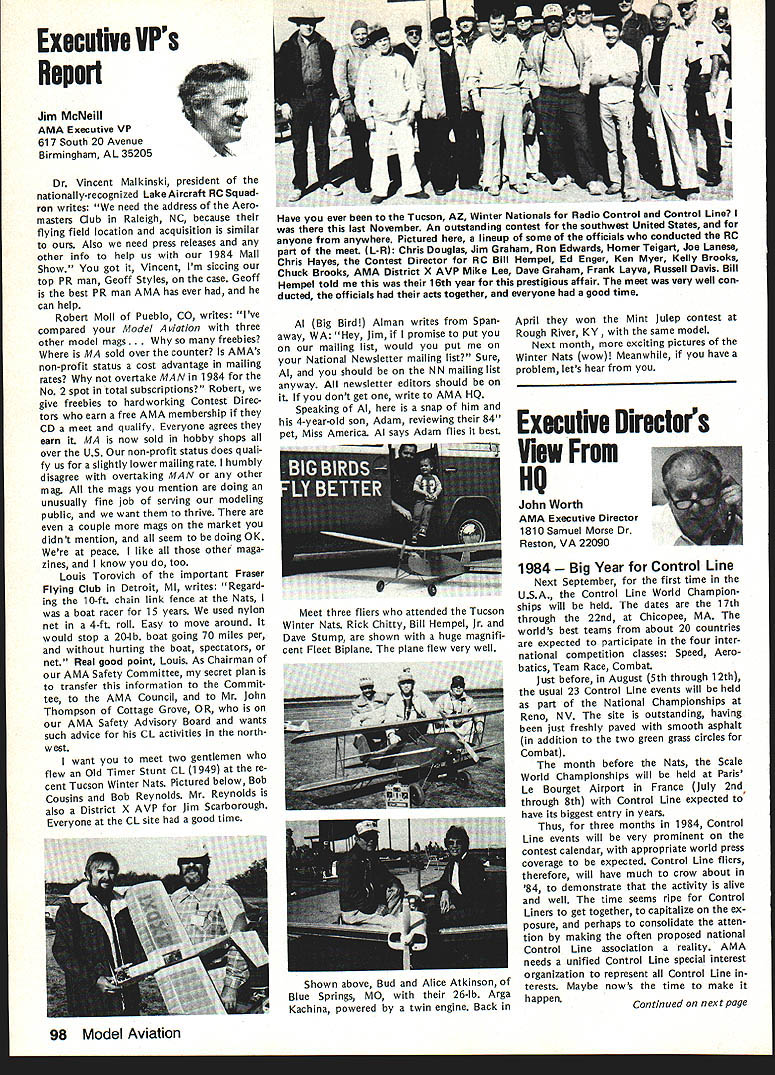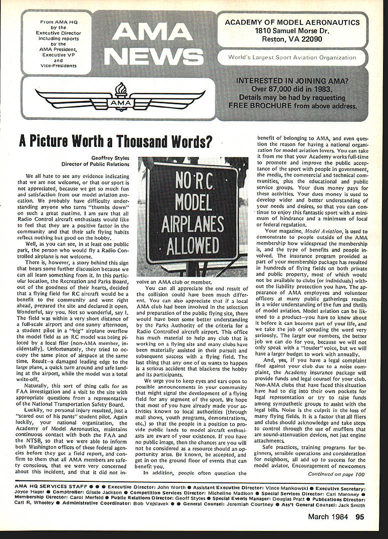 Geoffrey Styles Director Public Relations hate see evidence indicating welcome sport appreciated because get much fun satisfaction model aviation avo cation probably have difficulty under standing anyone turns thumbs down such great pastime am sure Radio Control aircraft enthusiasts would like feel positive factor community safe flying habits reflect nothing good hobby Well can see least public park person would fly Radio Con trolled airplane welcome however story behind sign bears some further discussion because can learn something partic ular location Recreation Parks Board out goodness hearts decided flying field RC aircraft would benefit community went right ahead prepared site declared open Wonderful say wonderful say field within very short distance full-scale airport sunny afternoon student pilot big airplane overflew model field RC model being pi loted local flier non-AMA member cidentally Unfortunately tried oc cupy same piece airspace same time Resulta damaged leading edge large plane quick turn around safe land ing airport model total write-off Naturally sort thing calls FAA investigation visit site appropriate questions representative National Transportation Safety Board Luckily no personal injury resulted just scared out pants student pilot Again luckily national organization Academy Model Aeronautics maintains continuous contact both FAA NTSB able inform both Washington offices federal agen cies before got field report con firm AMA members safe ty conscious very concerned about incident did involve AMA club member can appreciate end result collision could have much differ ent can also appreciate local AMA club involved selection preparation public flying site would have some better understanding Parks Authority criteria Radio Controlled aircraft airport office has much material help club working flying site clubs have materially assisted pursuit subsequent success flying field last thing us wants happen serious accident blackens hobby its participants urge keep eyes ears open possible announcements community might signal development flying field segment sport hope have already made ac tivities known local authorities through mall shows youth programs demonstrations etc people position pro vide public lands model aircraft enthusi asts aware existence have no public image chances will considered resource should op portunity arise known accepted get ground floor events can benefit addition people often question benefit belonging AMA ques tion reason having national organi zation model aviation lovers can take Academy worksfull-time promote improve public accep tance sport people government media commercial technical com munities plus educational public service groups dues money pays activities dues money used develop wider better understanding needs desires can continue enjoy fantastic sport mini mum hindrance minimum local federal regulation magazine Model Aviation used demonstrate people outside AMA membership widespread membership type benefits people volved insurance program provided part membership package has resulted hundreds flying fields both private public property would available clubs individuals out liability protection have ap pearance AMA employees volunteer officers public gatherings results wider understanding fun thrills model aviation Model aviation can lik ened productyou have know about before can become part life take job spreading word very seriously larger numbers better job can because will speak louder voice will have larger budget work annually yes have legal complaint filed against club due noise com plaint Academy insurance package will provide funds legal counsel club Non-AMA clubs have faced situation have dig own pockets legal representation try raise funds among sympathetic groups assist legal bills Noise culprit loss flying fields factor fliers clubs should acknowledge take steps control through use mufflers sound-attenuation devices just engine attachments Safe practices training programs ginners sensible operations consideration neighbors add up success model aviator Encouragement newcomers Continued page 100 March 1984 95 AMA HQ Executive Director Including reports bY AMA President Executive VP Vice-Presidents ACADEMY OF MODEL AERONAUTICS 1810 Samuel Morse Dr Reston VA 22090 Picture Worth Thousand Words AMA l-IQ SERVICES STAFF S 0 0 Executive Director John Worth 0 Assistant Executive Director Vince Mankowski S Executive Secretary Joyce Hager S Comptroller Gisele Jackson 0 Competition Services Director Micheline Madison 0 Special Services Director Carl Maroney S Membership Director Carol Merfeld S Public Relations Director Geoff Styles 0 Special Events Manager Douglas Pratt 0 Publications Director Carl R Wheeley S Administrative Coordinator Bob Voislavek S S General Counsel Jeremiah Courtney 0 Asst General Counsel Jack Smith Continuation ot Nov 5 83 Executive Council Meeting Synopsis Following continuation synop sis minutes Executive Council meeting held November 5 1983 AMA HQ Reston VA first half synopsis please see last months issue D 1984 J%Jats Budget Allocation After observing next Nats likely draw fewer participants 83 ap proved allocate $20000 Nats budget past passed voting yes ex cepting District Ill EVP 16 FAI CL World Championships Budget Executive Director reported Chicago would considered alternate site 1984 CL World Championships June due housing problems time year Chicopee presented budget estimate based Westover WC site noted modifications Chicago possibility unanimously approved accept preliminary budget estimates 1984 CL World Championships 171983-84 Insurance Authorization Upon request Worth noted con tract did authorize commitments $50000 Council approval approved unanimously Council ratify Executive Directors action sign ing 1983-84 membership liability insur ance contract AMA 18CIAM Meeting US Executive Director presented estimation what would cost fund annual international FAI meeting United States con cluded monetary i