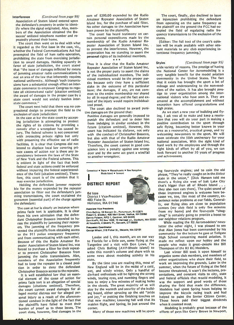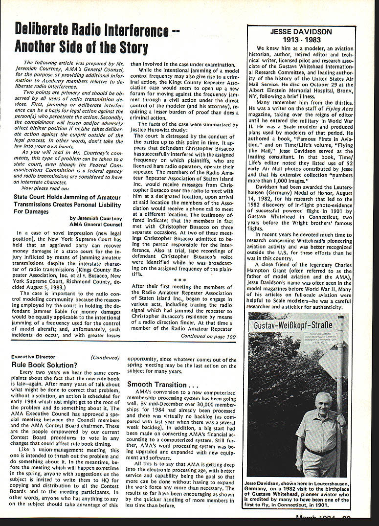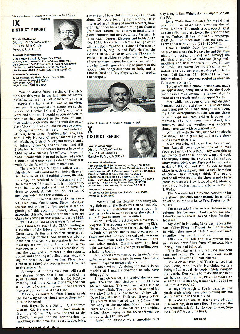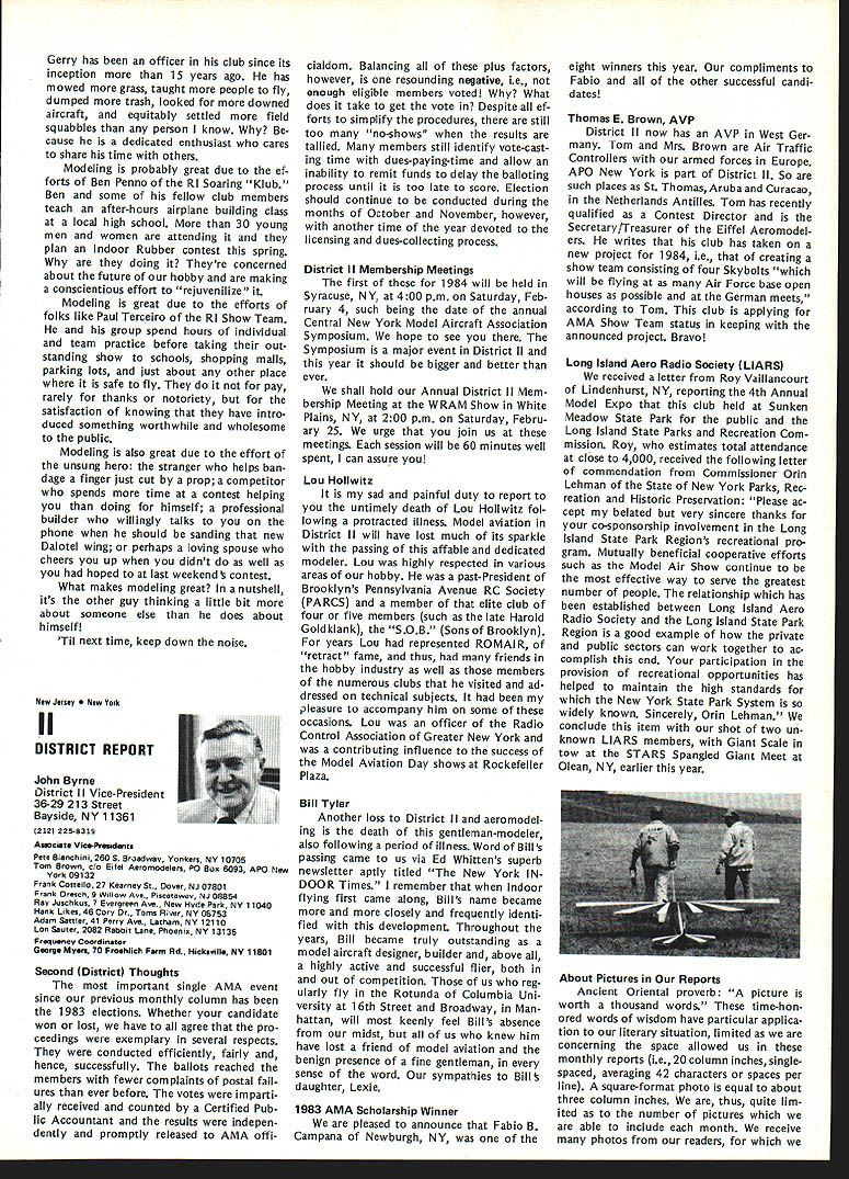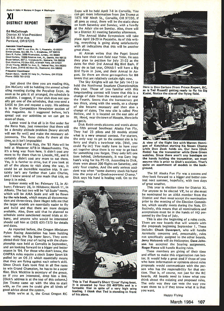Geoffrey Styles Director Public Relations hate see evidence indicating welcome sport appreciated because get much fun satisfaction model aviation avo cation probably have difficulty under standing anyone turns thumbs down such great pastime am sure Radio Control aircraft enthusiasts would like feel positive factor community safe flying habits reflect nothing good hobby Well can see least public park person would fly Radio Con trolled airplane welcome however story behind sign bears some further discussion because can learn something partic ular location Recreation Parks Board out goodness hearts decided flying field RC aircraft would benefit community went right ahead prepared site declared open Wonderful say wonderful say field within very short distance full-scale airport sunny afternoon student pilot big airplane overflew model field RC model being pi loted local flier non-AMA member cidentally Unfortunately tried oc cupy same piece airspace same time Resulta damaged leading edge large plane quick turn around safe land ing airport model total write-off Naturally sort thing calls FAA investigation visit site appropriate questions representative National Transportation Safety Board Luckily no personal injury resulted just scared out pants student pilot Again luckily national organization Academy Model Aeronautics maintains continuous contact both FAA NTSB able inform both Washington offices federal agen cies before got field report con firm AMA members safe ty conscious very concerned about incident did involve AMA club member can appreciate end result collision could have much differ ent can also appreciate local AMA club involved selection preparation public flying site would have some better understanding Parks Authority criteria Radio Controlled aircraft airport office has much material help club working flying site clubs have materially assisted pursuit subsequent success flying field last thing us wants happen serious accident blackens hobby its participants urge keep eyes ears open possible announcements community might signal development flying field segment sport hope have already made ac tivities known local authorities through mall shows youth programs demonstrations etc people position pro vide public lands model aircraft enthusi asts aware existence have no public image chances will considered resource should op portunity arise known accepted get ground floor events can benefit addition people often question benefit belonging AMA ques tion reason having national organi zation model aviation lovers can take Academy worksfull-time promote improve public accep tance sport people government media commercial technical com munities plus educational public service groups dues money pays activities dues money used develop wider better understanding needs desires can continue enjoy fantastic sport mini mum hindrance minimum local federal regulation magazine Model Aviation used demonstrate people outside AMA membership widespread membership type benefits people volved insurance program provided part membership package has resulted hundreds flying fields both private public property would available clubs individuals out liability protection have ap pearance AMA employees volunteer officers public gatherings results wider understanding fun thrills model aviation Model aviation can lik ened productyou have know about before can become part life take job spreading word very seriously larger numbers better job can because will speak louder voice will have larger budget work annually yes have legal complaint filed against club due noise com plaint Academy insurance package will provide funds legal counsel club Non-AMA clubs have faced situation have dig own pockets legal representation try raise funds among sympathetic groups assist legal bills Noise culprit loss flying fields factor fliers clubs should acknowledge take steps control through use mufflers sound-attenuation devices just engine attachments Safe practices training programs ginners sensible operations consideration neighbors add up success model aviator Encouragement newcomers Continued page 100 March 1984 95 AMA HQ Executive Director Including reports bY AMA President Executive VP Vice-Presidents ACADEMY OF MODEL AERONAUTICS 1810 Samuel Morse Dr Reston VA 22090 Picture Worth Thousand Words AMA l-IQ SERVICES STAFF S 0 0 Executive Director John Worth 0 Assistant Executive Director Vince Mankowski S Executive Secretary Joyce Hager S Comptroller Gisele Jackson 0 Competition Services Director Micheline Madison 0 Special Services Director Carl Maroney S Membership Director Carol Merfeld S Public Relations Director Geoff Styles 0 Special Events Manager Douglas Pratt 0 Publications Director Carl R Wheeley S Administrative Coordinator Bob Voislavek S S General Counsel Jeremiah Courtney 0 Asst General Counsel Jack Smith Continuation ot Nov 5 83 Executive Council Meeting Synopsis Following continuation synop sis minutes Executive Council meeting held November 5 1983 AMA HQ Reston VA first half synopsis please see last months issue D 1984 J%Jats Budget Allocation After observing next Nats likely draw fewer participants 83 ap proved allocate $20000 Nats budget past passed voting yes ex cepting District Ill EVP 16 FAI CL World Championships Budget Executive Director reported Chicago would considered alternate site 1984 CL World Championships June due housing problems time year Chicopee presented budget estimate based Westover WC site noted modifications Chicago possibility unanimously approved accept preliminary budget estimates 1984 CL World Championships 171983-84 Insurance Authorization Upon request Worth noted con tract did authorize commitments $50000 Council approval approved unanimously Council ratify Executive Directors action sign ing 1983-84 membership liability insur ance contract AMA 18CIAM Meeting US Executive Director presented estimation what would cost fund annual international FAI meeting United States con cluded monetary i