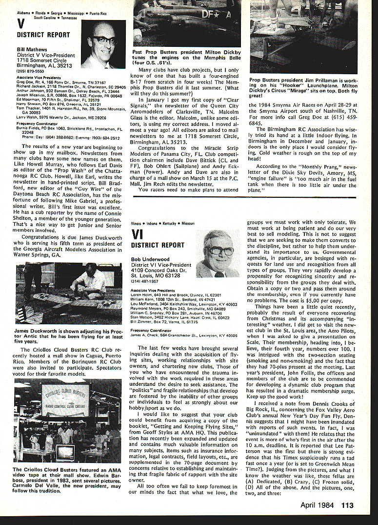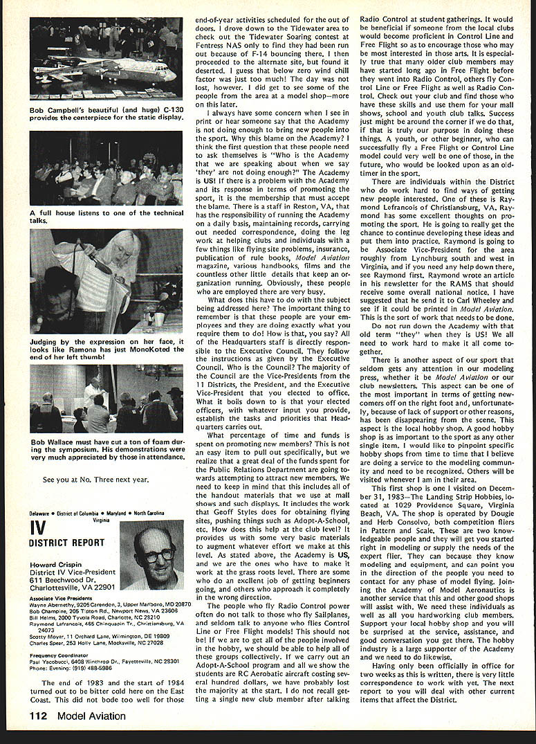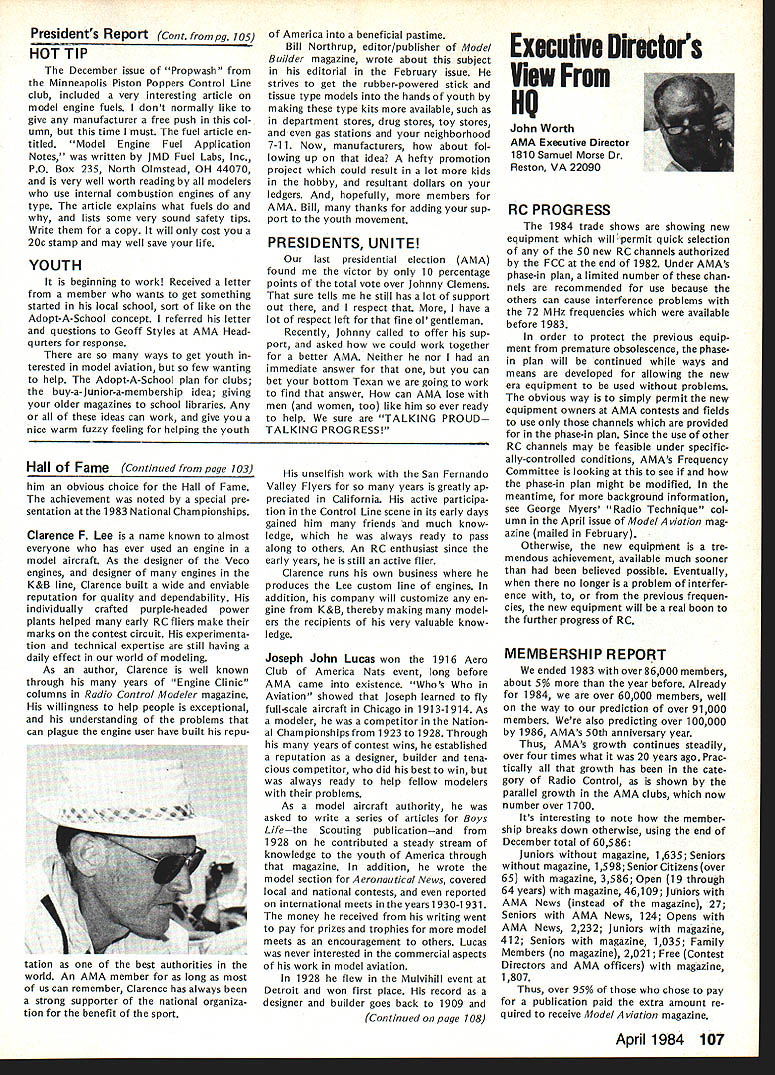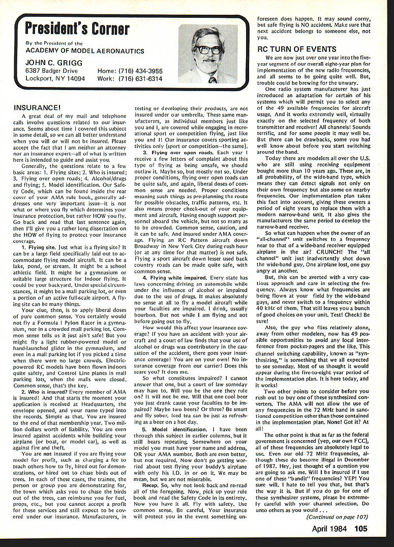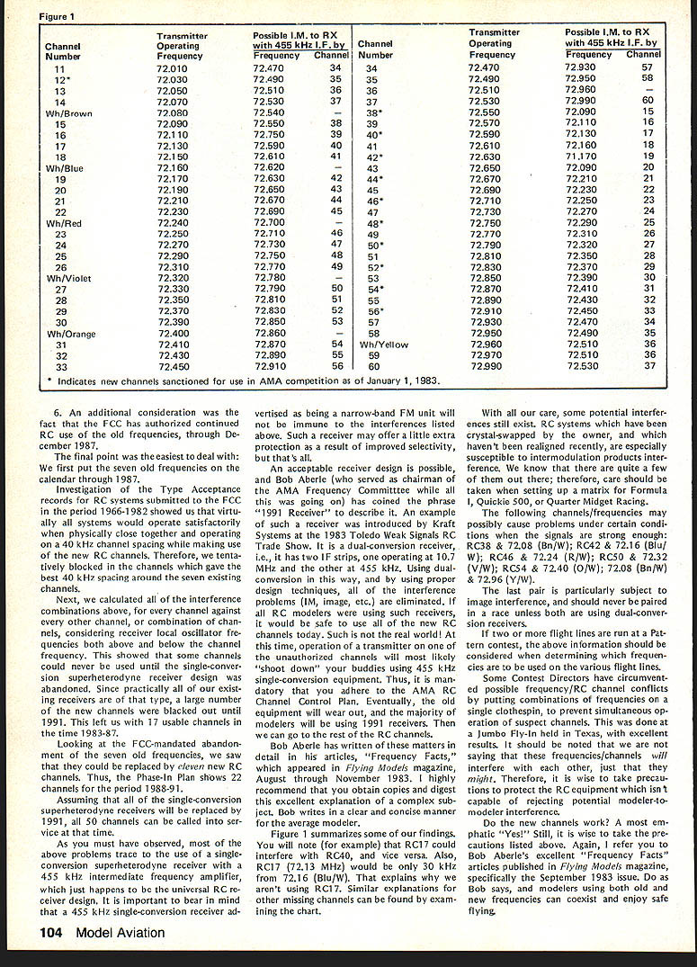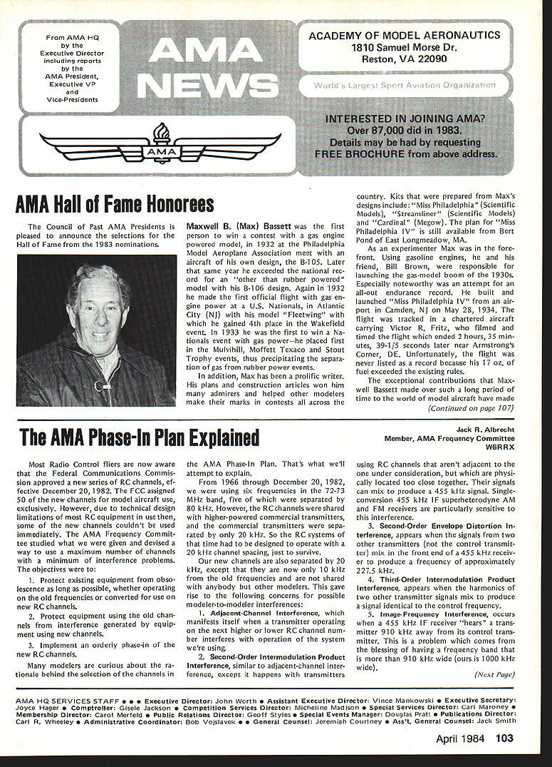 The Council Past AMA Presidents pleased announce selections Hall Fame 1983 nominations Maxwell B Max Bassett first person win contest gas engine powered model 1932 Philadelphia Model Aeroplane Association meet aircraft own design B-1 05 Later same year exceeded national rec ord other rubber powered model B-i 06 design Again 1932 made first official flight gas en gine power US Nationals Atlantic City NJ model Fleetwing gained 4th place Wakefield event 1933 first win Na tionals event gas powerhe placed first Mulvihill Moffett Texaco Stout Trophy events thus precipitating separa tion gas rubber power events addition Max has prolific writer plans construction articles won him admirers helped other modelers make marks contests across country Kits prepared Maxs designs include Miss Philadelphia Scientific Models Streamliner Scientific Models Cardinal Megow plan Miss Philadelphia IV still available Bert Pond East Longmeadow MA As experimenter Max fore front Using gasoline engines friend Bill Brown responsible launching gas-model boom 1 930s Especially noteworthy attempt all-out endurance record built launched Miss Philadelphia IV air port Camden NJ May 28 1934 flight tracked chartered aircraft carrying Victor R Fritz filmed timed flight ended 2 hours 35 min utes 39-1/5 seconds later near Armstrongs Corner DE Unfortunately flight never listed record because 17 oz fuel exceeded existing rules exceptional contributions Max well Bassett made over such long period time world model aircraft have made Continued page 107 AMA Phase-In Plan Explained Jack R Albrecht Member AMA Frequency Committee W6RRX Most Radio Control fliers now aware Federal Communications Commis sion approved new series RC channels ef fective December 20 1982 FCC assigned 50 new channels model aircraft use exclusively However due technical design limitations RC equipment use some new channels couldnt used immediately AMA Frequency Commit tee studied what given devised way use maximum number channels minimum interference problems objectives 1 Protect existing equipment obso lescence long possible whether operating old frequencies converted use new RC channels 2 Protect equipment using old chan nels interference generated equip ment using new channels 3 Implement orderly phase-in new RC channels modelers curious about ra tionale behind selection channels AMA Phase-In Plan Thats what well attempt explain 1966 through December 20 1982 using six frequencies 72-73 MHz band five separated 80 kHz However RC channels shared higher-powered commercial transmitters commercial transmitters sepa rated 20 kHz So RC systems time designed operate 20 kHz channel spacing just survive new channels also separated 20 kHz except now 10 kHz old frequencies shared anybody other modelers gave rise following concerns possible modeler-to-modeler interferences 1 Adjacent-Channel Interference manifests itself transmitter operating next higher lower RC channel num ber interferes operation system using 2 Second-Order Intermodulation Product Interference similar adjacent-channel inter ference except happens transmitters using RC channels arent adjacent under consideration physi cally located too close together signals can mix produce 455 kHz signal Singleconversion 455 kHz IF superheterodyne AM FM receivers particularly sensitive interference 3 Second-Order Envelope Distortion terference appears signals two other transmitters control transmit ter mix front end 455 kHz receiv er produce frequency approximately 2275 kHz 4 Third-Order ntermodulation Product Interference appears harmonics two other transmitter signals mix produce signal identical control frequency 5 Image- Frequency Interference occurs 455 kHz IF receiver hears trans mitter 910 kHz away its control trans mitter problem comes blessing having frequency band 910 kHz wide 1000 kHz wide Next Page April 1984 103 AMA HQ Executive Director including reports bY AMA President Executive VP Vice-Presidents ACADEMY OF MODEL AERONAUTICS 1810 Samuel Morse Dr Reston VA 22090 AMA Hall Fame Honorees AMA HQ SERVICES STAFF ecutive Director John Worth 0 Assistant Executive Director Vince Mankowski utive Secretary Joyce Hager troller Gisele Jackson etition Services Director Micheline Madison ial Services Director Carl Maroney S Membership Director Carol Merfeld ic Relations Director Geoff Styles Special Events Manager Douglas Pratt ications Director Carl R Wheeley nistrative Coordinator Bob Voislavek ral Counsel Jeremiah Courtney Asst General Counsel Jack Smith Transmitter Operating Frequency 7 20 10 72030 72050 72070 72080 72090 721 10 72130 721 50 72160 721 70 721 90 72210 72230 72240 72250 72270 72290 723 10 72320 72330 72350 72370 72390 72400 72410 72430 72450 new channels sanctioned use AMA competition January 1 1983 6 An additional consideration fact FCC has authorized continued RC use old frequencies through De cember 1 987 final point theeasiest deal first put seven old frequencies calendar through 1 987 Investigation Type Acceptance records RC systems submitted FCC period 1966-1982 showed us virtu ally systems would operate satisfactorily physically close together operating 40 kHz channel spacing making use new RC channels Therefore tenta tively blocked channels gave best 40 kHz spacing around seven existing channels Next calculated interference combinations above channel against other channel combination chan nels considering receiver local oscillator fre quencies both above below channel frequency showed some channels could never used until single-conver sion superheterodyne receiver design abandoned Since practically exist ing receivers type large number new channels blacked out until 1991 left us 17 usable channels time 1983-87 Looking FCC-mandated abandon ment seven old frequencies saw could replaced eleven new RC channels Thus Phase-In Plan shOws 22 channels period 1988-91 Assuming single-conversion superheterodyne receivers will replaced 1991 50 channels can called ser vice time As must have observed above p