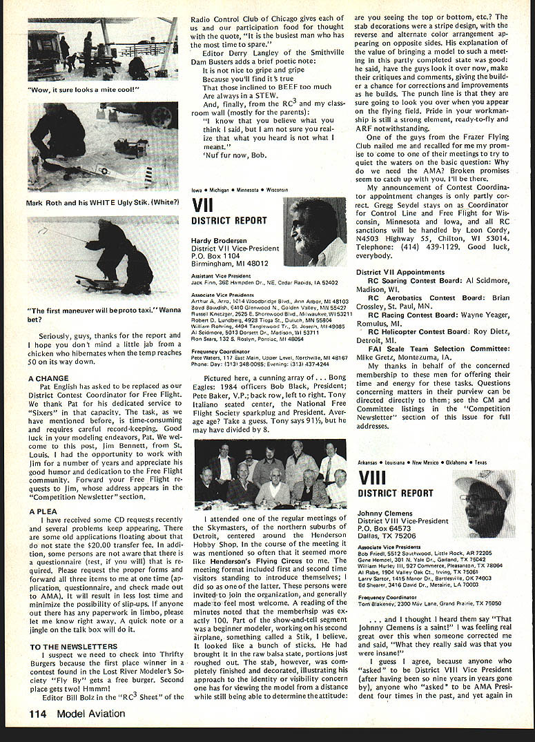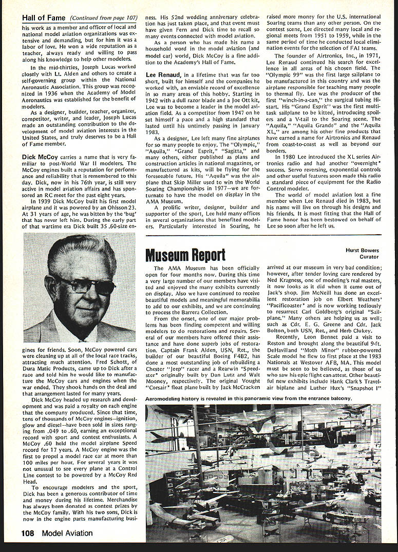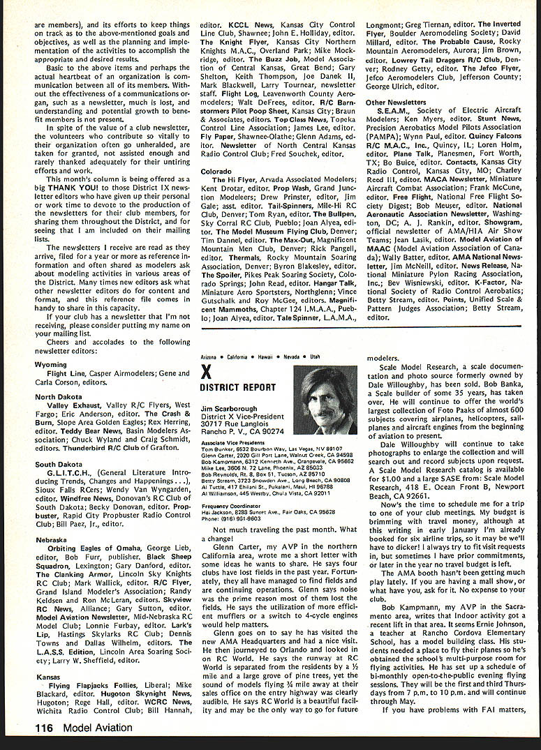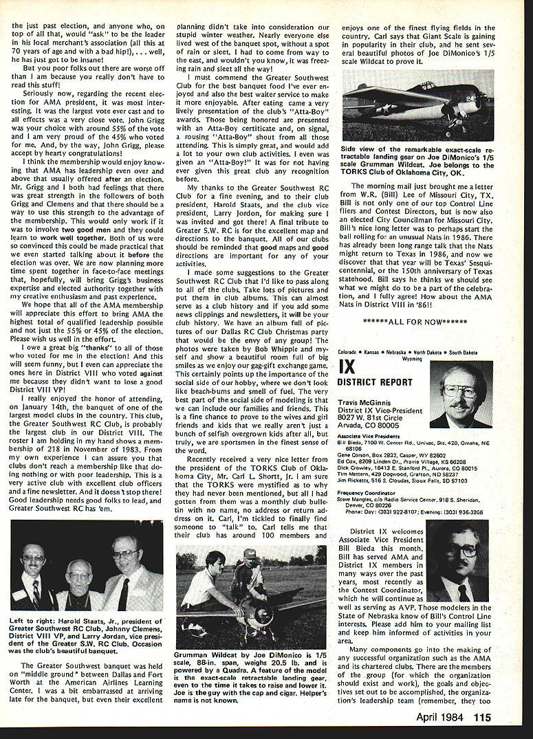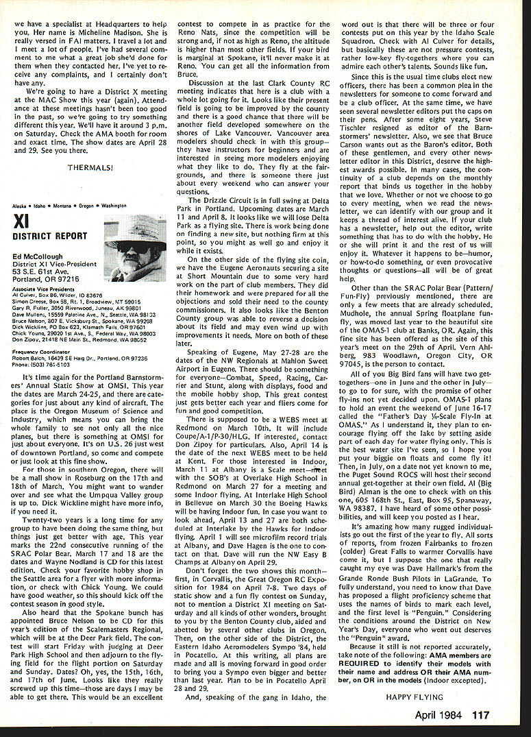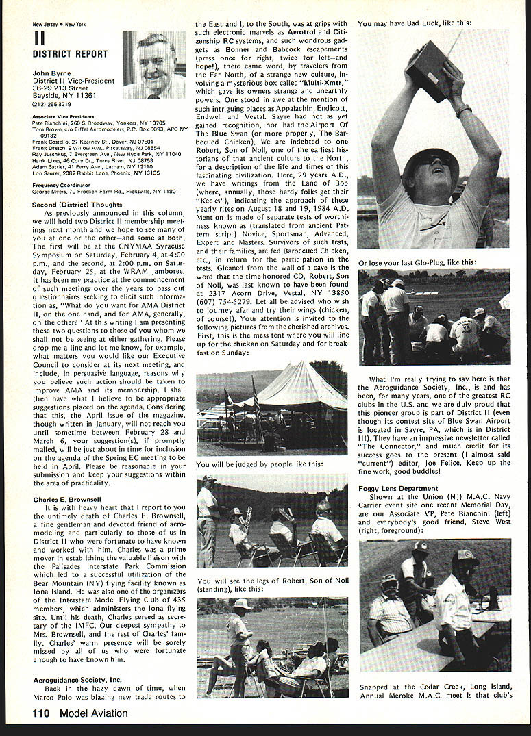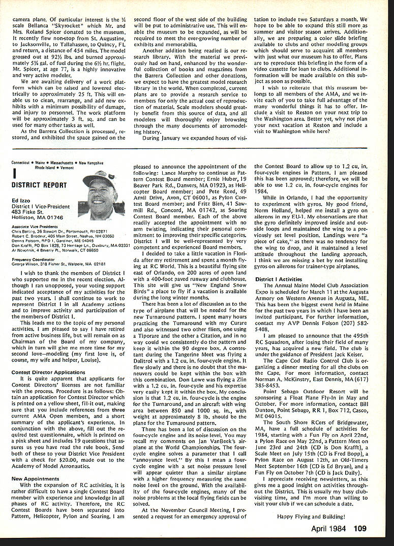 The Council Past AMA Presidents pleased announce selections Hall Fame 1983 nominations Maxwell B Max Bassett first person win contest gas engine powered model 1932 Philadelphia Model Aeroplane Association meet aircraft own design B-1 05 Later same year exceeded national rec ord other rubber powered model B-i 06 design Again 1932 made first official flight gas en gine power US Nationals Atlantic City NJ model Fleetwing gained 4th place Wakefield event 1933 first win Na tionals event gas powerhe placed first Mulvihill Moffett Texaco Stout Trophy events thus precipitating separa tion gas rubber power events addition Max has prolific writer plans construction articles won him admirers helped other modelers make marks contests across country Kits prepared Maxs designs include Miss Philadelphia Scientific Models Streamliner Scientific Models Cardinal Megow plan Miss Philadelphia IV still available Bert Pond East Longmeadow MA As experimenter Max fore front Using gasoline engines friend Bill Brown responsible launching gas-model boom 1 930s Especially noteworthy attempt all-out endurance record built launched Miss Philadelphia IV air port Camden NJ May 28 1934 flight tracked chartered aircraft carrying Victor R Fritz filmed timed flight ended 2 hours 35 min utes 39-1/5 seconds later near Armstrongs Corner DE Unfortunately flight never listed record because 17 oz fuel exceeded existing rules exceptional contributions Max well Bassett made over such long period time world model aircraft have made Continued page 107 AMA Phase-In Plan Explained Jack R Albrecht Member AMA Frequency Committee W6RRX Most Radio Control fliers now aware Federal Communications Commis sion approved new series RC channels ef fective December 20 1982 FCC assigned 50 new channels model aircraft use exclusively However due technical design limitations RC equipment use some new channels couldnt used immediately AMA Frequency Commit tee studied what given devised way use maximum number channels minimum interference problems objectives 1 Protect existing equipment obso lescence long possible whether operating old frequencies converted use new RC channels 2 Protect equipment using old chan nels interference generated equip ment using new channels 3 Implement orderly phase-in new RC channels modelers curious about ra tionale behind selection channels AMA Phase-In Plan Thats what well attempt explain 1966 through December 20 1982 using six frequencies 72-73 MHz band five separated 80 kHz However RC channels shared higher-powered commercial transmitters commercial transmitters sepa rated 20 kHz So RC systems time designed operate 20 kHz channel spacing just survive new channels also separated 20 kHz except now 10 kHz old frequencies shared anybody other modelers gave rise following concerns possible modeler-to-modeler interferences 1 Adjacent-Channel Interference manifests itself transmitter operating next higher lower RC channel num ber interferes operation system using 2 Second-Order Intermodulation Product Interference similar adjacent-channel inter ference except happens transmitters using RC channels arent adjacent under consideration physi cally located too close together signals can mix produce 455 kHz signal Singleconversion 455 kHz IF superheterodyne AM FM receivers particularly sensitive interference 3 Second-Order Envelope Distortion terference appears signals two other transmitters control transmit ter mix front end 455 kHz receiv er produce frequency approximately 2275 kHz 4 Third-Order ntermodulation Product Interference appears harmonics two other transmitter signals mix produce signal identical control frequency 5 Image- Frequency Interference occurs 455 kHz IF receiver hears trans mitter 910 kHz away its control trans mitter problem comes blessing having frequency band 910 kHz wide 1000 kHz wide Next Page April 1984 103 AMA HQ Executive Director including reports bY AMA President Executive VP Vice-Presidents ACADEMY OF MODEL AERONAUTICS 1810 Samuel Morse Dr Reston VA 22090 AMA Hall Fame Honorees AMA HQ SERVICES STAFF ecutive Director John Worth 0 Assistant Executive Director Vince Mankowski utive Secretary Joyce Hager troller Gisele Jackson etition Services Director Micheline Madison ial Services Director Carl Maroney S Membership Director Carol Merfeld ic Relations Director Geoff Styles Special Events Manager Douglas Pratt ications Director Carl R Wheeley nistrative Coordinator Bob Voislavek ral Counsel Jeremiah Courtney Asst General Counsel Jack Smith Transmitter Operating Frequency 7 20 10 72030 72050 72070 72080 72090 721 10 72130 721 50 72160 721 70 721 90 72210 72230 72240 72250 72270 72290 723 10 72320 72330 72350 72370 72390 72400 72410 72430 72450 new channels sanctioned use AMA competition January 1 1983 6 An additional consideration fact FCC has authorized continued RC use old frequencies through De cember 1 987 final point theeasiest deal first put seven old frequencies calendar through 1 987 Investigation Type Acceptance records RC systems submitted FCC period 1966-1982 showed us virtu ally systems would operate satisfactorily physically close together operating 40 kHz channel spacing making use new RC channels Therefore tenta tively blocked channels gave best 40 kHz spacing around seven existing channels Next calculated interference combinations above channel against other channel combination chan nels considering receiver local oscillator fre quencies both above below channel frequency showed some channels could never used until single-conver sion superheterodyne receiver design abandoned Since practically exist ing receivers type large number new channels blacked out until 1991 left us 17 usable channels time 1983-87 Looking FCC-mandated abandon ment seven old frequencies saw could replaced eleven new RC channels Thus Phase-In Plan shOws 22 channels period 1988-91 Assuming single-conversion superheterodyne receivers will replaced 1991 50 channels can called ser vice time As must have observed above p