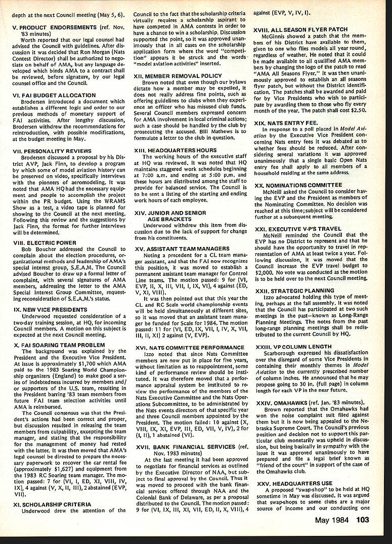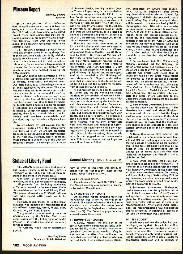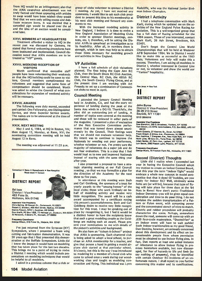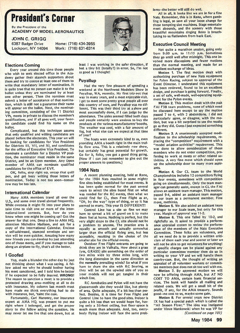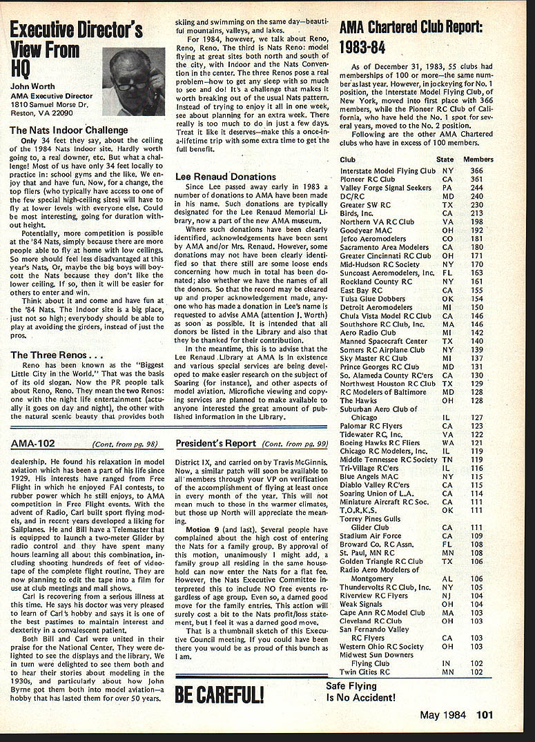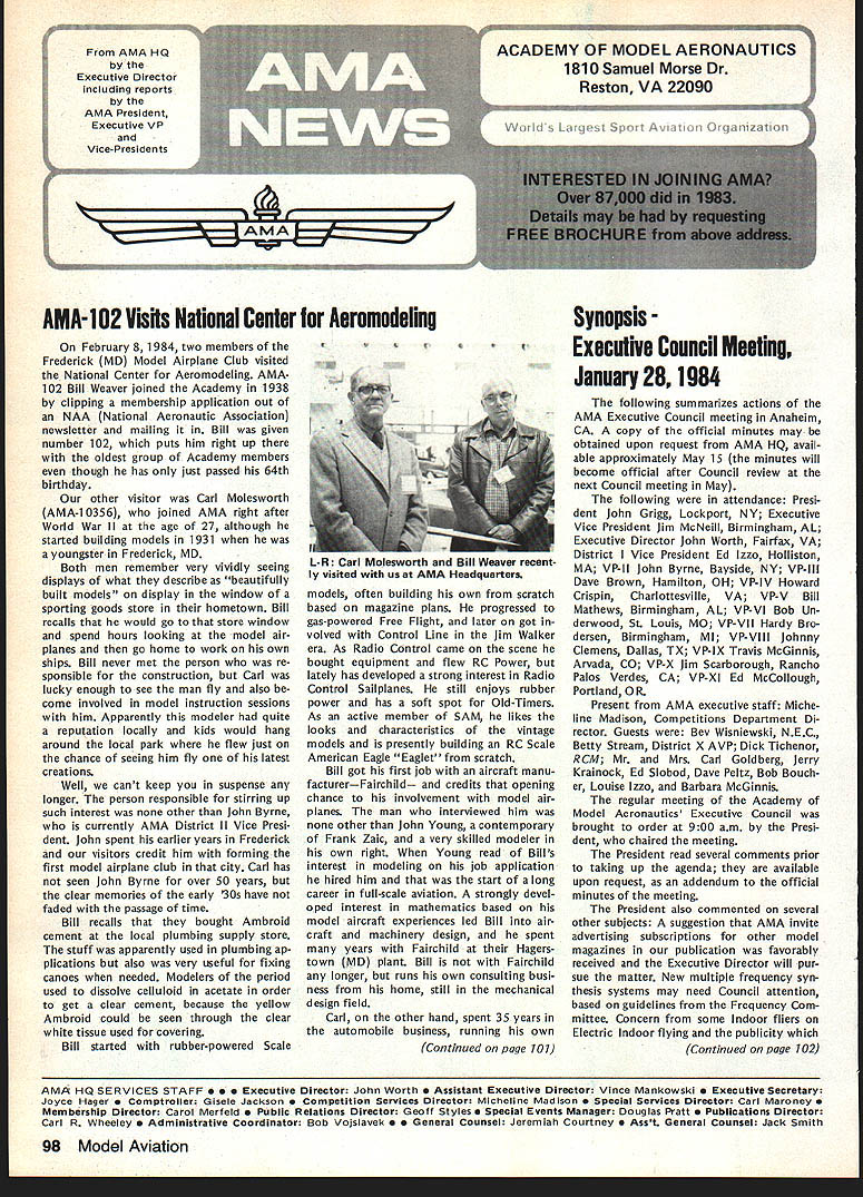 On February 8 1984 two members Frederick MD Model Airplane Club visited National Center Aeromodeling AMA102 Bill Weaver joined Academy 1938 clipping membership application out NAA National Aeronautic Association newsletter mailing Bill given number 102 puts him right up oldest group Academy members though has just passed 64th b irth day other visitor Carl Molesworth AMA-i 0356 joined AMA right after World War II age 27 although started building models 1931 youngster Frederick MD Both men remember very vividly seeing displays what describe beautifully built models display window sporting goods store hometown Bill recalls would go store window spend hours looking model air planes go home work own ships Bill never met person re sponsible construction Carl lucky enough see man fly also come involved model instruction sessions him Apparently modeler quite reputation locally kids would hang around local park flew just chance seeing him fly latest creations Well cant keep suspense longer person responsible stirring up such interest other John Byrne currently AMA District II Vice Presi dent John spent earlier years Frederick visitors credit him forming first model airplane club city Carl has seen John Byrne over 50 years clear memories early 30s have faded passage time Bill recalls bought Ambroid cement local plumbing supply store stuff apparently used plumbing ap plications also very useful fixing canoes needed Modelers period used dissolve celluloid acetate order get clear cement because yellow Ambroid could seen through clear white tissue used covering Bill started rubber-powered Scale models often building own scratch based magazine plans progressed gas-powered Free Flight later got volved Control Line Jim Walker era As Radio Control came scene bought equipment flew RC Power lately has developed strong interest Radio Control Sailpianes still enjoys rubber power has soft spot Old-Timers As active member SAM likes looks characteristics vintage models presently building RC Scale American Eagle Eaglet scratch Bill got first job aircraft manu facturerFairchild credits opening chance involvement model air planes man interviewed him other John Young contemporary Frank Zaic very skilled modeler own right Young read Bills interest modeling job application hired him start long career full-scale aviation strongly devel oped interest mathematics based model aircraft experiences led Bill air craft machinery design spent years Fairchild Hagers town MD plant Bill Fairchild longer runs own consulting busi ness home still mechanical design field Carl other hand spent 35 years automobile business running own Continued page 101 Synopsis Executive Council Meeting January 28 1984 following summarizes actions AMA Executive Council meeting Anaheim CA copy official minutes may obtained upon request AMA HQ avail able approximately May 15 minutes will become official after Council review next Council meeting May following attendance Presi dent John Grigg Lockport NY Executive Vice President Jim McNeill Birmingham AL Executive Director John Worth Fairfax VA District Vice President Ed Izzo Holliston MA VP-Il John Byrne Bayside NY VPlll Dave Brown Hamilton OH VP-IV Howard Crispin Charlottesville VA VP-V Bill Mathews Birmingham AL VP-VI Bob Un derwood St Louis MO VP-VII Hardy Bro dersen Birmingham MI VP-VIII Johnny Clemens Dallas TX VP-IX Travis McGinnis Arvada CO VP-X Jim Scarborough Rancho Palos Verdes CA VP-XI Ed McCollough Portland OR Present AMA executive staff Miche line Madison Competitions Department Di rector Guests Bev Wisniewski NEC Betty Stream District X AVP Dick Tichenor RCM Mr Mrs Carl Goldberg Jerry Krainock Ed Slobod Dave Peltz Bob Bouch er Louise Izzo Barbara McGinnis regular meeting Academy Model Aeronautics Executive Council brought order 900 am Presi dent chaired meeting President read several comments prior taking up agenda available upon request addendum official minutes meeting President also commented several other subjects suggestion AMA invite advertising subscriptions other model magazines publication favorably received Executive Director will pur sue matter New multiple frequency syn thesis systems may need Council attention based guidelines Frequency Com mittee Concern some Indoor fliers Electric Indoor flying publicity Continued page 102 98 Model Aviation AMA HQ bY Executive Director Including reports bY AMA President Executive VP Vice-Presidents ACADEMY OF MODEL AERONAUTICS 1810 Samuel Morse Dr Reston VA 22090 AMA- 102 Visits National Center Aeromodeling L-H usri Moleswortn Bill Weaver recent ly visited us AMA Headquarters AMA HQ SERVICES STAFF. utive Director John Worth stant Executive Director Vince Mankowski 0 ExecutIve Secretary Joyce Hager troller Gisele Jackson etition Services Director Micheline Madison ial Services Director Carl Maroney S Membership Director Carol Merfeld ic Relations Director Geoff Styles Special Events Manager Douglas Pratt ications Director Carl R Wheeley Administrative Coordinator Bob Vojalavek eral Counsel Jeremiah Courtney General Counsel Jack Smith Presidents Corner President ACADEMY OF MODEL AERONAUTICS JOHN C GRIGG 6387 Badger DriveHome 716 434-3955 Lockport NY 14094Work 716 631-6314 Elections Coming year around time people wish seek elected office Aca demy gather staunch supporters about try coerce least write mandatory letter nomination quite true no person can make ballot unless nominated least other person nominee must submit letter acceptance nomina tion still guarantee name will appear ballot Next nominat ing committee consisting 11 District VPs meets private discuss nominees qualifications goes well favor ite candidate could find name ballot Complicated technique assures qualified willing candidates placed before electorate year will looking candidates Vice President Districts Ill VII XI candidates office Executive Vice President nominate candidate District VP posi tion nominator must reside same District Open member Any Open member AMA can nominate