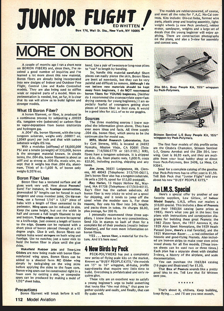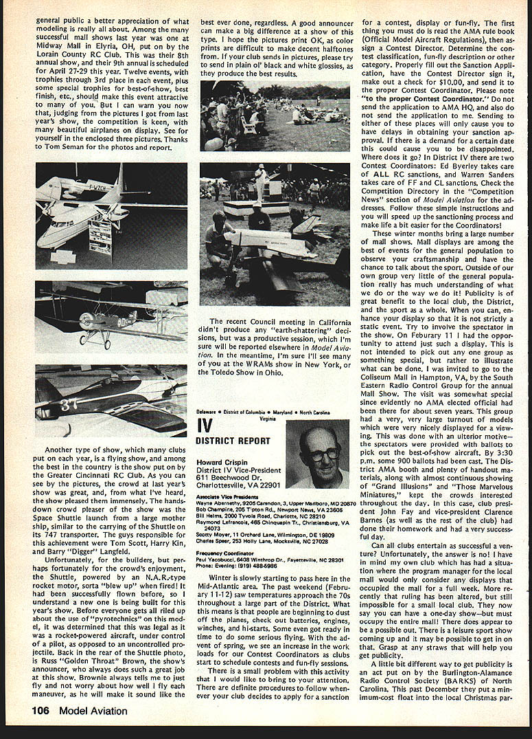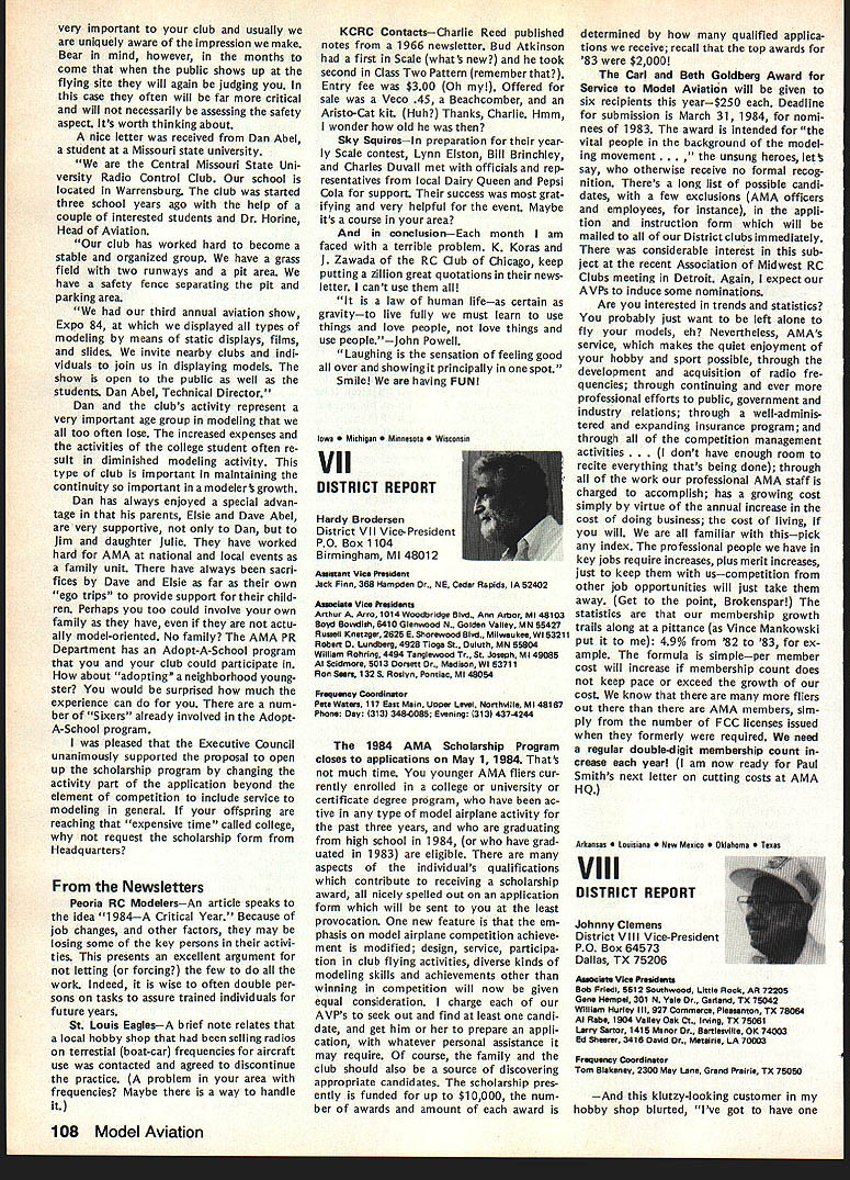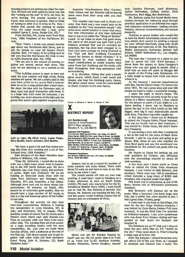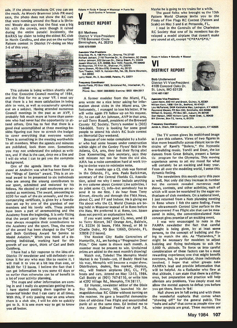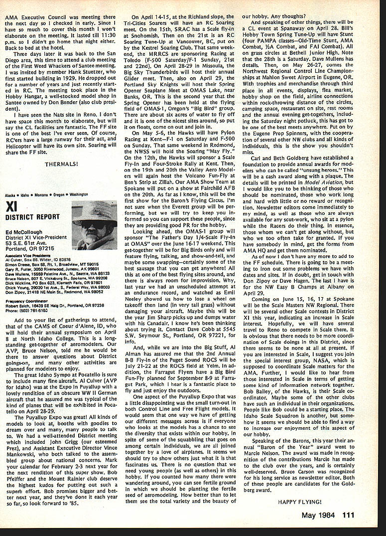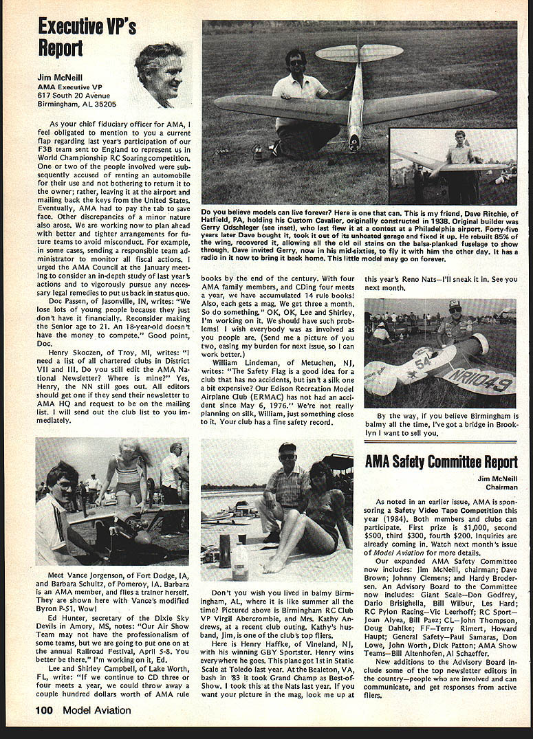 On February 8 1984 two members Frederick MD Model Airplane Club visited National Center Aeromodeling AMA102 Bill Weaver joined Academy 1938 clipping membership application out NAA National Aeronautic Association newsletter mailing Bill given number 102 puts him right up oldest group Academy members though has just passed 64th b irth day other visitor Carl Molesworth AMA-i 0356 joined AMA right after World War II age 27 although started building models 1931 youngster Frederick MD Both men remember very vividly seeing displays what describe beautifully built models display window sporting goods store hometown Bill recalls would go store window spend hours looking model air planes go home work own ships Bill never met person re sponsible construction Carl lucky enough see man fly also come involved model instruction sessions him Apparently modeler quite reputation locally kids would hang around local park flew just chance seeing him fly latest creations Well cant keep suspense longer person responsible stirring up such interest other John Byrne currently AMA District II Vice Presi dent John spent earlier years Frederick visitors credit him forming first model airplane club city Carl has seen John Byrne over 50 years clear memories early 30s have faded passage time Bill recalls bought Ambroid cement local plumbing supply store stuff apparently used plumbing ap plications also very useful fixing canoes needed Modelers period used dissolve celluloid acetate order get clear cement because yellow Ambroid could seen through clear white tissue used covering Bill started rubber-powered Scale models often building own scratch based magazine plans progressed gas-powered Free Flight later got volved Control Line Jim Walker era As Radio Control came scene bought equipment flew RC Power lately has developed strong interest Radio Control Sailpianes still enjoys rubber power has soft spot Old-Timers As active member SAM likes looks characteristics vintage models presently building RC Scale American Eagle Eaglet scratch Bill got first job aircraft manu facturerFairchild credits opening chance involvement model air planes man interviewed him other John Young contemporary Frank Zaic very skilled modeler own right Young read Bills interest modeling job application hired him start long career full-scale aviation strongly devel oped interest mathematics based model aircraft experiences led Bill air craft machinery design spent years Fairchild Hagers town MD plant Bill Fairchild longer runs own consulting busi ness home still mechanical design field Carl other hand spent 35 years automobile business running own Continued page 101 Synopsis Executive Council Meeting January 28 1984 following summarizes actions AMA Executive Council meeting Anaheim CA copy official minutes may obtained upon request AMA HQ avail able approximately May 15 minutes will become official after Council review next Council meeting May following attendance Presi dent John Grigg Lockport NY Executive Vice President Jim McNeill Birmingham AL Executive Director John Worth Fairfax VA District Vice President Ed Izzo Holliston MA VP-Il John Byrne Bayside NY VPlll Dave Brown Hamilton OH VP-IV Howard Crispin Charlottesville VA VP-V Bill Mathews Birmingham AL VP-VI Bob Un derwood St Louis MO VP-VII Hardy Bro dersen Birmingham MI VP-VIII Johnny Clemens Dallas TX VP-IX Travis McGinnis Arvada CO VP-X Jim Scarborough Rancho Palos Verdes CA VP-XI Ed McCollough Portland OR Present AMA executive staff Miche line Madison Competitions Department Di rector Guests Bev Wisniewski NEC Betty Stream District X AVP Dick Tichenor RCM Mr Mrs Carl Goldberg Jerry Krainock Ed Slobod Dave Peltz Bob Bouch er Louise Izzo Barbara McGinnis regular meeting Academy Model Aeronautics Executive Council brought order 900 am Presi dent chaired meeting President read several comments prior taking up agenda available upon request addendum official minutes meeting President also commented several other subjects suggestion AMA invite advertising subscriptions other model magazines publication favorably received Executive Director will pur sue matter New multiple frequency syn thesis systems may need Council attention based guidelines Frequency Com mittee Concern some Indoor fliers Electric Indoor flying publicity Continued page 102 98 Model Aviation AMA HQ bY Executive Director Including reports bY AMA President Executive VP Vice-Presidents ACADEMY OF MODEL AERONAUTICS 1810 Samuel Morse Dr Reston VA 22090 AMA- 102 Visits National Center Aeromodeling L-H usri Moleswortn Bill Weaver recent ly visited us AMA Headquarters AMA HQ SERVICES STAFF. utive Director John Worth stant Executive Director Vince Mankowski 0 ExecutIve Secretary Joyce Hager troller Gisele Jackson etition Services Director Micheline Madison ial Services Director Carl Maroney S Membership Director Carol Merfeld ic Relations Director Geoff Styles Special Events Manager Douglas Pratt ications Director Carl R Wheeley Administrative Coordinator Bob Vojalavek eral Counsel Jeremiah Courtney General Counsel Jack Smith Presidents Corner President ACADEMY OF MODEL AERONAUTICS JOHN C GRIGG 6387 Badger DriveHome 716 434-3955 Lockport NY 14094Work 716 631-6314 Elections Coming year around time people wish seek elected office Aca demy gather staunch supporters about try coerce least write mandatory letter nomination quite true no person can make ballot unless nominated least other person nominee must submit letter acceptance nomina tion still guarantee name will appear ballot Next nominat ing committee consisting 11 District VPs meets private discuss nominees qualifications goes well favor ite candidate could find name ballot Complicated technique assures qualified willing candidates placed before electorate year will looking candidates Vice President Districts Ill VII XI candidates office Executive Vice President nominate candidate District VP posi tion nominator must reside same District Open member Any Open member AMA can nominate