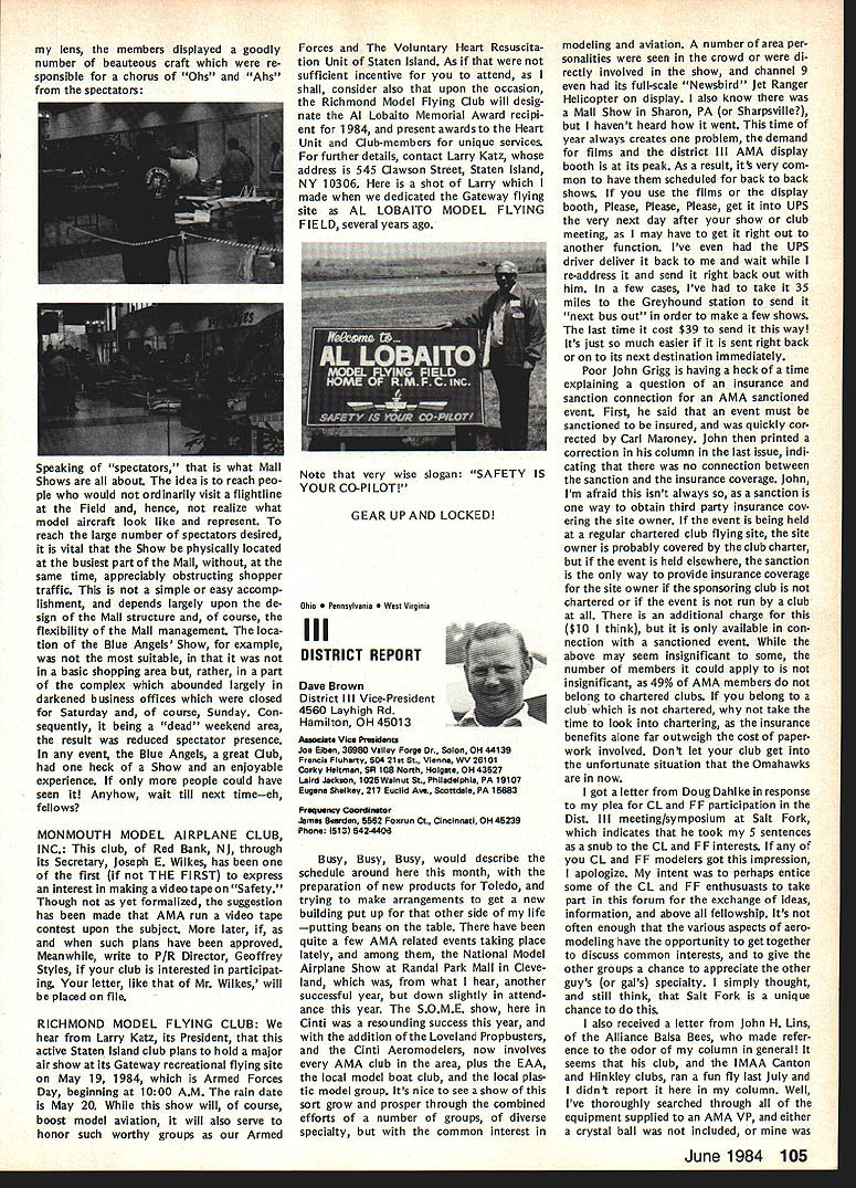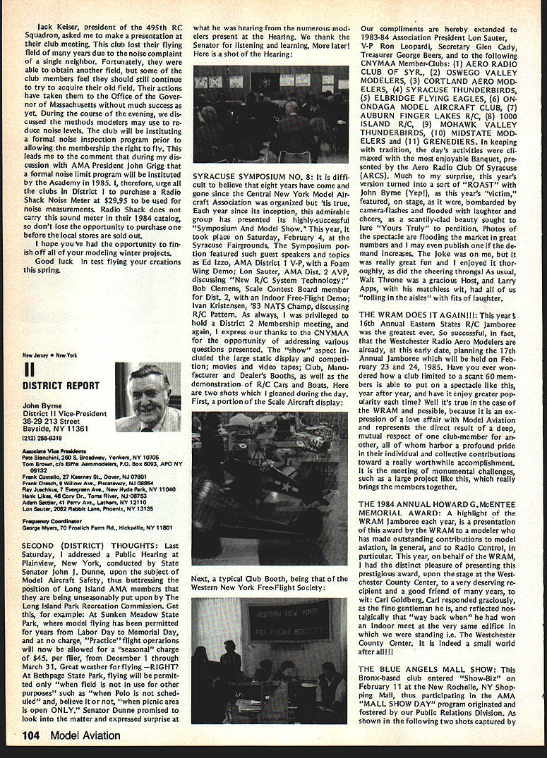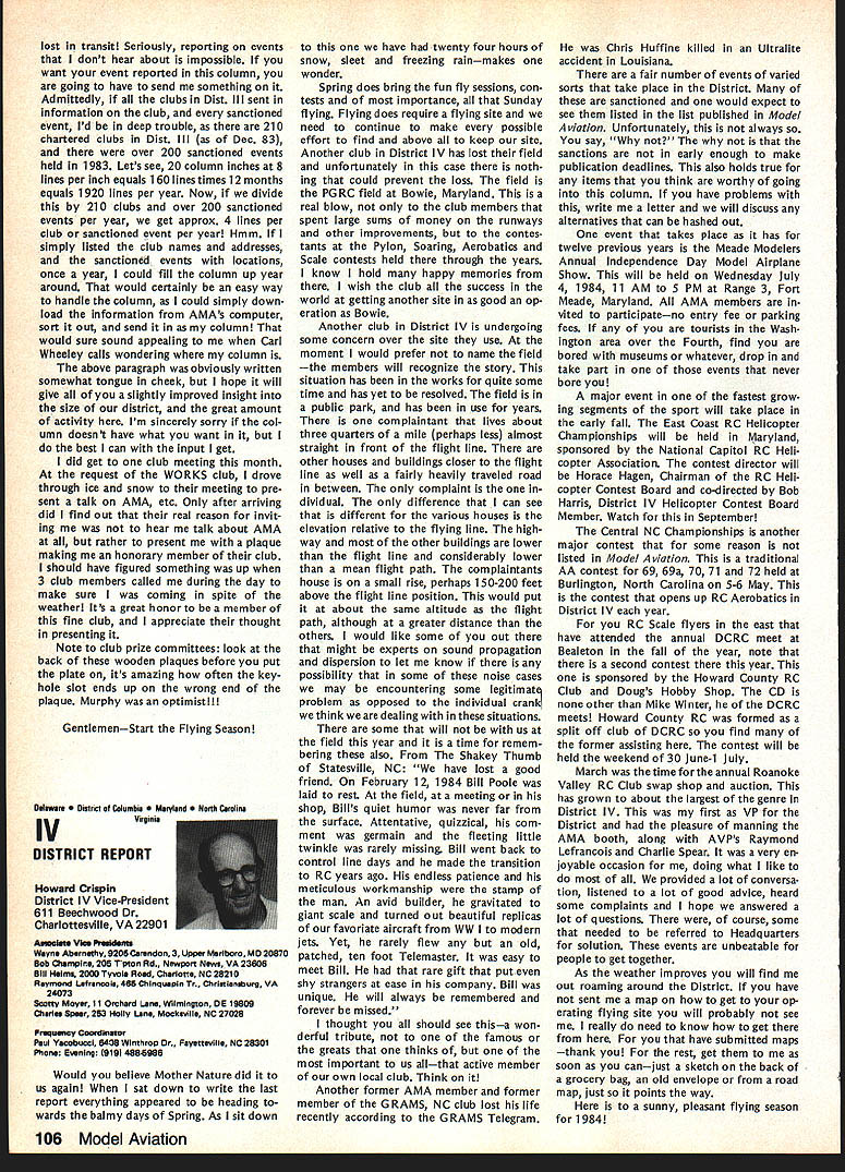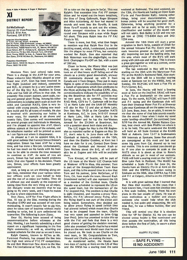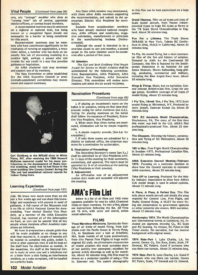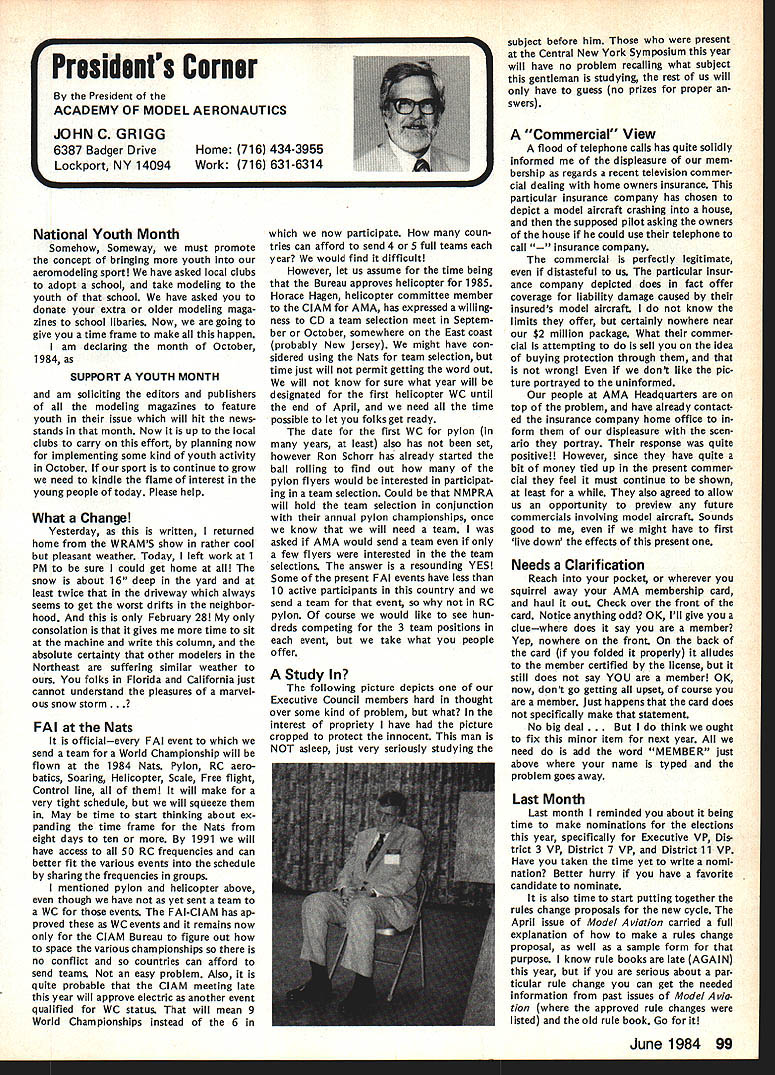 p L 1984 Nominating Procedure AMA Bylaws revised 1982 provide three-year elected officer terms instead two changes include adop tion various standing rules supple ment Bylaws concerning details organi zation operation Among standing rules involving AMA Nominations Committee procedures making nominations AMA officers being elected year 1984 will electing AMA Ex ecutive Vice President Vice Presidents Districts Ill VII Xl serve threeyear terms beginning 1984 procedures nomination will follows NOMINATING COMMITTEE 1 Composition a All 11 Vice Presidents sit Nominating Committee will constitute Committee total b Members Nominating Committee shall barred becoming nominees office themselves c Voting proxies permitted long proxy same district absent Vice President has permission writing vote telegram ab sent Vice President will suffice written permission d The President may appoint member Committee nor ex-offi member neither may Executive Vice President nor Executive Director member Committee 2 Chairman a The chairman Nominating Com mittee shall elected among Vice Presidents Vice Presidents major ity vote b The current AMA President absence Executive Vice President will call meeting order Once chairman Nominating Committee elected President EVP will relinquish chair leave meeting 3 Recording Secretary Recording Secretary shall a keep full accurate detailed written minutes proceedings b assist Teller distribution col lection tabulation ballots c submit President Executive Vice President meeting chairman Executive Director full written report meeting results voting procedures 48 hours after adjoumment 4 Meeting Conduct a The President EVP shall open meeting preside Vice Presidents elect chairman b The newly-elected chairman shall dis miss President EVP Teller shall candidate office 5 Candidate Nominations nomination letters must received AMA Headquarters fifteen 15 days prior convening Nominating Committee Annual Meeting Furthermore letter ac ceptance candidate must file AMA HQ prior meeting Because Nominating Committee scheduled meet August 12 deedline nomination receipt AMA HO close busi ness Monday July 30 6 Selection Nominees a Limited three 3 upon ballot elective office b The assembly shall examine evaluate discuss written proposals candi dacy office see 5 nomination letters shall read aloud Recording Secre tary c The discussion period shall limited ten 10 minutes per candidate d An incumbent automatically placed ballot except 3/4 vote against may withhold incumbents name ballot see Bylaws Article IX section 2 7 Voting vote per person per ballot b Oral voting shall district starting District progressing numerically ascending sequence through District Xl de sired voting secret ballots shall written Continued page 102 Vital People Award Program January 1983 Carl Beth Gold berg proposed Academy Model Aeronautics Executive Council im plement recognition program vital people background modeling movementthe newsletter editors contest organizers judges club officers others efforts enhance enjoyment hobby accomplishments seldom formally acknowledged recogni tion would form annual cash awards together appropriate plaques six people per year Academy Model eronautics would administer awards Council approved unanimously proceed setting up adminis trative guidelines implement award pro gram committee appointed began work has culminated following outllne I The Awards Six recipients per year receive cash awards $25000 Award Plaque Funds costs funded Gold berg Foundation II Candidates Recommendations may submitted yearly Open AMA member nomination form available Vice Presi dents AMA Headquarters Nominees shall have AMA mem ber minimum four years shall living AMA member Awards shall made annually ap propriate time place Deadline submission nominations shall January 1 year nominees previous year Ill Nomination Process Inclusion consideration club officers past club officers still active contest board members contest coordinators Nats workers andlor officials Special Interest Group offi Continued page 102 98 Model Aviation AMA HQ bY Executive Director including reports AMA President Executive VP Vice-Presidents L ACADEMY OF MODEL AERONAUTICS ] 1810 Samuel Morse Dr Reston VA 22090 Norld t Sport Aviation Orqaniation AMA HQ SERVICES STAFF Executive Director John Worth stant Executive Director Vince Mankowski 0 Executive Secretary Joyce Hager troller Gisele Jackson etition Services Director Micheiine Madison e Special Services Director Carl Maroney 0 Membership Director Carol Merfeld ic Relations Director Geoff Styles Special Events Manager Douglas Pratt ications Director Carl R Wheeley nistrative Coordinator Bob Voislavek 0 ral Counsel Jeremiah Courtney Asst General Counsel Jack Smith Presidsnts Corner President ACADEMY OF MODEL AERONAUTICS JOHN C GRIGG 6387 Badger DriveHome 716 434-3955 Lockport NY 14094Work 716 631-6314 National Youth Month Somehow Someway must promote concept bringing youth aeromodeling sport have asked local clubs adopt school take modeling youth school have asked donate extra older modeling maga zines school libaries Now going give time frame make happen am declaring month October 1984 SUPPORT YOUTH MONTH am soliciting editors publishers modeling magazines feature youth issue will hit news stands month Now up local clubs carry effort planning now implementing some kind youth activity October sport continue grow need kindle flame interest young people today Please help What Change Yesterday written returned home WRAMS show rather cool pleasant weather Today left work 1 PM sure could get home snow about 1 6 deep yard least twice driveway always seems get worst drifts neighbor hood February 28 consolation gives time sit machine write column absolute certainty other modelers Northeast suffering similar weather folks Florida California just cannot understand pleasures marvel ous snowstorm. FAI Nats officialevery FAI event send team World Championship will flown 1984 Nats Pylon RC aero batics Soarin