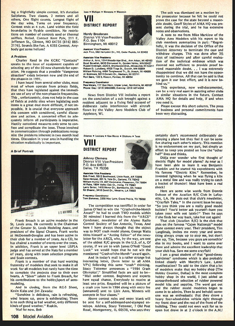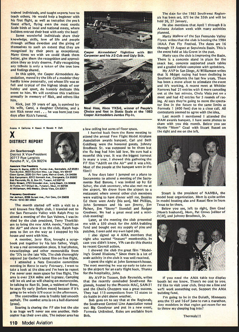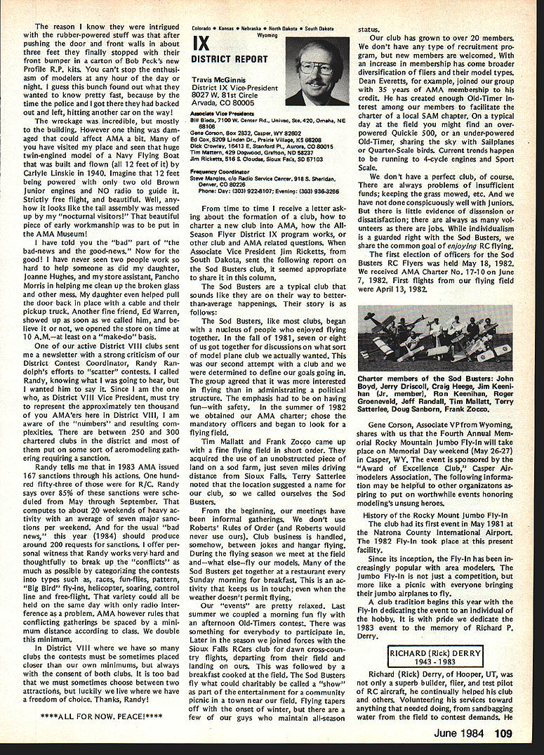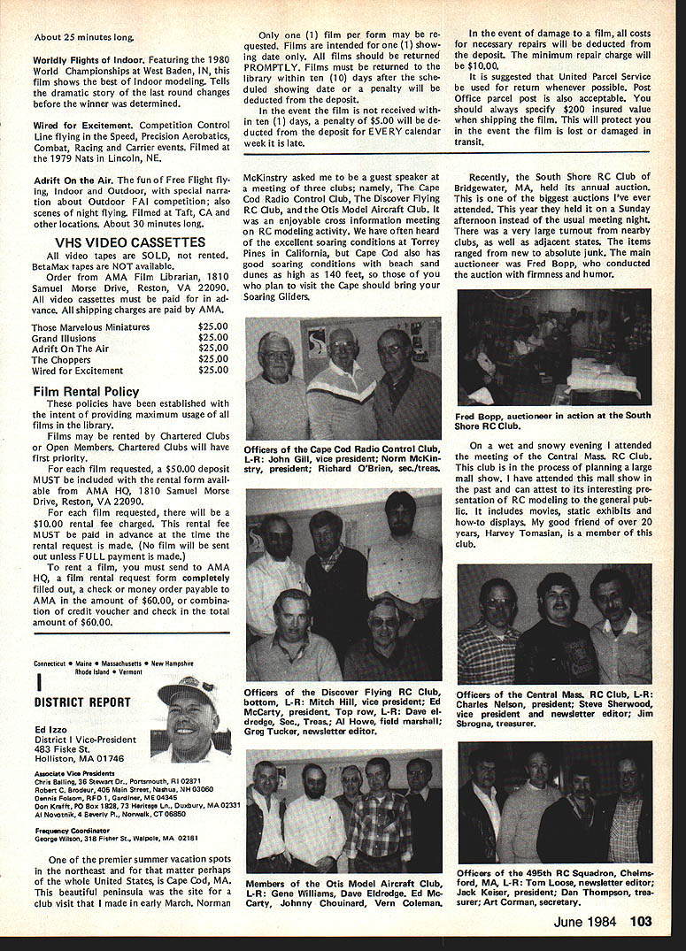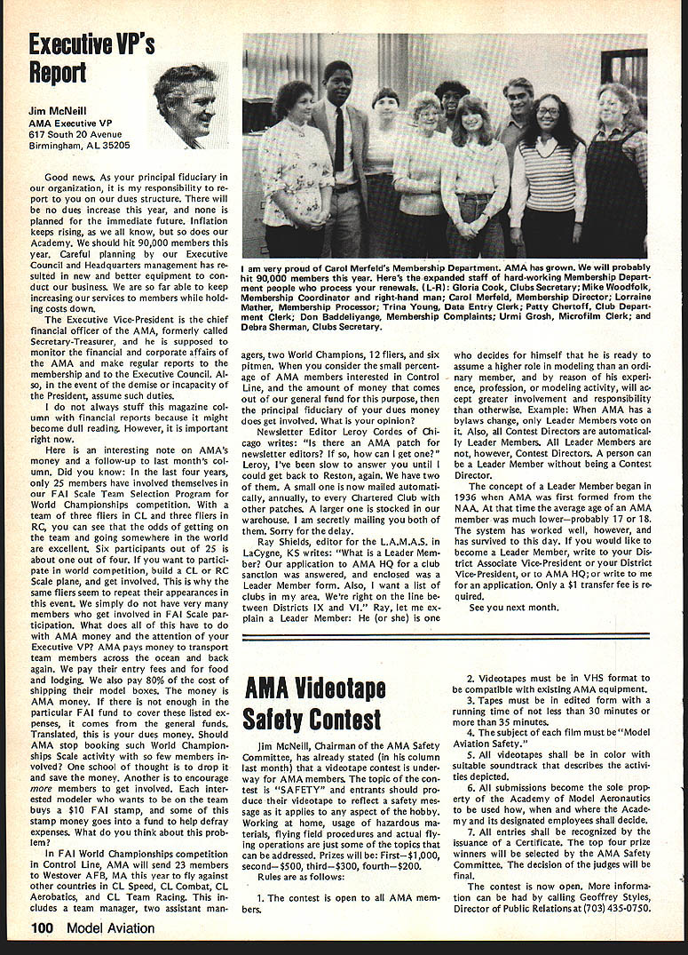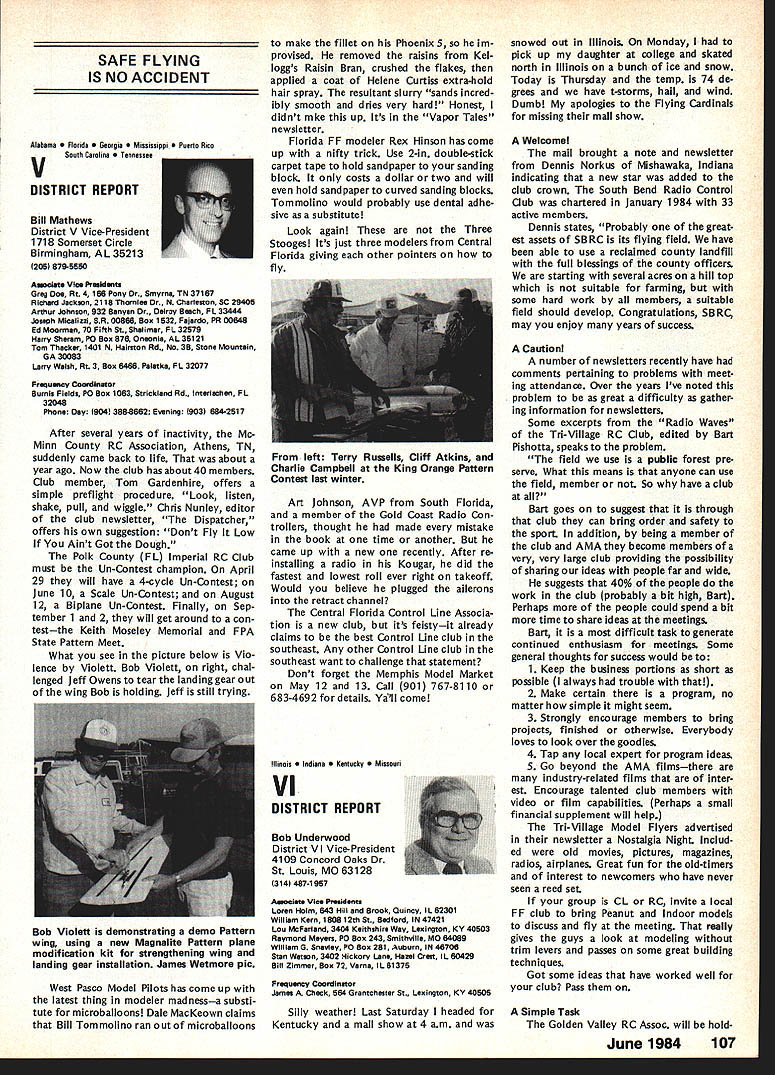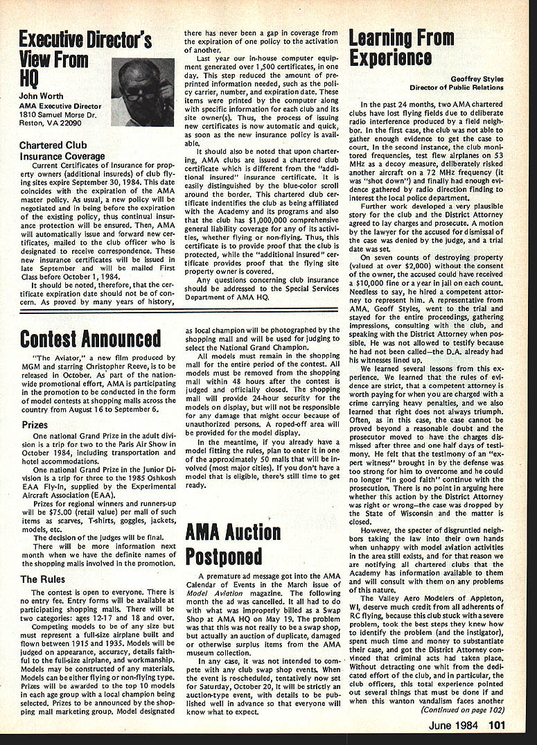 p L 1984 Nominating Procedure AMA Bylaws revised 1982 provide three-year elected officer terms instead two changes include adop tion various standing rules supple ment Bylaws concerning details organi zation operation Among standing rules involving AMA Nominations Committee procedures making nominations AMA officers being elected year 1984 will electing AMA Ex ecutive Vice President Vice Presidents Districts Ill VII Xl serve threeyear terms beginning 1984 procedures nomination will follows NOMINATING COMMITTEE 1 Composition a All 11 Vice Presidents sit Nominating Committee will constitute Committee total b Members Nominating Committee shall barred becoming nominees office themselves c Voting proxies permitted long proxy same district absent Vice President has permission writing vote telegram ab sent Vice President will suffice written permission d The President may appoint member Committee nor ex-offi member neither may Executive Vice President nor Executive Director member Committee 2 Chairman a The chairman Nominating Com mittee shall elected among Vice Presidents Vice Presidents major ity vote b The current AMA President absence Executive Vice President will call meeting order Once chairman Nominating Committee elected President EVP will relinquish chair leave meeting 3 Recording Secretary Recording Secretary shall a keep full accurate detailed written minutes proceedings b assist Teller distribution col lection tabulation ballots c submit President Executive Vice President meeting chairman Executive Director full written report meeting results voting procedures 48 hours after adjoumment 4 Meeting Conduct a The President EVP shall open meeting preside Vice Presidents elect chairman b The newly-elected chairman shall dis miss President EVP Teller shall candidate office 5 Candidate Nominations nomination letters must received AMA Headquarters fifteen 15 days prior convening Nominating Committee Annual Meeting Furthermore letter ac ceptance candidate must file AMA HQ prior meeting Because Nominating Committee scheduled meet August 12 deedline nomination receipt AMA HO close busi ness Monday July 30 6 Selection Nominees a Limited three 3 upon ballot elective office b The assembly shall examine evaluate discuss written proposals candi dacy office see 5 nomination letters shall read aloud Recording Secre tary c The discussion period shall limited ten 10 minutes per candidate d An incumbent automatically placed ballot except 3/4 vote against may withhold incumbents name ballot see Bylaws Article IX section 2 7 Voting vote per person per ballot b Oral voting shall district starting District progressing numerically ascending sequence through District Xl de sired voting secret ballots shall written Continued page 102 Vital People Award Program January 1983 Carl Beth Gold berg proposed Academy Model Aeronautics Executive Council im plement recognition program vital people background modeling movementthe newsletter editors contest organizers judges club officers others efforts enhance enjoyment hobby accomplishments seldom formally acknowledged recogni tion would form annual cash awards together appropriate plaques six people per year Academy Model eronautics would administer awards Council approved unanimously proceed setting up adminis trative guidelines implement award pro gram committee appointed began work has culminated following outllne I The Awards Six recipients per year receive cash awards $25000 Award Plaque Funds costs funded Gold berg Foundation II Candidates Recommendations may submitted yearly Open AMA member nomination form available Vice Presi dents AMA Headquarters Nominees shall have AMA mem ber minimum four years shall living AMA member Awards shall made annually ap propriate time place Deadline submission nominations shall January 1 year nominees previous year Ill Nomination Process Inclusion consideration club officers past club officers still active contest board members contest coordinators Nats workers andlor officials Special Interest Group offi Continued page 102 98 Model Aviation AMA HQ bY Executive Director including reports AMA President Executive VP Vice-Presidents L ACADEMY OF MODEL AERONAUTICS ] 1810 Samuel Morse Dr Reston VA 22090 Norld t Sport Aviation Orqaniation AMA HQ SERVICES STAFF Executive Director John Worth stant Executive Director Vince Mankowski 0 Executive Secretary Joyce Hager troller Gisele Jackson etition Services Director Micheiine Madison e Special Services Director Carl Maroney 0 Membership Director Carol Merfeld ic Relations Director Geoff Styles Special Events Manager Douglas Pratt ications Director Carl R Wheeley nistrative Coordinator Bob Voislavek 0 ral Counsel Jeremiah Courtney Asst General Counsel Jack Smith Presidsnts Corner President ACADEMY OF MODEL AERONAUTICS JOHN C GRIGG 6387 Badger DriveHome 716 434-3955 Lockport NY 14094Work 716 631-6314 National Youth Month Somehow Someway must promote concept bringing youth aeromodeling sport have asked local clubs adopt school take modeling youth school have asked donate extra older modeling maga zines school libaries Now going give time frame make happen am declaring month October 1984 SUPPORT YOUTH MONTH am soliciting editors publishers modeling magazines feature youth issue will hit news stands month Now up local clubs carry effort planning now implementing some kind youth activity October sport continue grow need kindle flame interest young people today Please help What Change Yesterday written returned home WRAMS show rather cool pleasant weather Today left work 1 PM sure could get home snow about 1 6 deep yard least twice driveway always seems get worst drifts neighbor hood February 28 consolation gives time sit machine write column absolute certainty other modelers Northeast suffering similar weather folks Florida California just cannot understand pleasures marvel ous snowstorm. FAI Nats officialevery FAI event send team World Championship will flown 1984 Nats Pylon RC aero batics Soarin