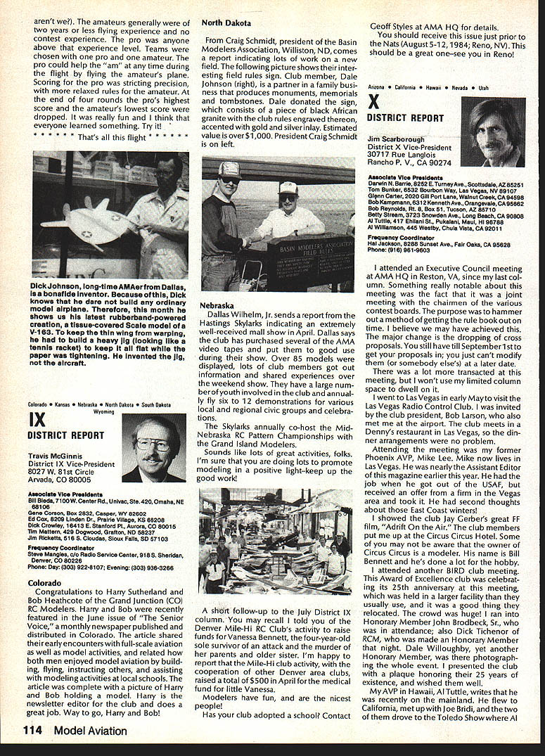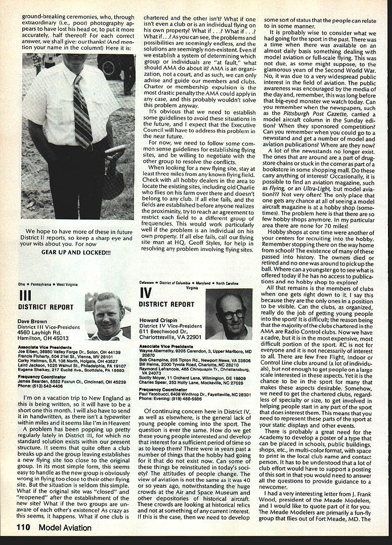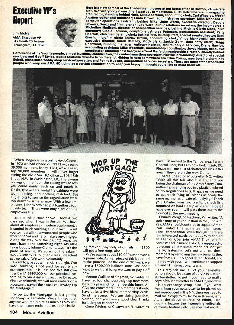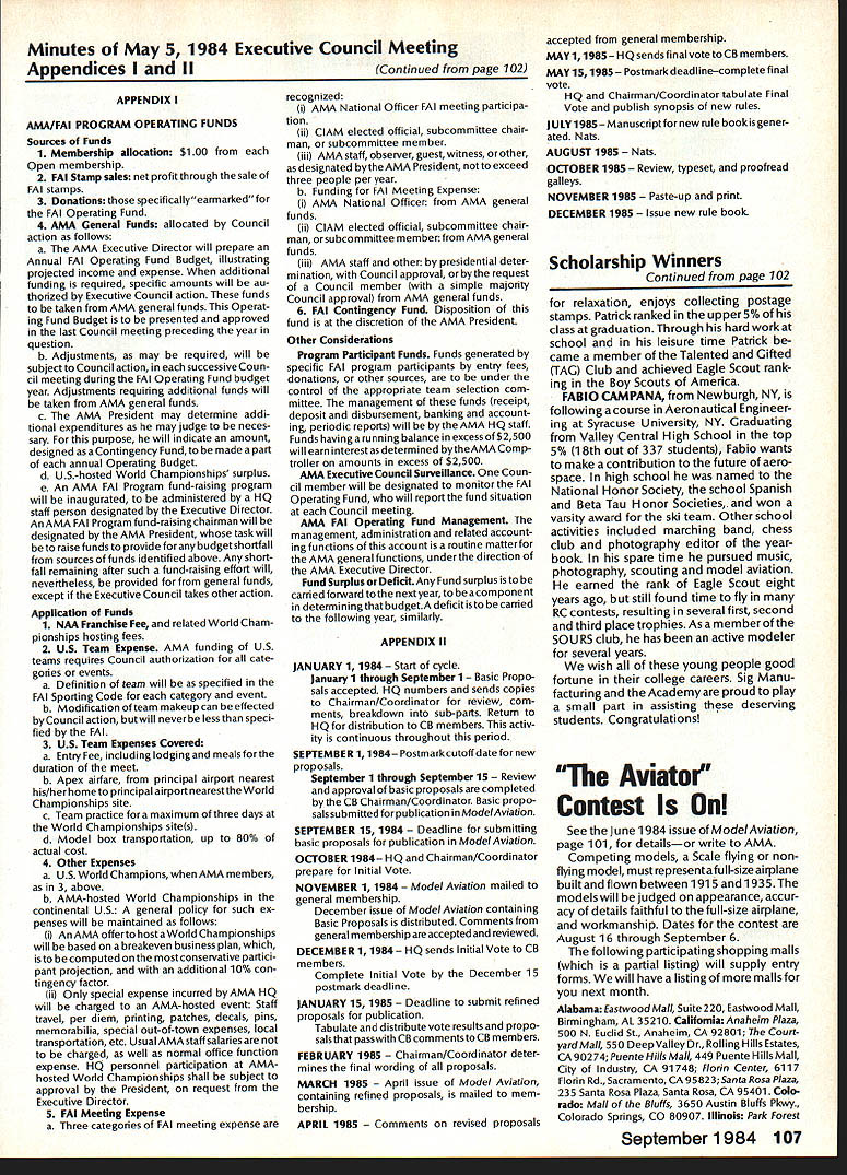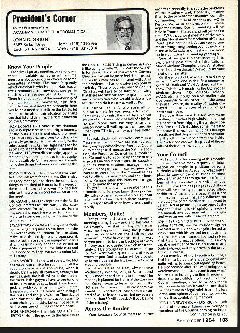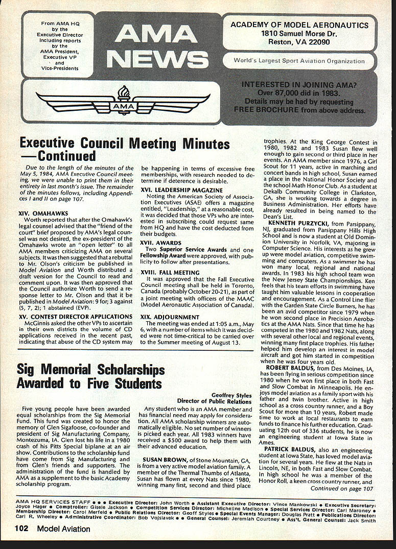 From AMA HQ Executive Director including reports AMA President Executive VP Vice-Presidents L Executive Council Meeting Minutes Continued Due length minutes May 5 1984 AMA Executive Council meet in& unable print entirety last months issue remainder minutes follows including Appendi ces II page 107 XIV OMAHAWKS Worth reported after Omahawks legal counsel advised friend court brief proposed AMAs legal coun sel desired ex-president Omahawks wrote open letter AMA members criticizing AMA several subjects Itwas suggested rebuttal Mr Olsons criticism published Model Aviation Worth distributed draft version Council read comment upon approved Council authorize Worth send re sponse letter Mr Olson published ModelAviation 9 3 against 5 7 2 1 abstained EVP XV CONTEST DIRECTOR APPLICATIONS McGinnis asked other VPs ascertain own districts volume CD applications received recent past indicating abuse CD system may Sig Memorial Scholarships Awarded Five Students Five young people have awarded equal scholarships Sig Memorial Fund fund created honor memory Glen Sigafoose co-founder president Sig Manufacturing Company Montezuma IA Glen lost life 1980 crash Pitts Special biplane air show Contributions scholarship fund have come Sig Manufacturing Glens friends supporters administration fund handled AMA supplement basic Academy scholarship program happening terms excessive free memberships research needed de termine deterence desirable XVI LEADERSHIP MAGAZINE Noting American Society Associa tion Executives ASAE offers magazine entitled Leadership reasonable cost decided VPs inter ested subscribing could request same HQ have cost deducted budgets XVII AWARDS Two Superior Service Awards Fellowship Award approved pub licity follow after presentations XVIII FALL MEETING approved Fall Executive Council meeting shall held Toronto Canada probablyOctober2o-21 part joint meeting officers MAAC Model Aeronautic Association Canada XIX ADJOURNMENT meeting ended 105 am May 6 number items decid ed time-critical carried over Summer meeting August 13 Geoffrey Styles Director Public Relations Any student AMA member has financial need may apply considera tion AMA scholarship winners auto matically eligible No set number winners picked year 1983 winners have received $500 award help advanced education SUSAN BROWN Stone Mountain GA very active model aviation family member Thermal Thumbs Atlanta Susan has flown Nats since 1980 winning first second third place trophies King George Contest 1980 1982 1983 Susan flew well enough gain second third place events An AMA member since 1976 Girl Scout 11 years active marching concert bands high school Susan earned place National Honor Society school Math Honor Club As student Dekalb Community College Clarkston GA working towards degree Business Administration efforts have already resulted being named Deans List KENNETH PURZYCKI Parsippany NJ graduated Parsippany Hills High School now student Old Domin ion University Norfoll4 VA majoring Computer Science interests grew up model aviation competitive swim ming computers As swimmer has won local regional national awards 1983 high school team won New Jersey State Championships Ken feels team efforts swimming have taught him valuable lessons cooperation encouragement As Control Line flier Garden State Circle Burners has avid competitor since 1979 won second place Precision Aeroba tics AMA Nats Since time has competed 1980 1982 Nats along several other local regional events winning first place trophies H father helped him develop interest model aircraft got him started competition four years old ROBERT BALDUS Des Moines IA has flying serious competition since 1980 won first place both Fast Slow Combat Minneapolis en joys model aviation family sport father twin brother Active high school cross country runner Boy Scout 10 years Robert made time work local restaurants earn funds finance further education Grad uating 12th out 336 students now engineering student Iowa State Ames PATRICK BALDUS also engineering student Iowa State has loved model avia tion several years flew Nats Lincoln NE both Fast Slow Combat high school member Honor Roll keen cross country runner Continued page 107 102 Model Aviation ACADEMY OF MODEL AERONAUTICS 1810 Samuel Morse Dr Reston VA 22090 AMA HQ SERVICES STAFF 0O Executive Director John Worth p Assistant Executive Director Vince Mankowski Executive Secretary Joyce Hager troiier Giseie Jackson etition Services Director Micheline Madison ial Services Director Can Maroney Membership Director Carol Merfeid ic Relations Director Geoff Styiese Special Events Manager Douglas Pratt Publications Director Carl R Wheeley Administrative Coordinator Bob Vojsiavek a General Counsel Jeremiah Courtney Asst General Counsel Jack Smith Know People time go meeting orashow ora contest invariably someone will ask questions about other officers some committee makeup frequently asked question Nats Execu tive Committee does get touch member Committee no secret about membership Nats Executive Committee just hap pens have never really thought would need publicize list So let clear air situation giving list defining basic function Committee HOMER SMITH r chairman also represents Free Flight interests Nats calls chairs meet ings issues reports sees generally going well planning subsequent Nats As Free Flight manager also has see people named various FF event directorships appoints category director sees equip ment available events mil lion other things need doing during meet BEV WISNIEWSKI represents Con trol Line interests Nats also category manager does same type things required Homer week meet have rather oversimplified role woman works --- off during meet DICKSONHEIMDickrepresentsthe Radio Control interests Nats also cate gory director RC has no less responsibility Homer Bev Perhaps some respects mainly due entry size RC BRYANTTHOMPSON Tommy facili ties manager required run site another equipment operation make sure equipment operational just make su