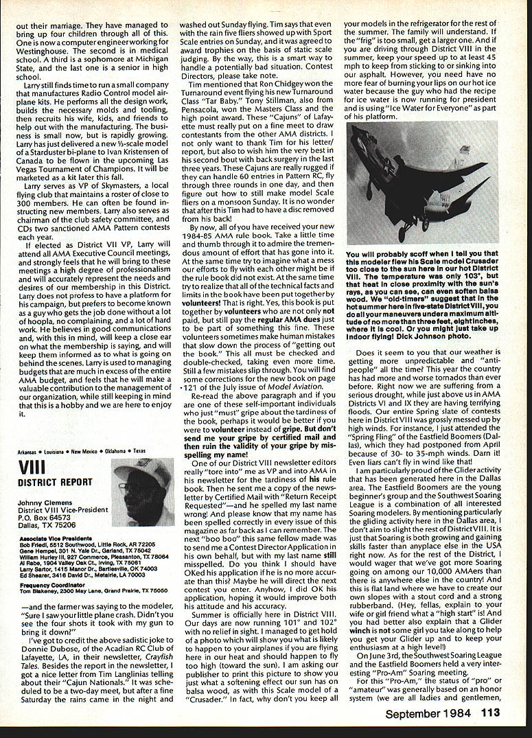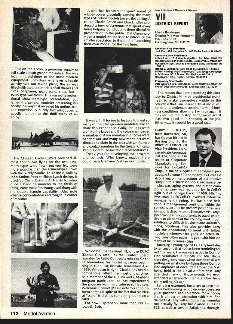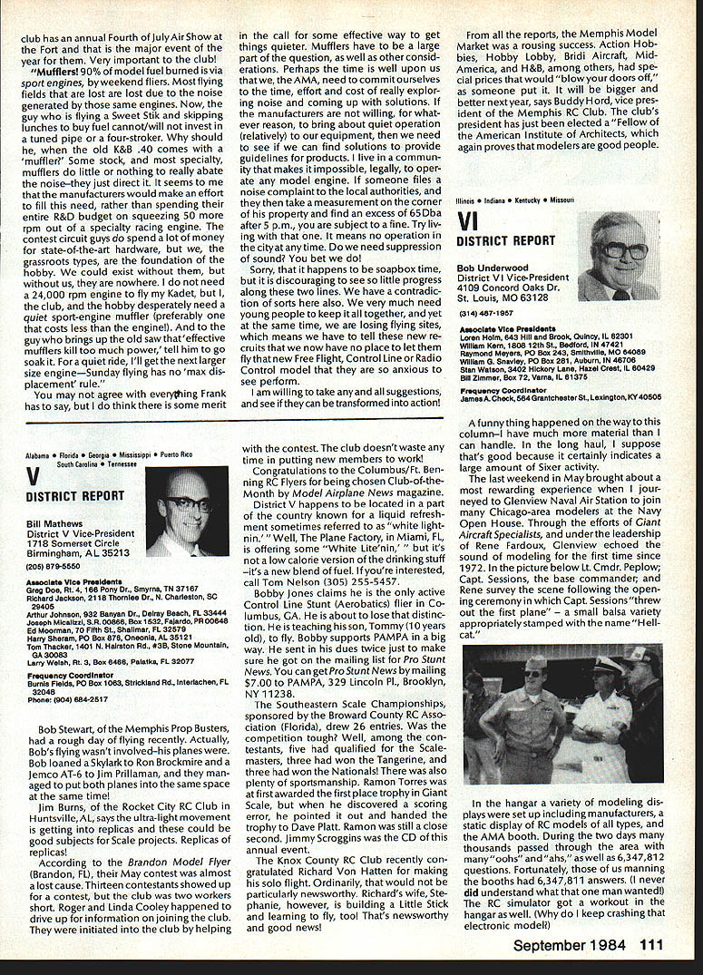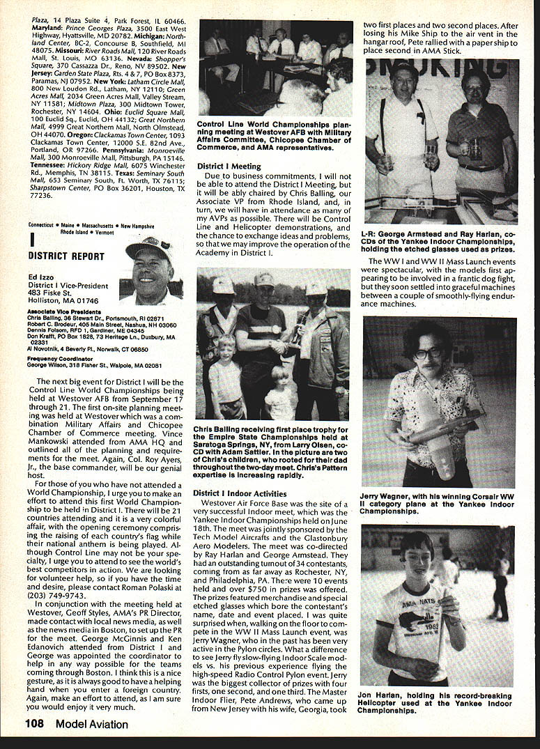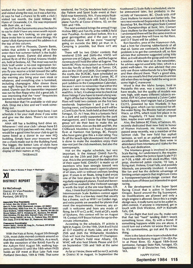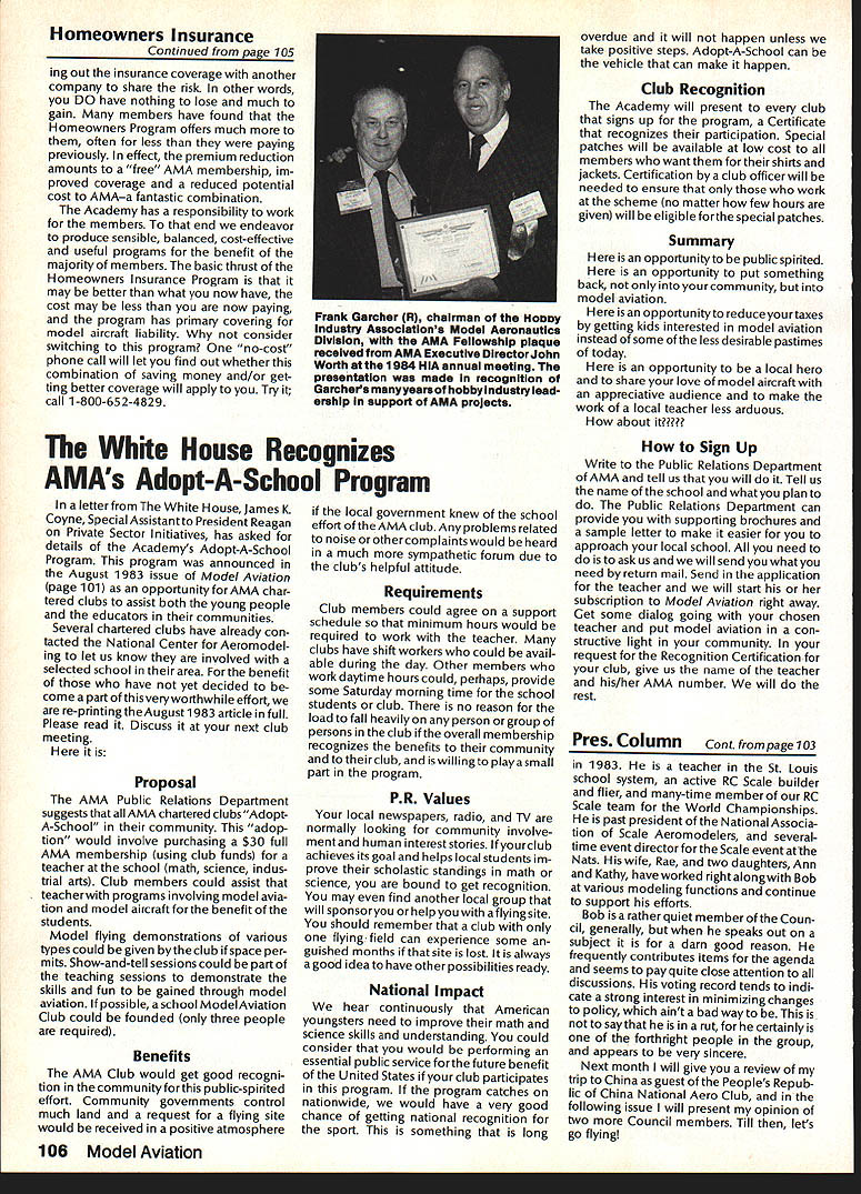 From AMA HQ Executive Director including reports AMA President Executive VP Vice-Presidents L Executive Council Meeting Minutes Continued Due length minutes May 5 1984 AMA Executive Council meet in& unable print entirety last months issue remainder minutes follows including Appendi ces II page 107 XIV OMAHAWKS Worth reported after Omahawks legal counsel advised friend court brief proposed AMAs legal coun sel desired ex-president Omahawks wrote open letter AMA members criticizing AMA several subjects Itwas suggested rebuttal Mr Olsons criticism published Model Aviation Worth distributed draft version Council read comment upon approved Council authorize Worth send re sponse letter Mr Olson published ModelAviation 9 3 against 5 7 2 1 abstained EVP XV CONTEST DIRECTOR APPLICATIONS McGinnis asked other VPs ascertain own districts volume CD applications received recent past indicating abuse CD system may Sig Memorial Scholarships Awarded Five Students Five young people have awarded equal scholarships Sig Memorial Fund fund created honor memory Glen Sigafoose co-founder president Sig Manufacturing Company Montezuma IA Glen lost life 1980 crash Pitts Special biplane air show Contributions scholarship fund have come Sig Manufacturing Glens friends supporters administration fund handled AMA supplement basic Academy scholarship program happening terms excessive free memberships research needed de termine deterence desirable XVI LEADERSHIP MAGAZINE Noting American Society Associa tion Executives ASAE offers magazine entitled Leadership reasonable cost decided VPs inter ested subscribing could request same HQ have cost deducted budgets XVII AWARDS Two Superior Service Awards Fellowship Award approved pub licity follow after presentations XVIII FALL MEETING approved Fall Executive Council meeting shall held Toronto Canada probablyOctober2o-21 part joint meeting officers MAAC Model Aeronautic Association Canada XIX ADJOURNMENT meeting ended 105 am May 6 number items decid ed time-critical carried over Summer meeting August 13 Geoffrey Styles Director Public Relations Any student AMA member has financial need may apply considera tion AMA scholarship winners auto matically eligible No set number winners picked year 1983 winners have received $500 award help advanced education SUSAN BROWN Stone Mountain GA very active model aviation family member Thermal Thumbs Atlanta Susan has flown Nats since 1980 winning first second third place trophies King George Contest 1980 1982 1983 Susan flew well enough gain second third place events An AMA member since 1976 Girl Scout 11 years active marching concert bands high school Susan earned place National Honor Society school Math Honor Club As student Dekalb Community College Clarkston GA working towards degree Business Administration efforts have already resulted being named Deans List KENNETH PURZYCKI Parsippany NJ graduated Parsippany Hills High School now student Old Domin ion University Norfoll4 VA majoring Computer Science interests grew up model aviation competitive swim ming computers As swimmer has won local regional national awards 1983 high school team won New Jersey State Championships Ken feels team efforts swimming have taught him valuable lessons cooperation encouragement As Control Line flier Garden State Circle Burners has avid competitor since 1979 won second place Precision Aeroba tics AMA Nats Since time has competed 1980 1982 Nats along several other local regional events winning first place trophies H father helped him develop interest model aircraft got him started competition four years old ROBERT BALDUS Des Moines IA has flying serious competition since 1980 won first place both Fast Slow Combat Minneapolis en joys model aviation family sport father twin brother Active high school cross country runner Boy Scout 10 years Robert made time work local restaurants earn funds finance further education Grad uating 12th out 336 students now engineering student Iowa State Ames PATRICK BALDUS also engineering student Iowa State has loved model avia tion several years flew Nats Lincoln NE both Fast Slow Combat high school member Honor Roll keen cross country runner Continued page 107 102 Model Aviation ACADEMY OF MODEL AERONAUTICS 1810 Samuel Morse Dr Reston VA 22090 AMA HQ SERVICES STAFF 0O Executive Director John Worth p Assistant Executive Director Vince Mankowski Executive Secretary Joyce Hager troiier Giseie Jackson etition Services Director Micheline Madison ial Services Director Can Maroney Membership Director Carol Merfeid ic Relations Director Geoff Styiese Special Events Manager Douglas Pratt Publications Director Carl R Wheeley Administrative Coordinator Bob Vojsiavek a General Counsel Jeremiah Courtney Asst General Counsel Jack Smith Know People time go meeting orashow ora contest invariably someone will ask questions about other officers some committee makeup frequently asked question Nats Execu tive Committee does get touch member Committee no secret about membership Nats Executive Committee just hap pens have never really thought would need publicize list So let clear air situation giving list defining basic function Committee HOMER SMITH r chairman also represents Free Flight interests Nats calls chairs meet ings issues reports sees generally going well planning subsequent Nats As Free Flight manager also has see people named various FF event directorships appoints category director sees equip ment available events mil lion other things need doing during meet BEV WISNIEWSKI represents Con trol Line interests Nats also category manager does same type things required Homer week meet have rather oversimplified role woman works --- off during meet DICKSONHEIMDickrepresentsthe Radio Control interests Nats also cate gory director RC has no less responsibility Homer Bev Perhaps some respects mainly due entry size RC BRYANTTHOMPSON Tommy facili ties manager required run site another equipment operation make sure equipment operational just make su