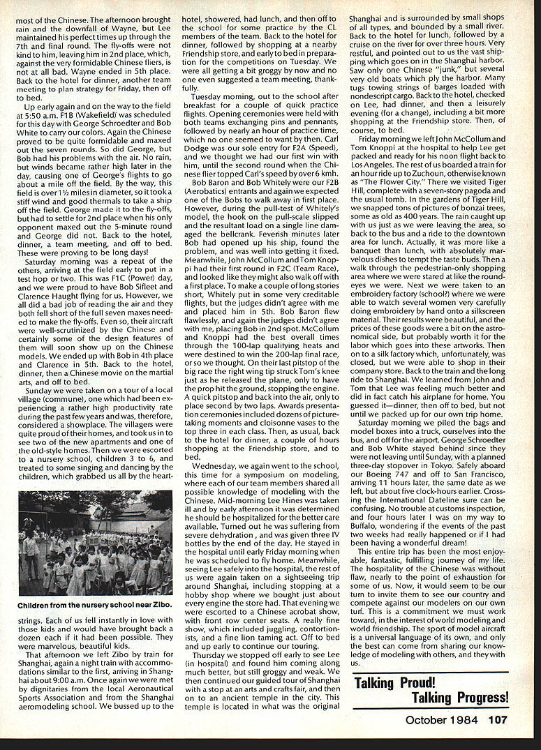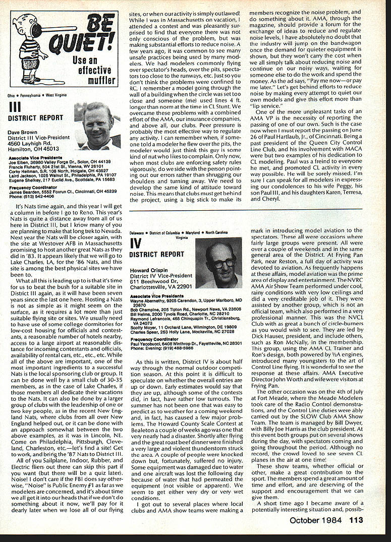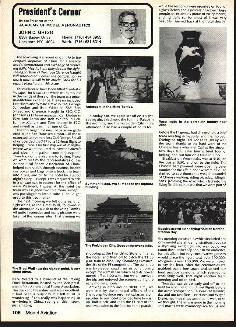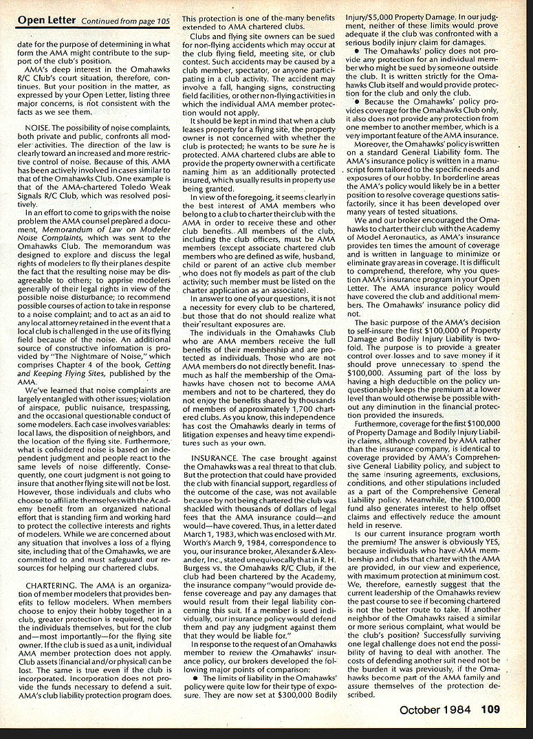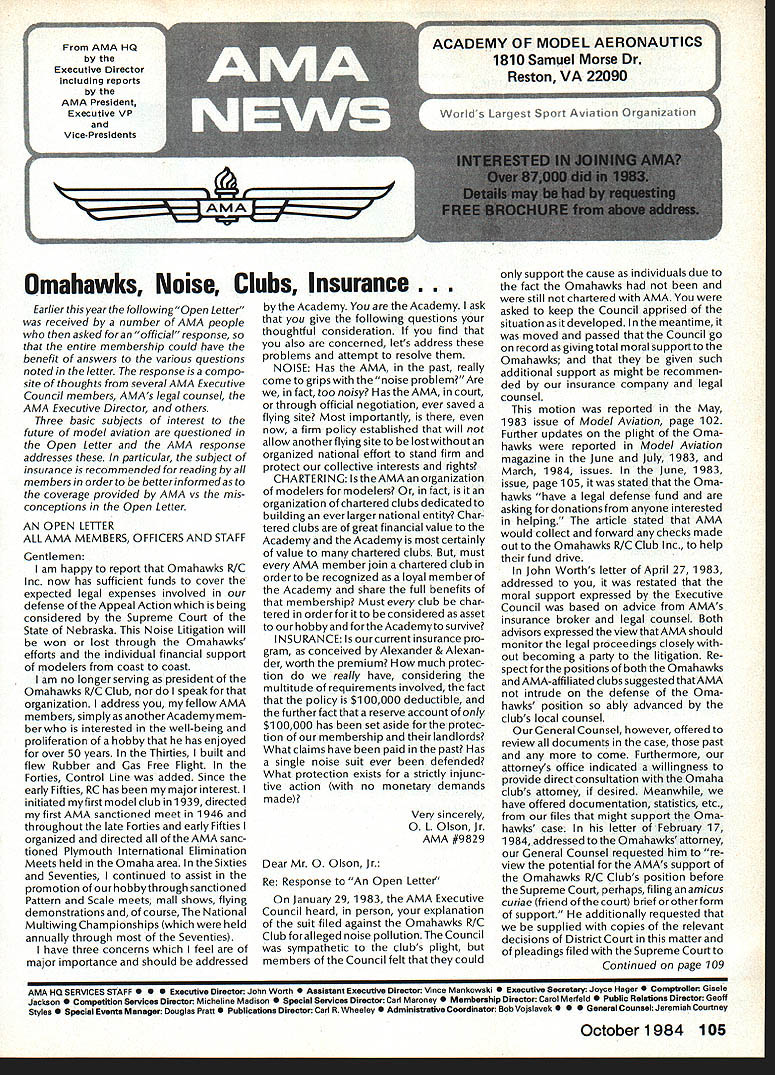Earlier year followingOpen Letter received number AMA people asked official response entire membership could have benefit answers various questions noted letter response compo site thoughts severalAMA Executive Council members AMAs legal counsel AMA Executive Director others Three basic subjects interest future model aviation questioned Open Letter AMA response addresses particular subject insurance recommended reading members order better informed coverage provided AMA vs mis conceptions Open Letter OPEN LElTER ALL AMA MEMBERS OFFICERS AND STAFF Gentlemen am happy report Omahawks R/C Inc now has sufficient funds cover expected legal expenses involved defense Appeal Action being considered Supreme Court State Nebraska Noise Litigation will won lost through Omahawks efforts individual financial support modelers coast coast am no longer serving president Omahawks R/C Club nor speakforthat organization address fellow AMA members simply anotherAcademy mem berwho interested well-being proliferation hobby has enjoyed over 50 years Thirties built flew Rubber Gas Free Flight Forties Control Line added Since early Fifties RC has major interest initiated myfirst model club 1939 directed first AMA sanctioned meet 1946 throughout late Forties early Fifties organized directed AMA sanc tioned Plymouth International Elimination Meets held Omaha area Sixties Seventies continued assist promotion ourhobbythrough sanctioned Pattern Scale meets mall shows flying demonstrations course National MultiwingChampionships held annually through Seventies have three concerns feel major importance should addressed Omahawks Noise Clubs Insurance. Academy Academy ask give following questions thoughtful consideration find also concerned lets address problems attempt resolve NOISE Has AMA past really come grips noise problem Are fact too noisy Has AMA court through official negotiation ever saved flying site Most importantly now firm policy established will allow another flying site lostwithout organized national effort stand firm protect collective interests rights CHARTERING IstheAMAan organization modelers modelers fact organization chartered clubs dedicated building ever larger national entity Char tered clubs great financial value Academy Academy certainly value chartered clubs must AMA member join chartered club orderto recognized loyal member Academy share full benefits membership Must club char tered orderfor considered asset hobby forthe Academyto survive INSURANCE ourcurrent insurance pro gram conceived Alexander & Alexan der worth premium much protec tion really have considering multitude requirements involved fact policy $1 00000 deductible further fact reserve account $1 00000 has set aside protec tion membership theirlandlords What claims have paid past Has single noise suit ever defended What protection exists strictly injunc tive action no monetary demands made Very sincerely 0 L Olson Jr AMA #9529 Dear Mr 0 Olson Jr Re Response An Open Letter January 29 1983 AMA Executive Council heard person explanation suit filed against Omahawks R/C Club alleged noise pollution Council sympathetic clubs plight members Council felt could support cause individuals due fact Omahawks still chartered AMA asked keep Council apprised situation developed meantime moved passed Council go record giving total moral support Omahawks given such additional support might recommen ded insurance company legal counsel motion reported May 1983 issue Model Aviation page 102 Further updates plight Oma hawks reported Model Aviation magazine June July 1983 March 1984 issues June 1983 issue page 105 stated Oma hawks have legal defense fund asking donations anyone interested helping article stated AMA would collect forward checks made out Omahawks R/C Club Inc help fund drive John Worths letter April 27 1983 addressed restated moral support expressed Executive Council based advice AMAs insurance broker legal counsel Both advisors expressed view AMA should monitor legal proceedings closely out becoming party litigation Re spect positions both Omahawks AMA-affiliated clubs suggested thatAMA intrude defense Oma hawks position ably advanced clubs local counsel General Counsel however offered review documents case past come Furthermore attorneys office indicated willingness provide direct consultation Omaha clubs attorney desired Meanwhile have offered documentation statistics etc files might support Oma hawks case letter February 17 1984 addressed Omahawks attorney General Counsel requested him re view potential AMAs support Omahawks R/C Clubs position before Supreme Court perhaps filing amicus curiae friend court brief otherform support additionally requested supplied copies relevant decisions District Court matter pleadings filed Supreme Court Continued page 109 October1984 105 AMA HQ bY Executive Director including reports AMA President Executive VP Vice-Presidents AMA HO SERvICES STAFF 0O 0 Executive Director John Worth 0 Asaistent Executive Director vince Mankowaki 0 Executive Secretary Joyce HagerO Comptroller Gisele Jackson 0 Competition Services Director Micheline Madison 0 Special Services Director carl MaronayO Membership Director carol MerfeldO Public Relations Director Geoff StylesO Special Events Manager Douglas Pratt0 Publications Director carl WhealeyO Administrative Coordinator Bob \toislaveko 0 0 General Counsel Jeremiah Courtney Presidents Corner President ACADEMY OF MODEL AERONAUTICS JOHN C GRIGG 6387 Badger DriveHome 716 434-3955 Lockport NY 14094Work 716 631-6314 following report trip Peoples Republic China friendly model corn petition exchange model ing skills Mostly will discuss sight seeing portions trip Clarence Haught will undoubtedly cover competition much detail article Look report elsewhere issue well could have titled Fantastic Voyage trip will surely last minds team oncein-a-lifetime experience team included Lee Hines Wayne Drake FlA George Schroedter Bob White F2A Bob Sifleet Clarence Haught F2C CC Johnson FF team 